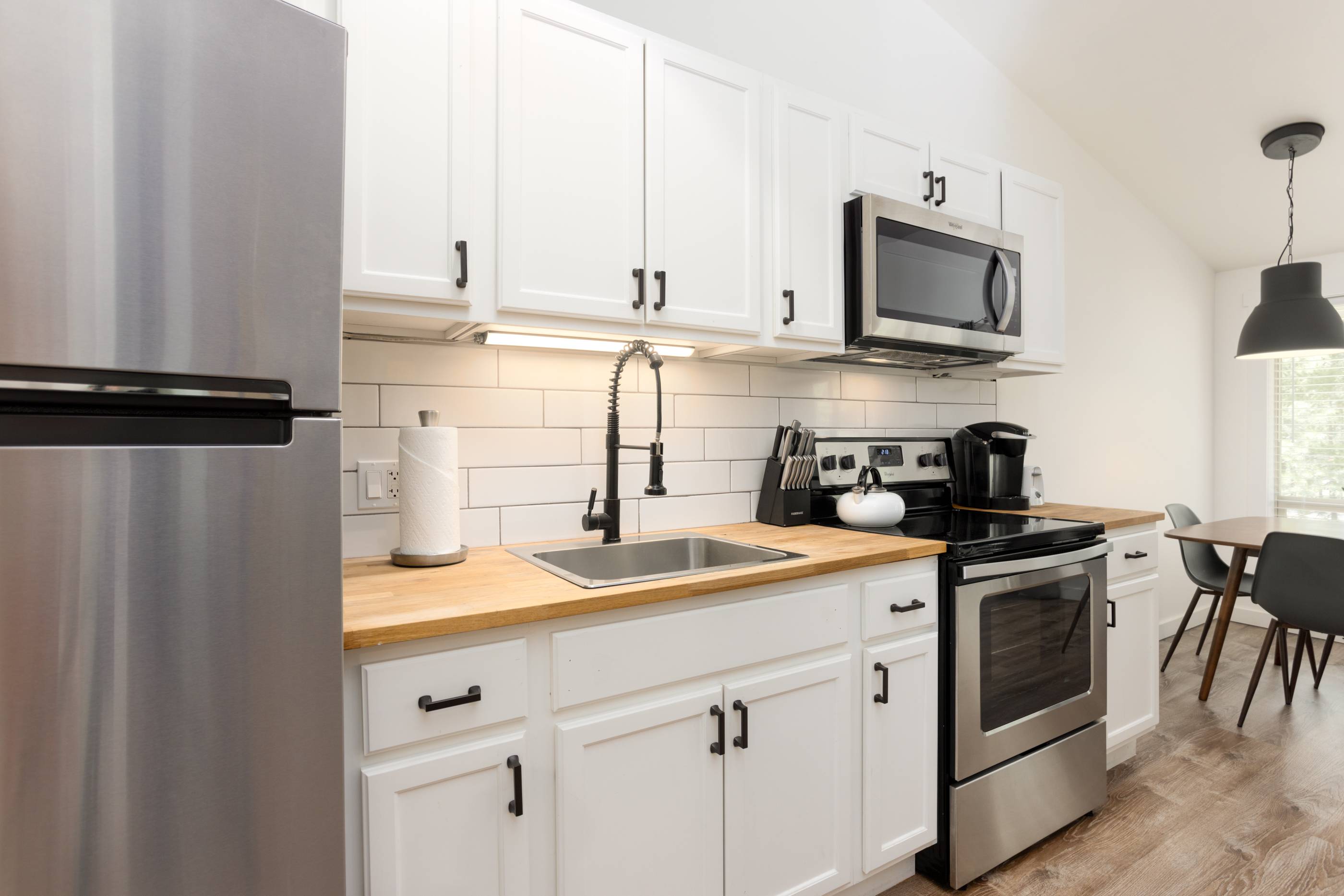 Out on the private deck is a gas BBQ, perfect for grilling up your favorite recipes, and there's a fully stocked kitchen, with everything you'll need for meal prep.