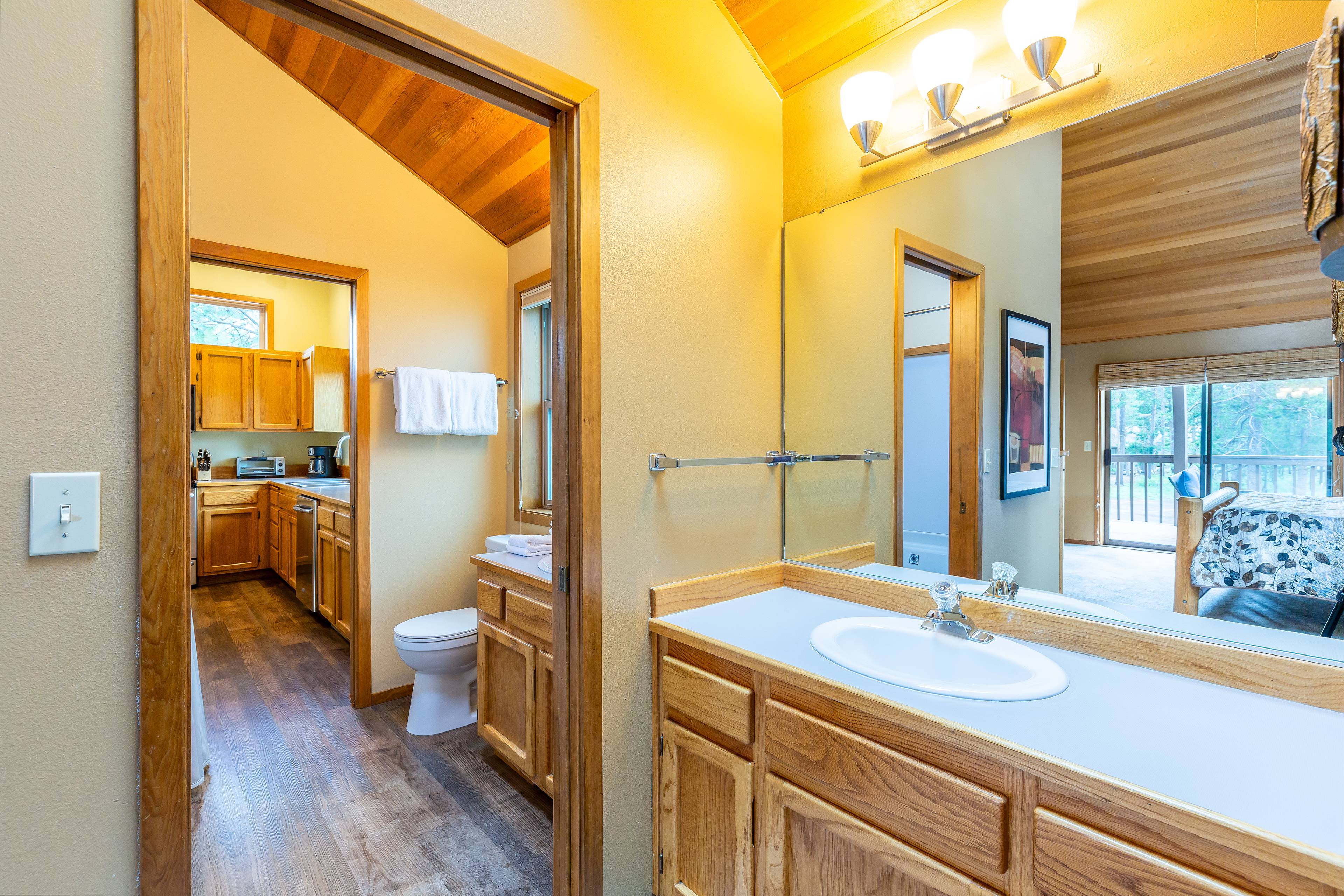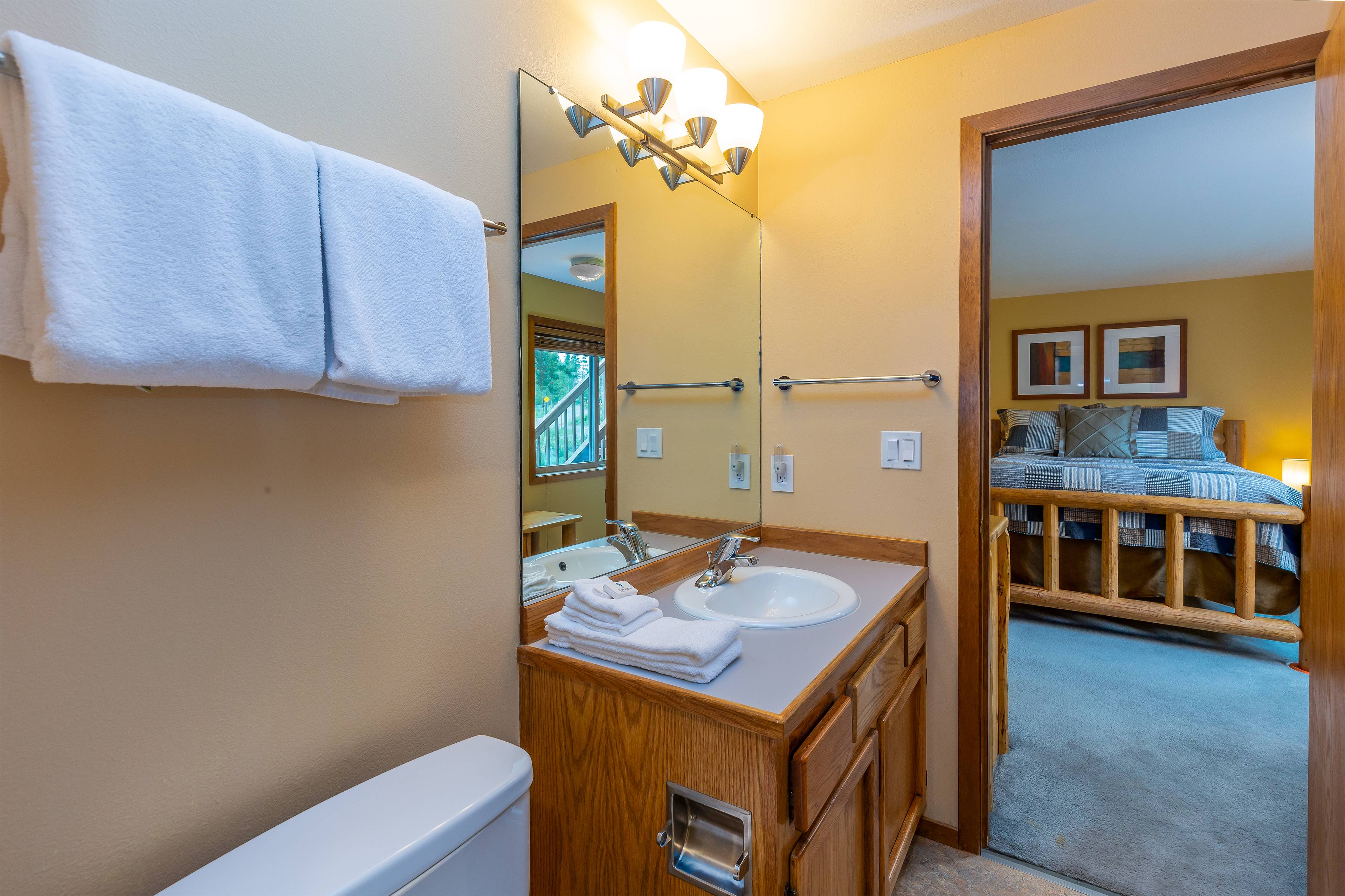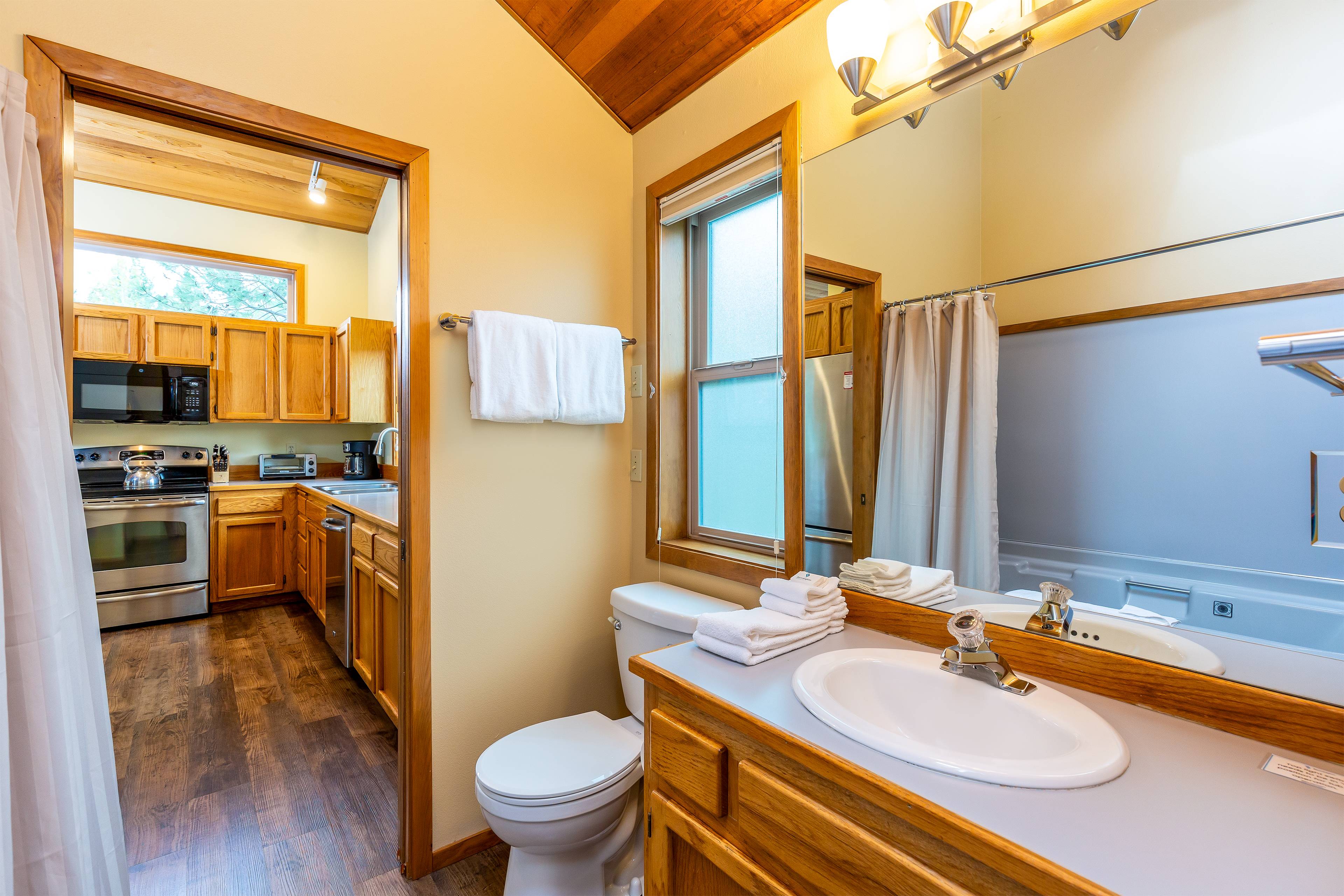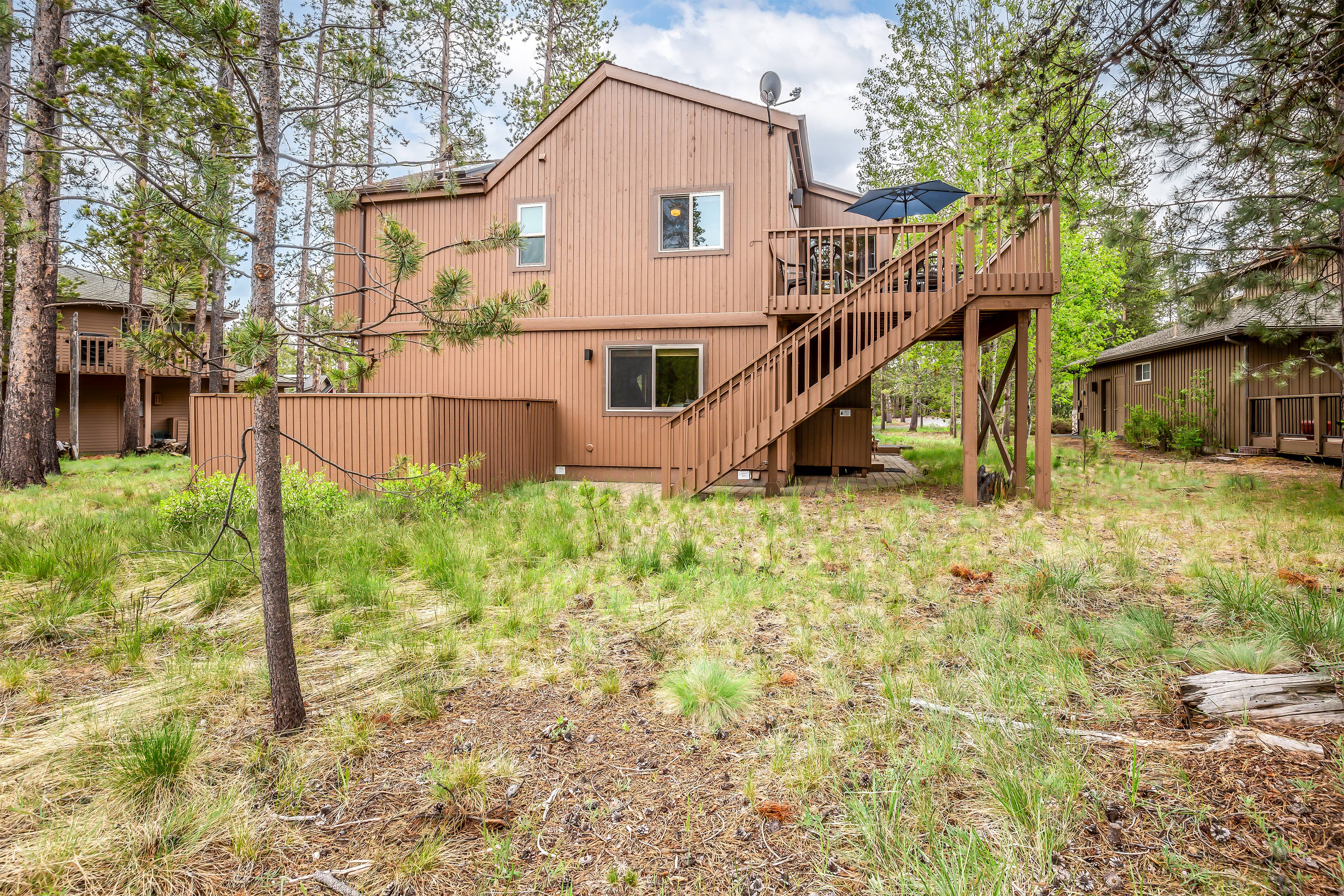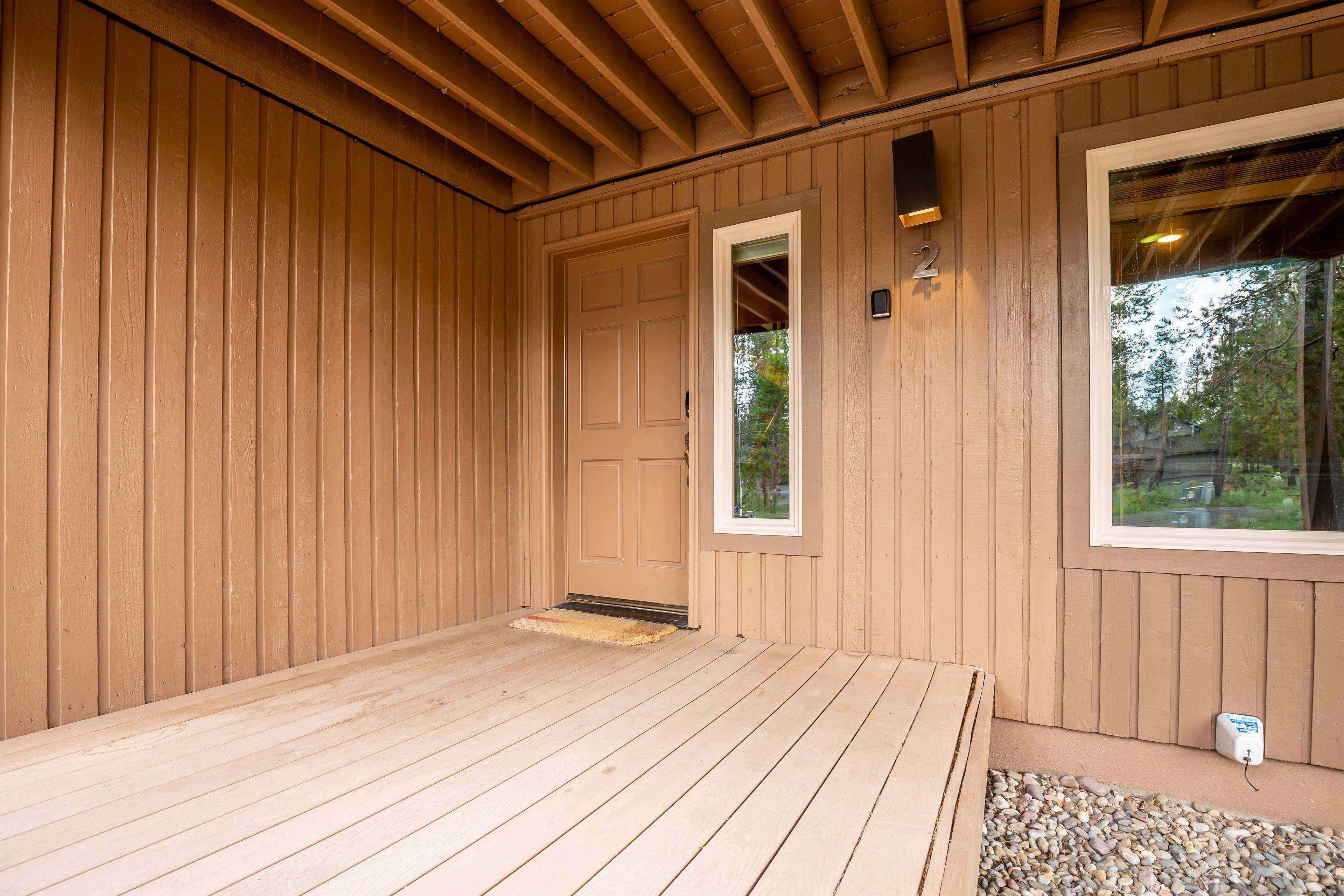 Our group of 4 stayed in Beech 2 and had a great time exploring the area. Rode the bikes along the river, did some nearby hikes and visited family north of Bend. Perhaps our favorite feature is the big south-facing windows in the great room that provide a wonderful sunny spot and nature view to enjoy morning coffee by. It was April, so still very cold outside, but cozy inside! Heat worked great, nice gas fireplace as well. We used the hot tub nightly which is in great shape. We only did light cooking but everything we needed was there. We hope to go back during a warmer time of year and sit out on the decks. One on the front and one on the back would seem to allow your choice depending on the heat and sun position. Walking/stroller distance to Fort Rock park with playground and courts. This would have been ideal for us when the kids were younger. Fast internet and multiple TVs if you're looking for that, but the outdoors is the real draw here. Great spot, highly recommended.