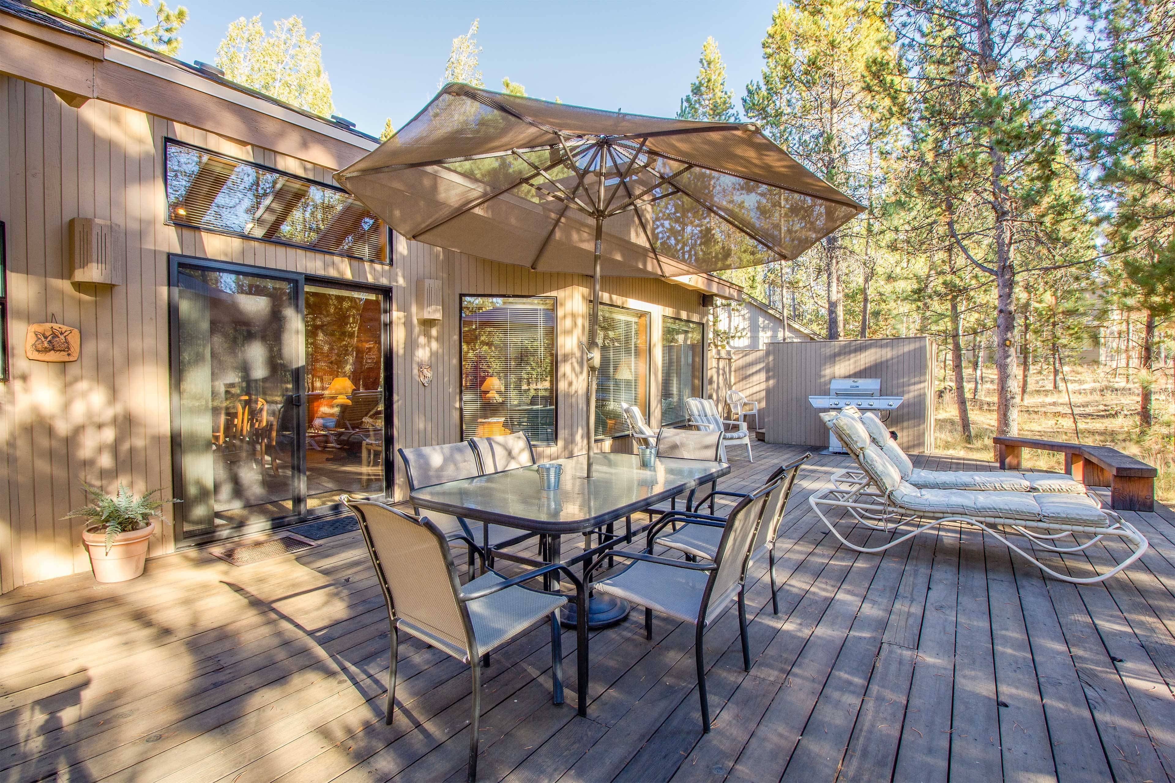 Step outside onto the large private deck, where a bubbling hot tub awaits under the stars. Fire up the gas BBQ and enjoy evening dinners surrounded by towering pines. Bikes are provided for exploring Sunriver’s extensive trail system, and yes, your dog is welcome too!