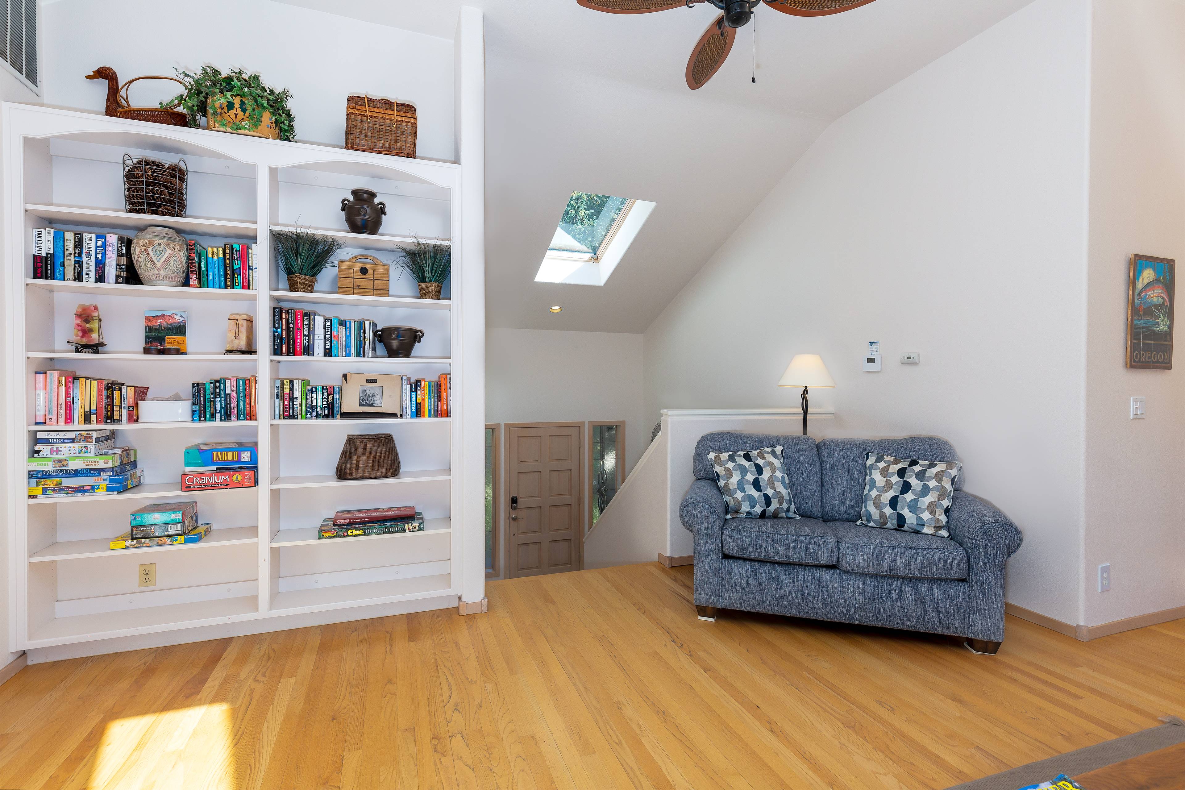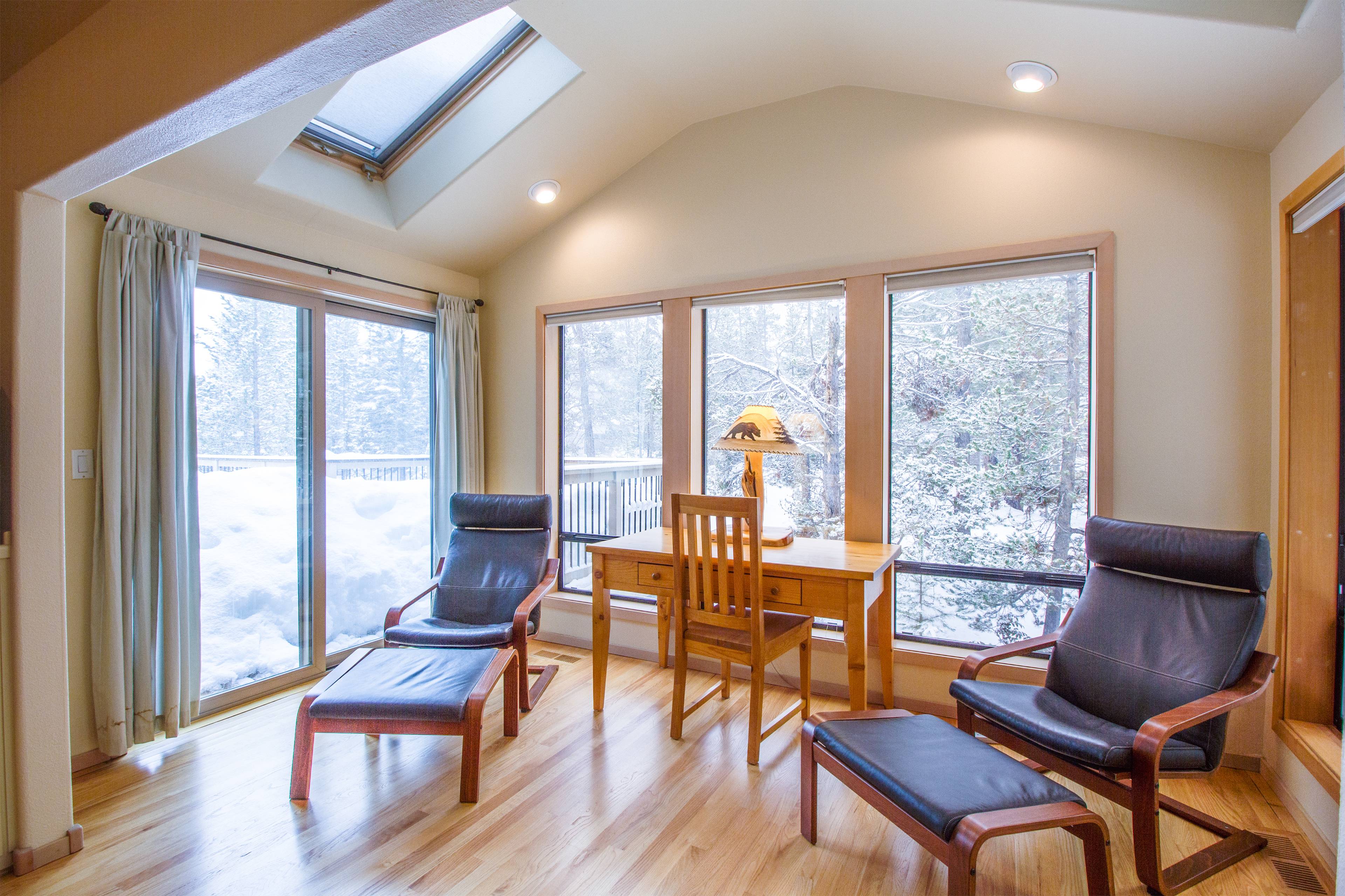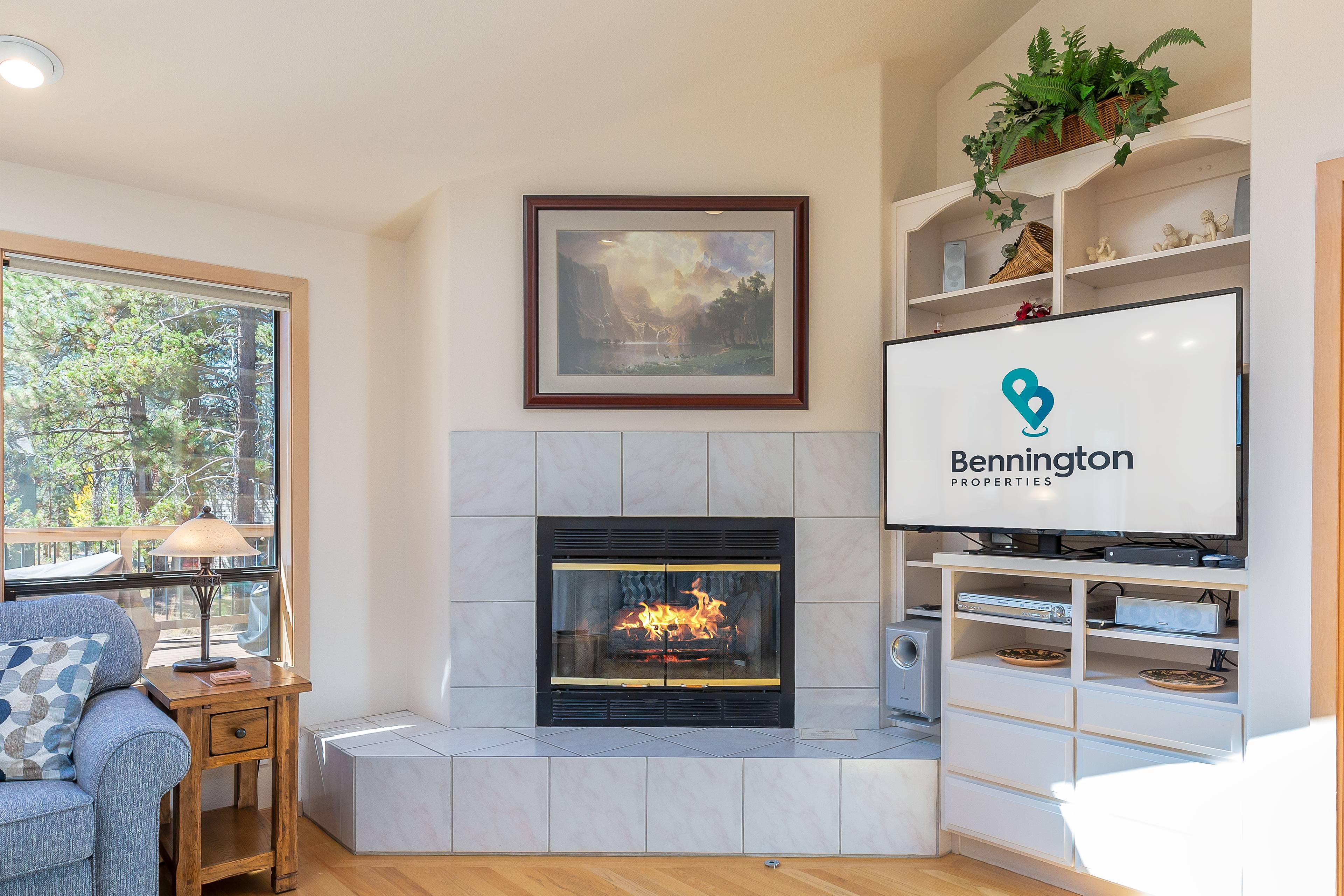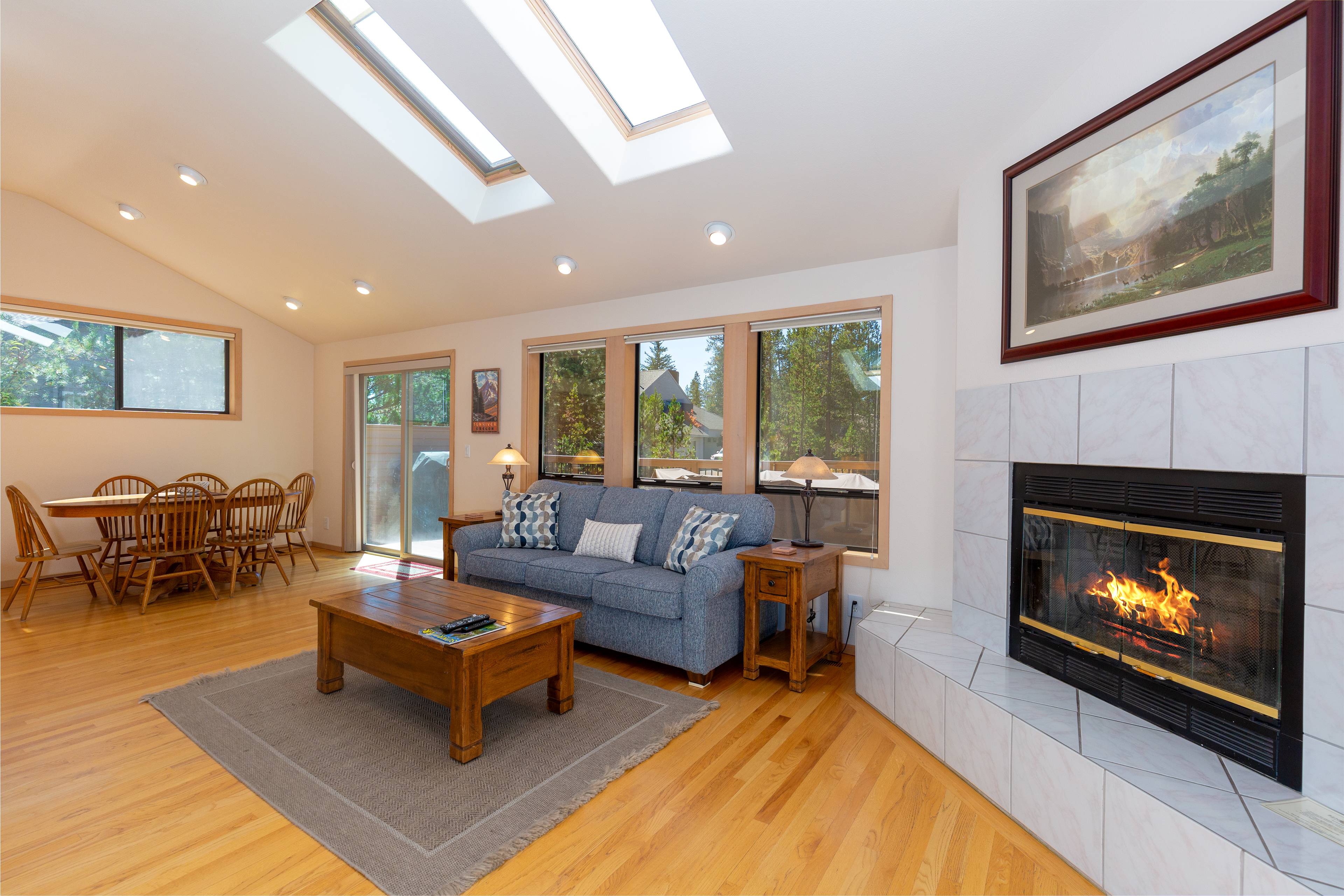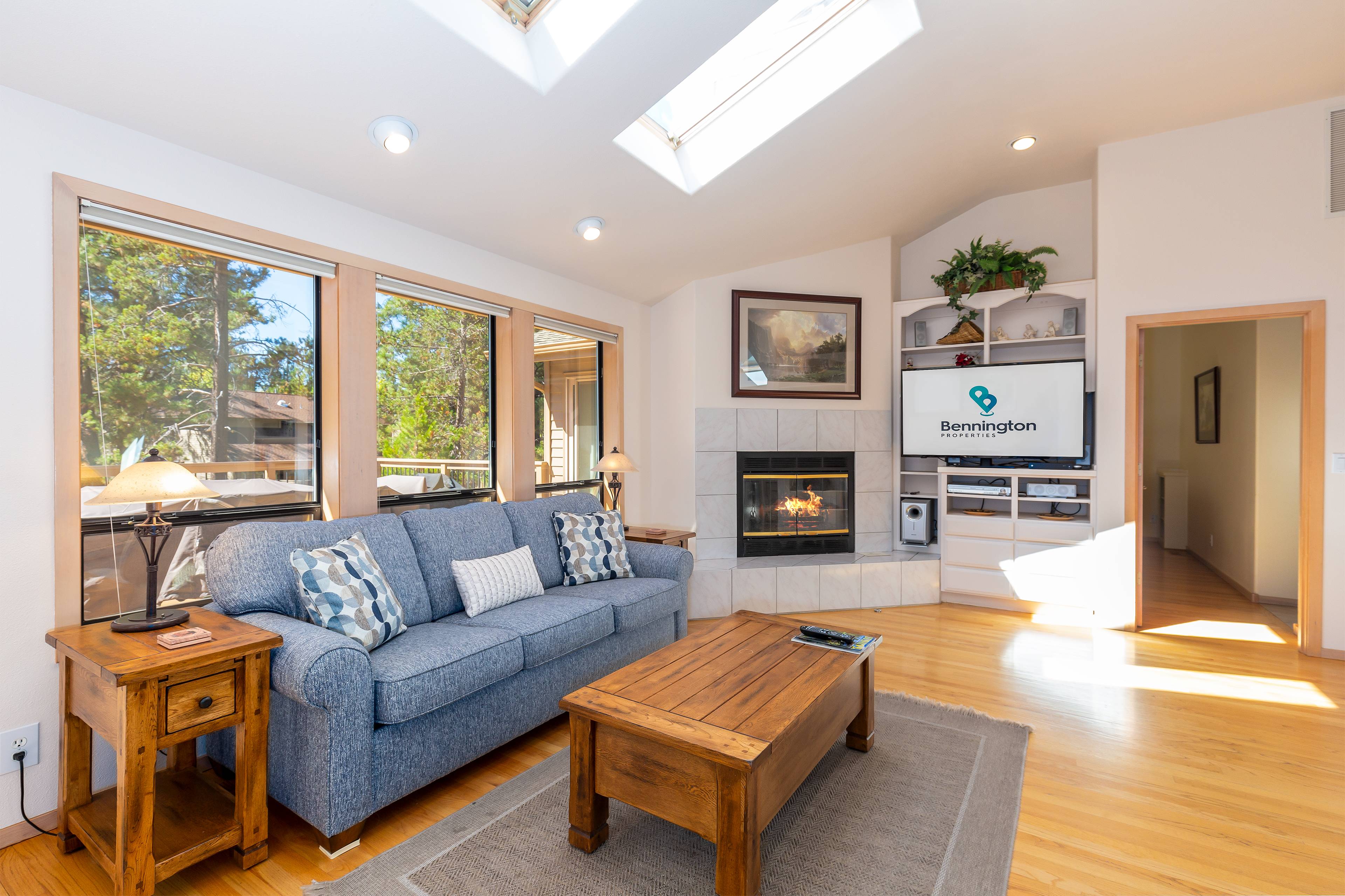 A wall of windows, vaulted ceilings with skylights, and hardwood floors welcome you into the living room as you step up from the split-level entry onto the second story, and main floor, of the home. Air conditioning and a medical grade air filter will keep you comfortable and breathing easy all year. Comfortable seating, an array of books and games, a 55" Smart TV with cable and cozy gas fireplace appoint the living room. An updated kitchen, dining table with seats for 6 and deck access are situated alongside the living room. The kitchen is a dream to work in - gorgeous granite counter tops, stainless steel appliances, and a gas range stove will ensure meal prep is an enjoyable affair.