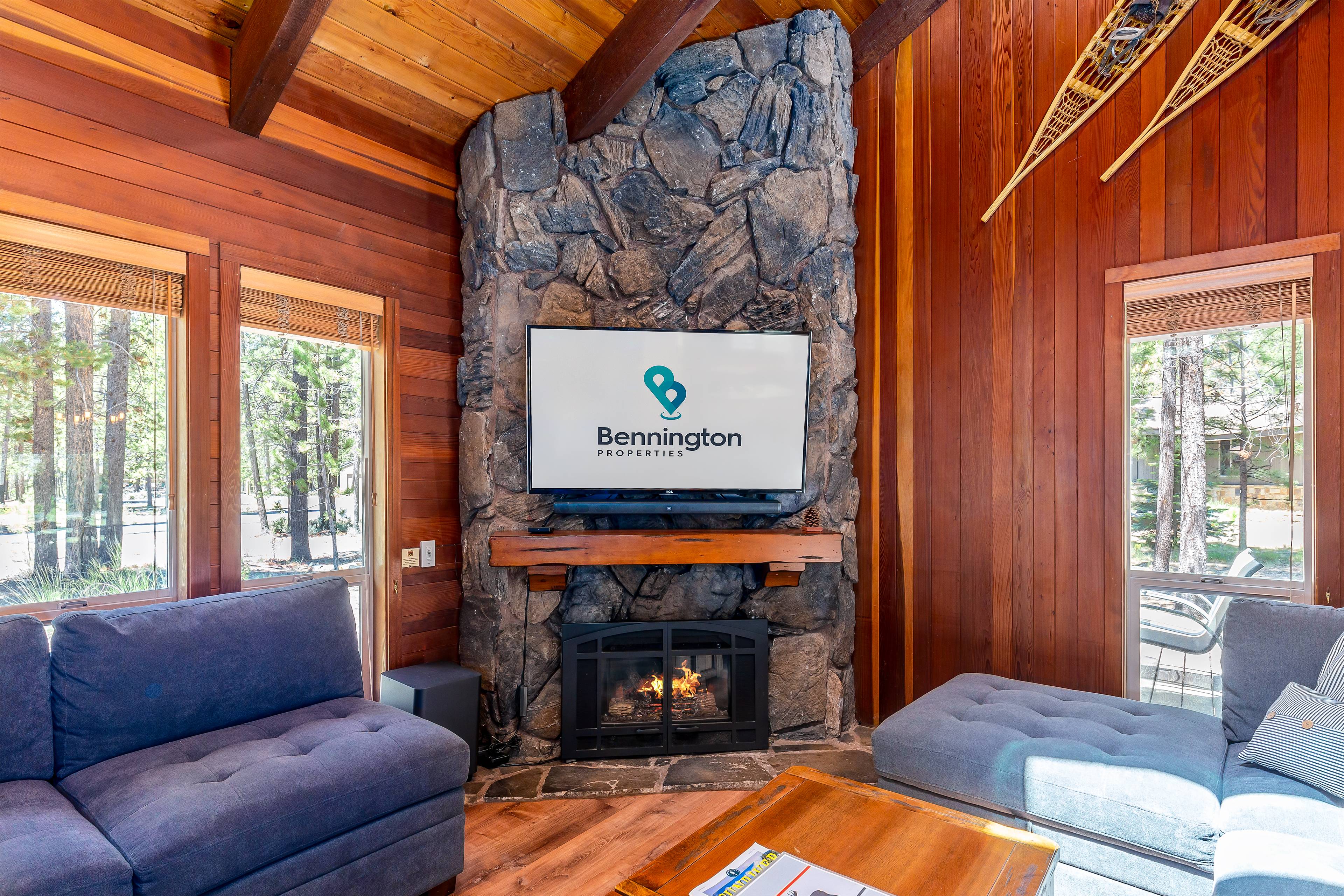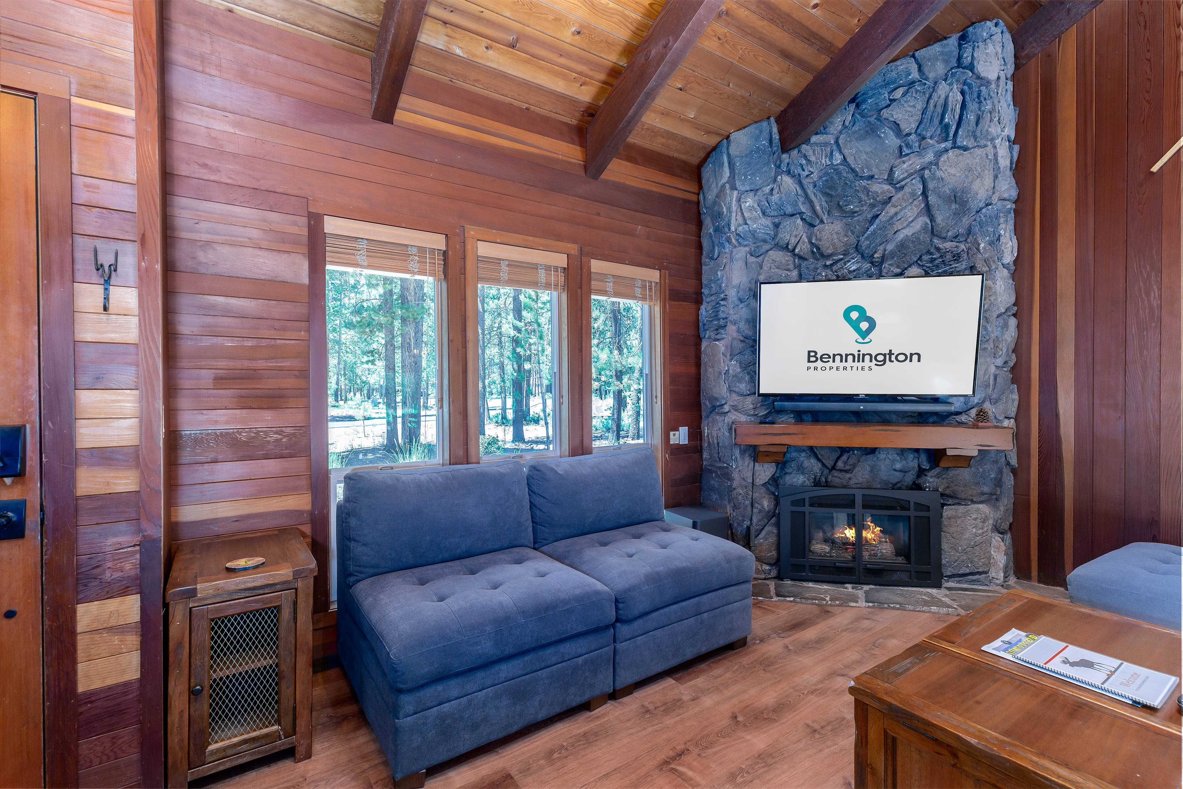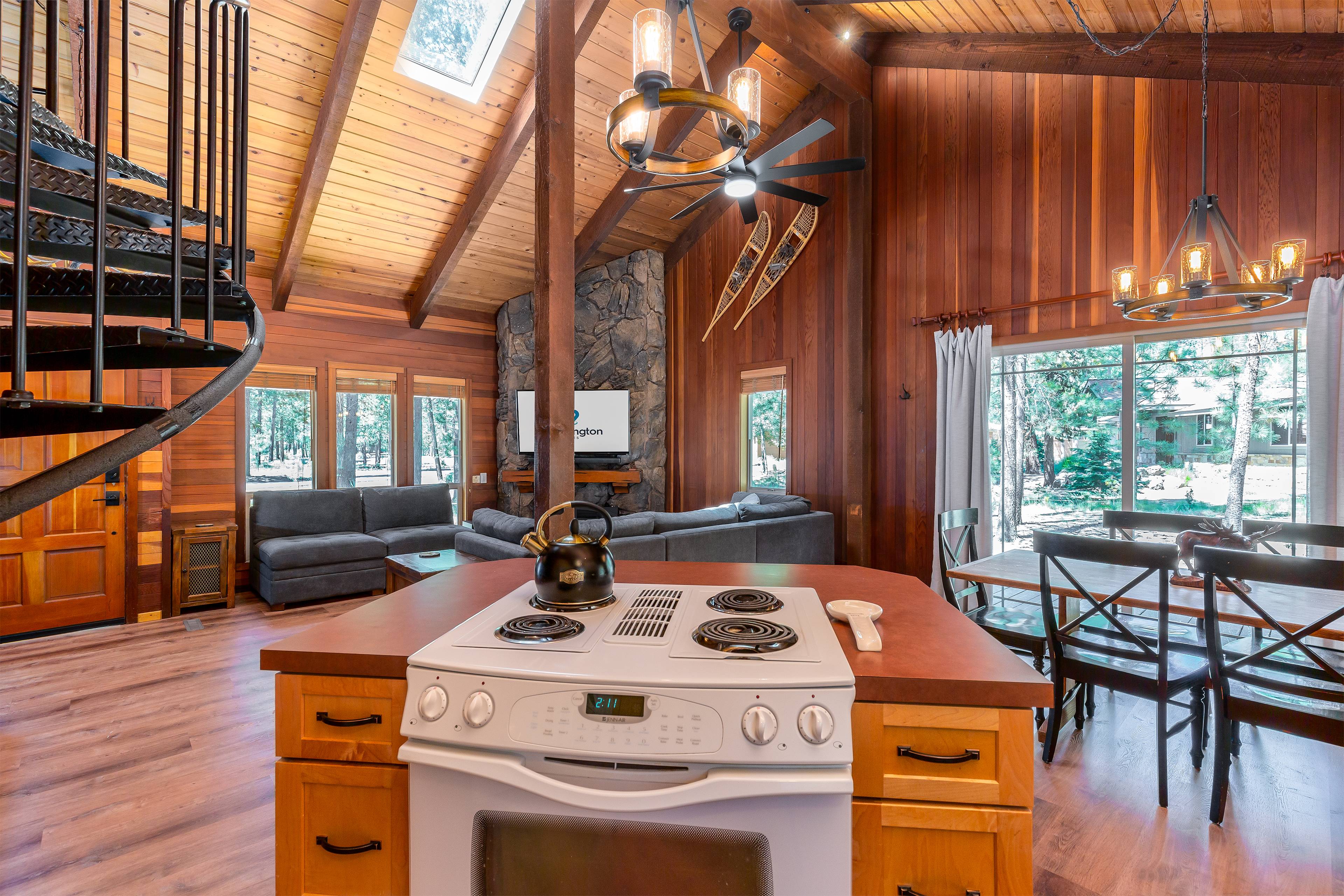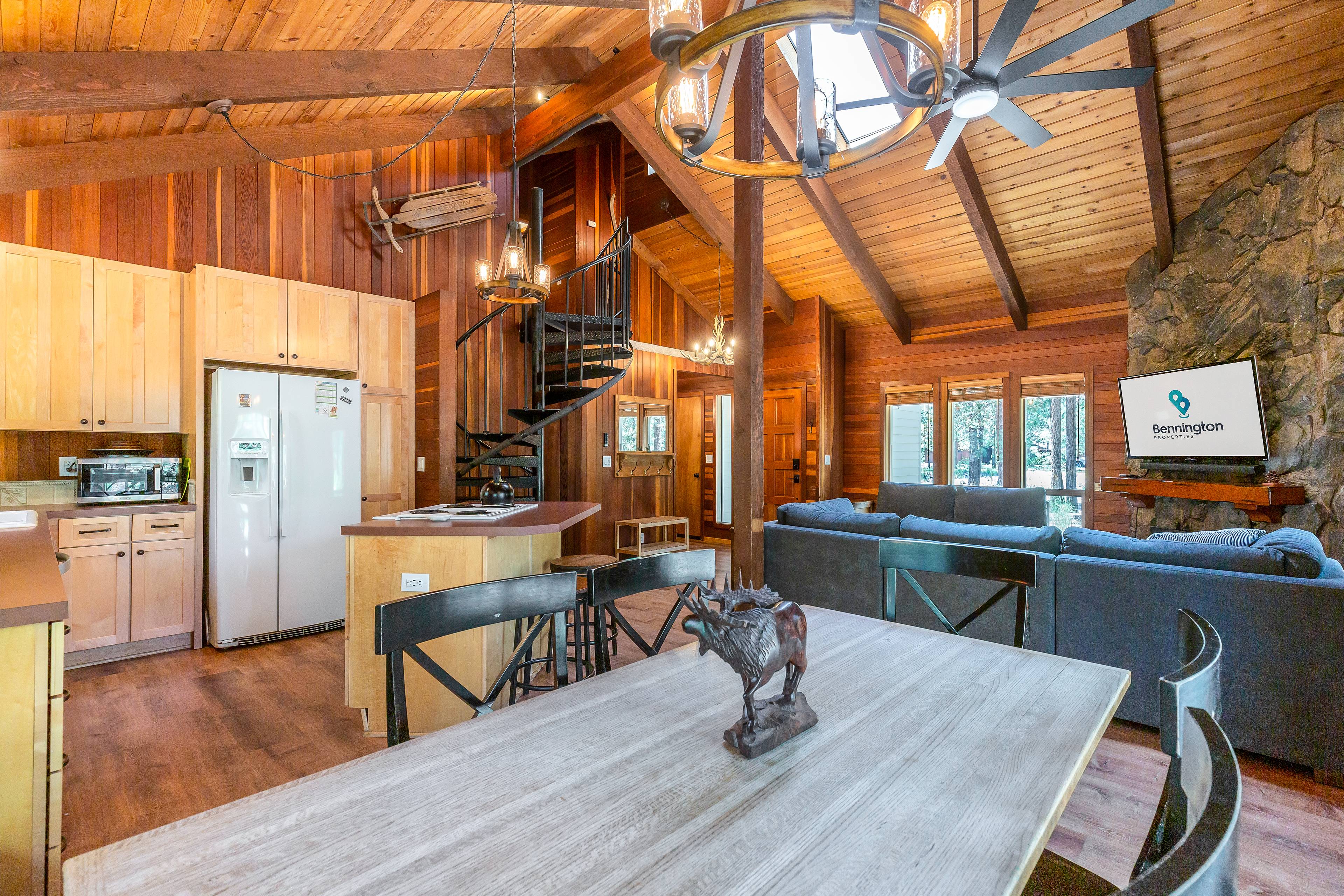 This charming, air-conditioned home, located on the south end of Sunriver, sits close to the Village shops and restaurants. The open-concept space features vaulted ceilings, a floor-to-ceiling river rock fireplace, a smart TV, and that classic Sunriver cabin vibe. The fully stocked kitchen has everything you'll need to prepare your favorite meals and is adjacent to the dining room with seating for six, plus two more can keep the chef company at the kitchen peninsula.