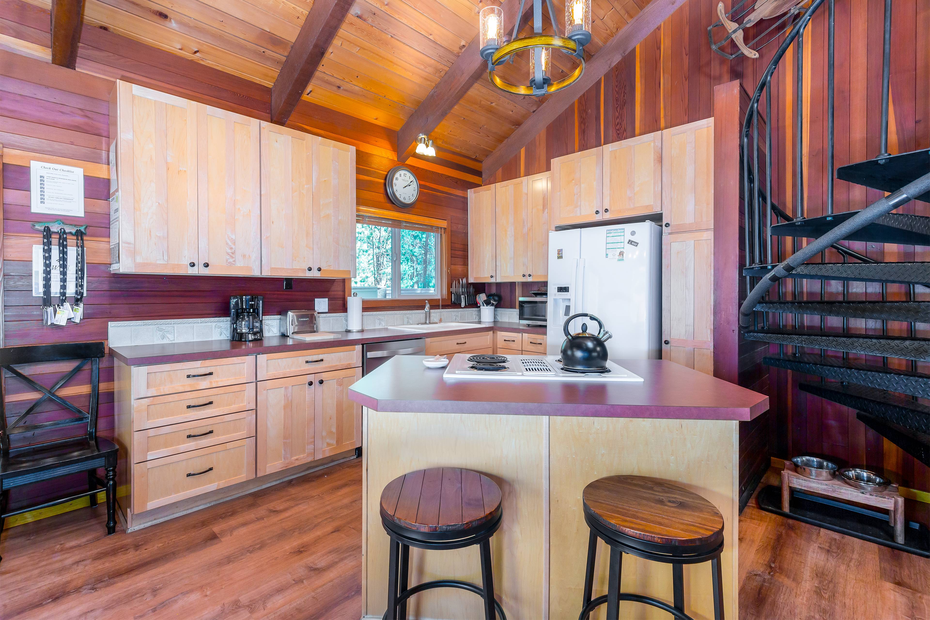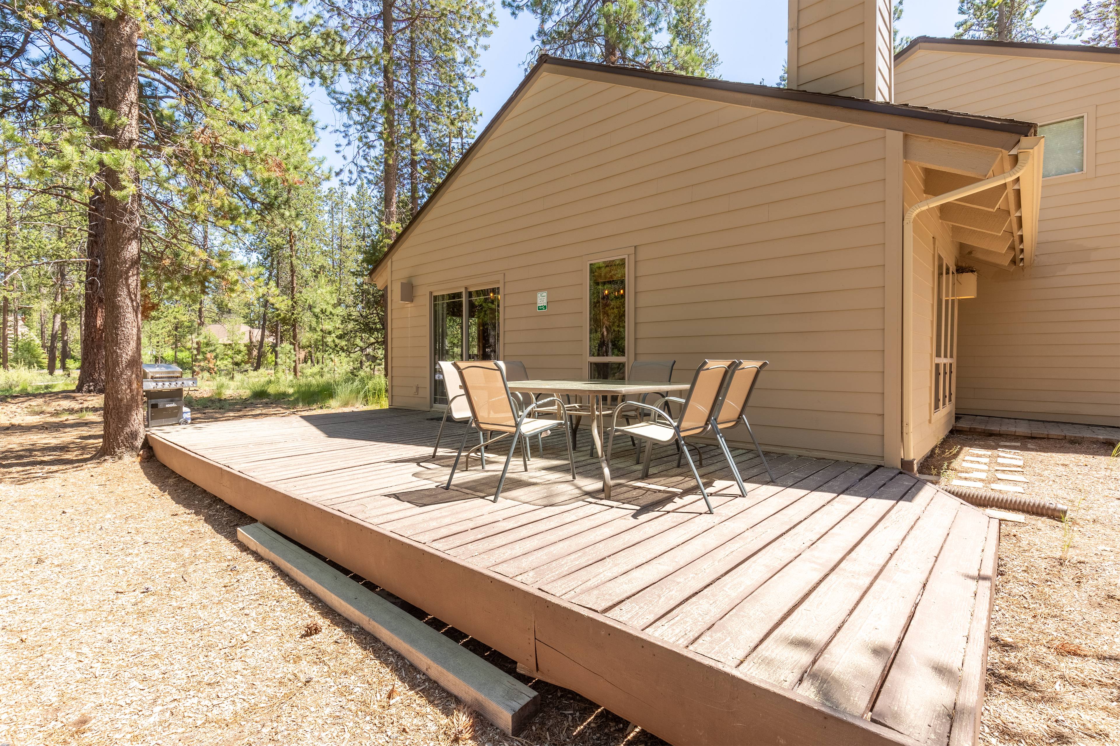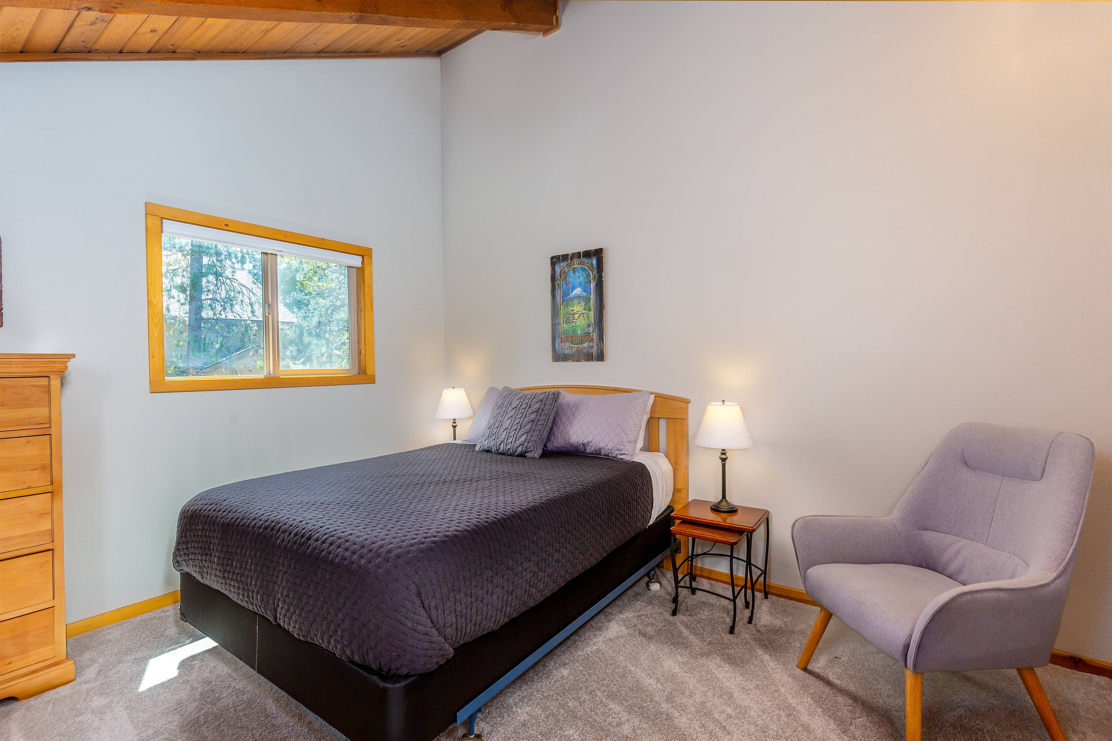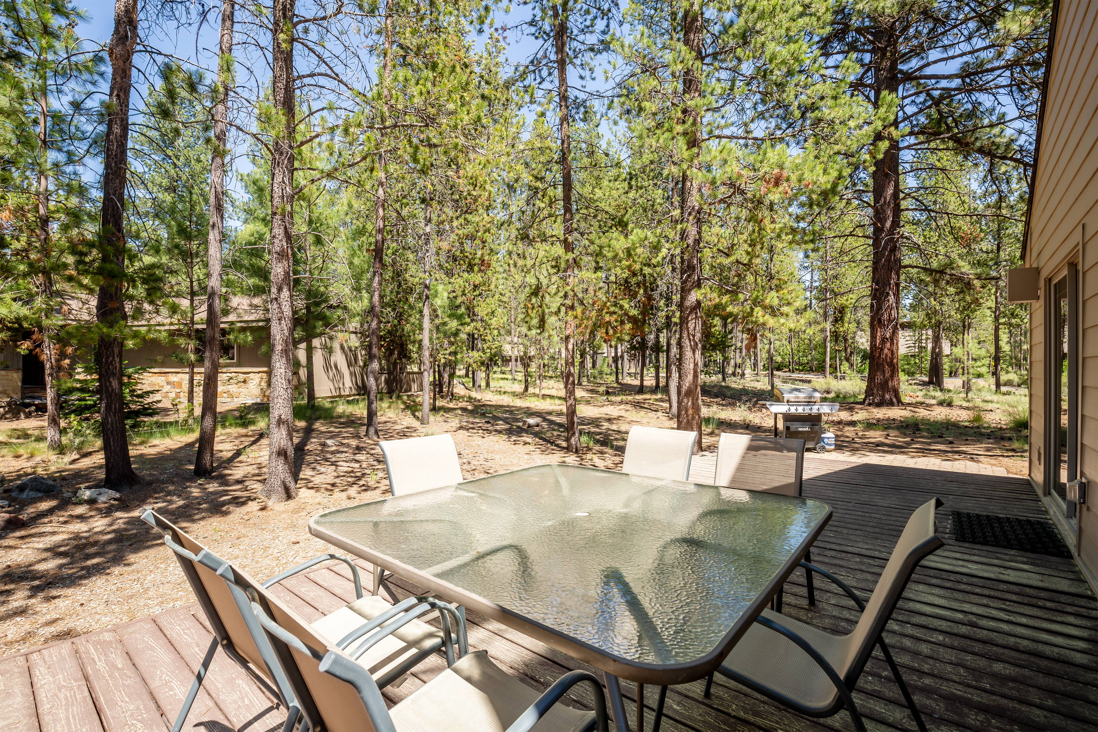 This charming, air-conditioned home, located on the south end of Sunriver, sits close to the Village shops and restaurants. The open-concept space features vaulted ceilings, a floor-to-ceiling river rock fireplace, a smart TV, and that classic Sunriver cabin vibe. The fully stocked kitchen has everything you'll need to prepare your favorite meals and is adjacent to the dining room with seating for six, plus two more can keep the chef company at the kitchen peninsula.