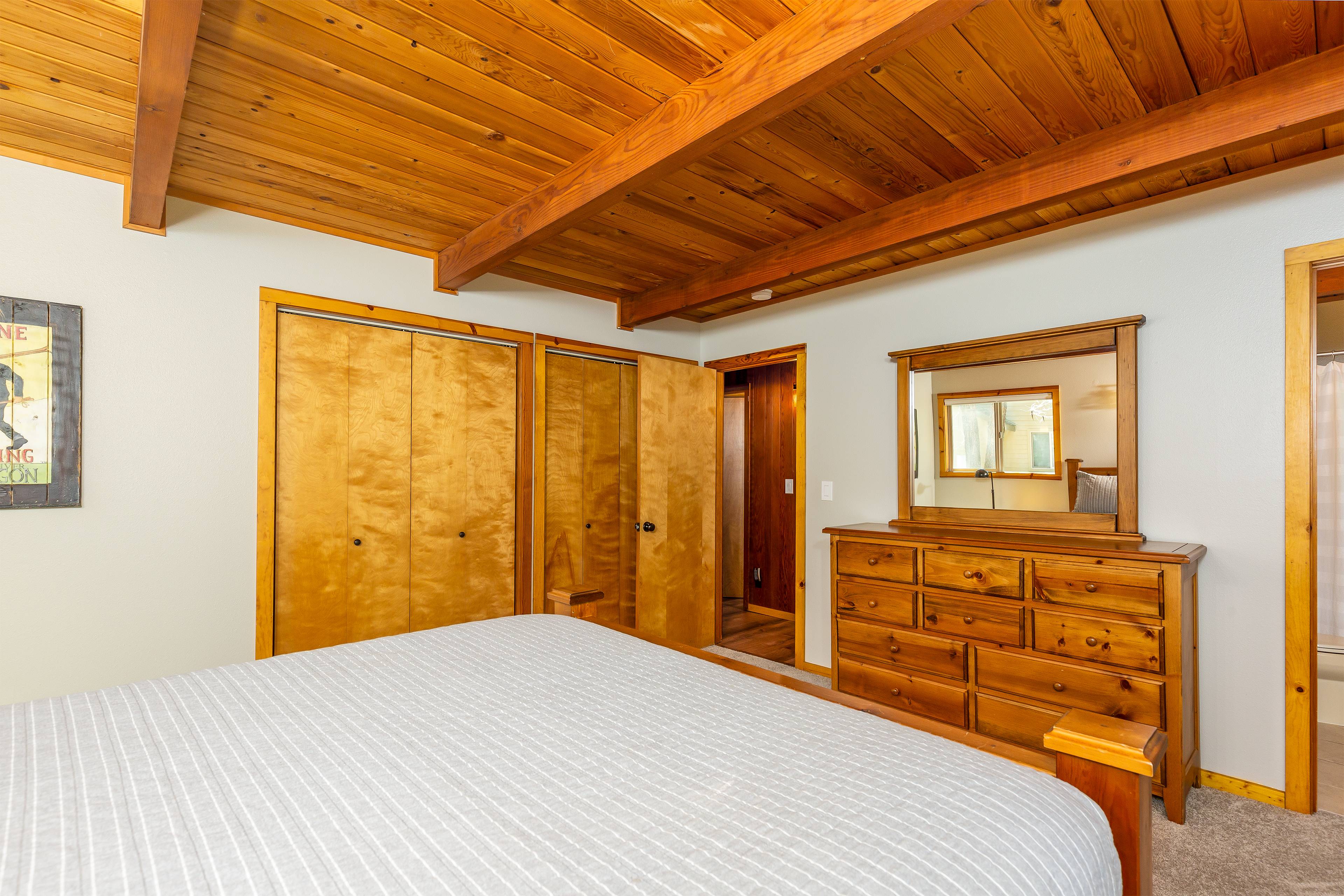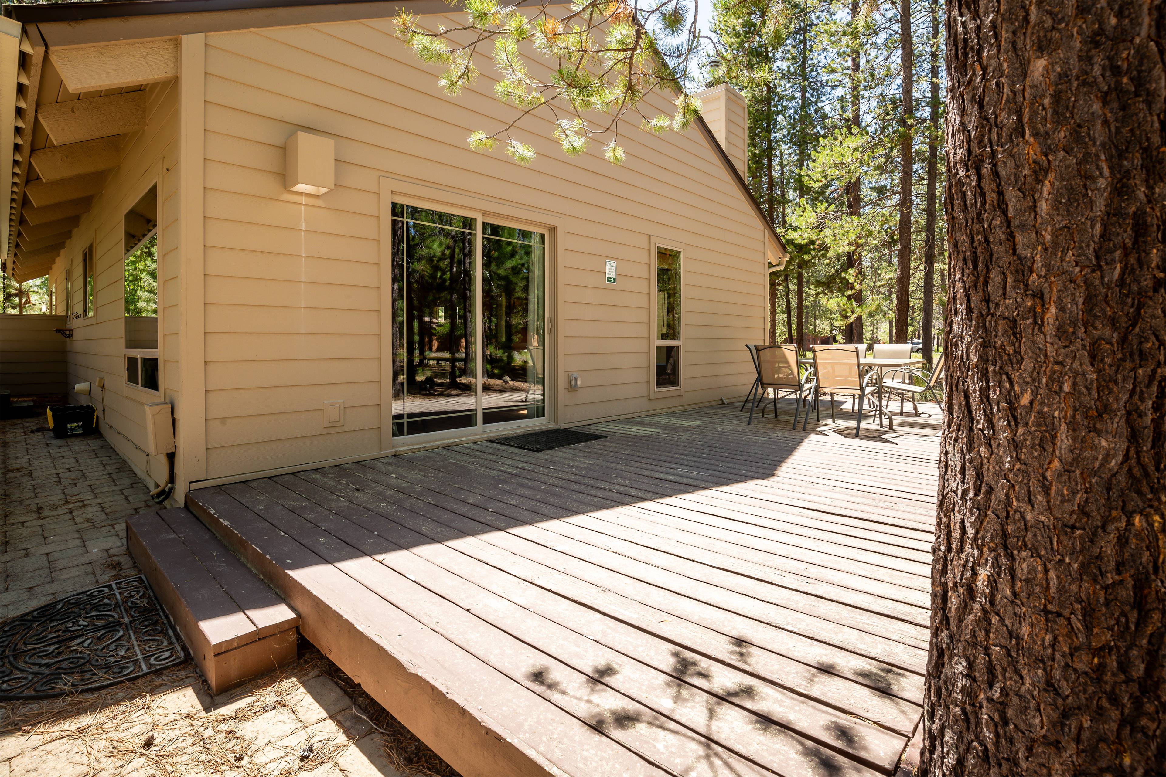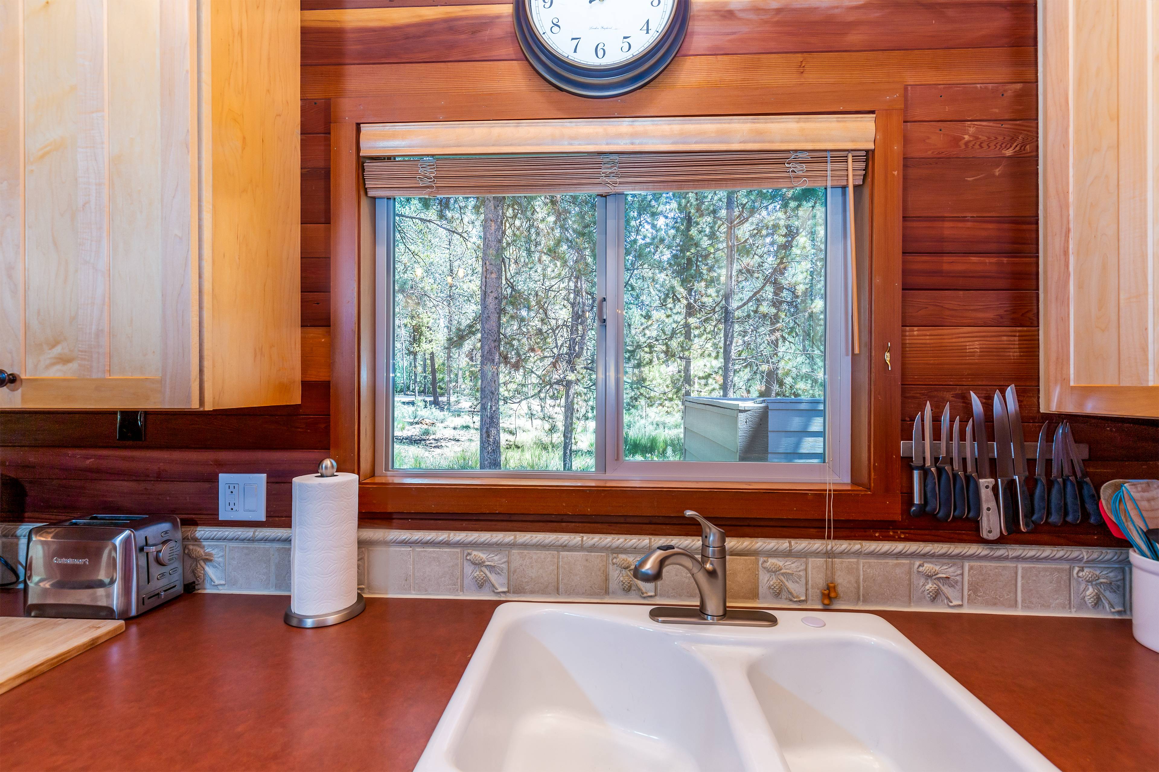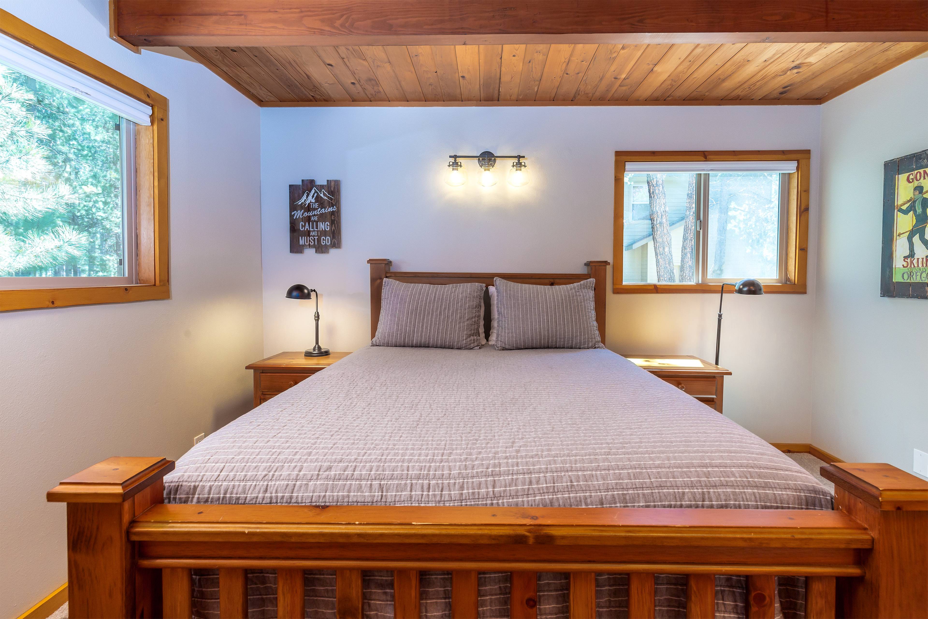 This charming, air-conditioned home, located on the south end of Sunriver, sits close to the Village shops and restaurants. The open-concept space features vaulted ceilings, a floor-to-ceiling river rock fireplace, a smart TV, and that classic Sunriver cabin vibe. The fully stocked kitchen has everything you'll need to prepare your favorite meals and is adjacent to the dining room with seating for six, plus two more can keep the chef company at the kitchen peninsula.