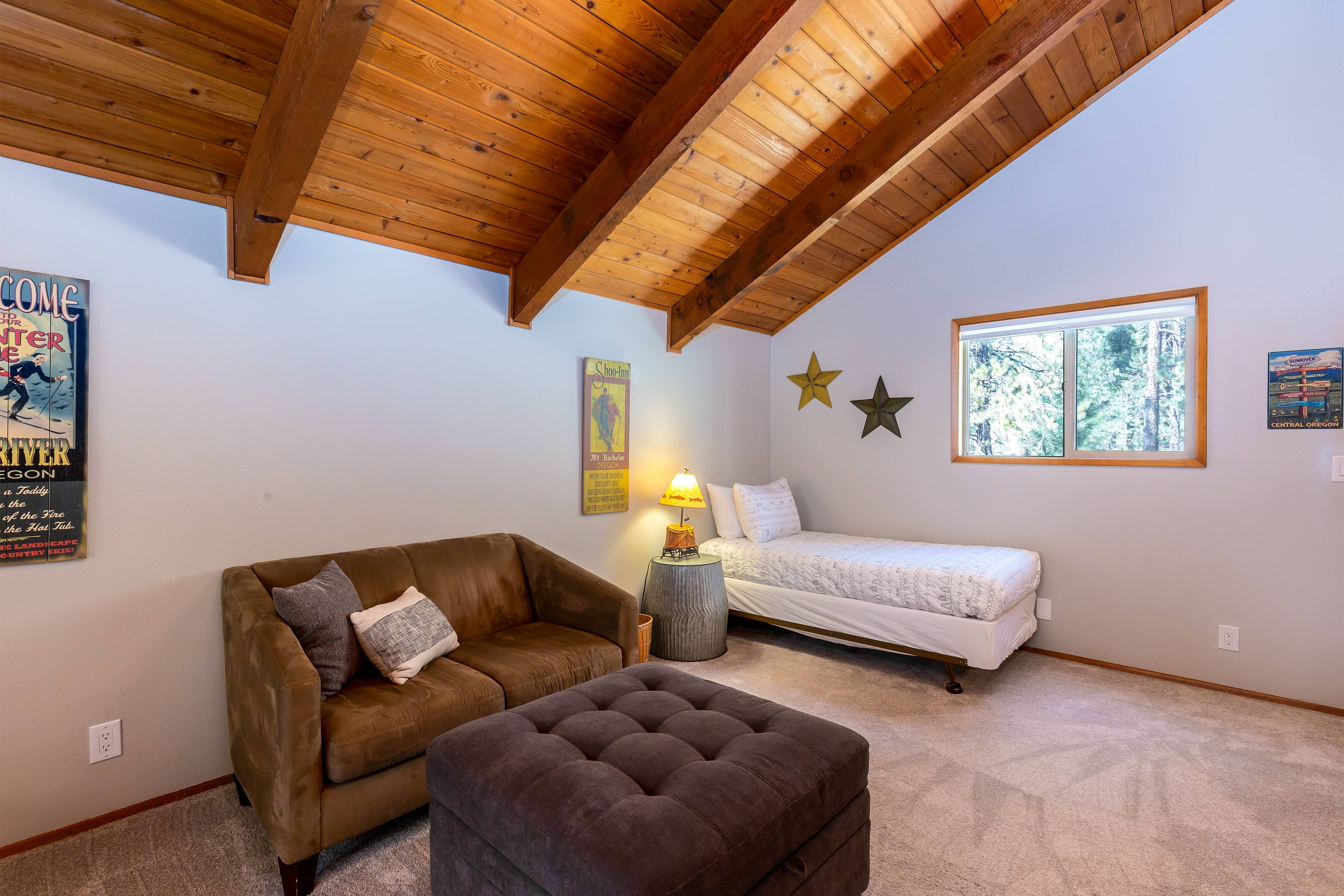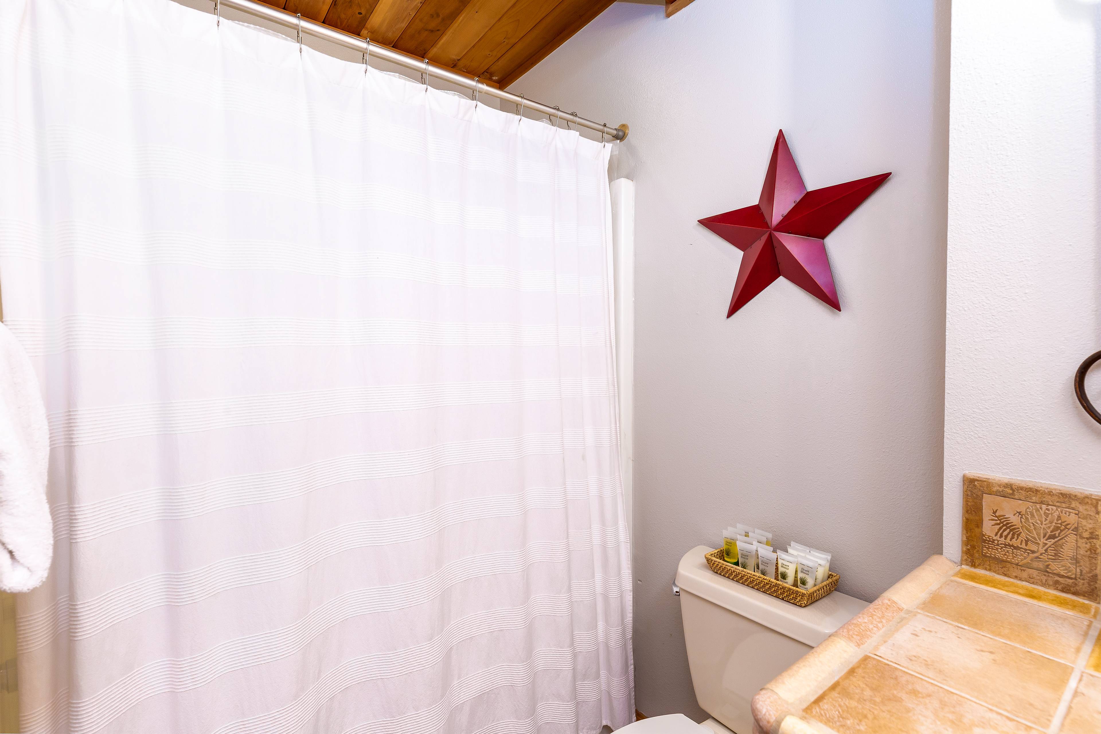 Head up the spiral staircase and find two additional bedrooms. Bedroom one features a queen-sized bed. Bedroom two features three twin beds, a TV, and a sitting area. There is a half bathroom on this level.