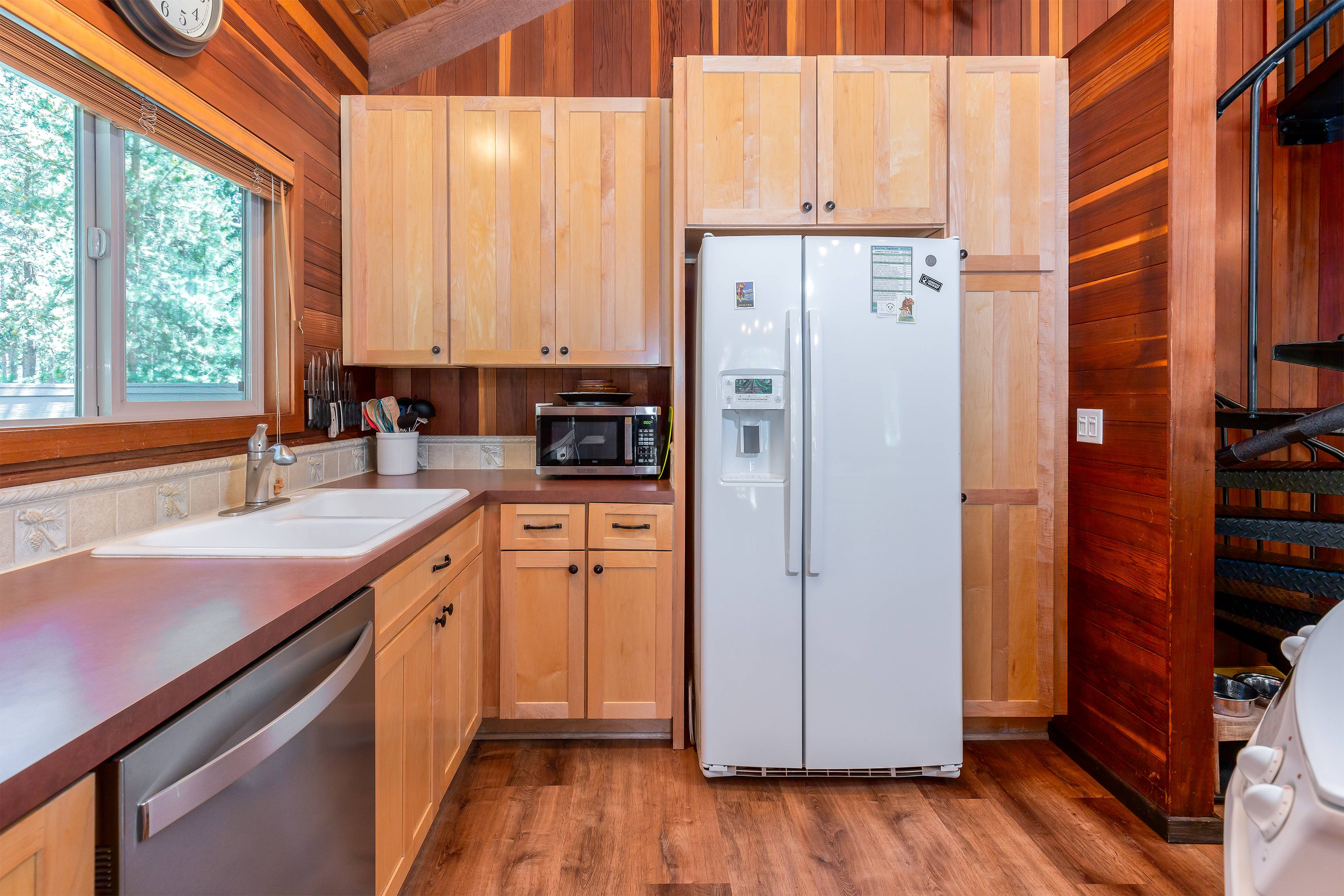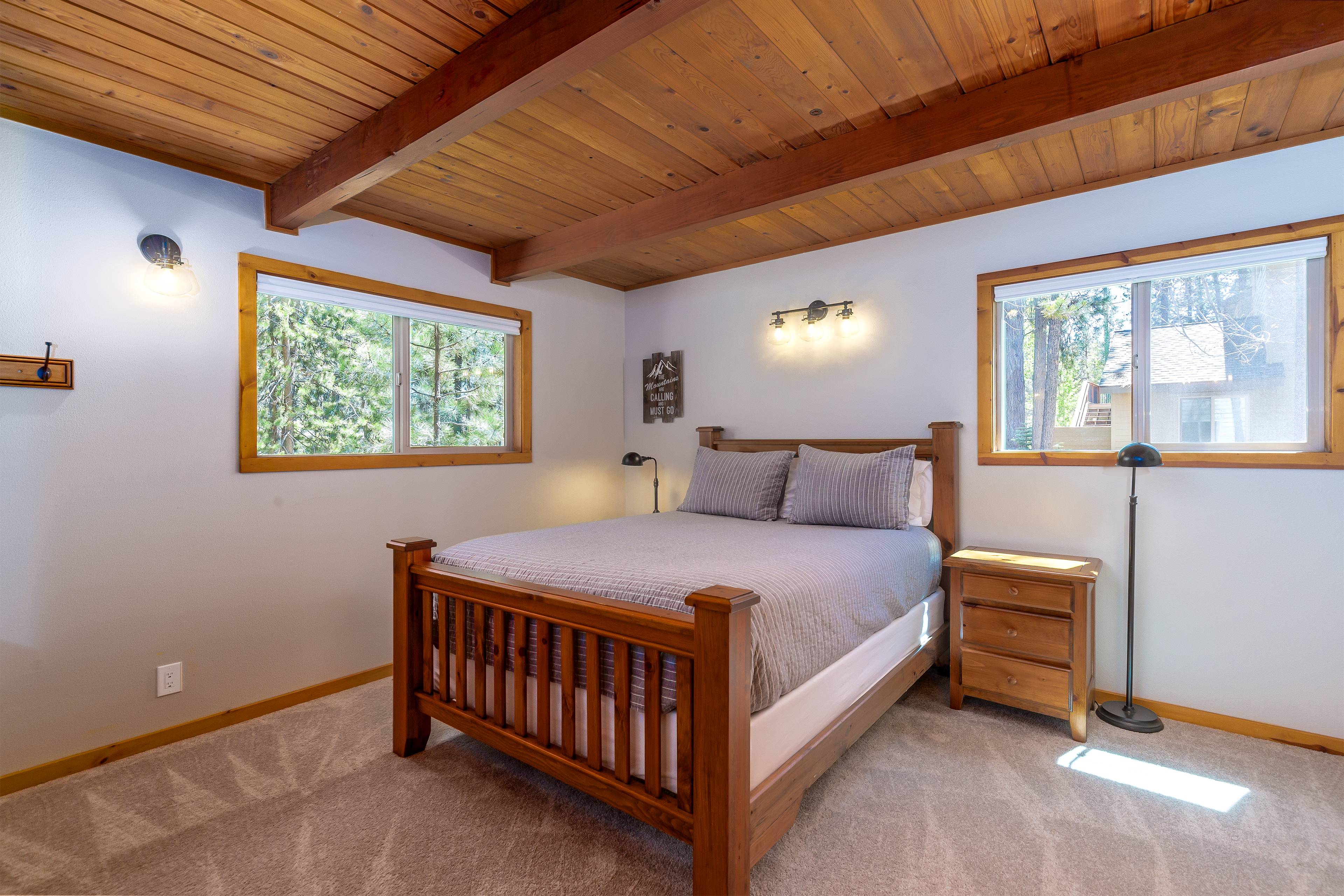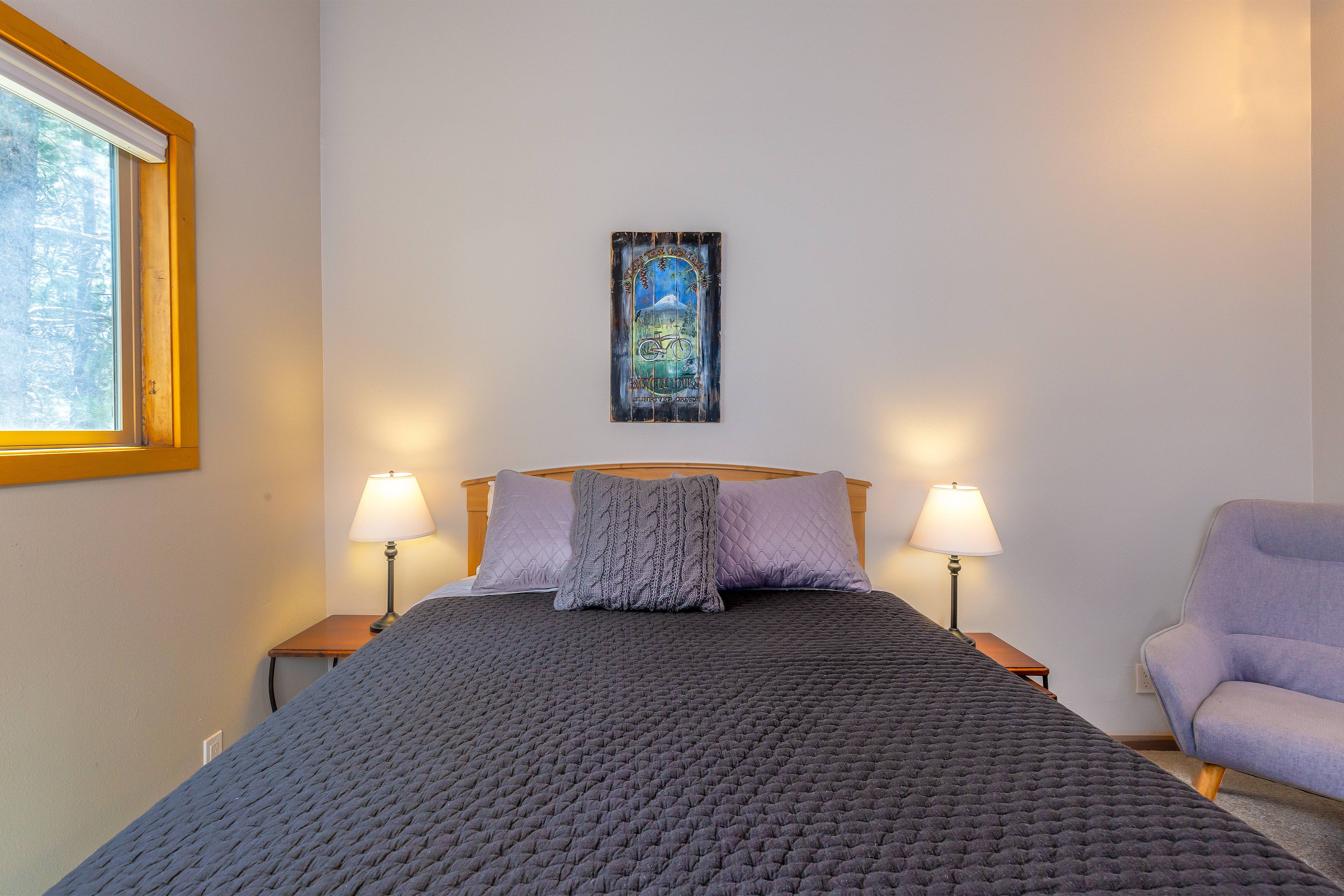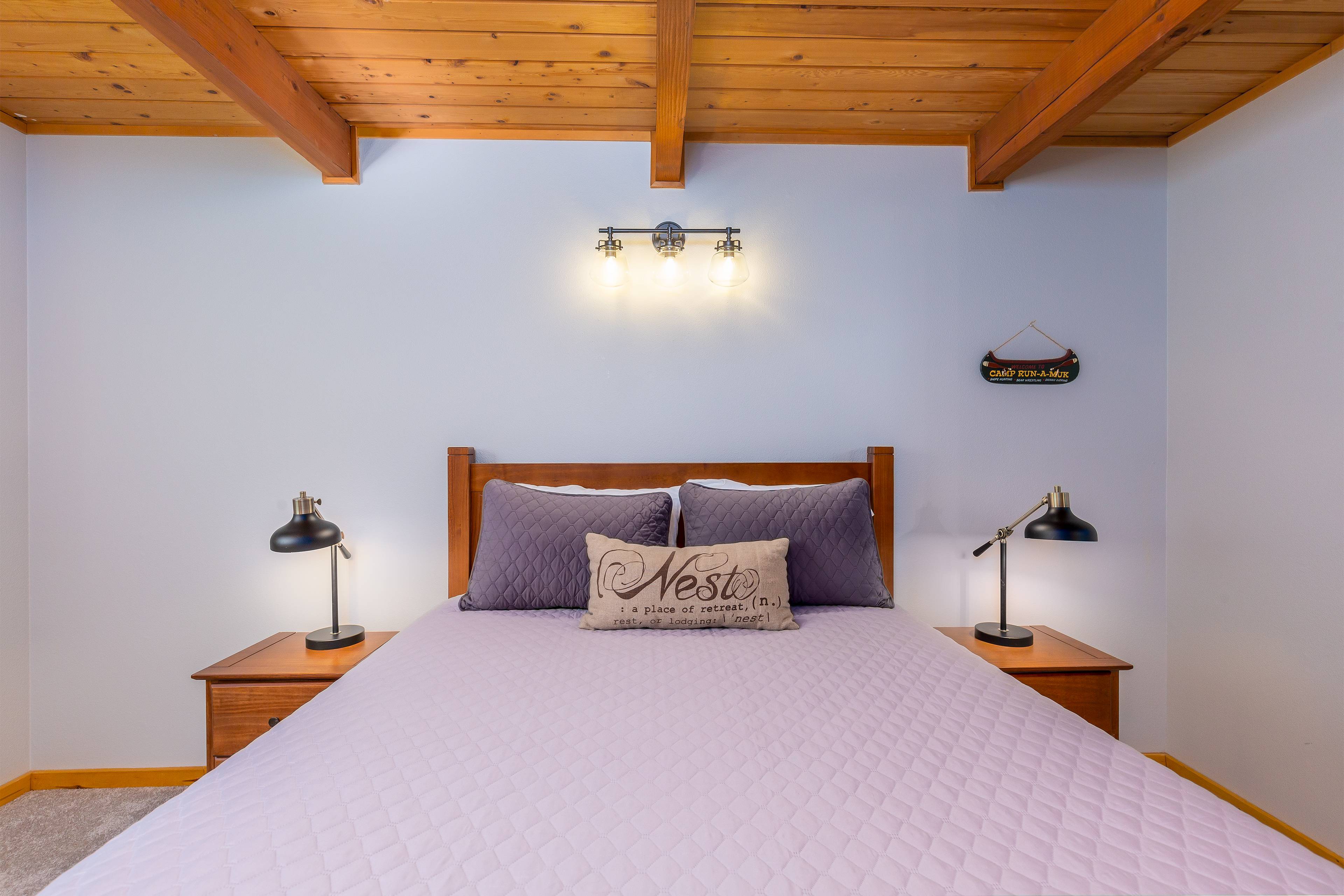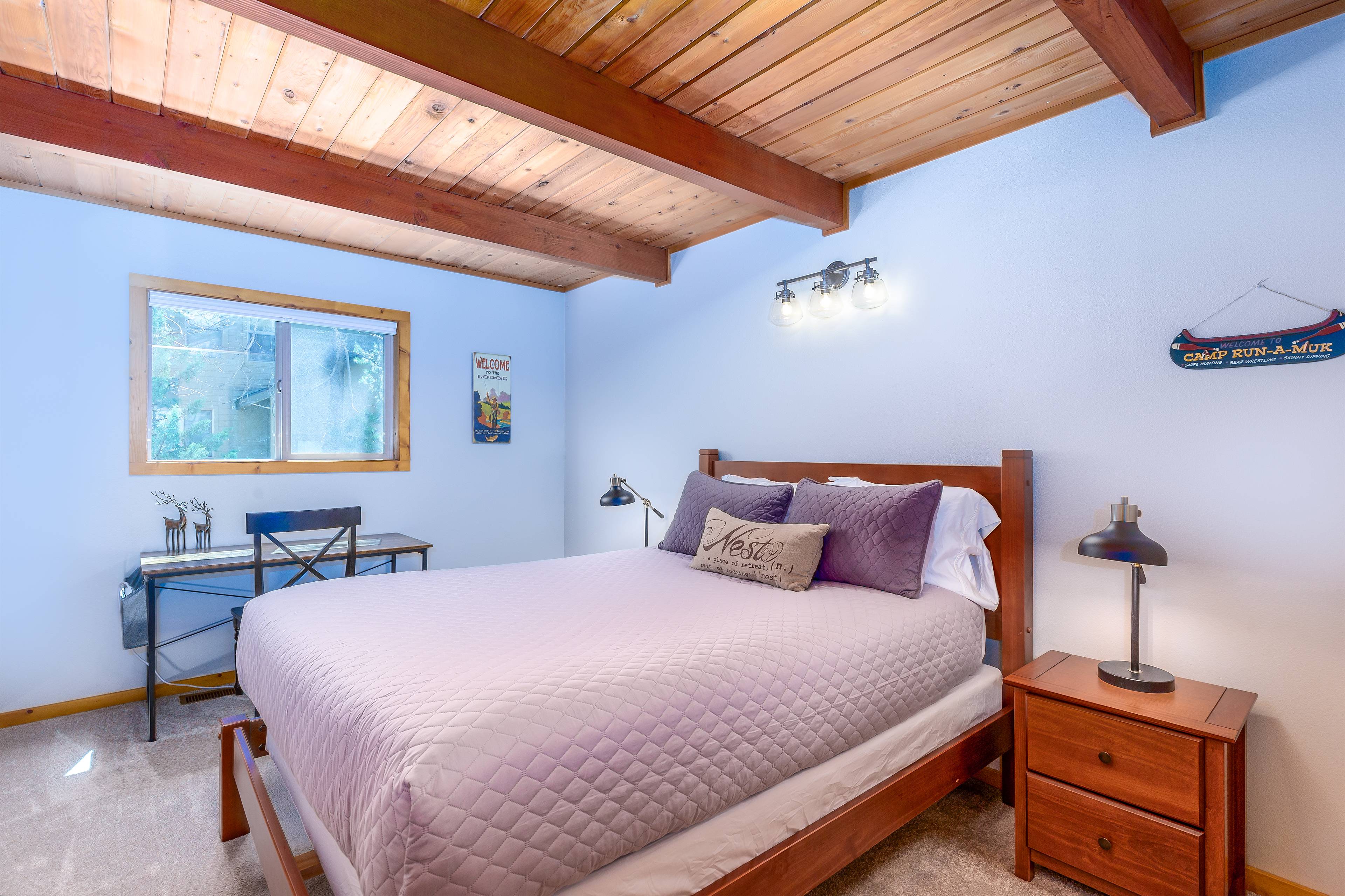 On the main level, you'll find two bedrooms. Bedroom one features a queen-sized bed and an ensuite bathroom with a walk-in shower. Bedroom two also features a queen-sized bed and has a small desk for those who have to catch up on their emails or homework while away. There is also a full guest bathroom, with shower over tub, on this level.