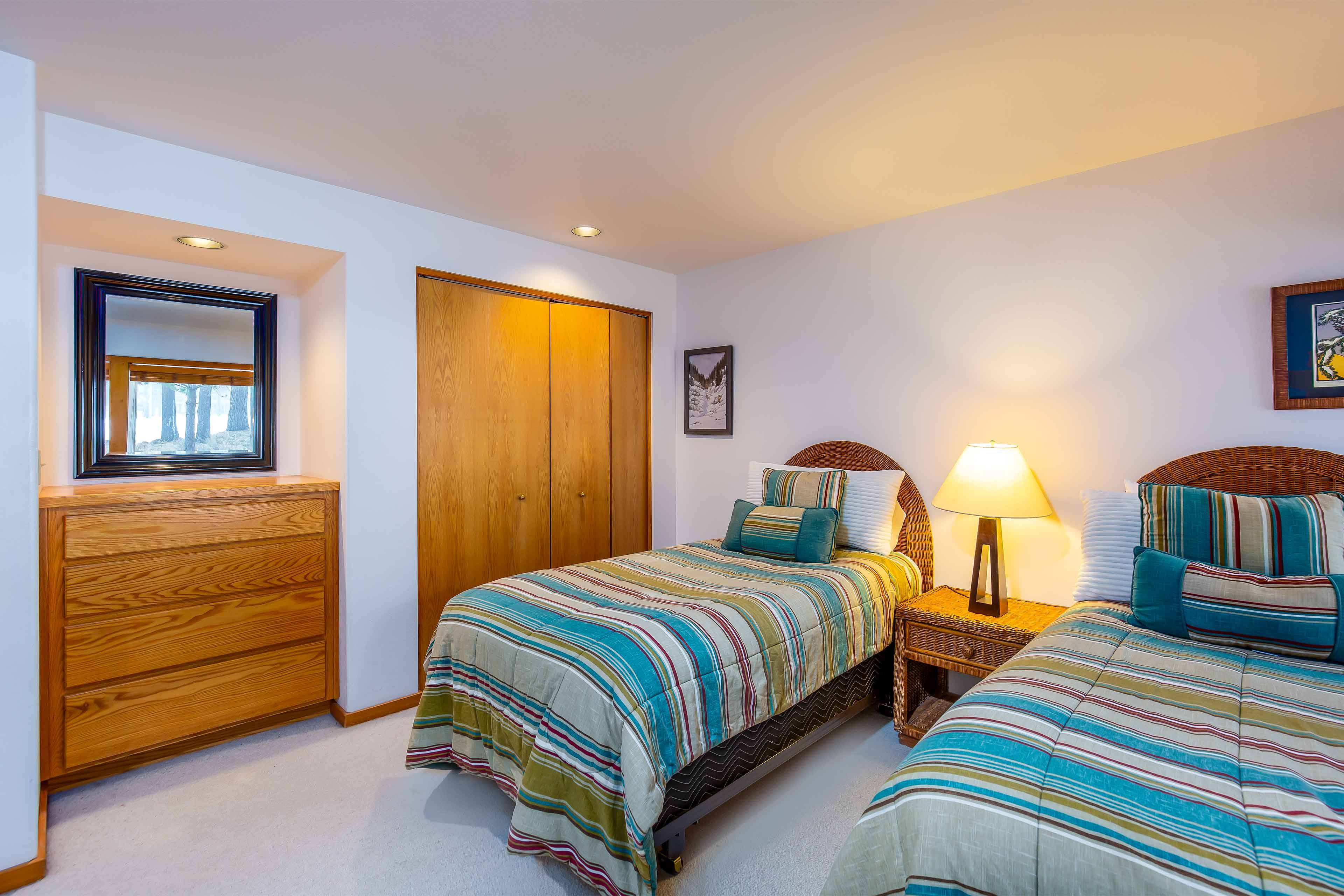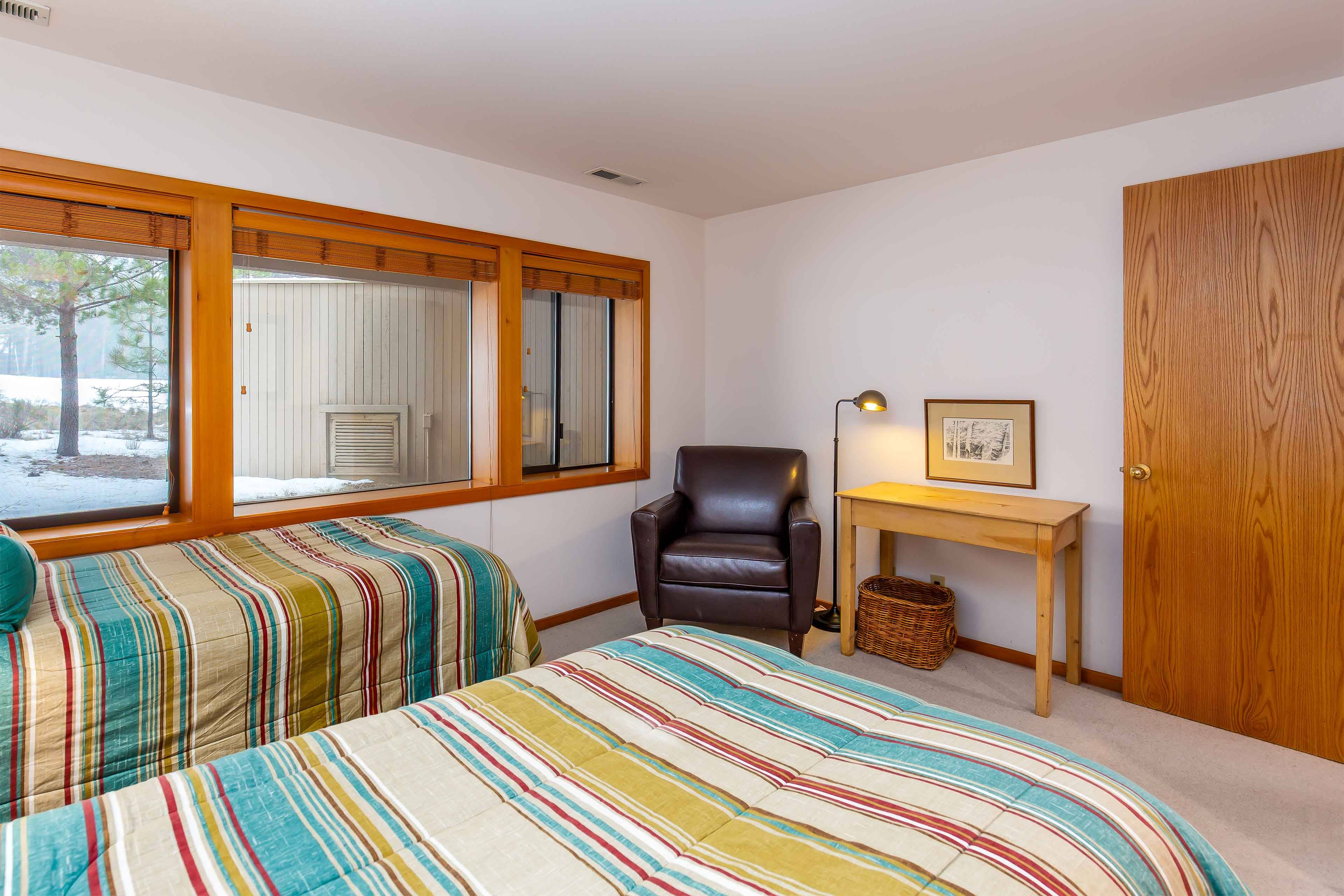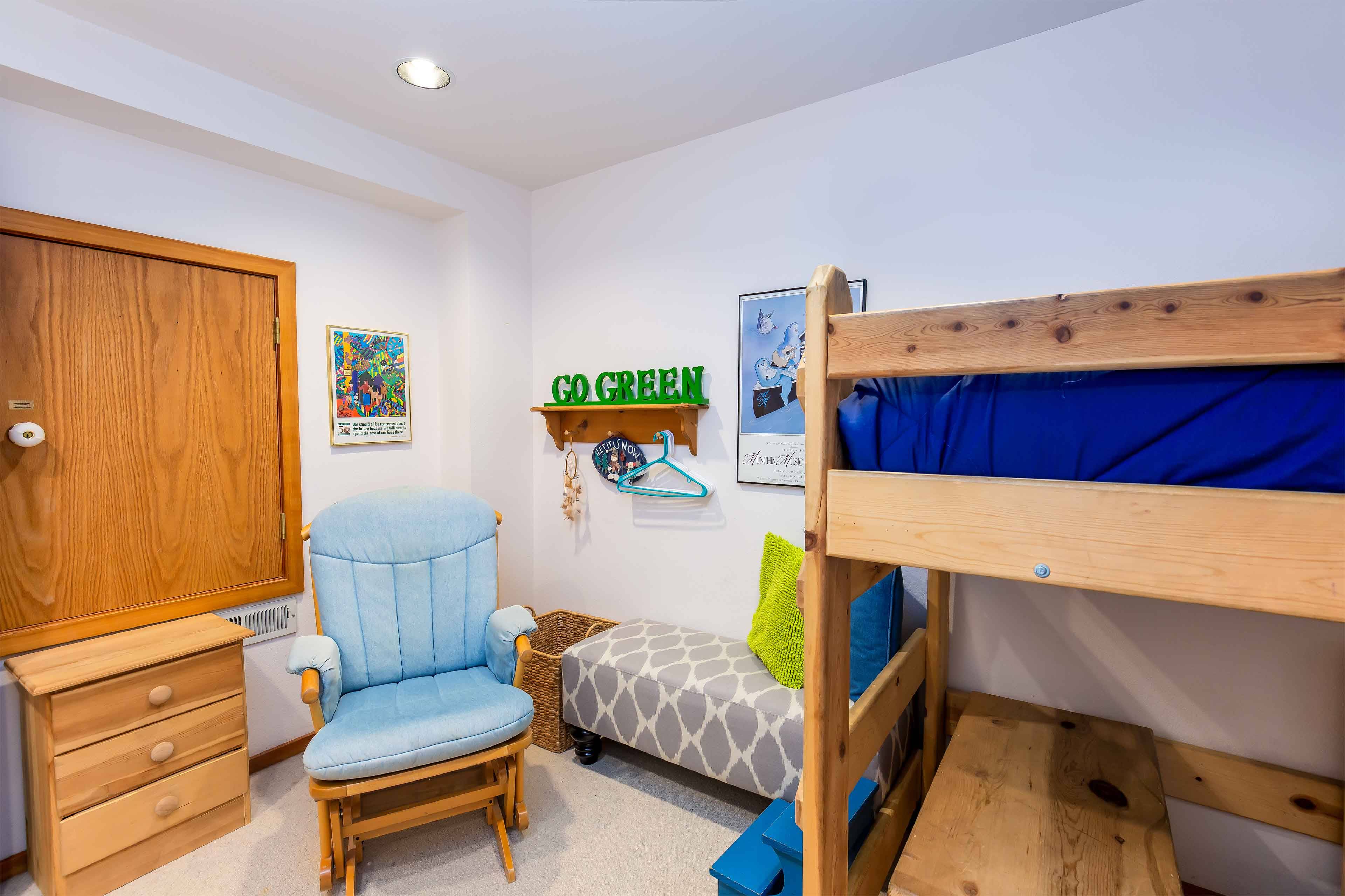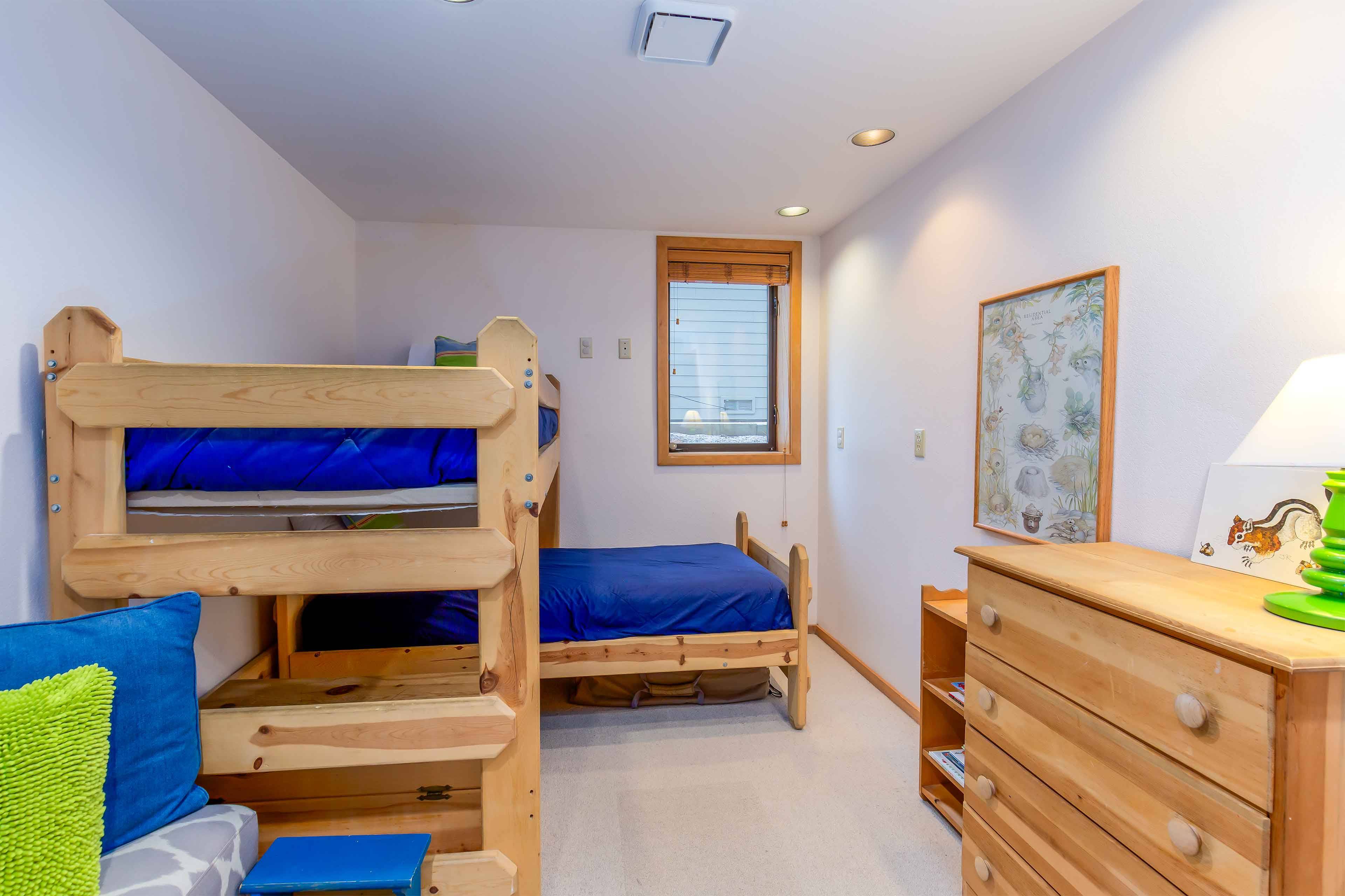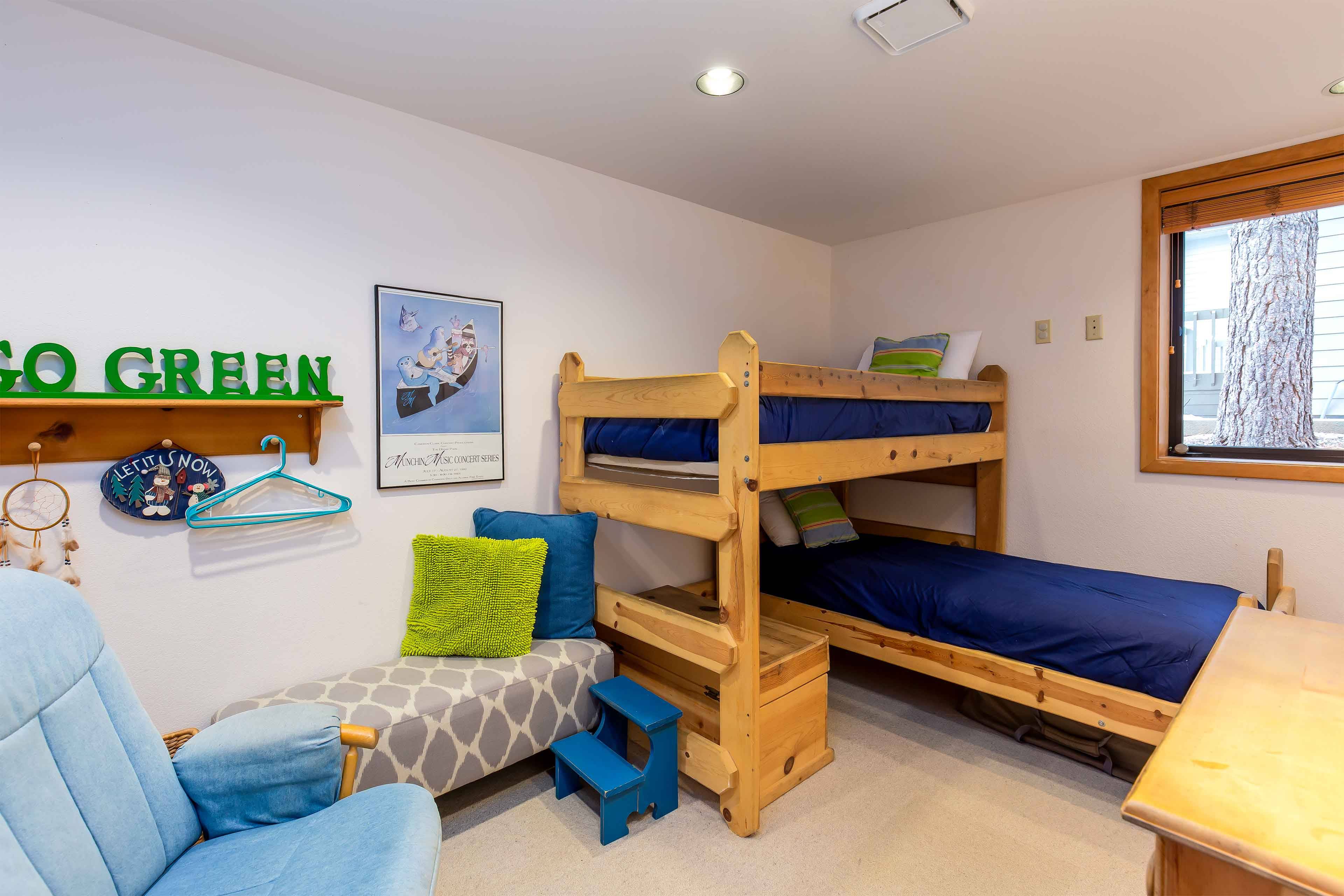 Downstairs, you'll find three additional bedrooms: one with a queen bed, one with two twin beds, and another with a twin-over-twin bunk—ideal for kids or extra guests. A second living space downstairs offers a comfy family room with a TV, giving everyone plenty of space to spread out and relax.