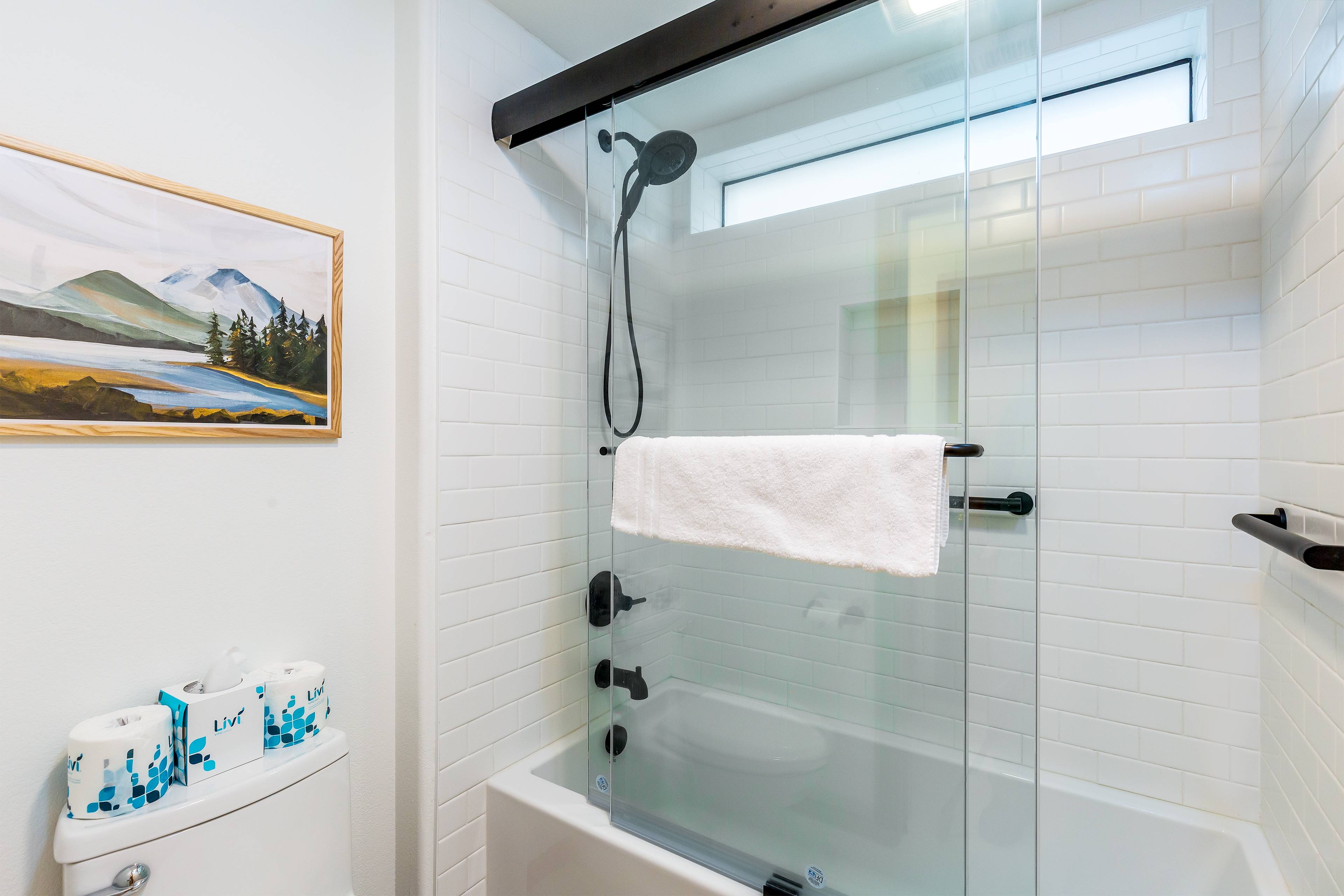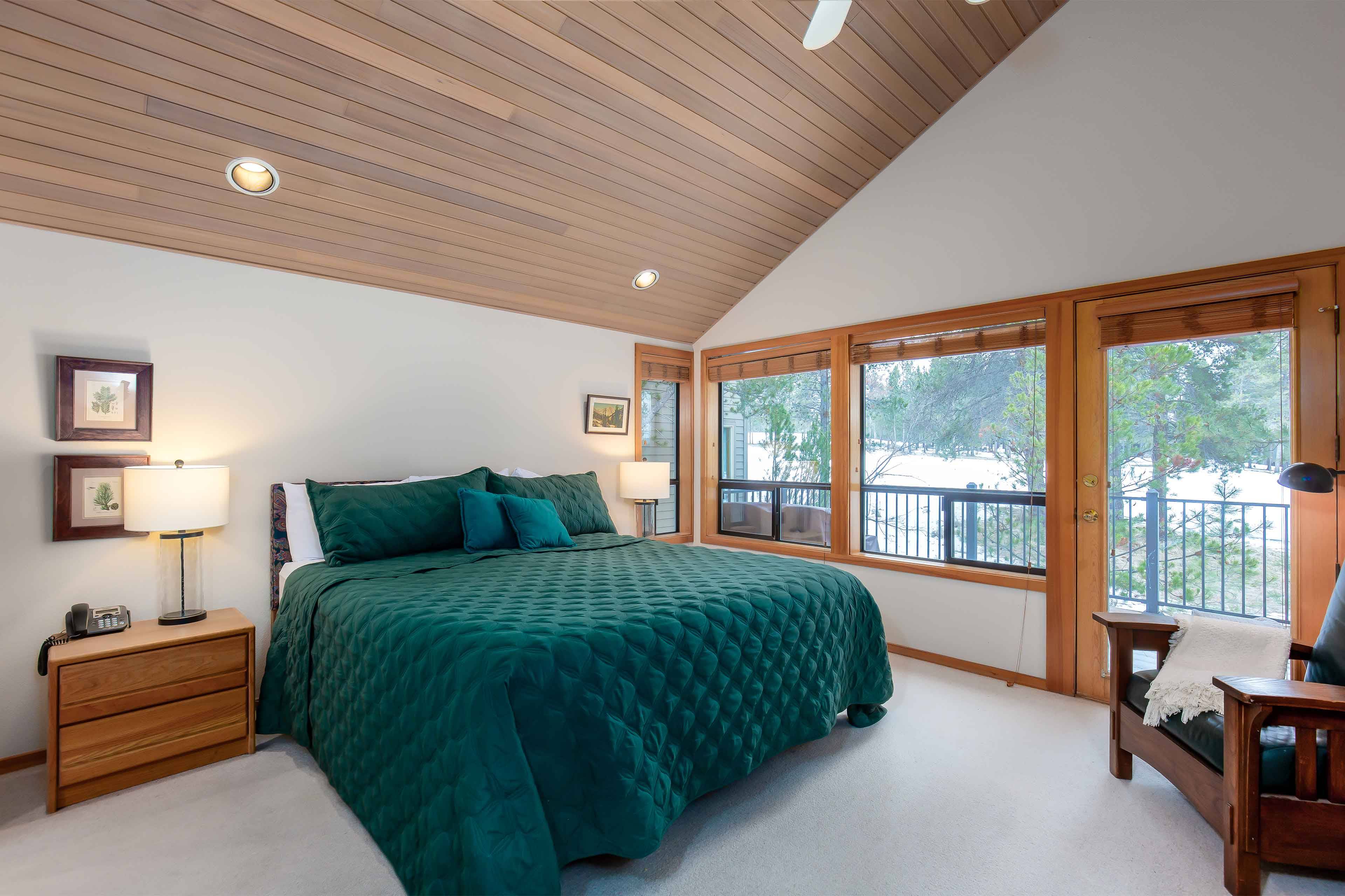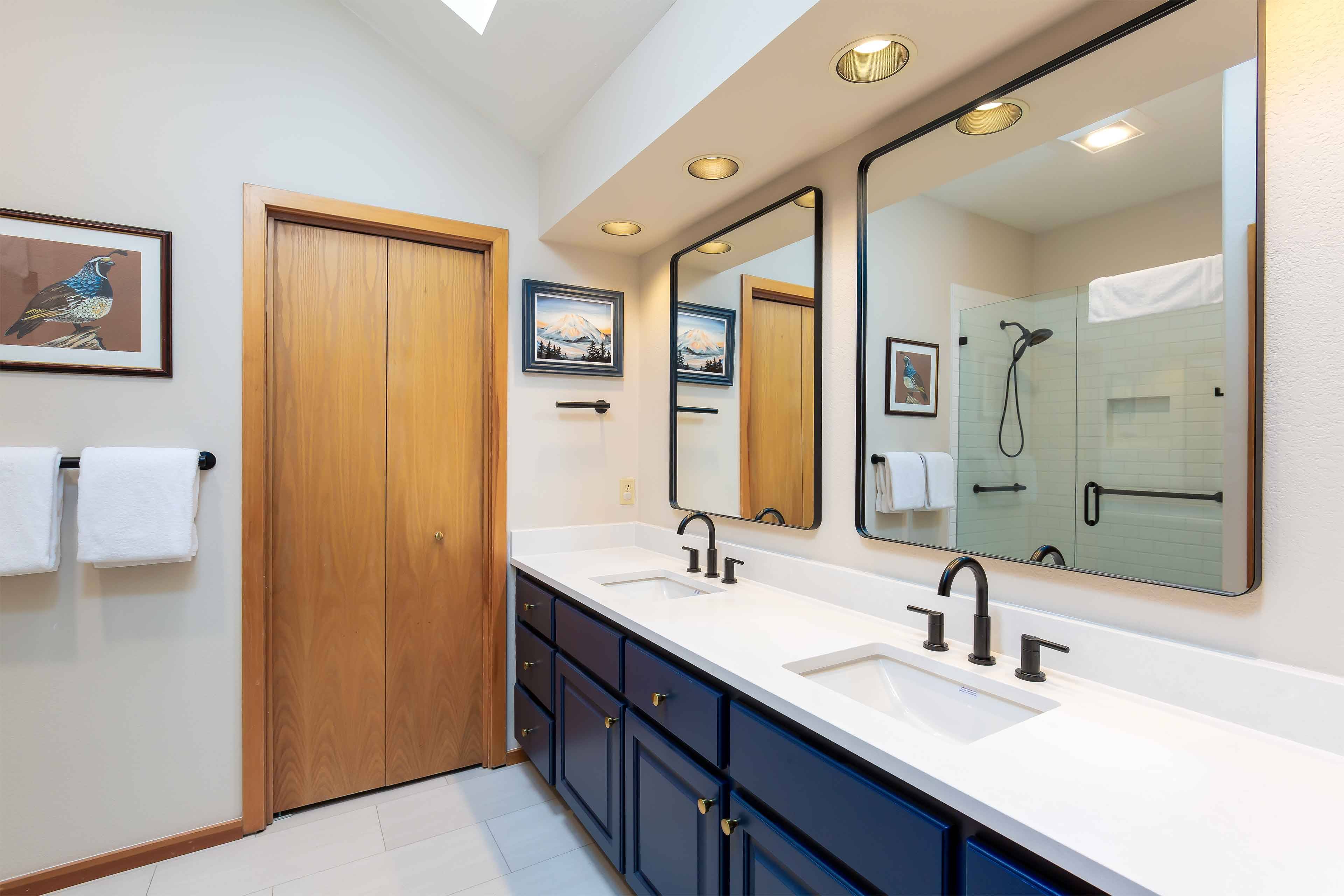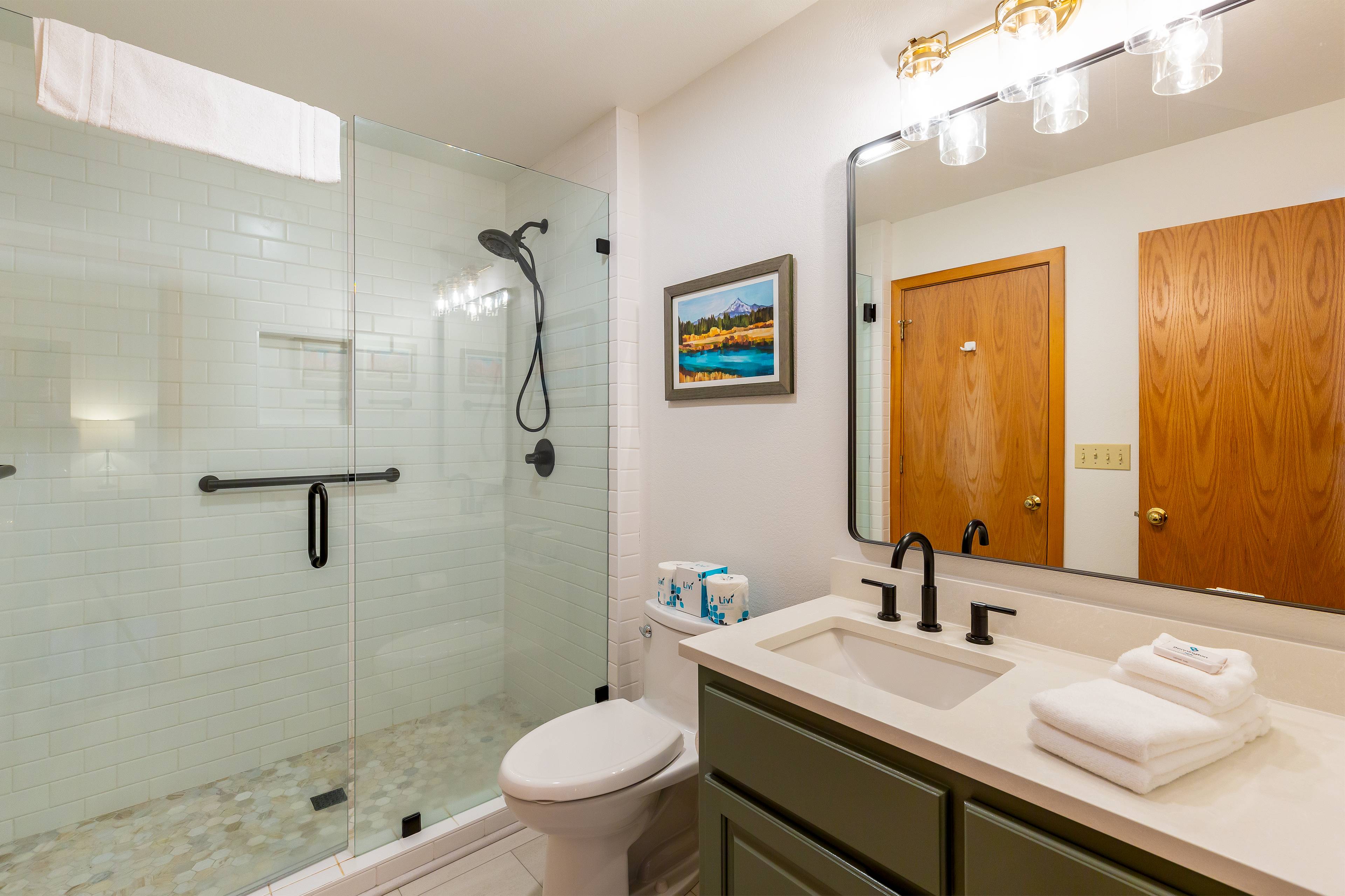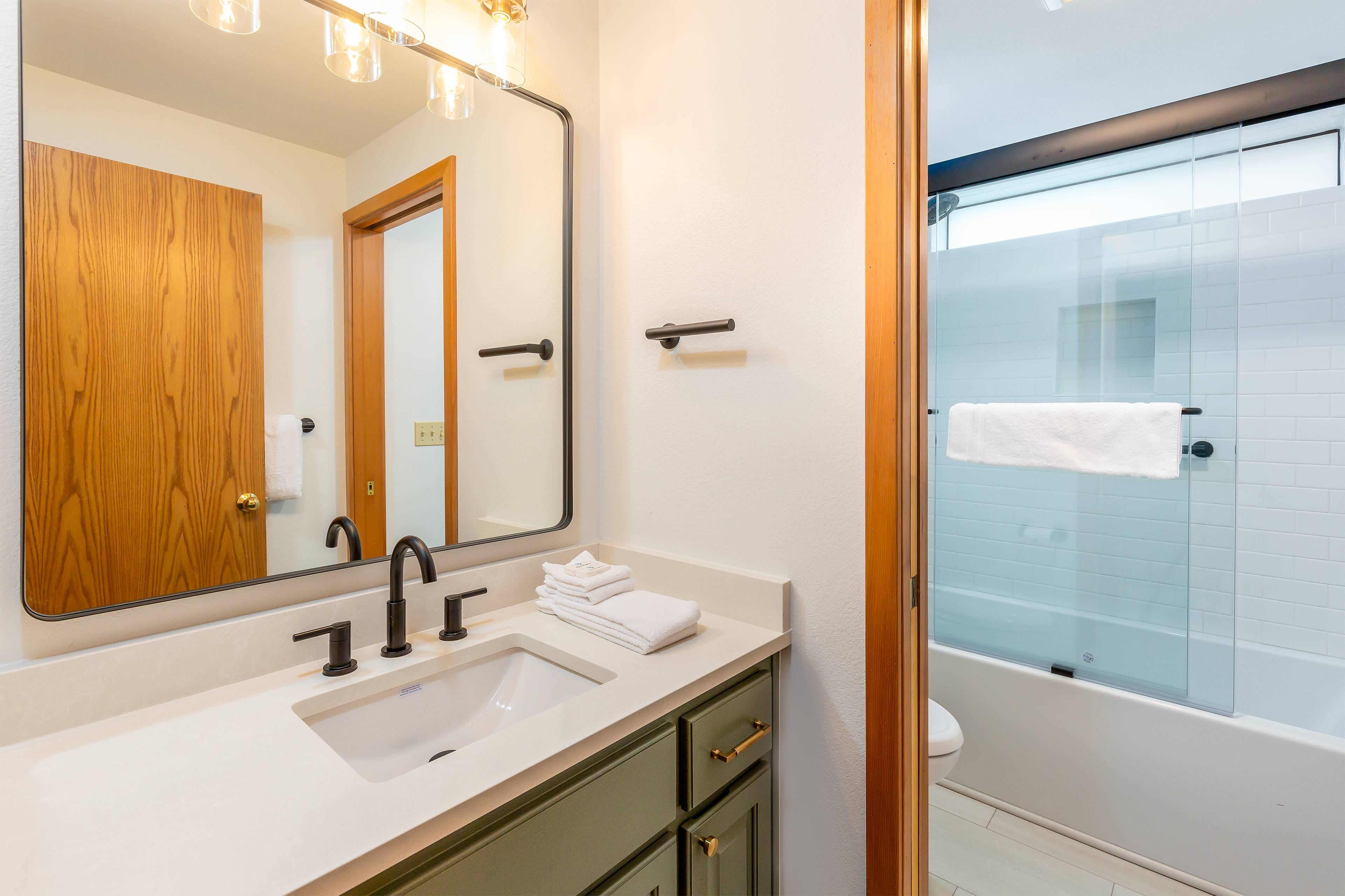 On the main level you'll find the primary bedroom featuring a comfortable King-sized bed, a newly remodeled ensuite bathroom with dual vanities and a private deck.