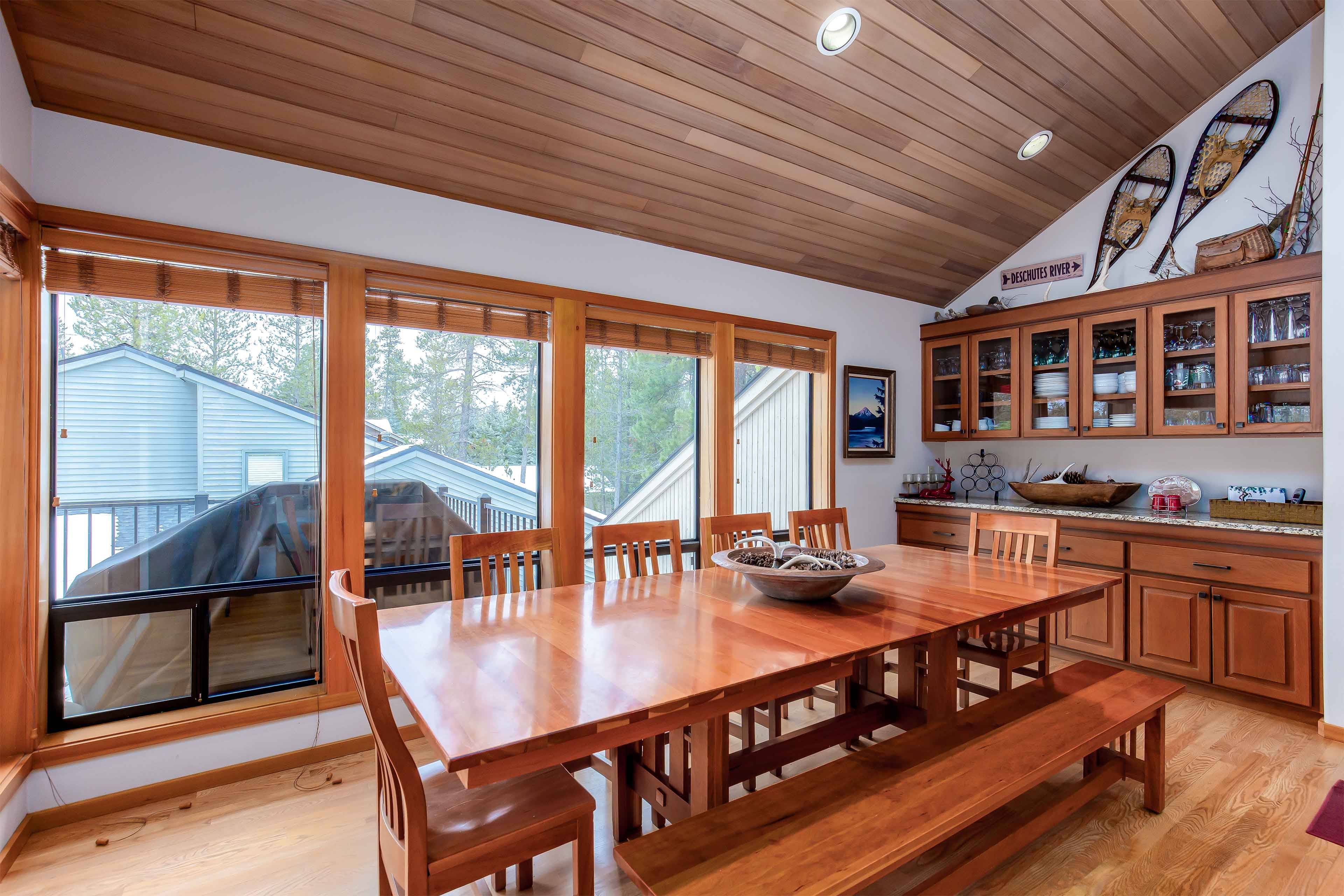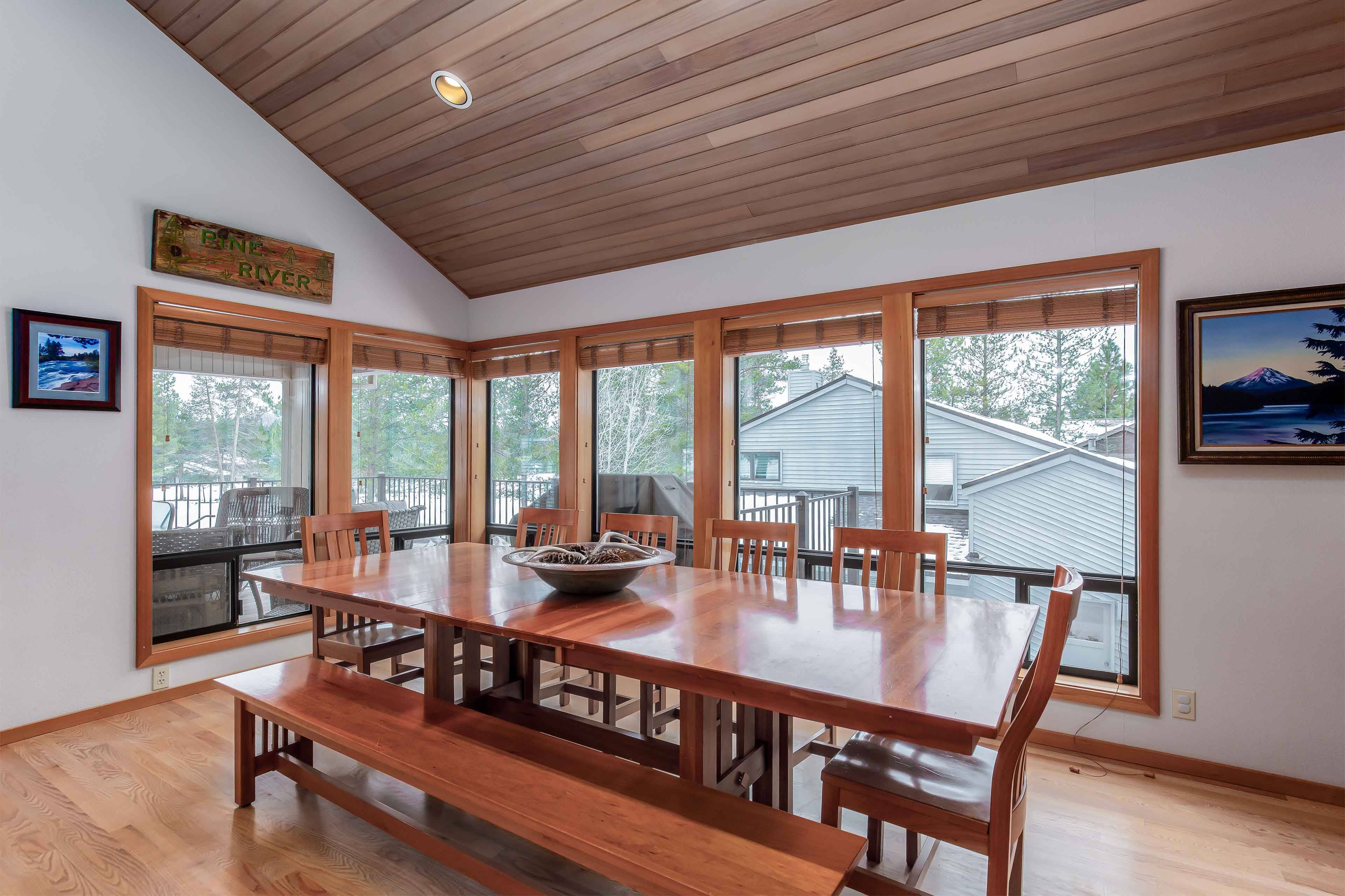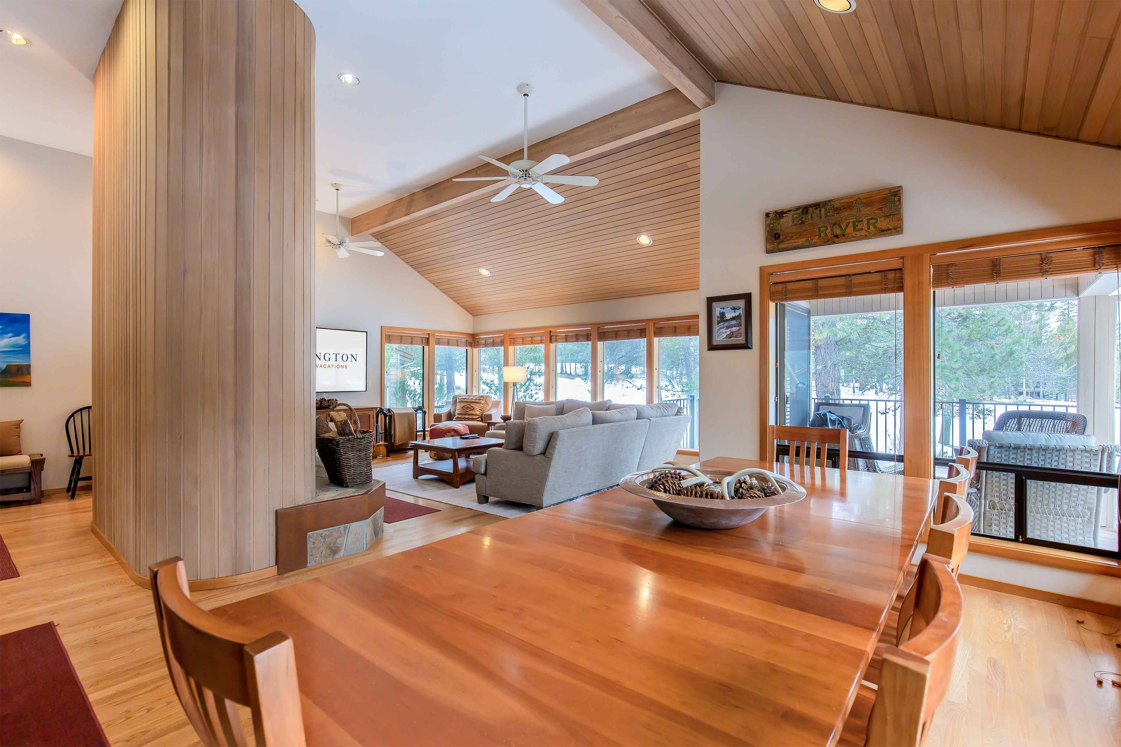 This inviting Sunriver vacation rental home is nestled in the trees, perfect for relaxing in nature. This 4-bedroom, 3.5-bathroom home comfortably sleeps 10 and features reverse living, offering a bright, open main level with vaulted ceilings and beautiful natural light. The main floor includes a fully stocked kitchen, a welcoming dining area, and a cozy living room —perfect for gathering after a day of adventure.