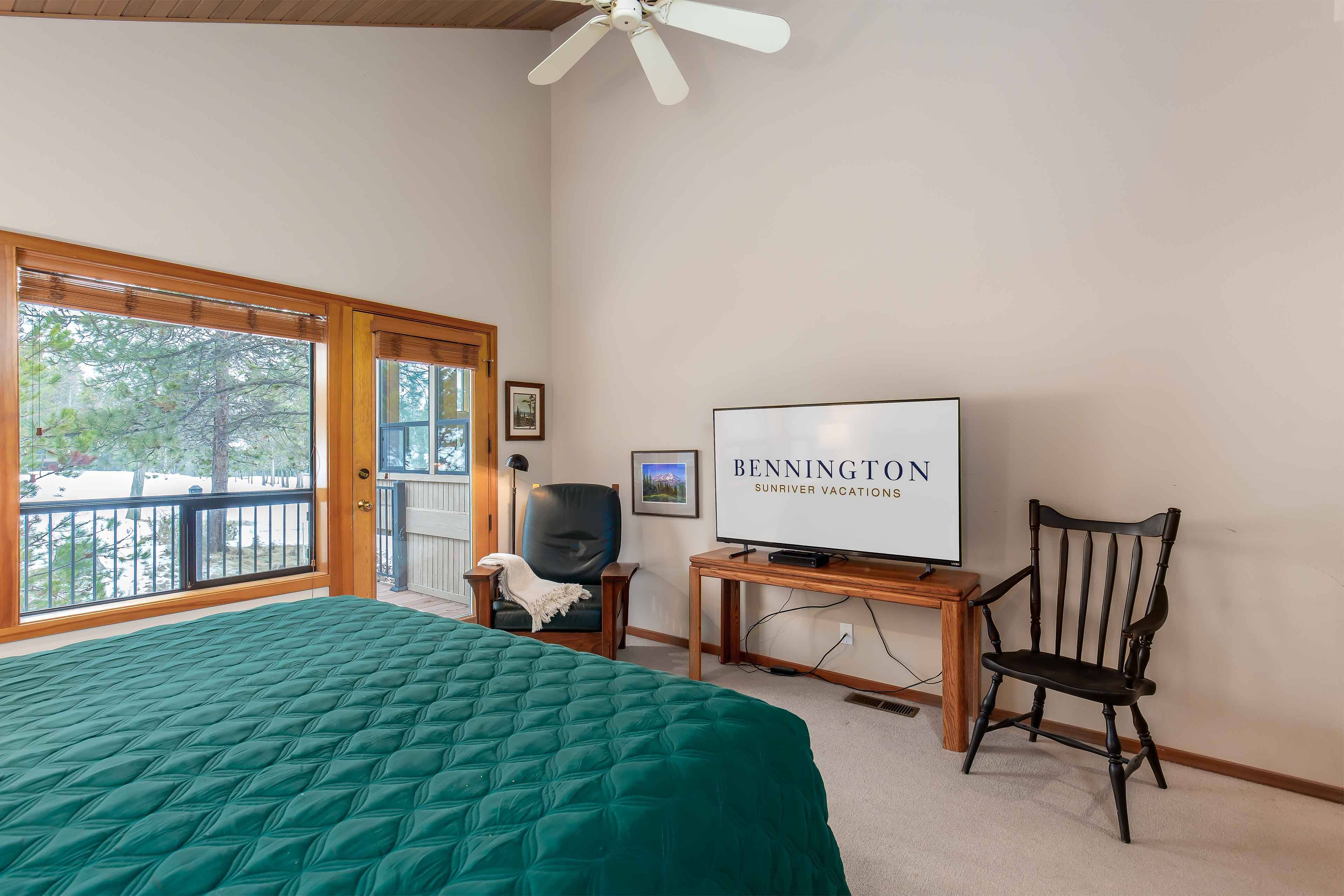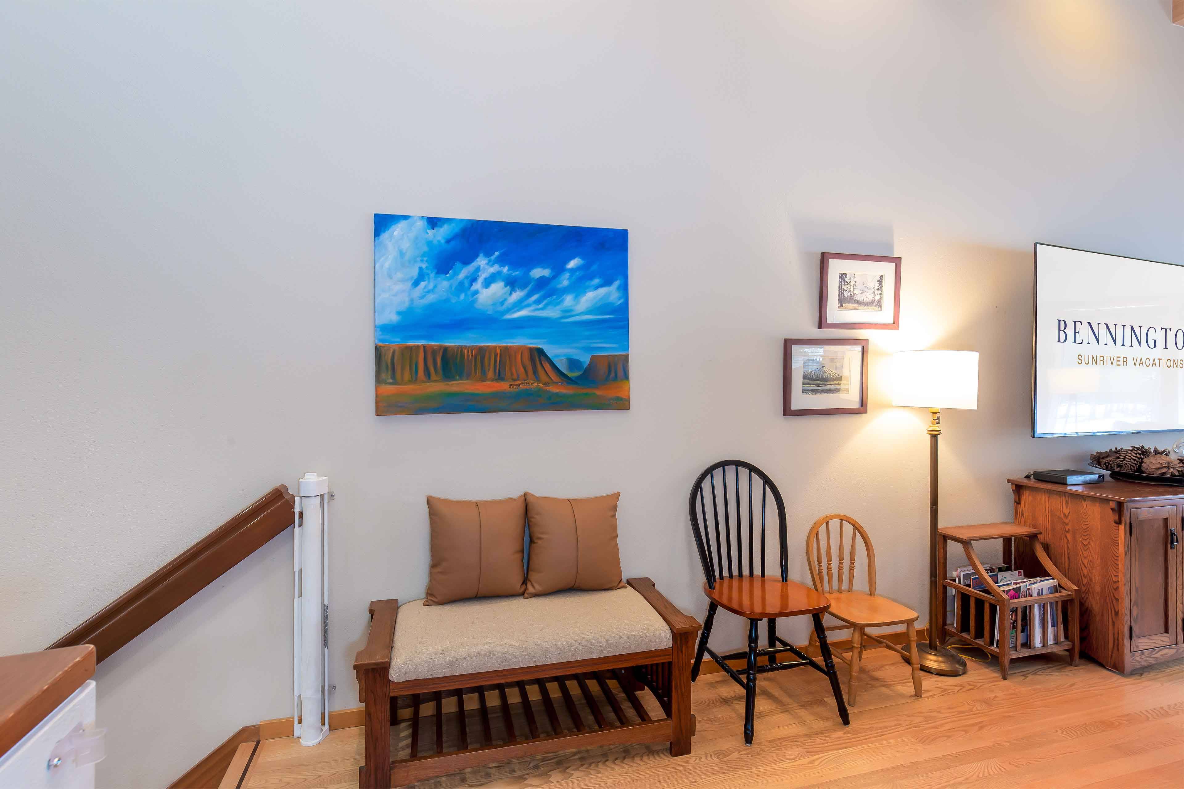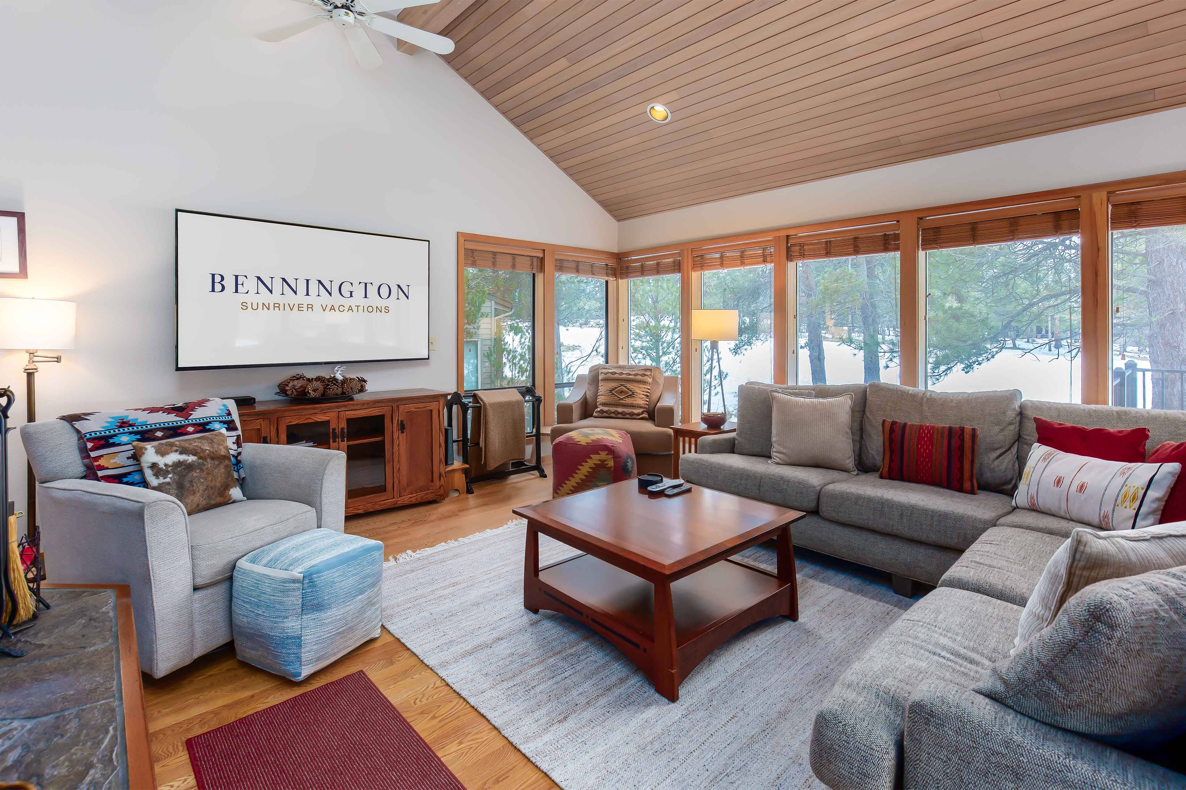 This inviting Sunriver vacation rental home is nestled in the trees, perfect for relaxing in nature. This 4-bedroom, 3.5-bathroom home comfortably sleeps 10 and features reverse living, offering a bright, open main level with vaulted ceilings and beautiful natural light. The main floor includes a fully stocked kitchen, a welcoming dining area, and a cozy living room —perfect for gathering after a day of adventure.