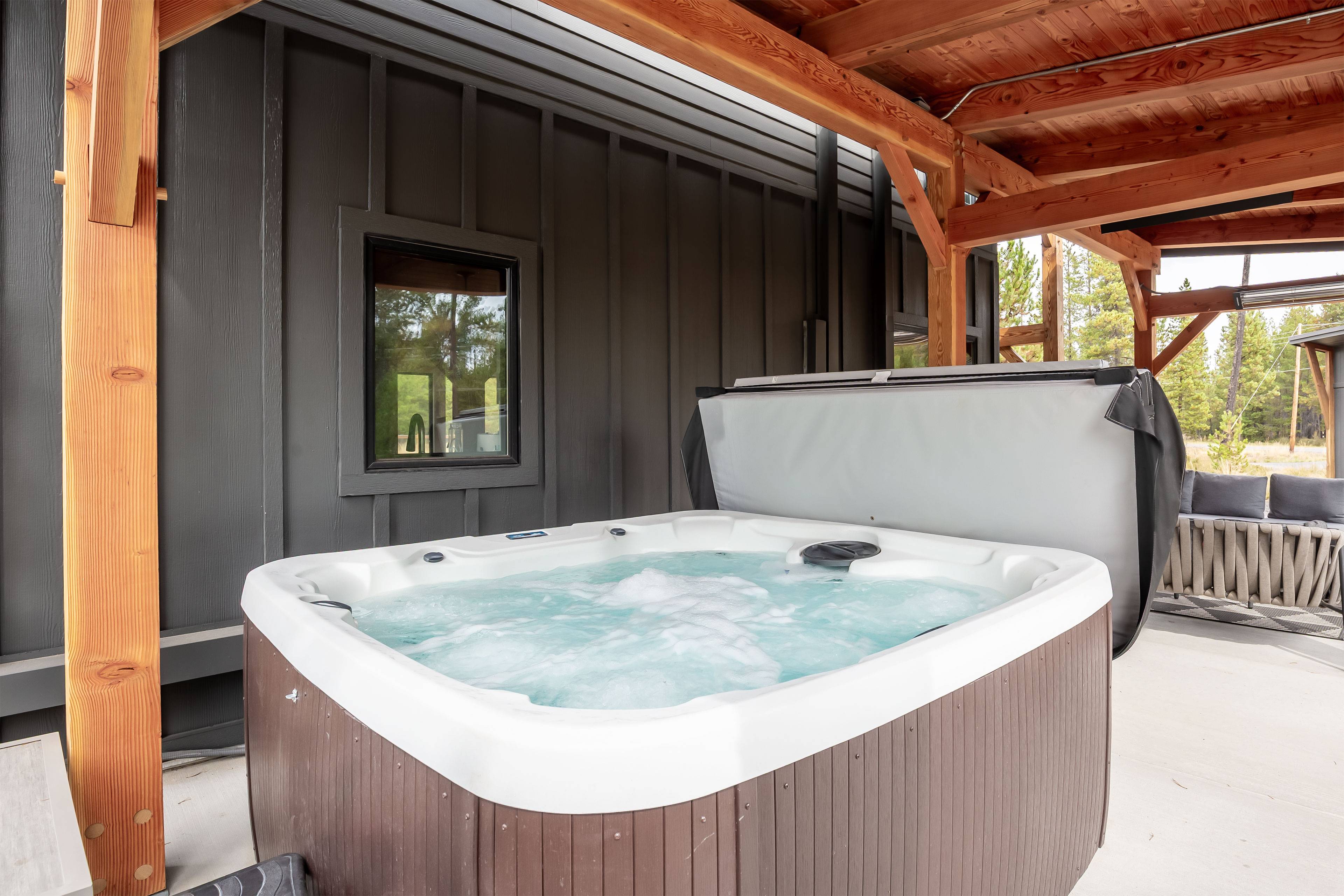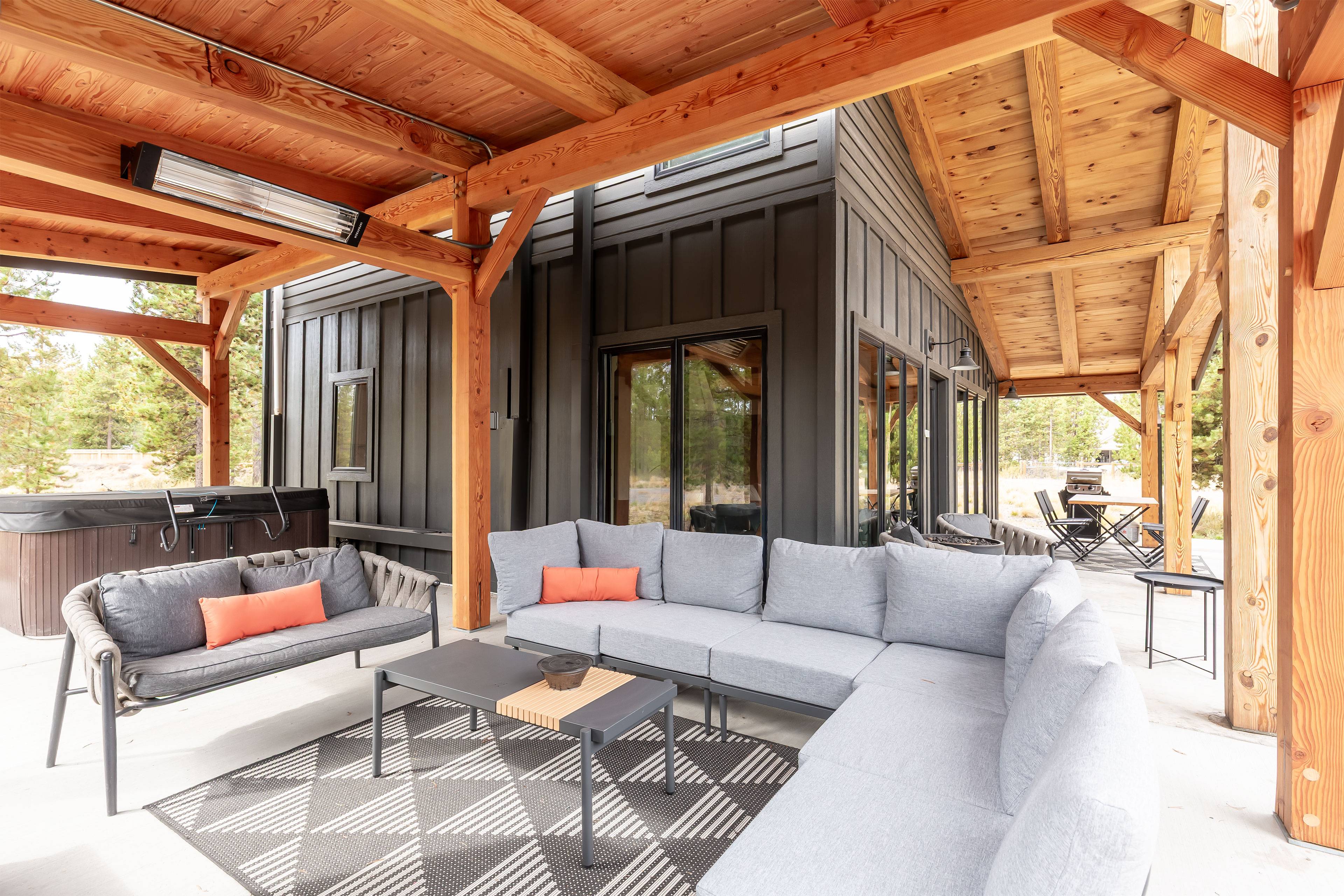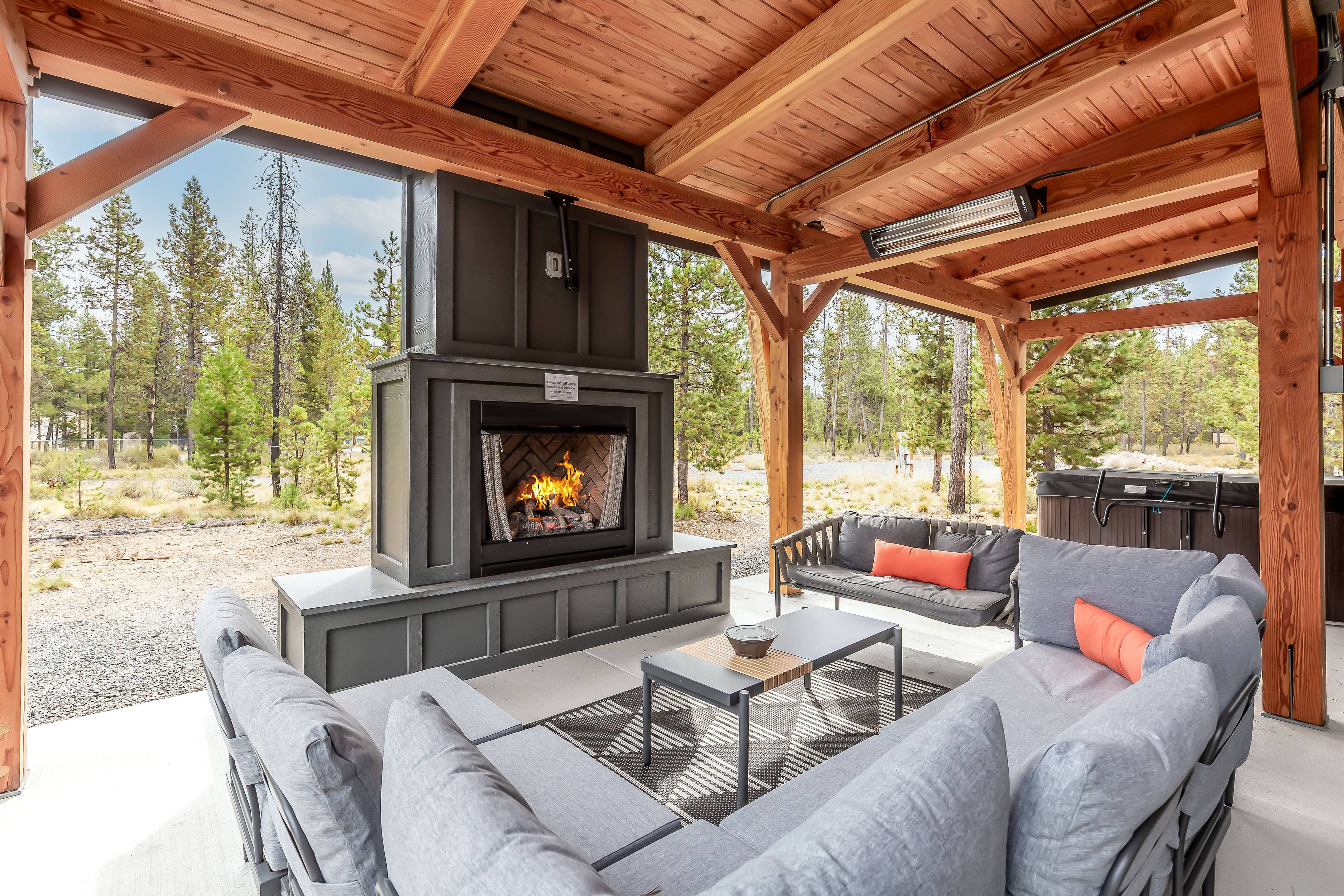 Relax in the brand new outdoor space with an outdoor TV, hot tub, and gas fireplace-your perfect outdoor retreat.