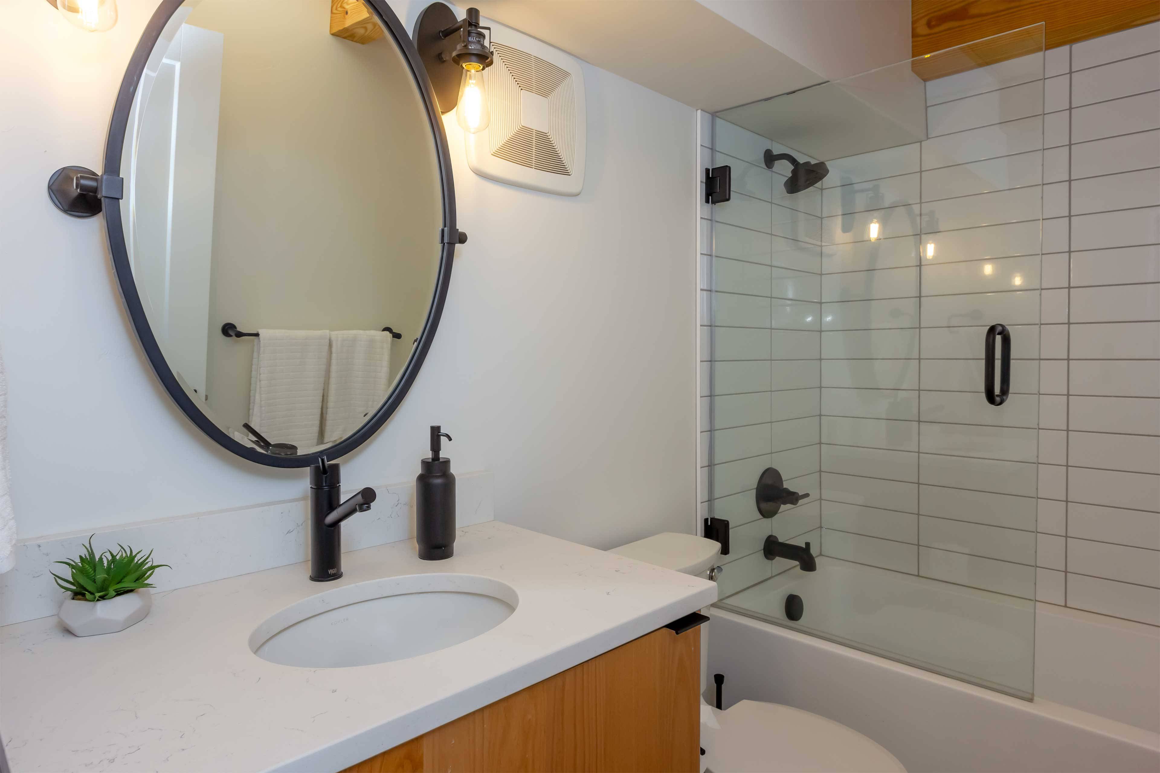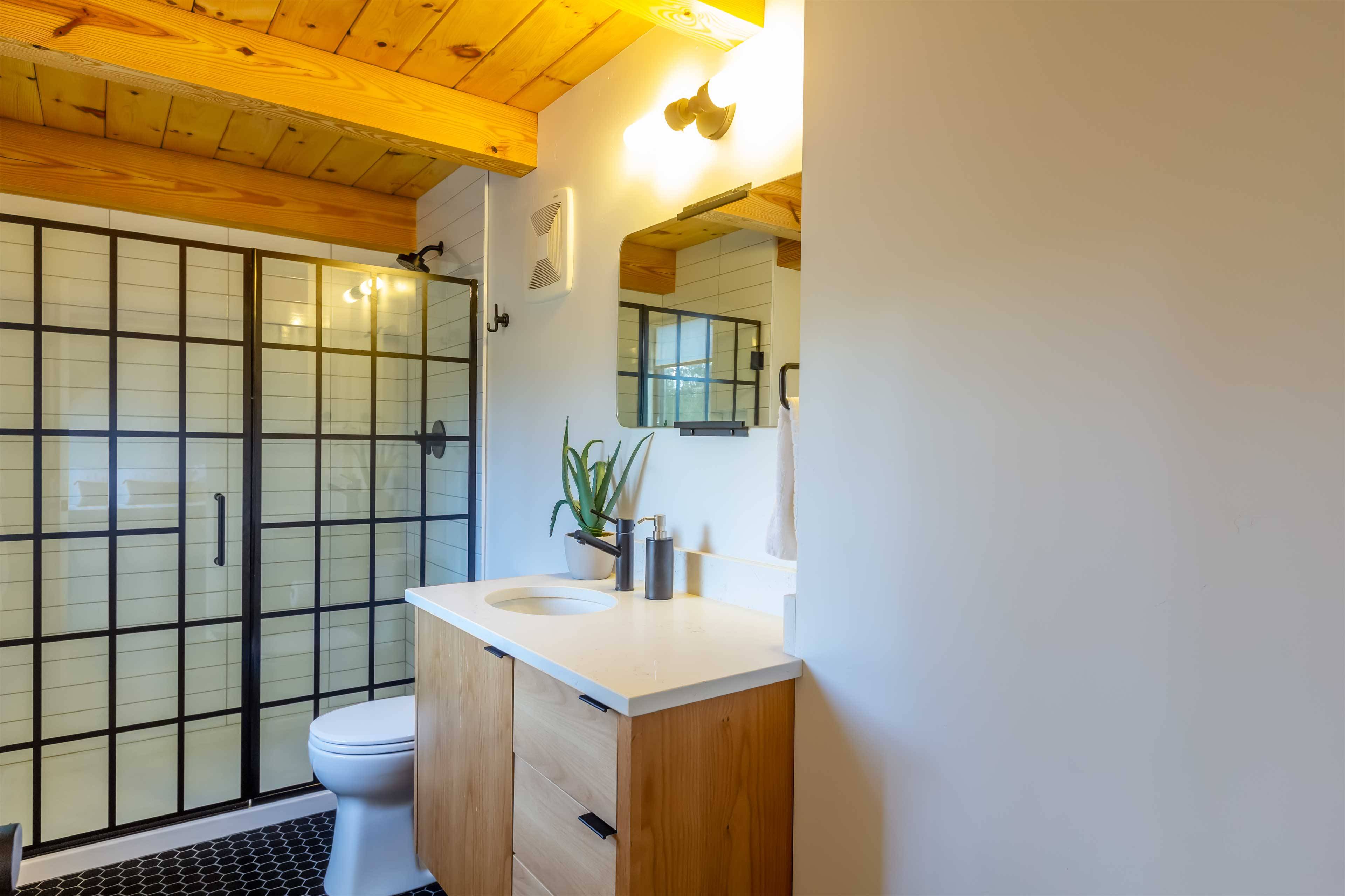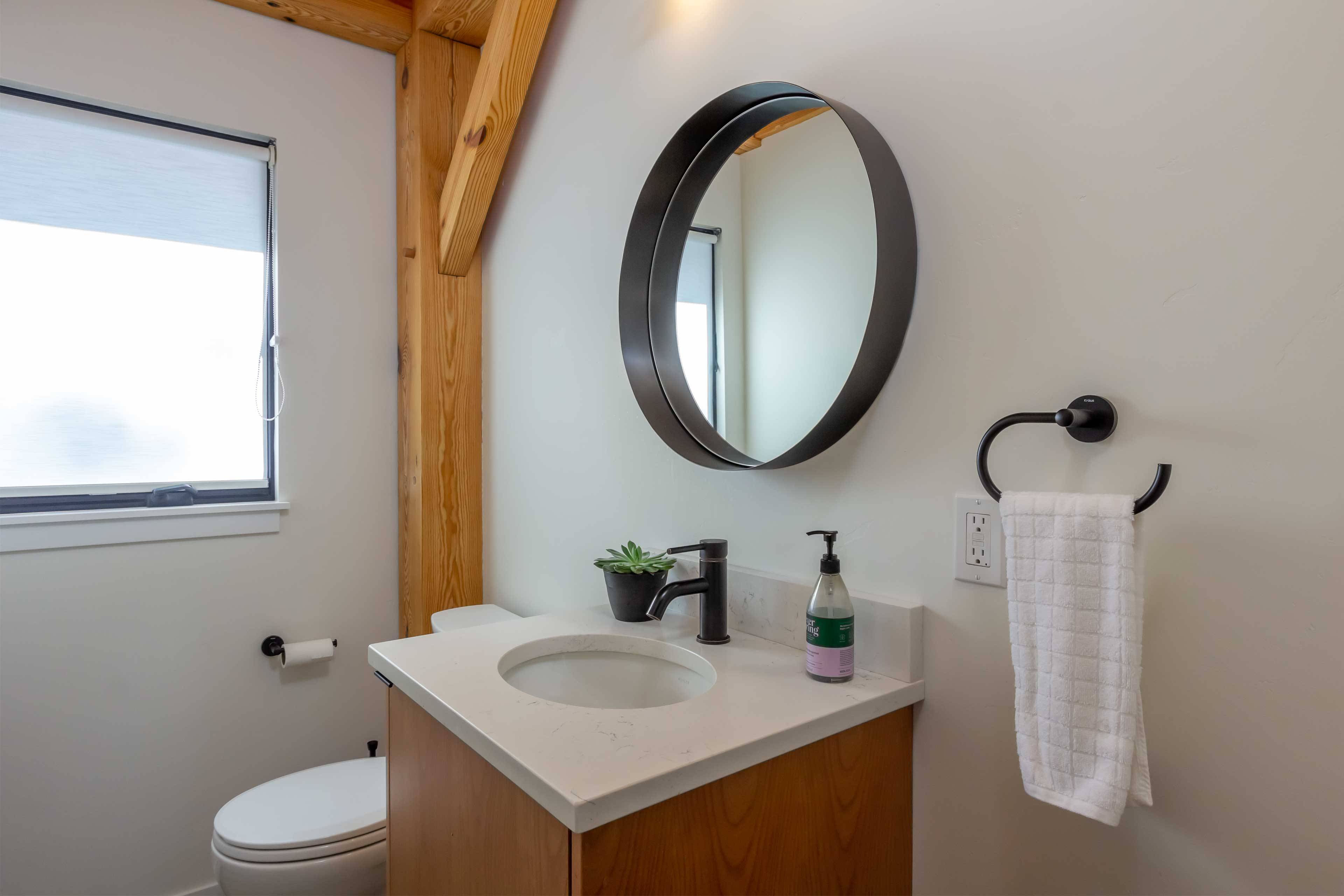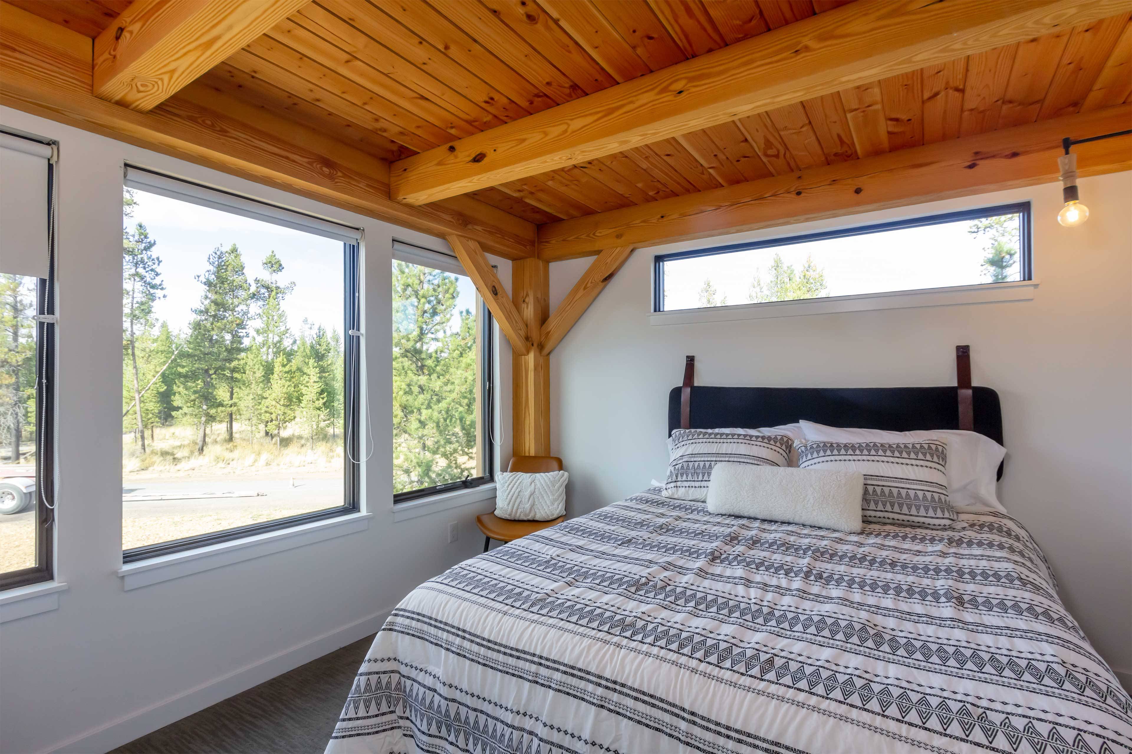 The spacious primary suite offers a serene retreat with a private attached bathroom. The second bedroom offers lots of natural light with ample windows, sharing the amazing view that is the beauty of Sunriver. The guest bathroom features a shower/tub combo and a custom vanity. Every detail has been meticulously curated, from the high-end finishes to the sustainable materials that enhance both style and efficiency.