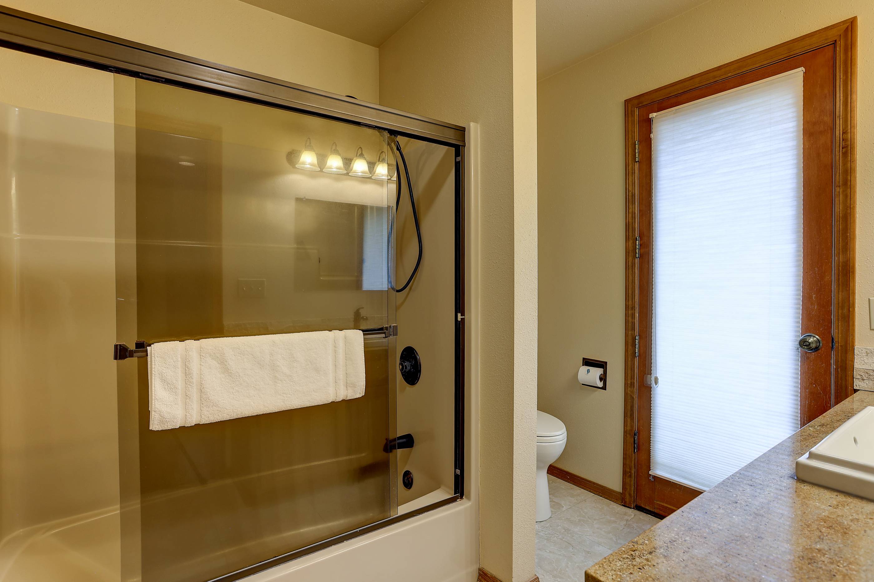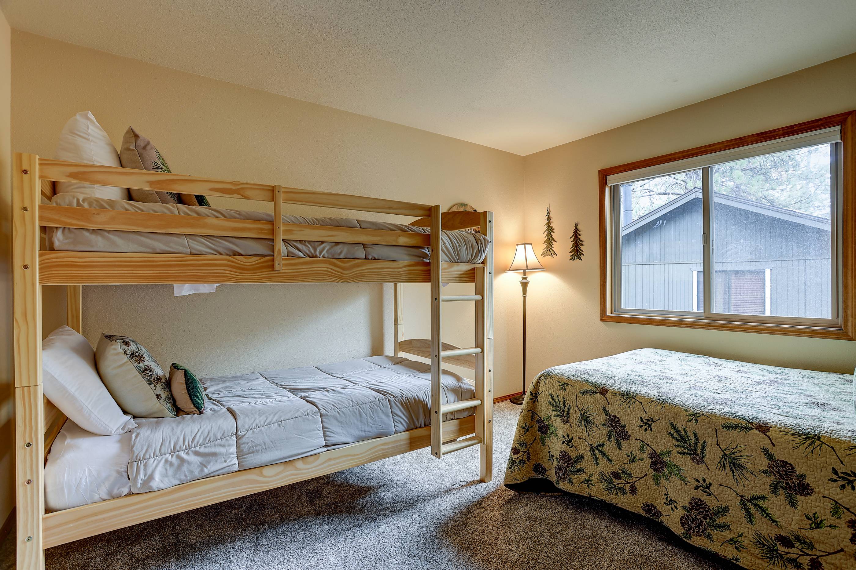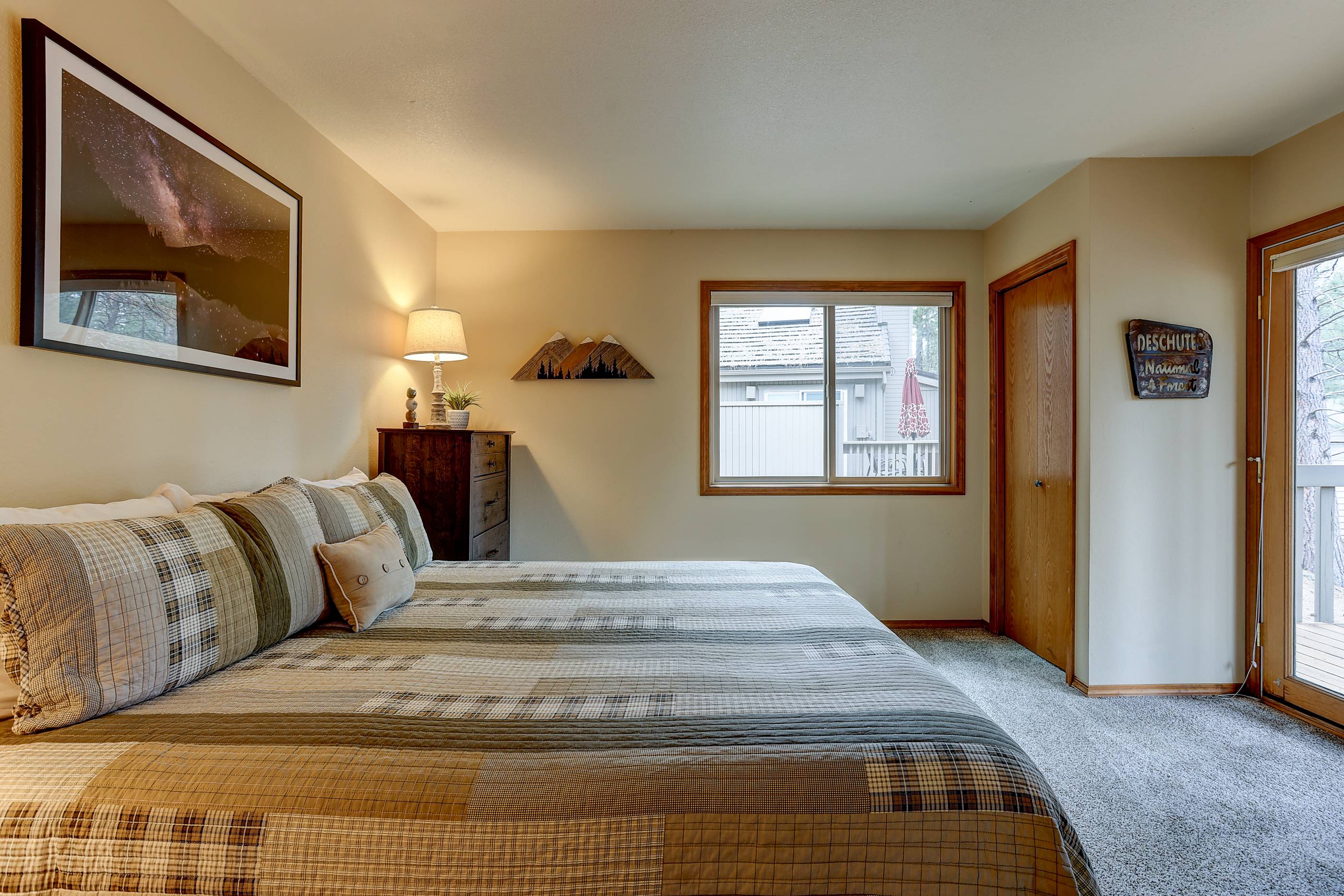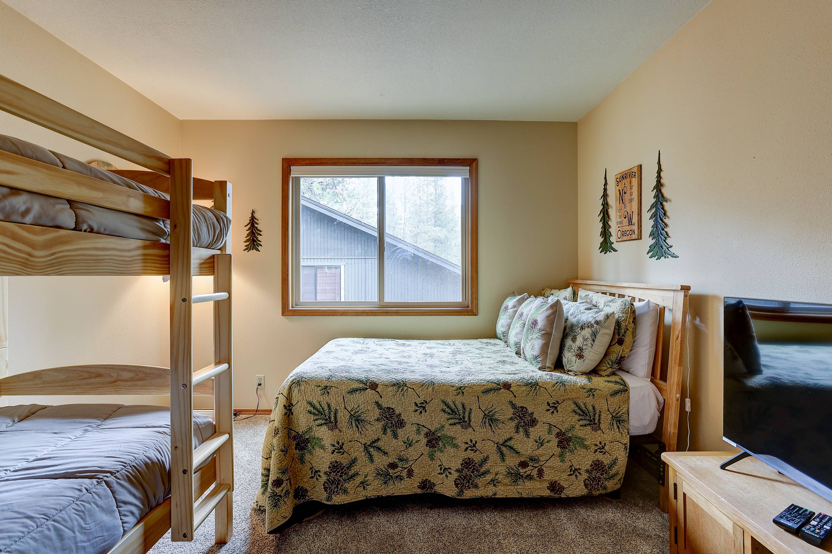 This home was perfect for our family of 5. Close to the village, sparkling clean, comfortable beds and sheets, plenty of towels, fully equipped kitchen. Master BR has a king bed, 2nd BR has a twin bunk and a full bed. 3 flat screen TVs, one in the living room and one in each bedroom. 4 adult bikes included. We ended up renting 2 kids bikes for our 9 year old and 6 year old at the Sunriver Bike Barn. Great layout with the 2 bedrooms and bathrooms downstairs and the open living, dining, and kitchen space upstairs. SHARC passes not included, but it ended up closing for the season anyway while we were there due to COVID. 3 separate outdoor decks/patios. The second bathroom had a door that opened out to the hot tub which made it easy to jump in the shower before or after a warm soak. Very comfortable and would totally stay here again.