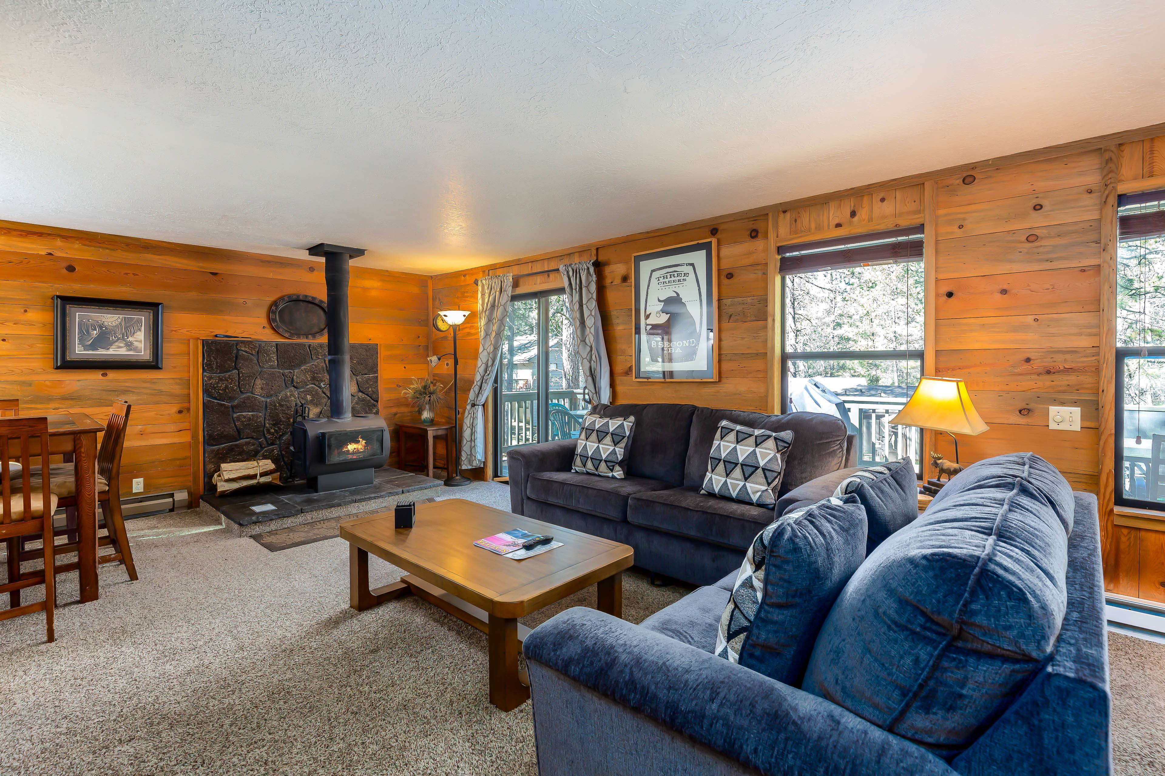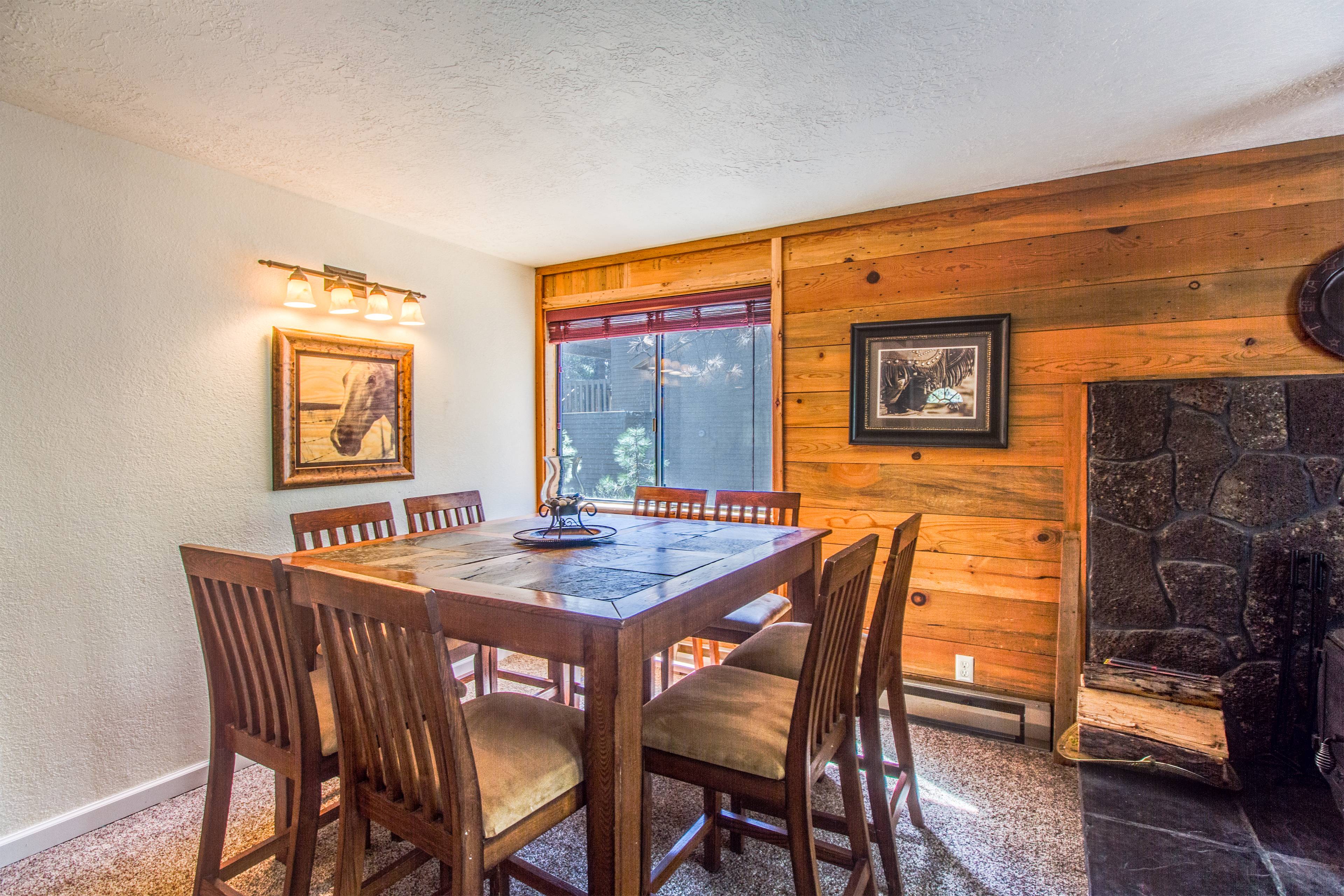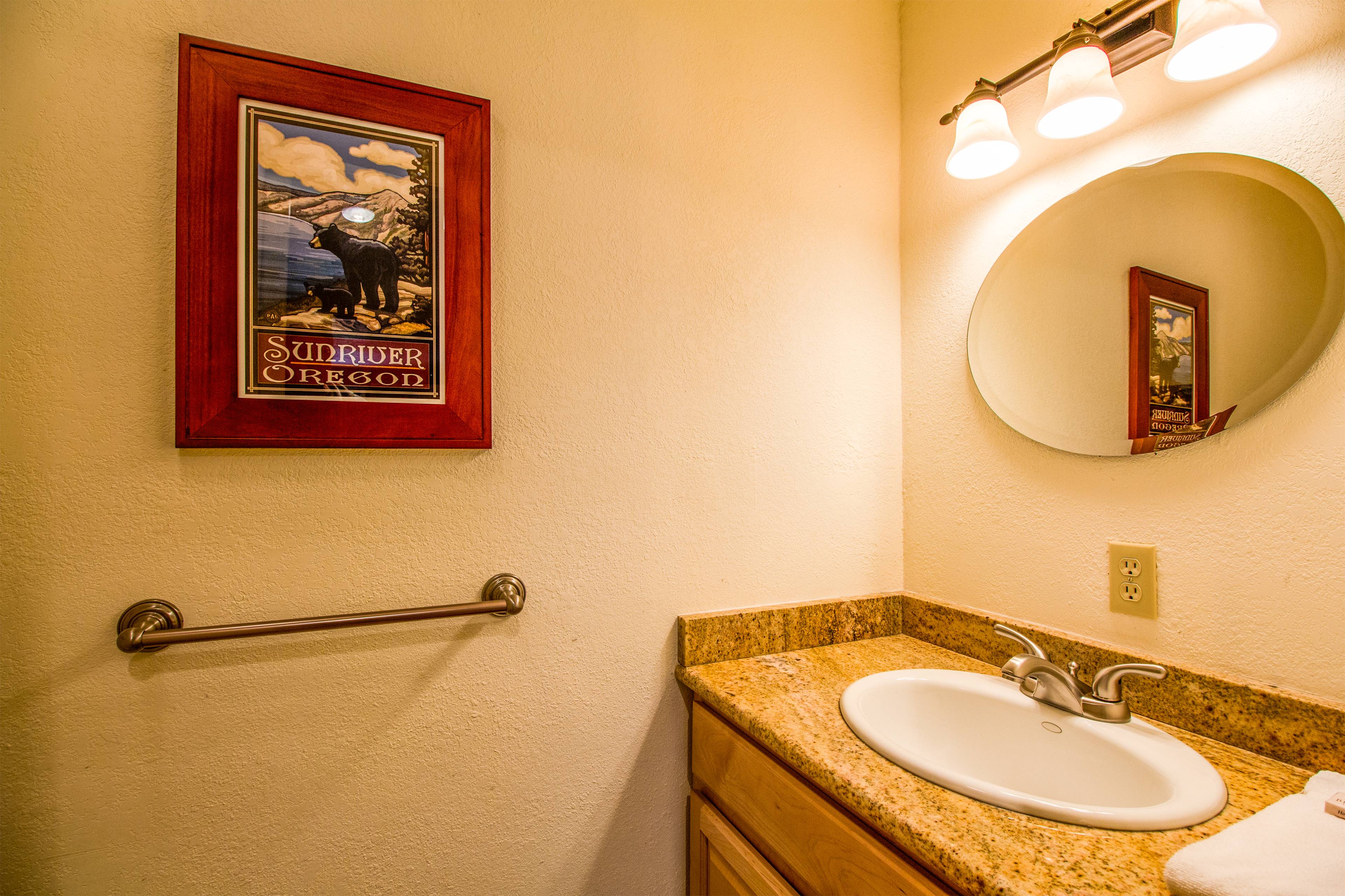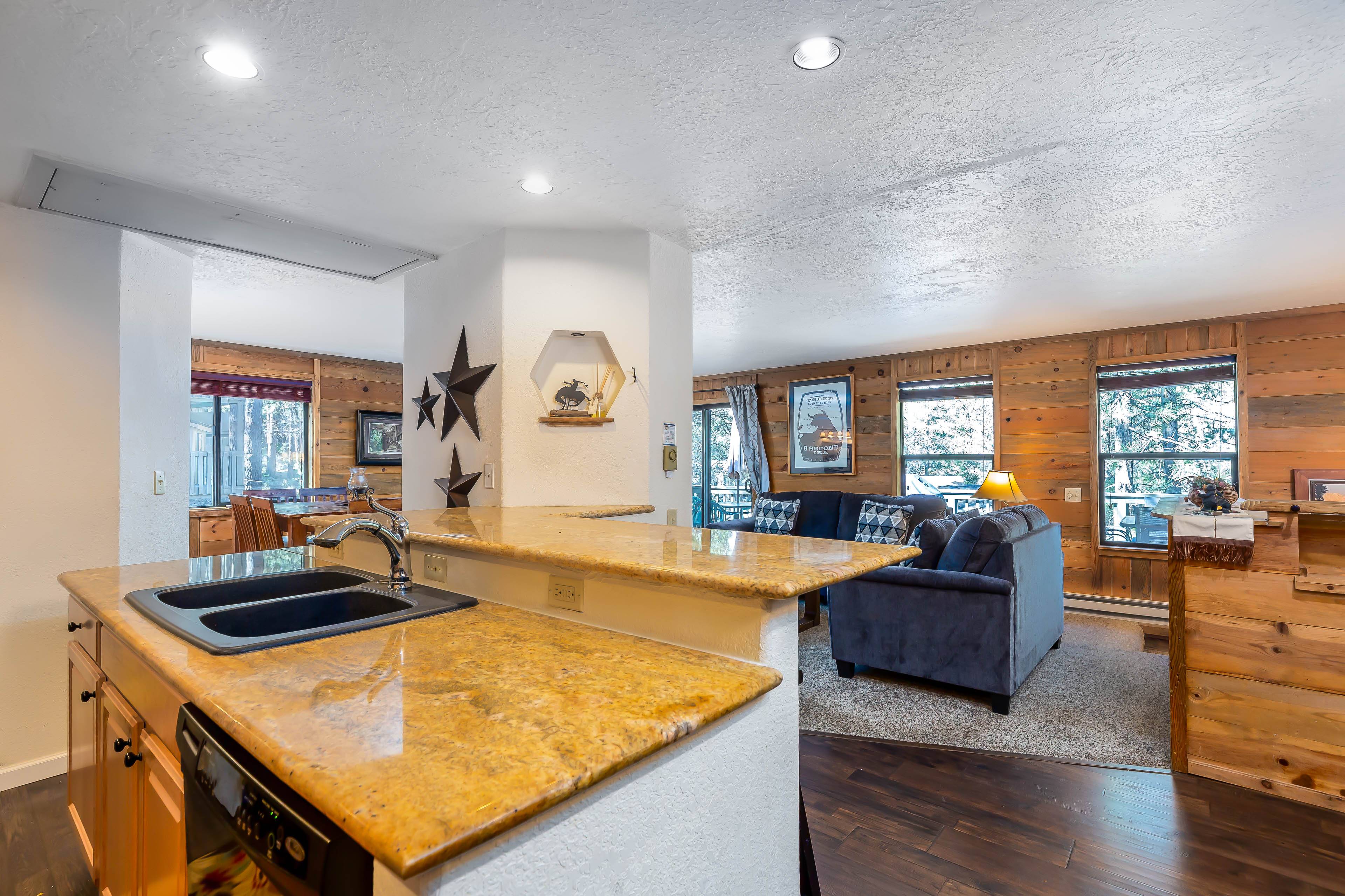 Relax and unwind among the trees in this warm and inviting house in Sunriver. This reverse-living home features the Living Room, Kitchen, and Dining Room on the upper level where you can snuggle up with a book next to the wood stove, or spend some time in the newly remodeled kitchen taking advantage of the new appliances and granite countertops. When it's time to sit down to eat you'll find seating for 8 at the dining room table plus 2 more at the breakfast bar. There is a half-guest bathroom on this level.