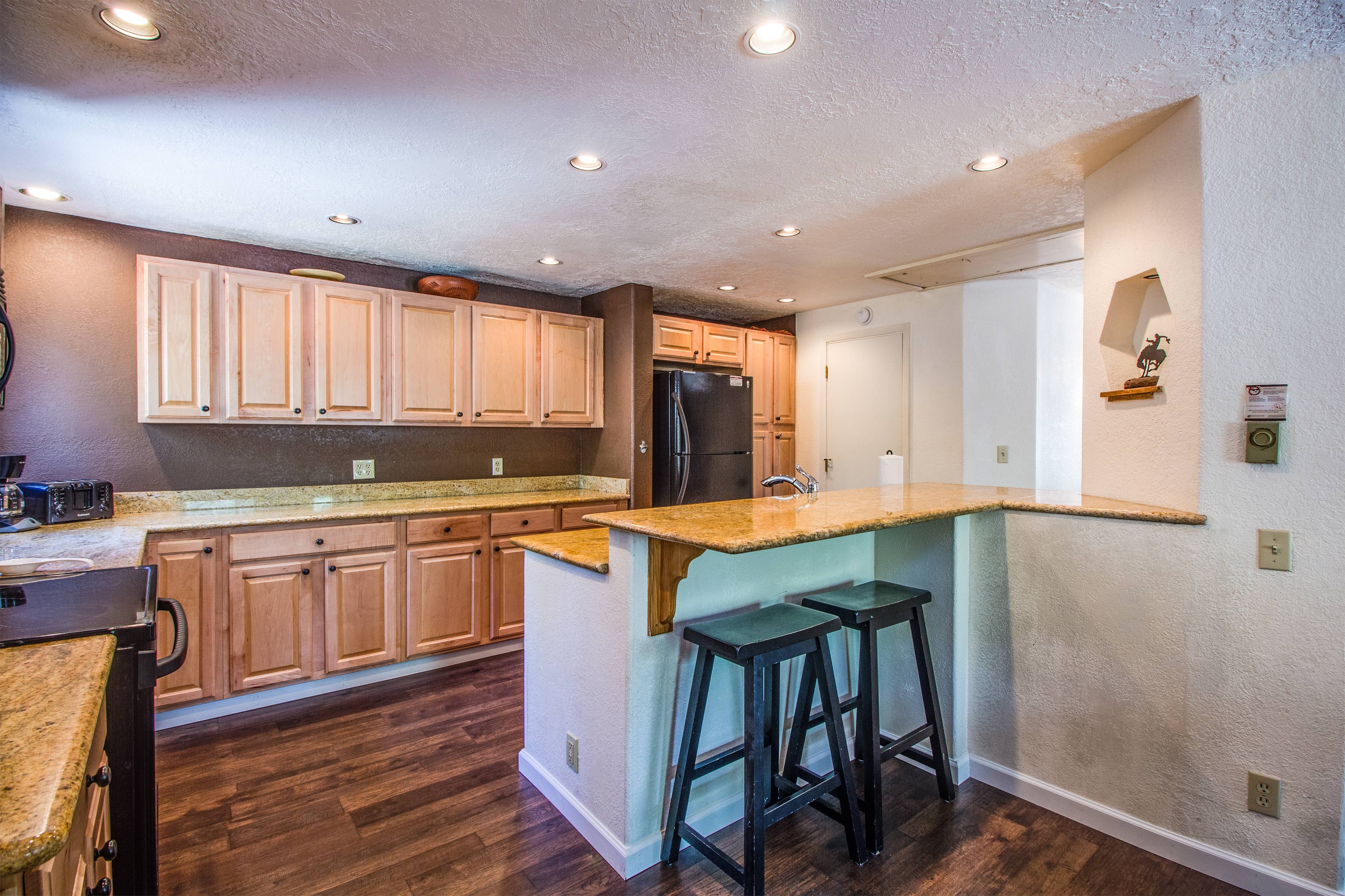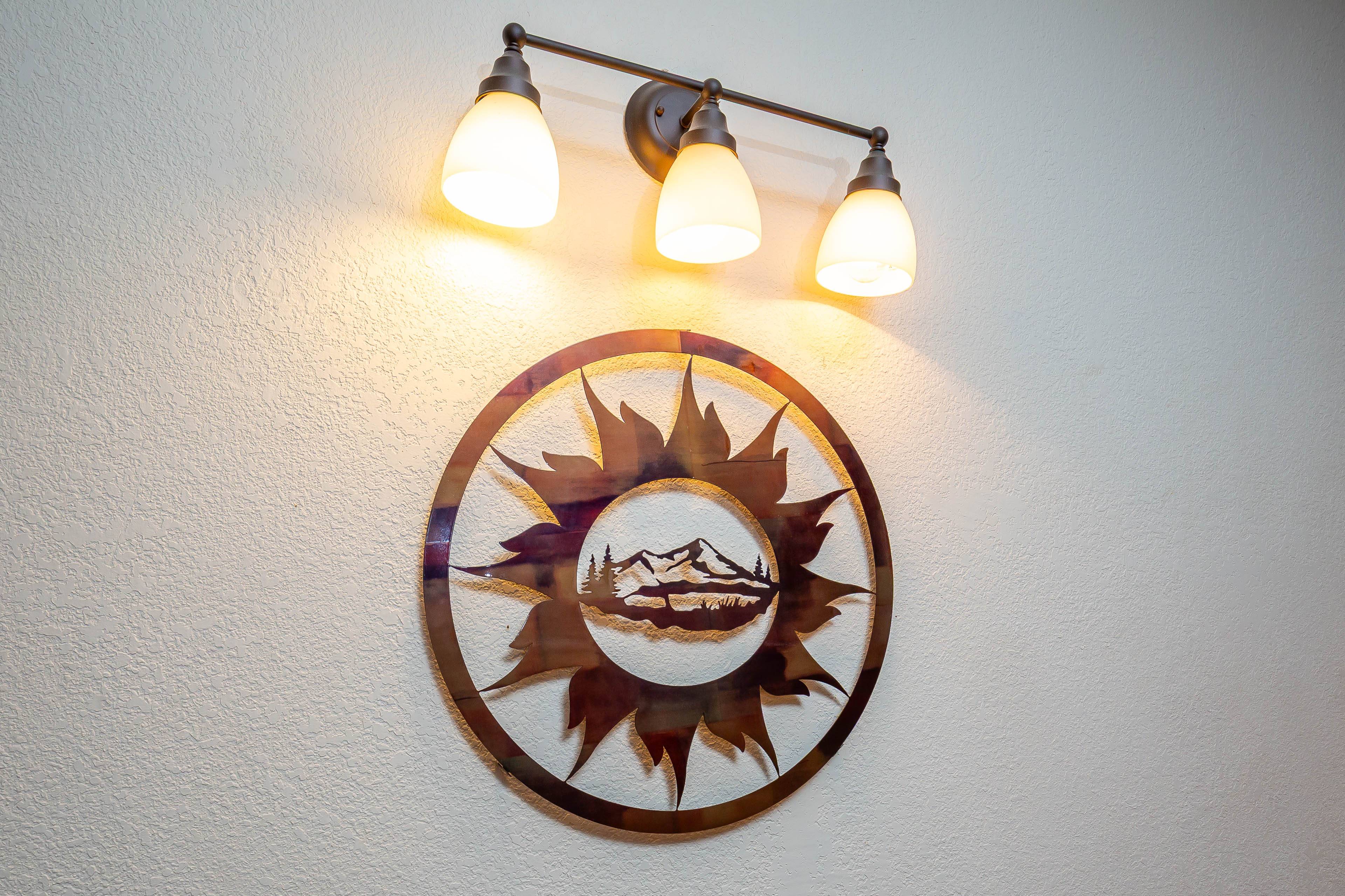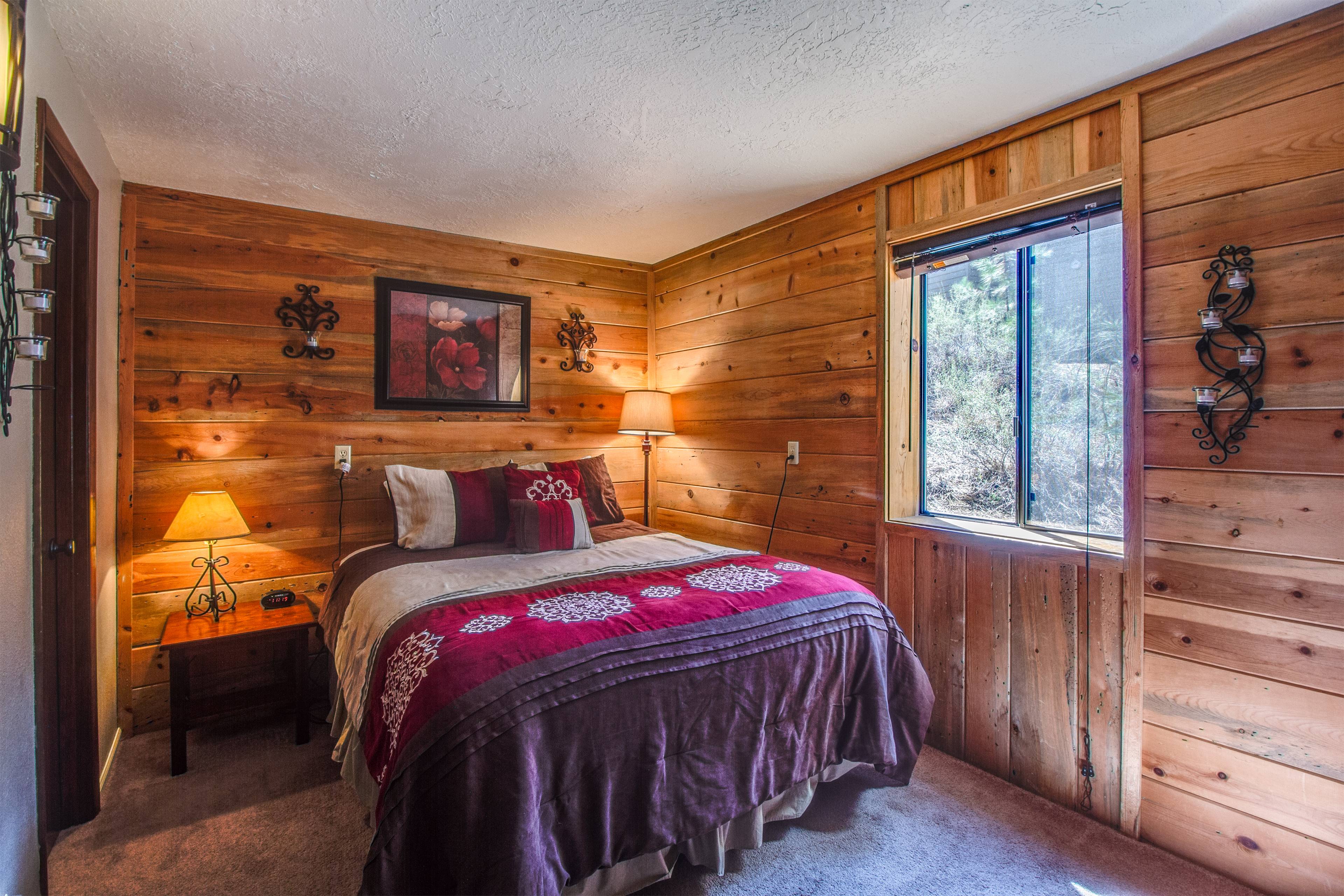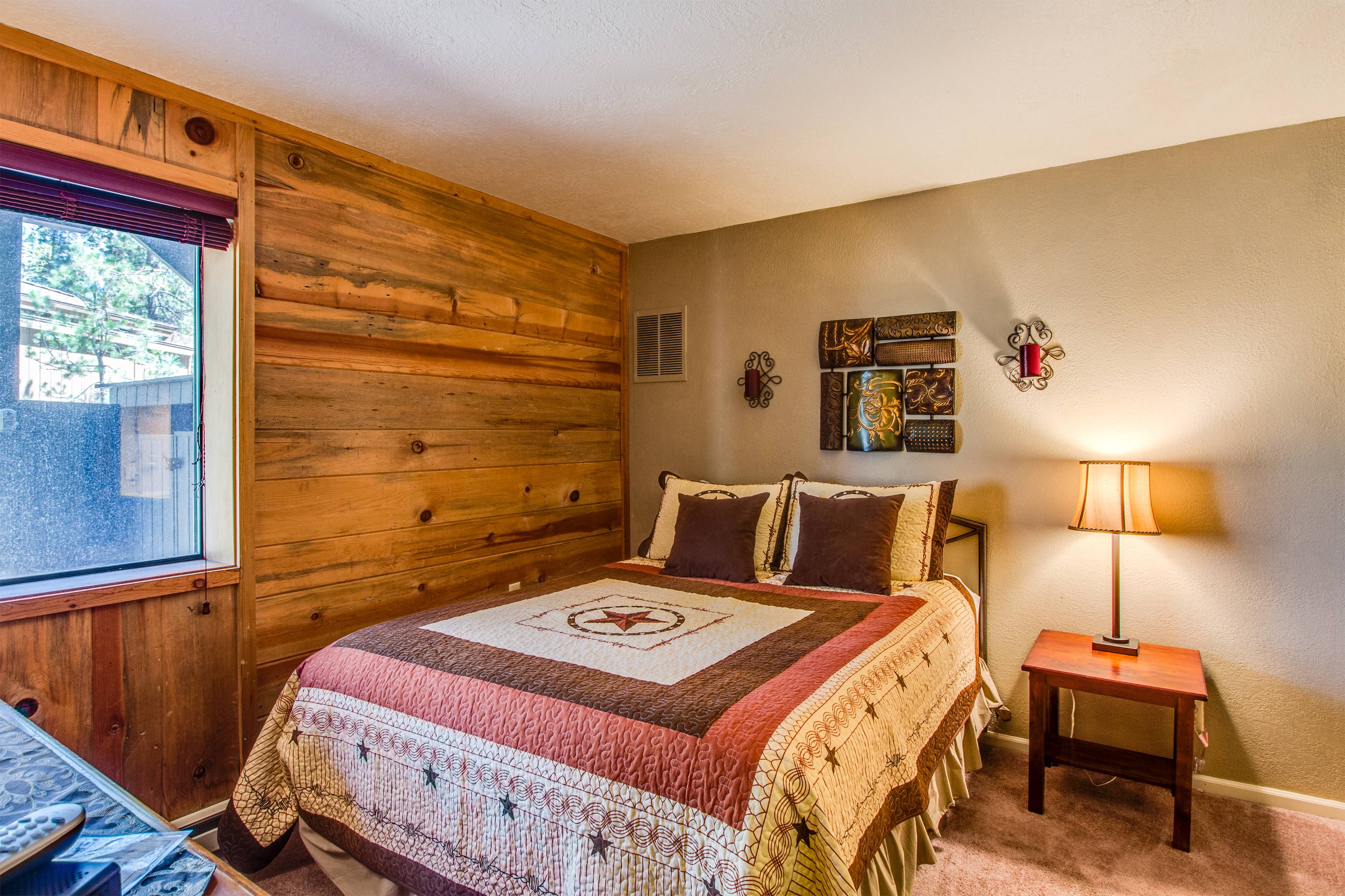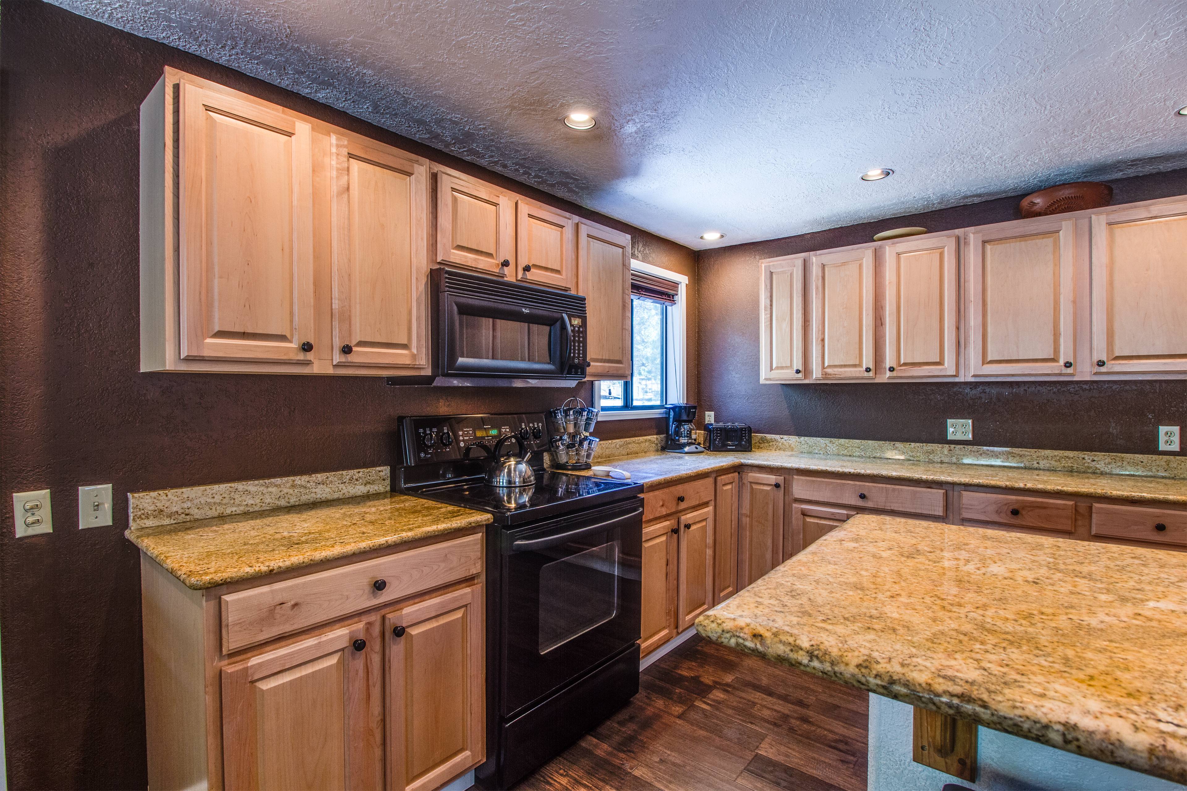 Relax and unwind among the trees in this warm and inviting house in Sunriver. This reverse-living home features the Living Room, Kitchen, and Dining Room on the upper level where you can snuggle up with a book next to the wood stove, or spend some time in the newly remodeled kitchen taking advantage of the new appliances and granite countertops. When it's time to sit down to eat you'll find seating for 8 at the dining room table plus 2 more at the breakfast bar. There is a half-guest bathroom on this level.
