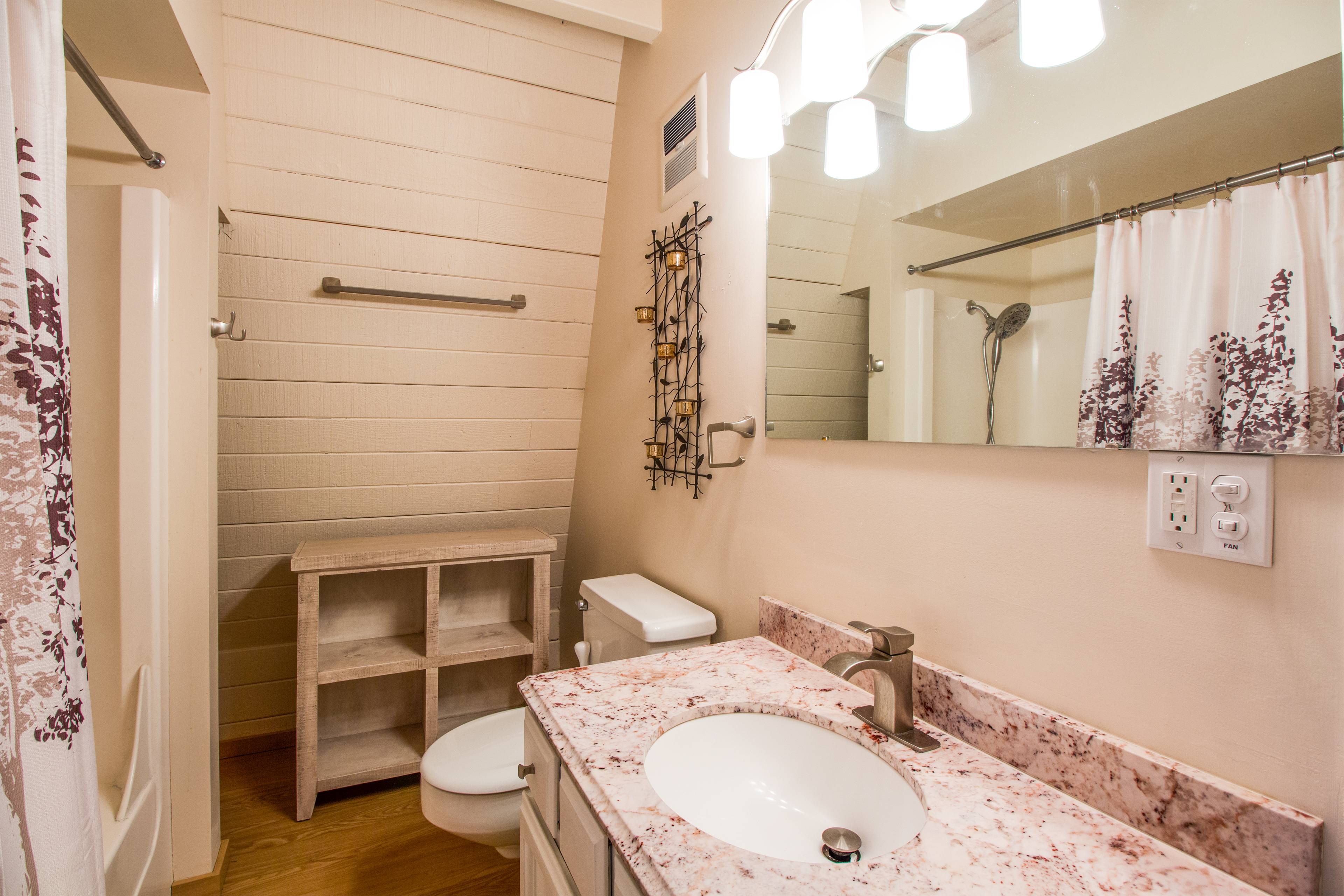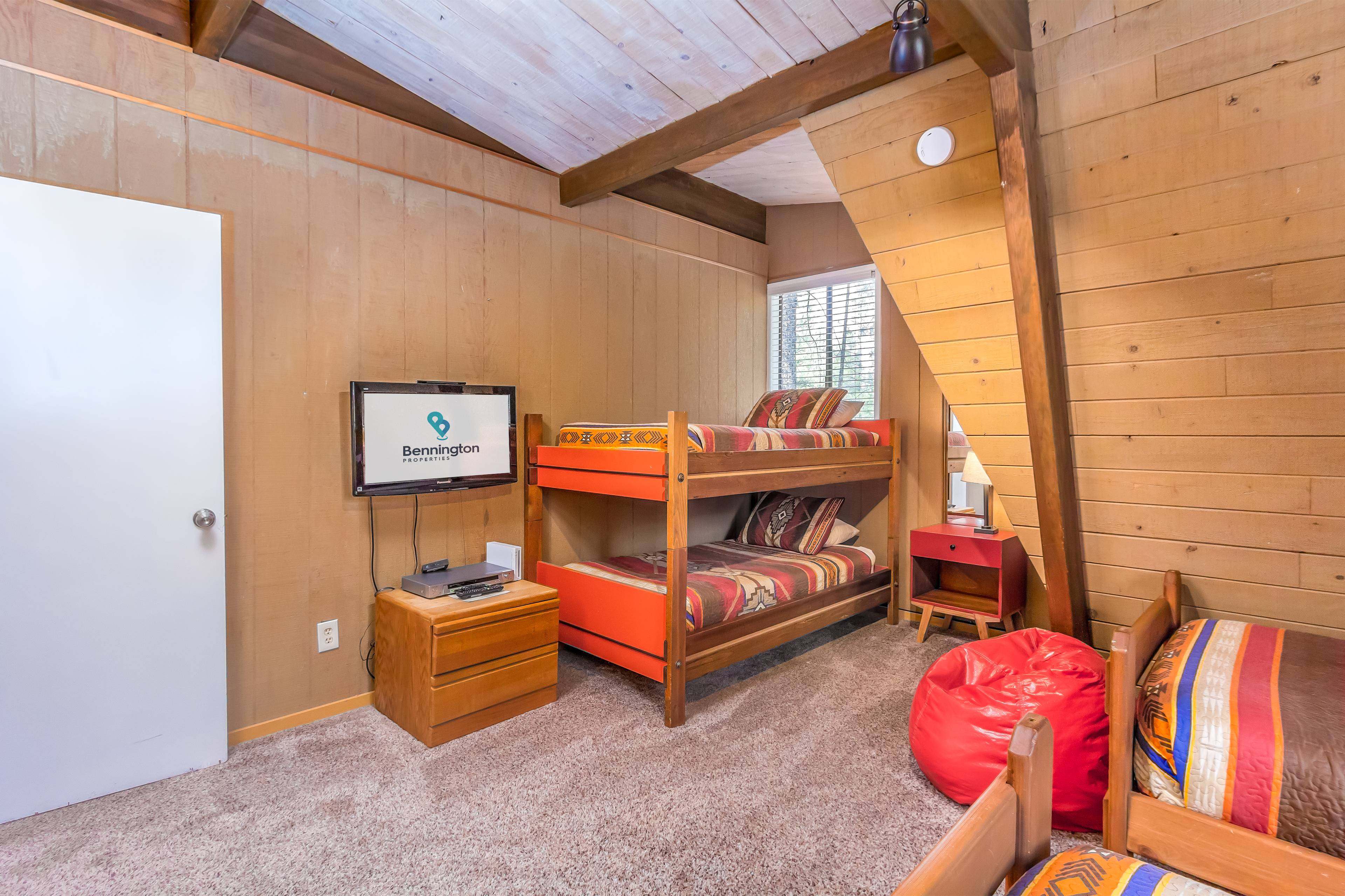 A queen bedroom and guest bathroom with a tub/shower combination, as well as the laundry room, are located on the main level. Head upstairs to find the other two bedrooms and second bathroom with a walk in shower. The one-bedroom suite features a comfortable king bed, a TV, a DVD player, a sitting area, and a private balcony with seating. The other bedroom has two twin beds, a bunk bed and bean-bag seating! This room also has a TV, DVD player and Wii game console.