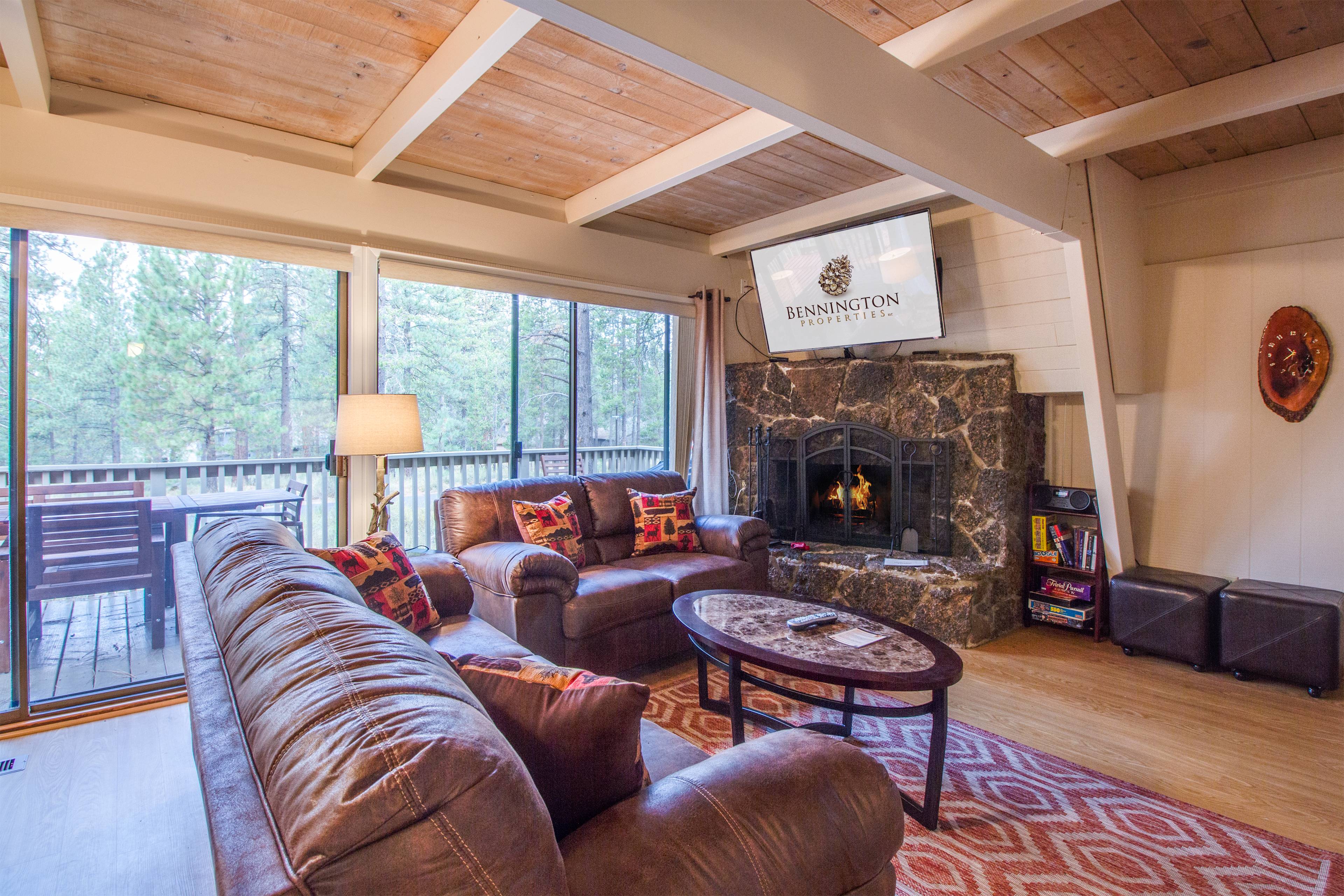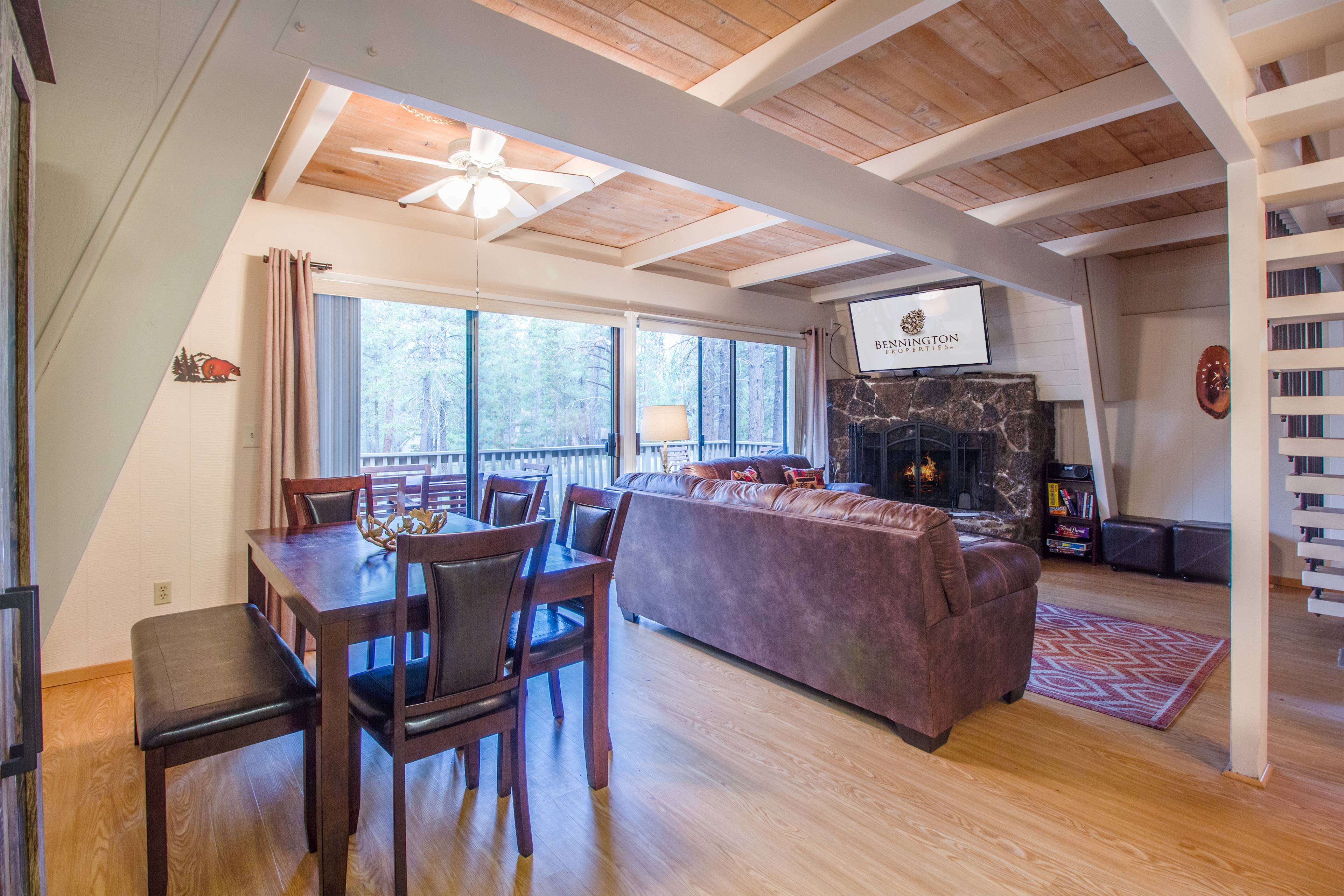 The main level features hard surface flooring throughout the renovated kitchen with stainless appliances, including an oven with Sabbath mode feature, a programmable crock pot, dining and living areas. Cozy up next to the wood-burning fireplace to watch a movie or the big game on the large TV or grab a glass of wine and head out onto the deck to dine under the stars.