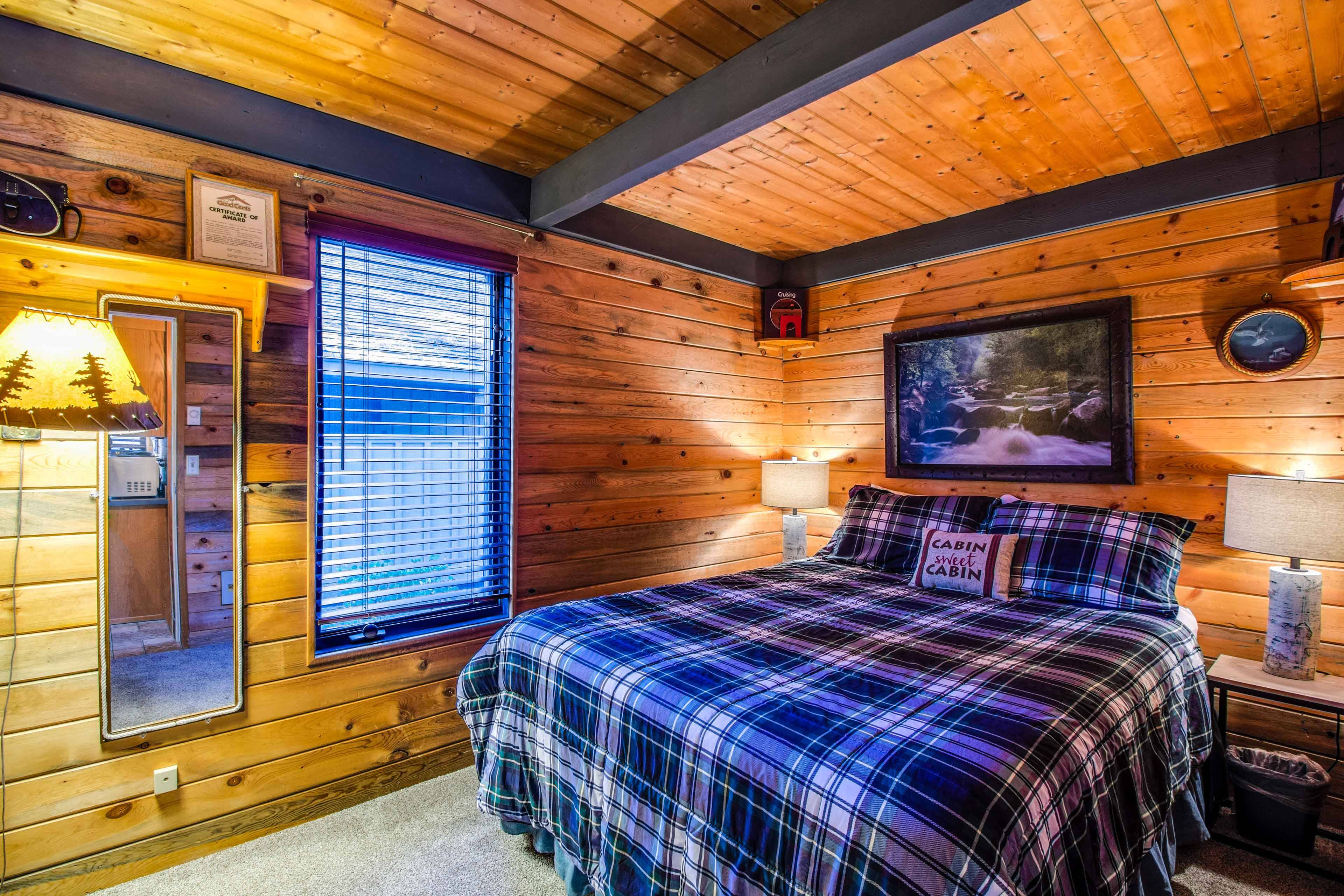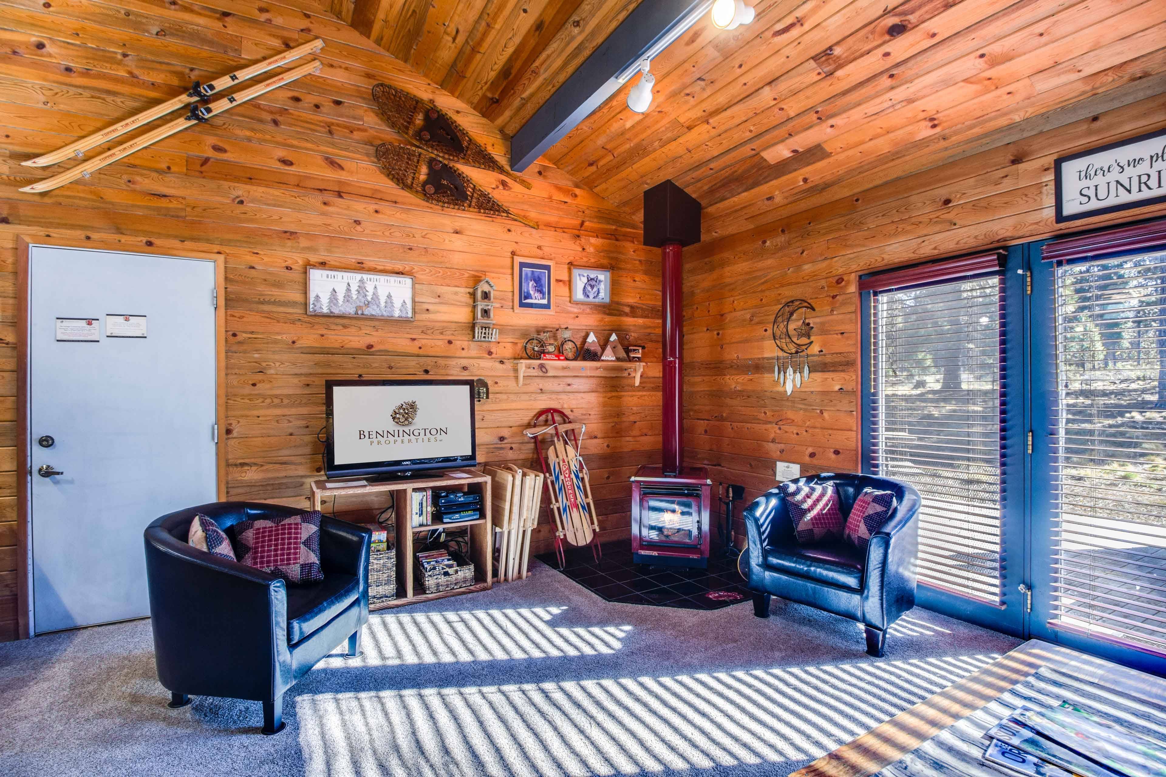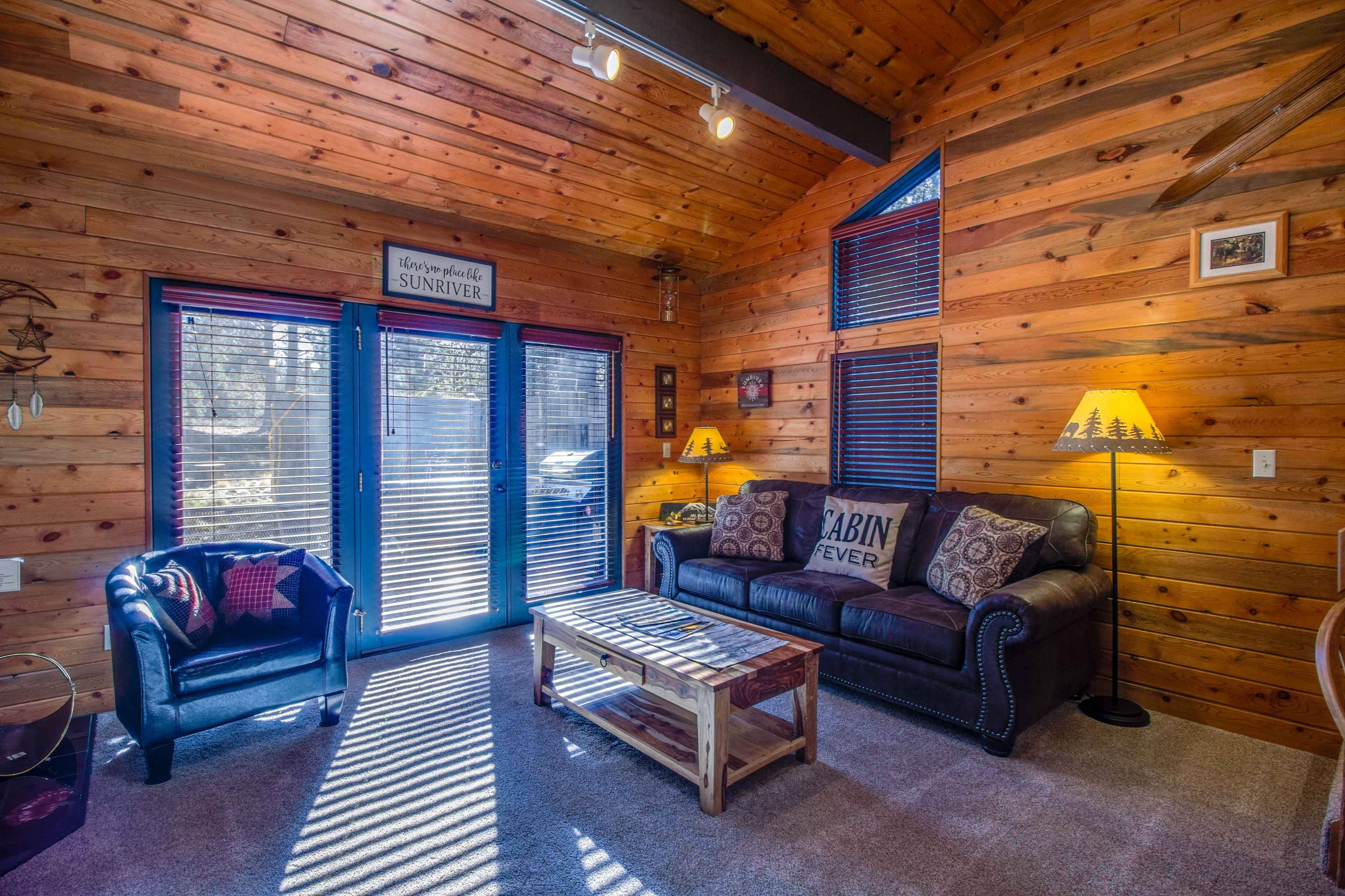 Darling mountain cabin located within walking distance of the Sunriver Village. The open floor plan and wood details lend to this home’s mountain charm. The open floor plan on the main level includes the living room with wood fireplace, cable TV and DVD player, a queen-sized sleeper sofa, the dining room with seating for 4 and the fully-stocked kitchen with seating for 2 more at the counter. On this level is a bedroom with a queen bed and full bathroom. The living room only has air conditioning.