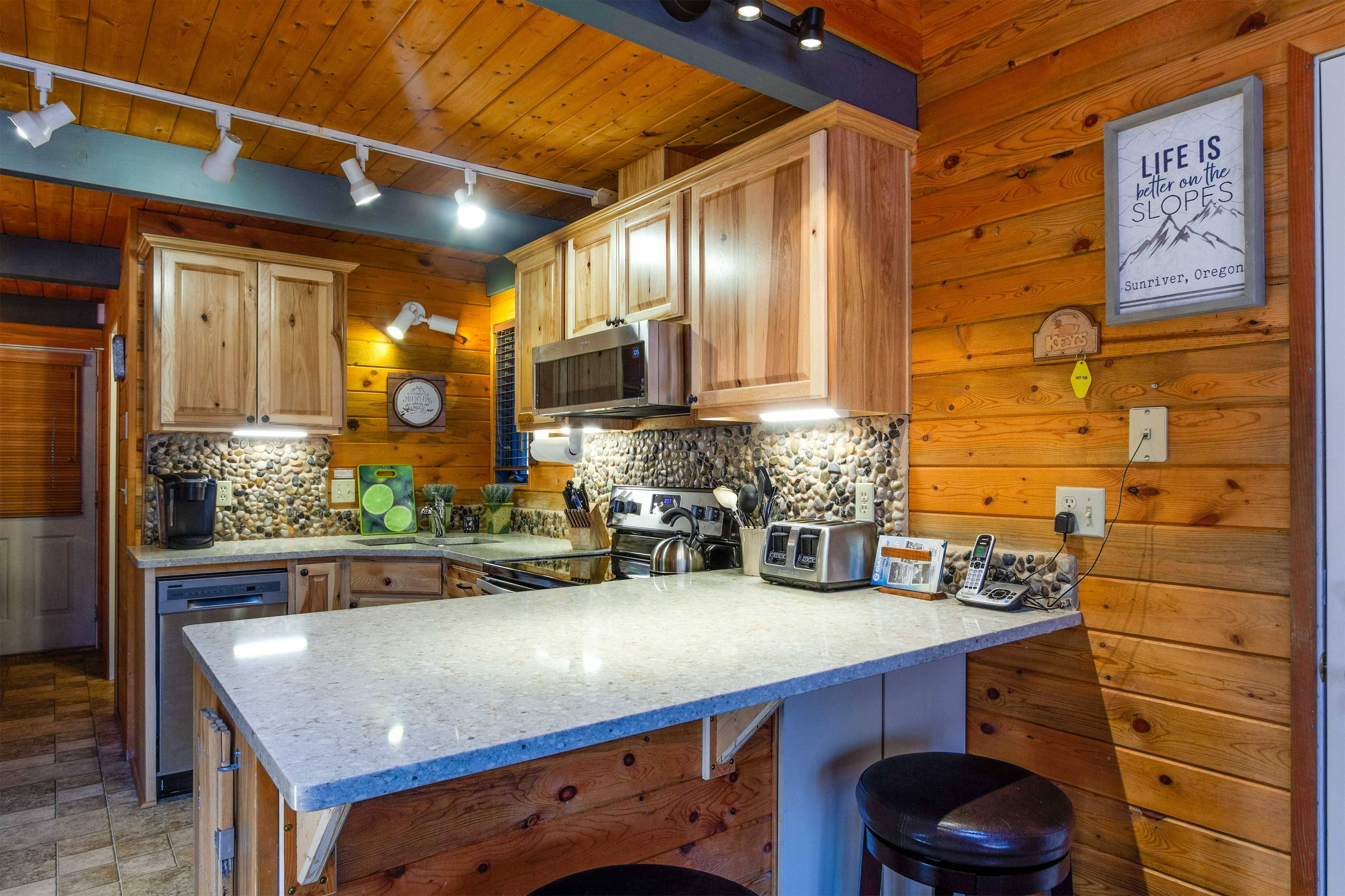 This is a darling cabin, walking distance from Sunriver Village. Decorated with comfortable furnishings and quaint cabin decor. The kitchen was fully stocked with bake ware and dishes for cooking and dining in. A brew coffee pot as well as a Keurig. The hot tub was an added bonus. Thank you for arranging SNOW for our stay! We will be back!
