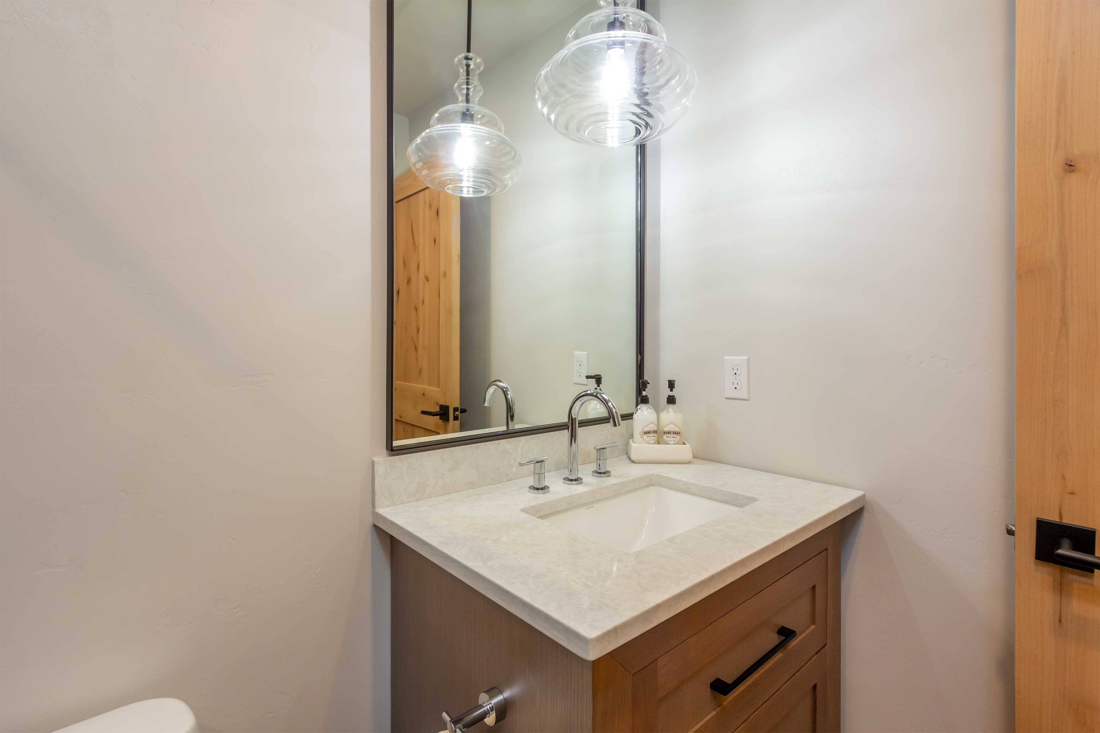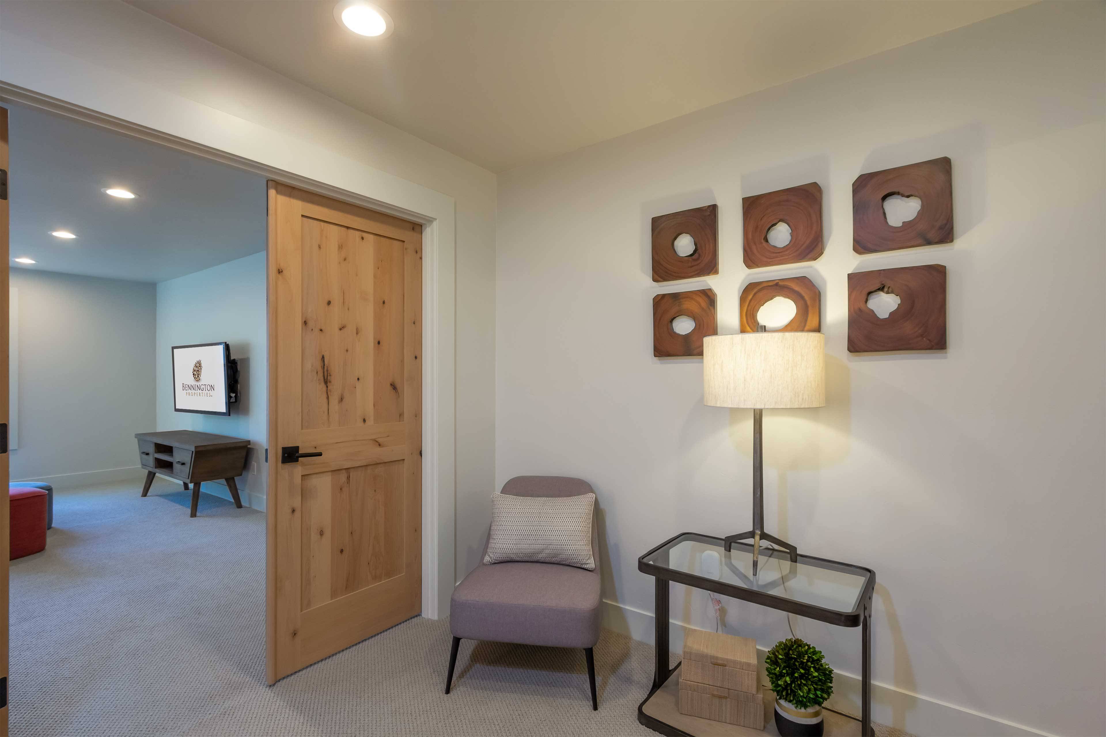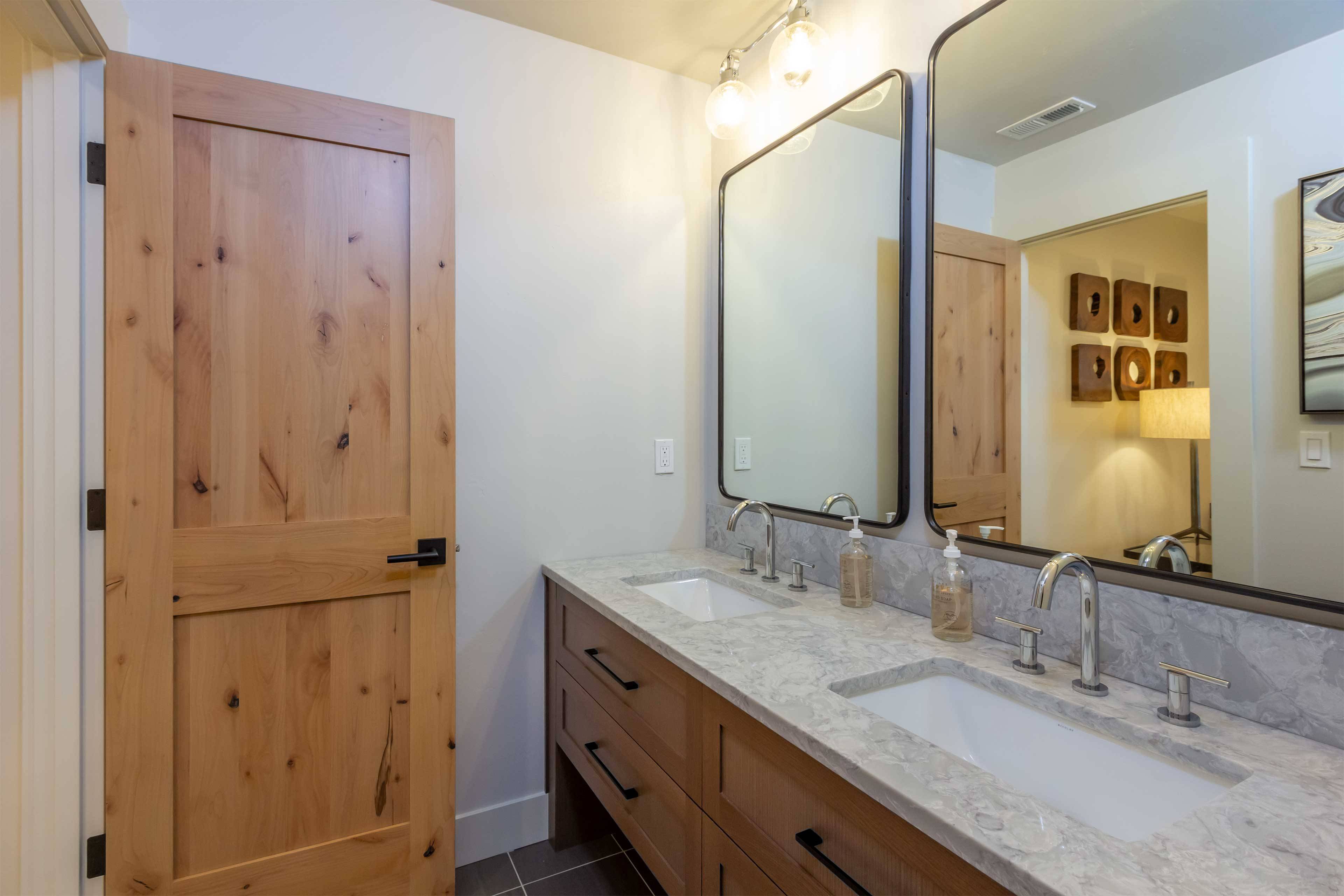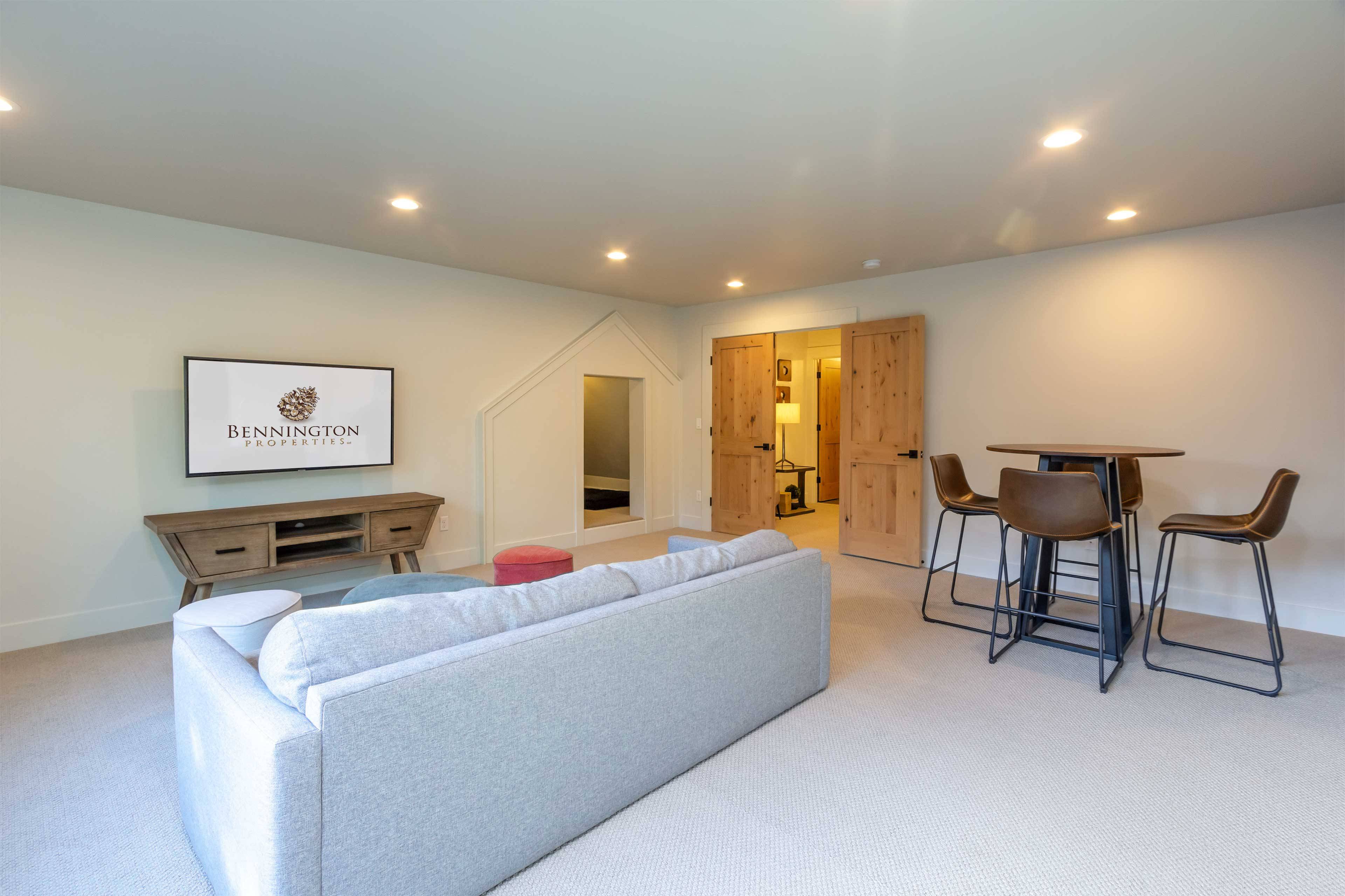 Six bedrooms are nicely separated for privacy. The King suite is on the main floor and includes a large flat screen TV, gas fireplace, soaking tub, and walk-in closet. Three additional King ensuite bedrooms are downstairs as well. The upstairs offers a TV room with attached bedroom with 2 Twin over Queen pyramid bunk beds, as well as an additional ensuite bedroom with Queen bed.
