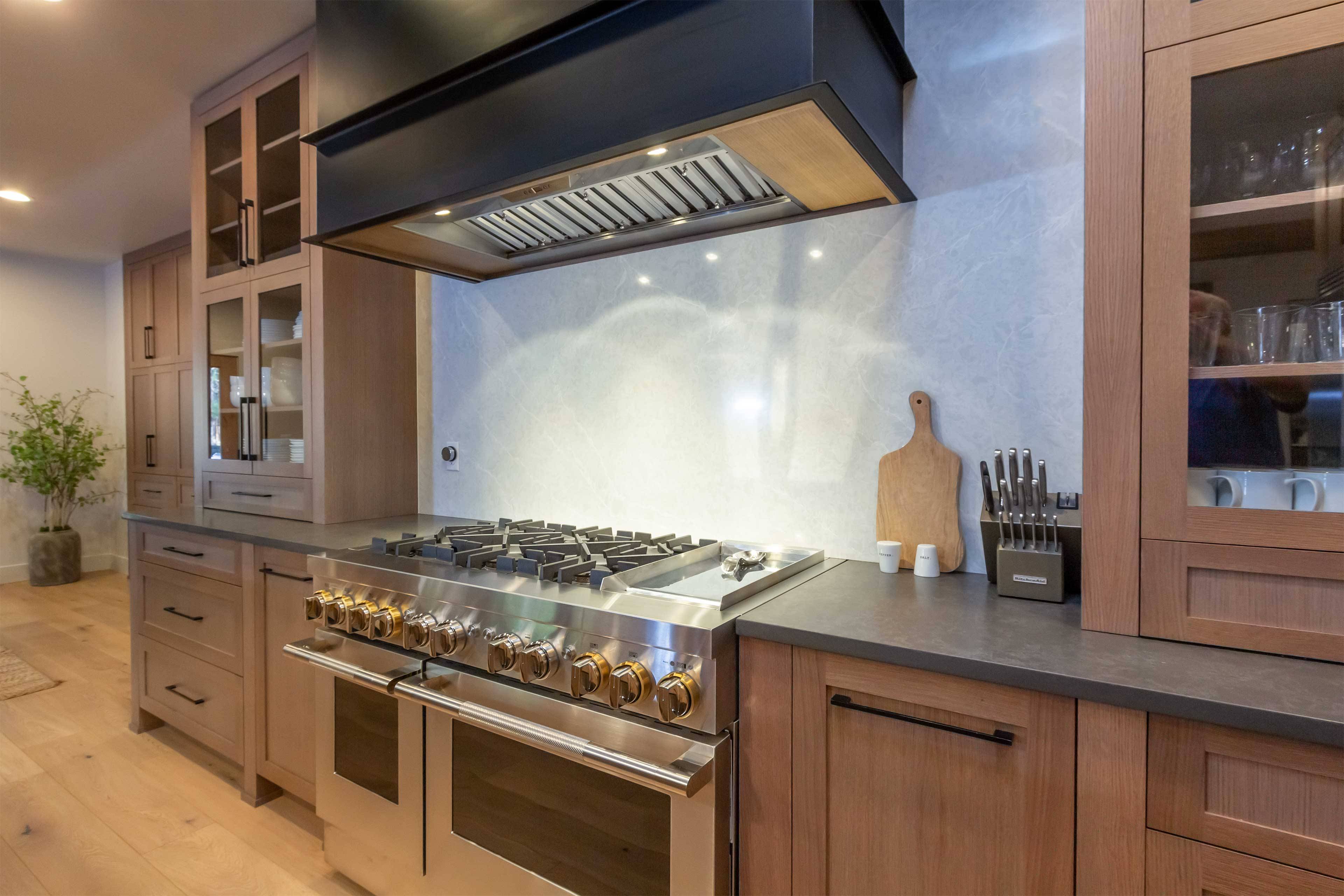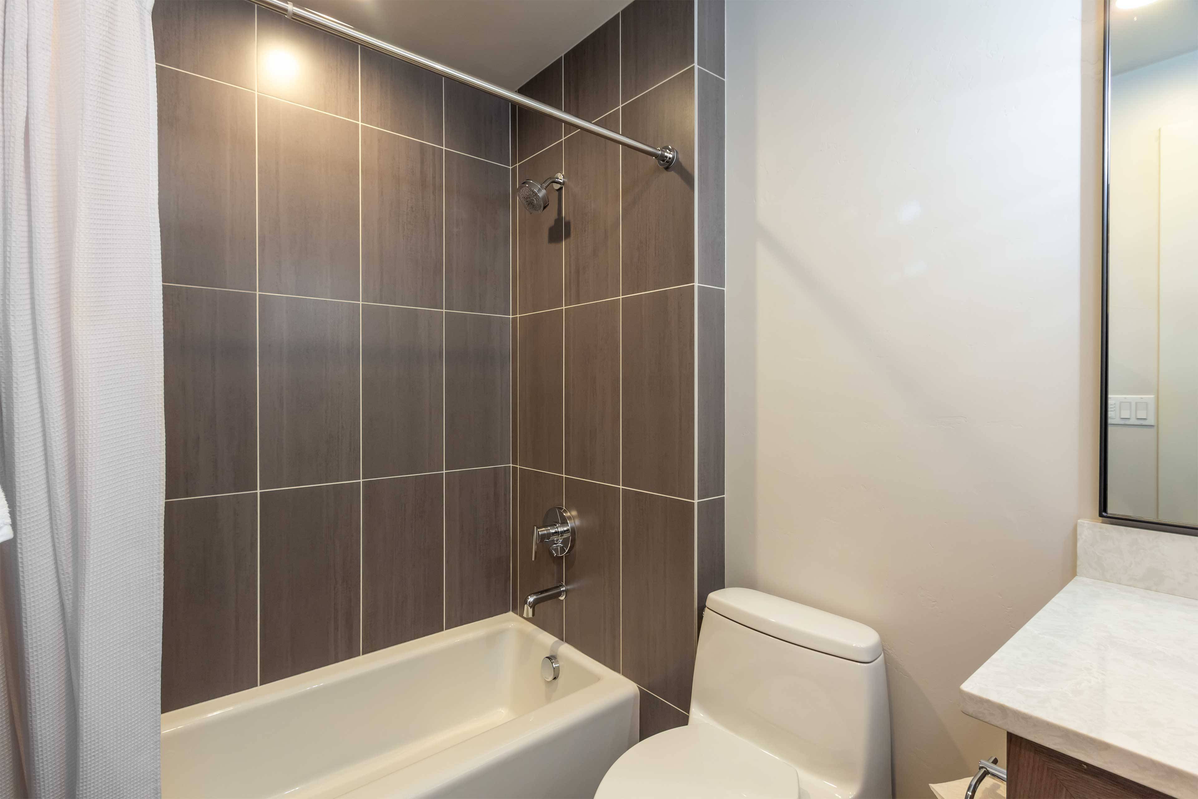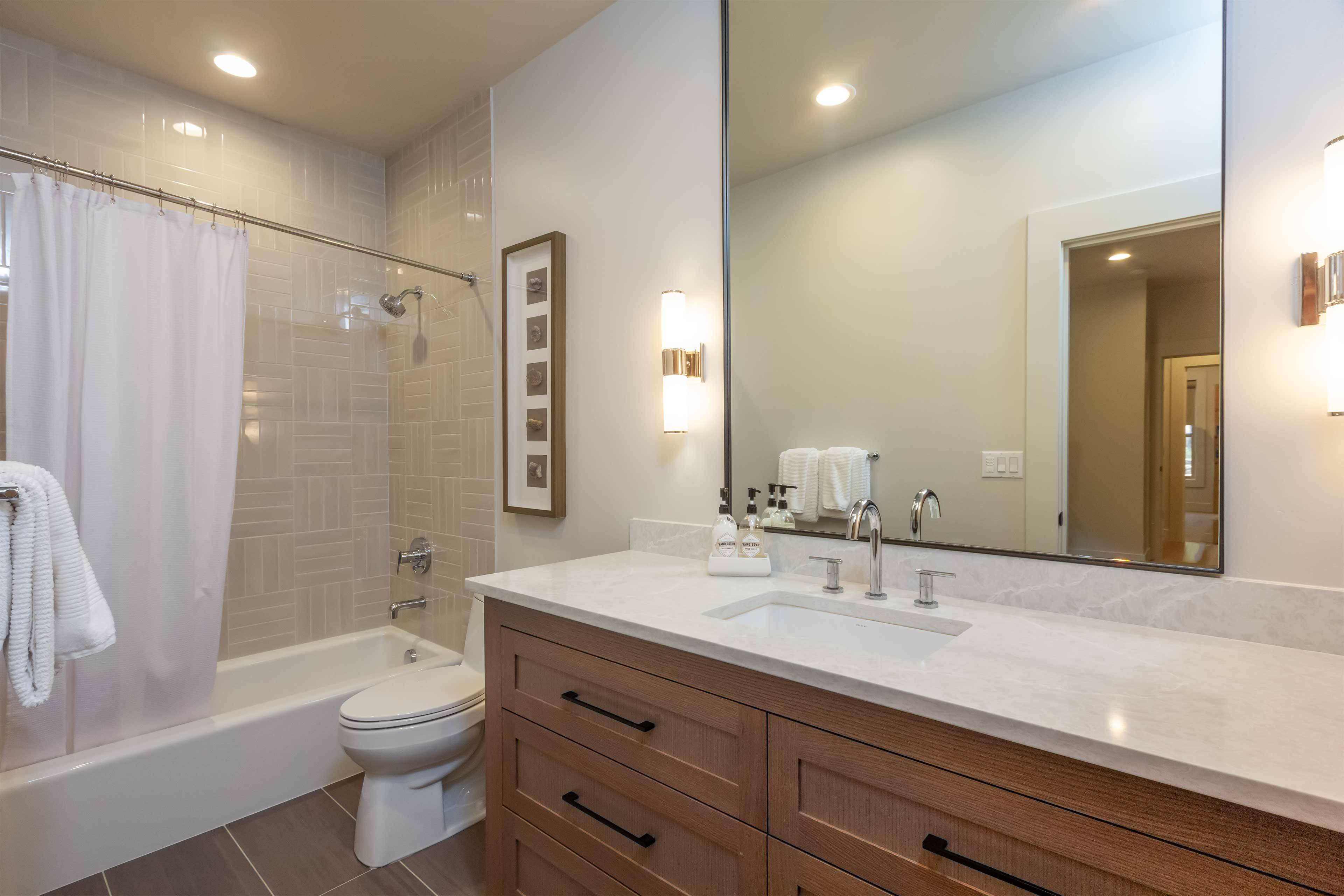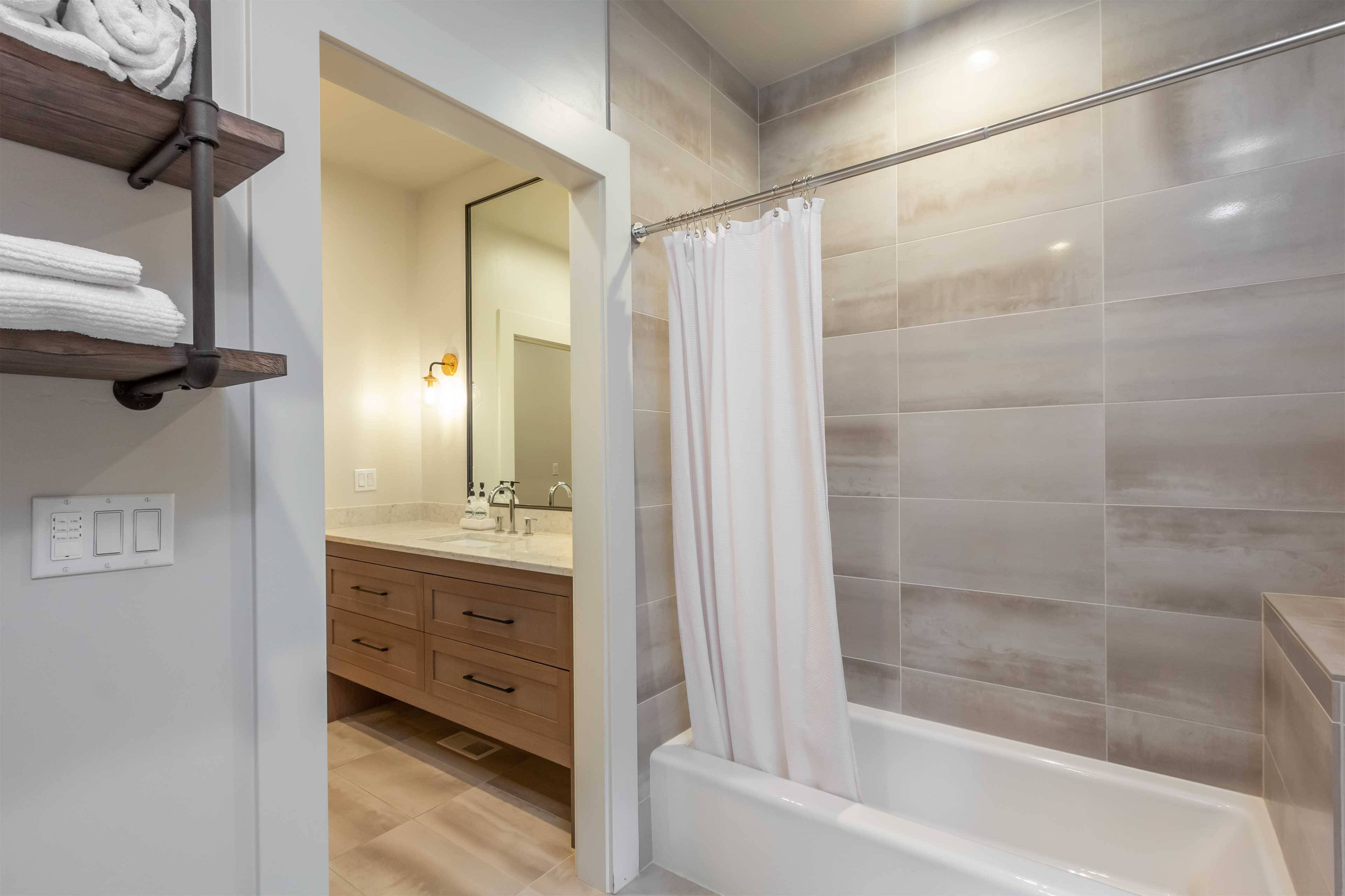 Six bedrooms are nicely separated for privacy. The King suite is on the main floor and includes a large flat screen TV, gas fireplace, soaking tub, and walk-in closet. Three additional King ensuite bedrooms are downstairs as well. The upstairs offers a TV room with attached bedroom with 2 Twin over Queen pyramid bunk beds, as well as an additional ensuite bedroom with Queen bed.