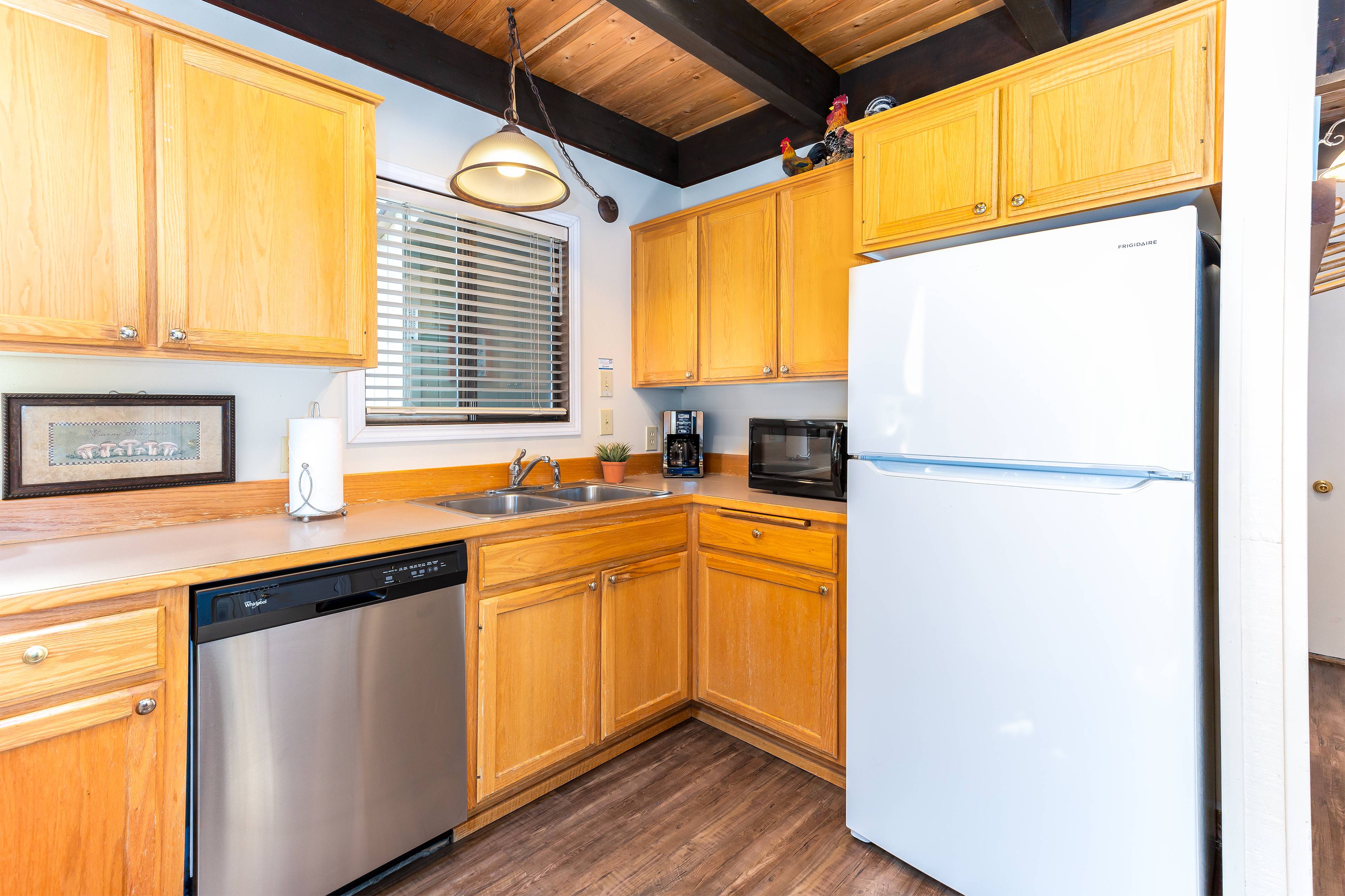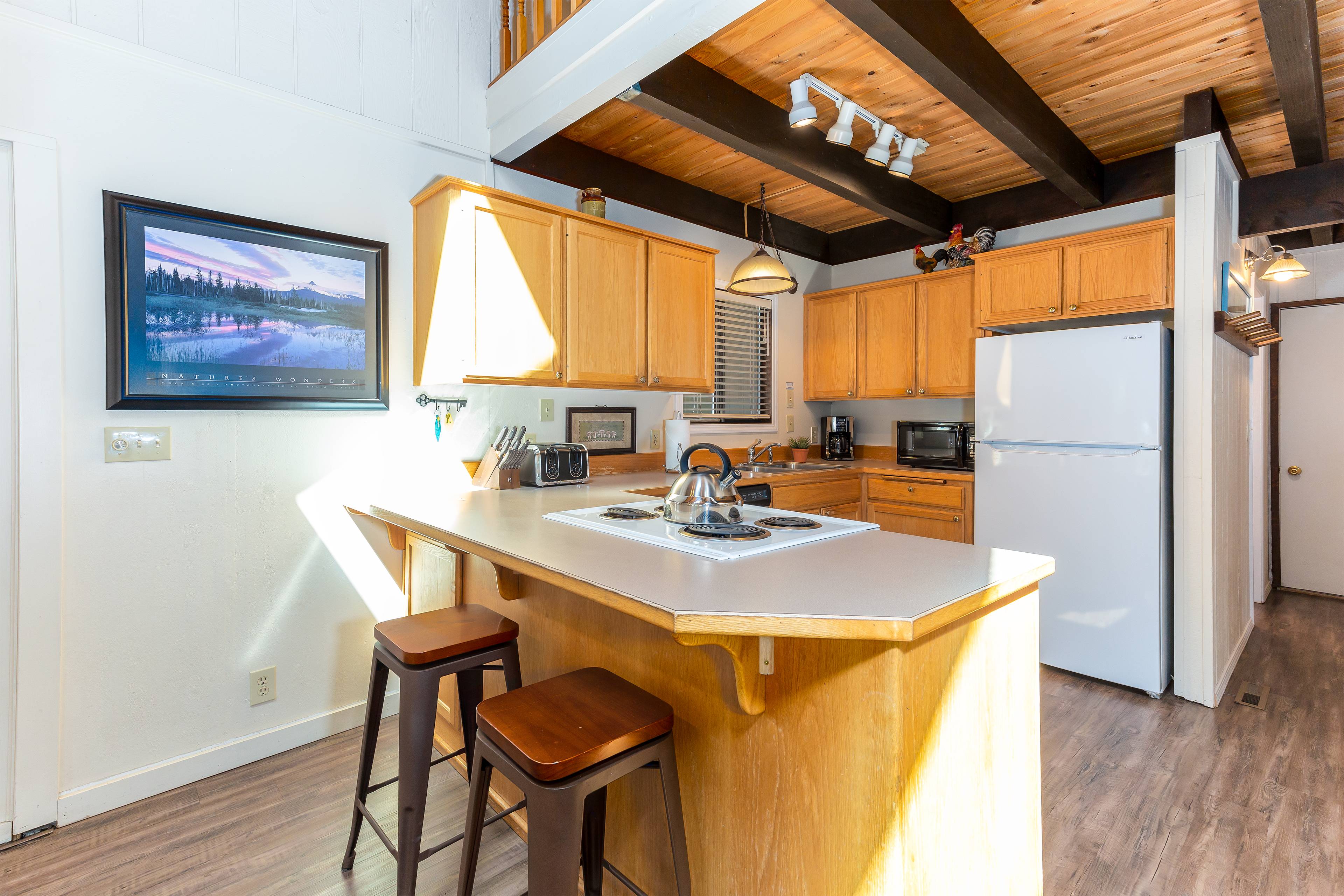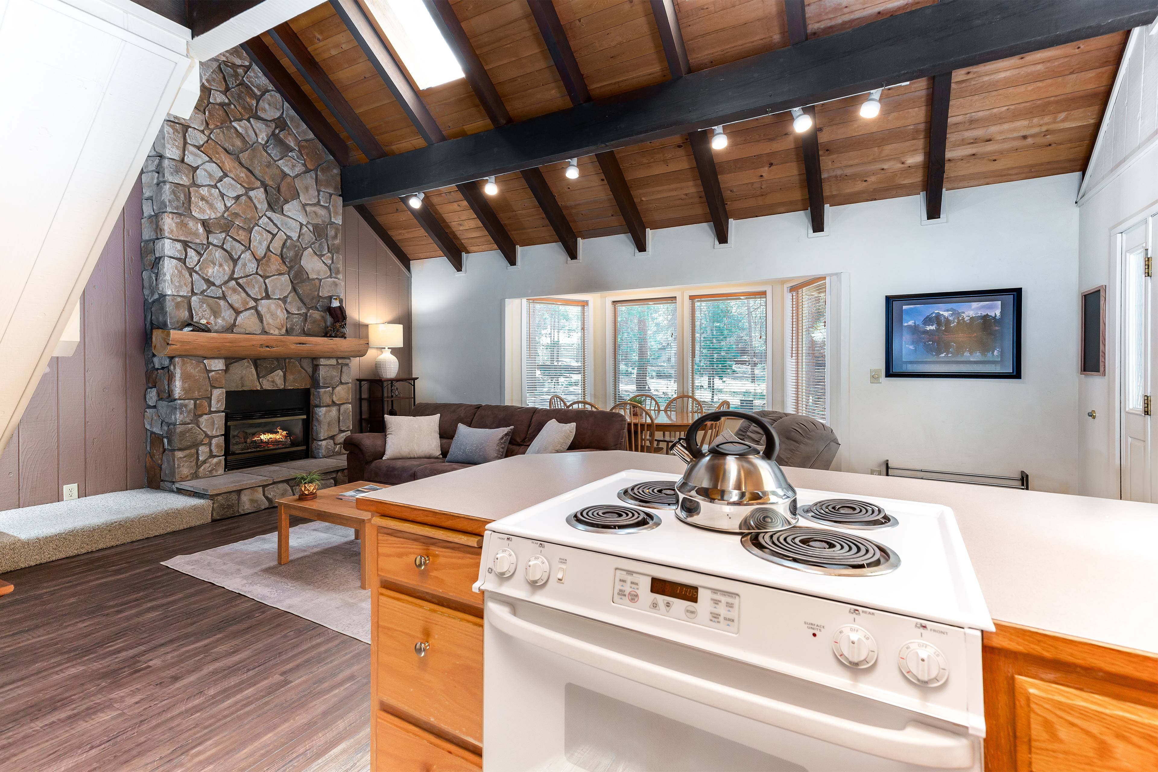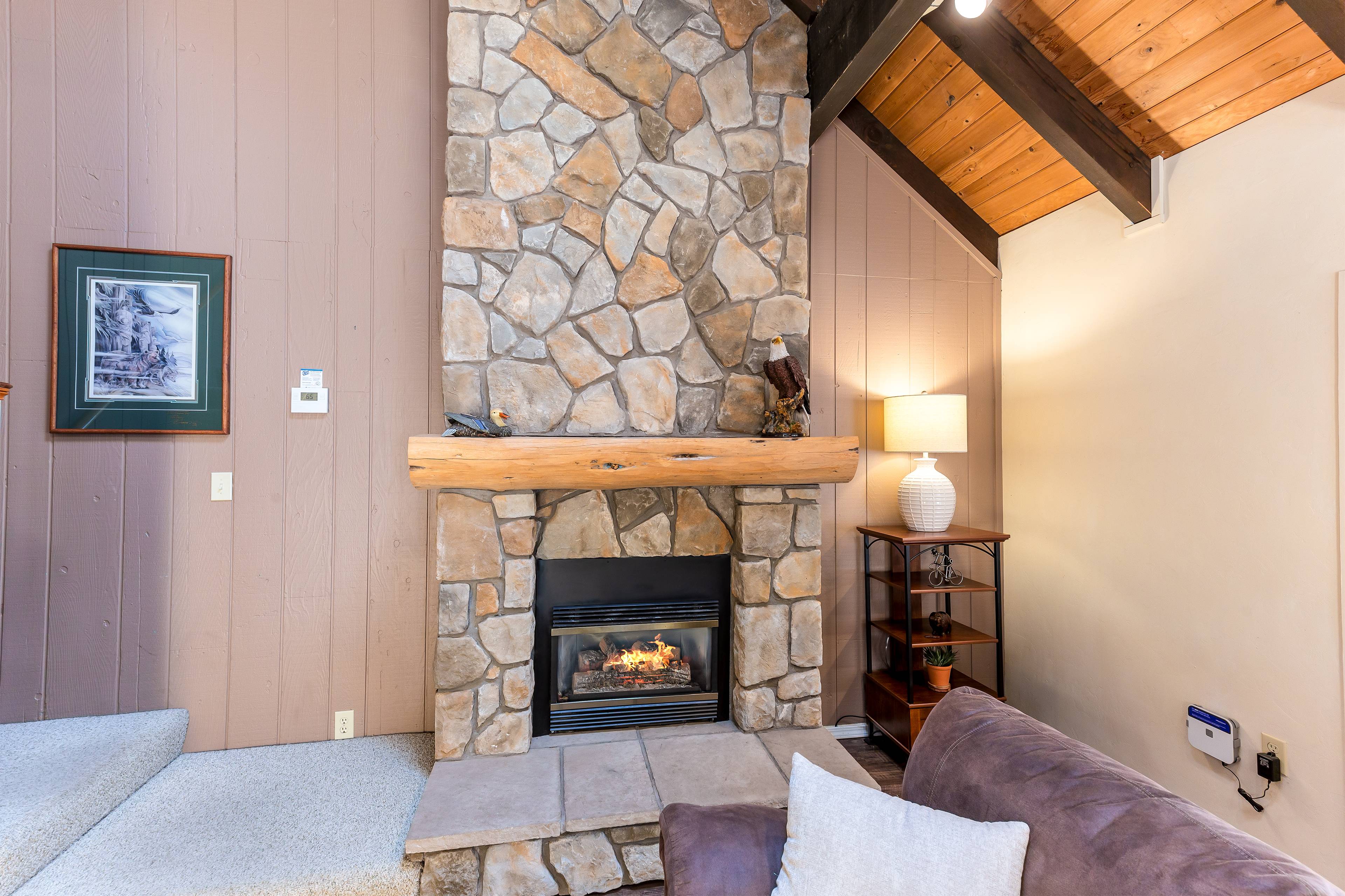 A cozy gas fireplace in the living room with a new smart TV plus cable and DVD player, vaulted ceilings with exposed wooden beams and skylights, and a large wrap-around deck with a private hot tub and patio seating create a charming atmosphere for your vacation.