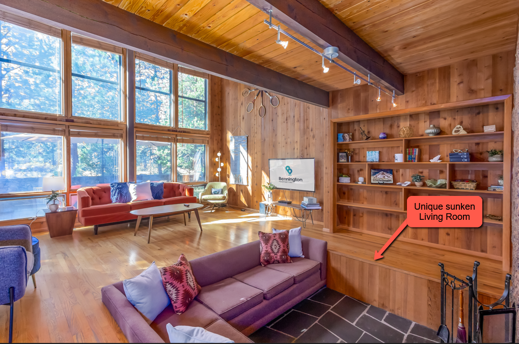 The centerpiece of this home is the well-cushioned conversation pit before the large stone fireplace. It's an ideal place to curl up with a glass of wine. The house does have a lot of doors and a quirky design; for example, the washer and the dryer are in different closets. The kitchen is easy to work in and the private hot tub is a delight.