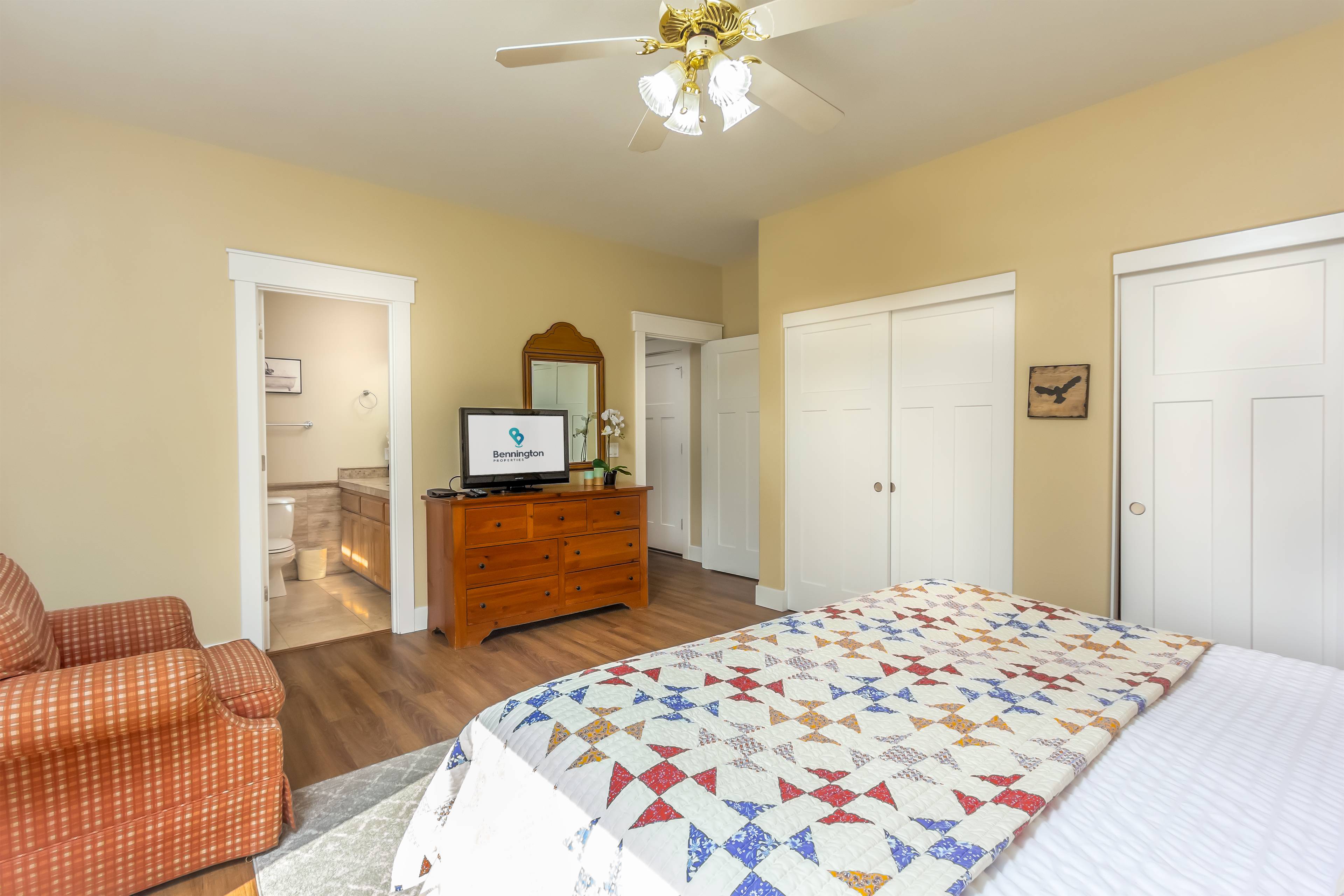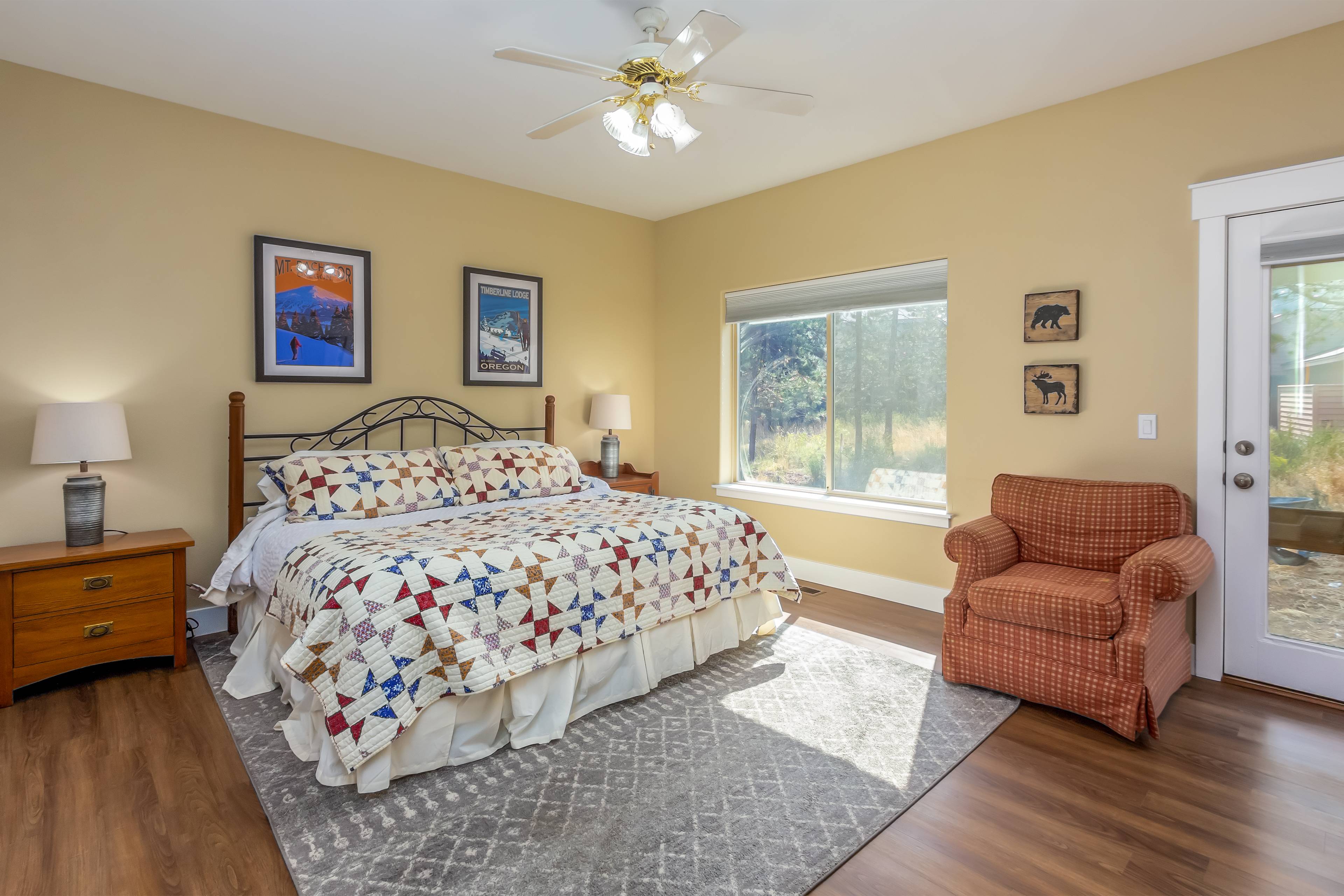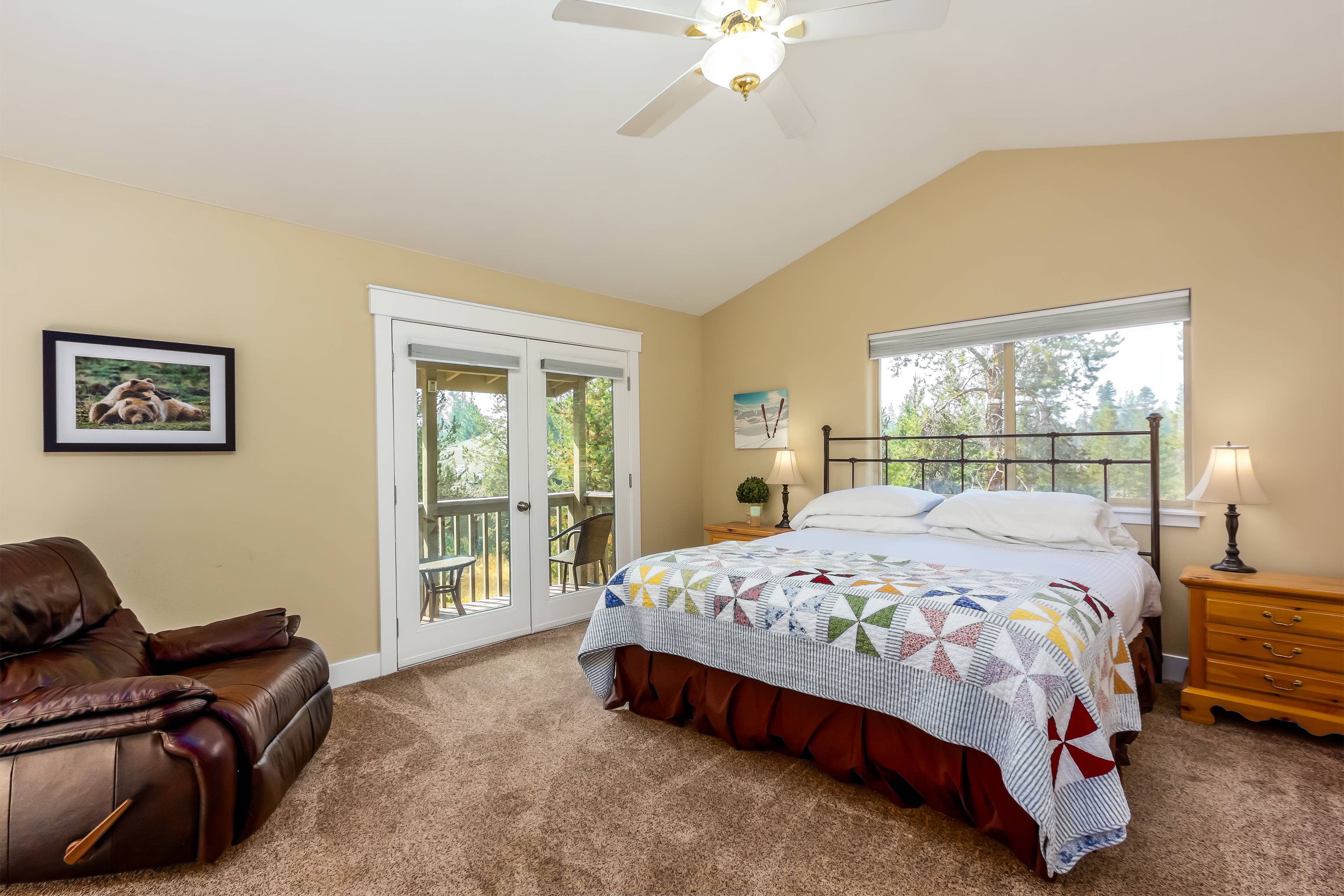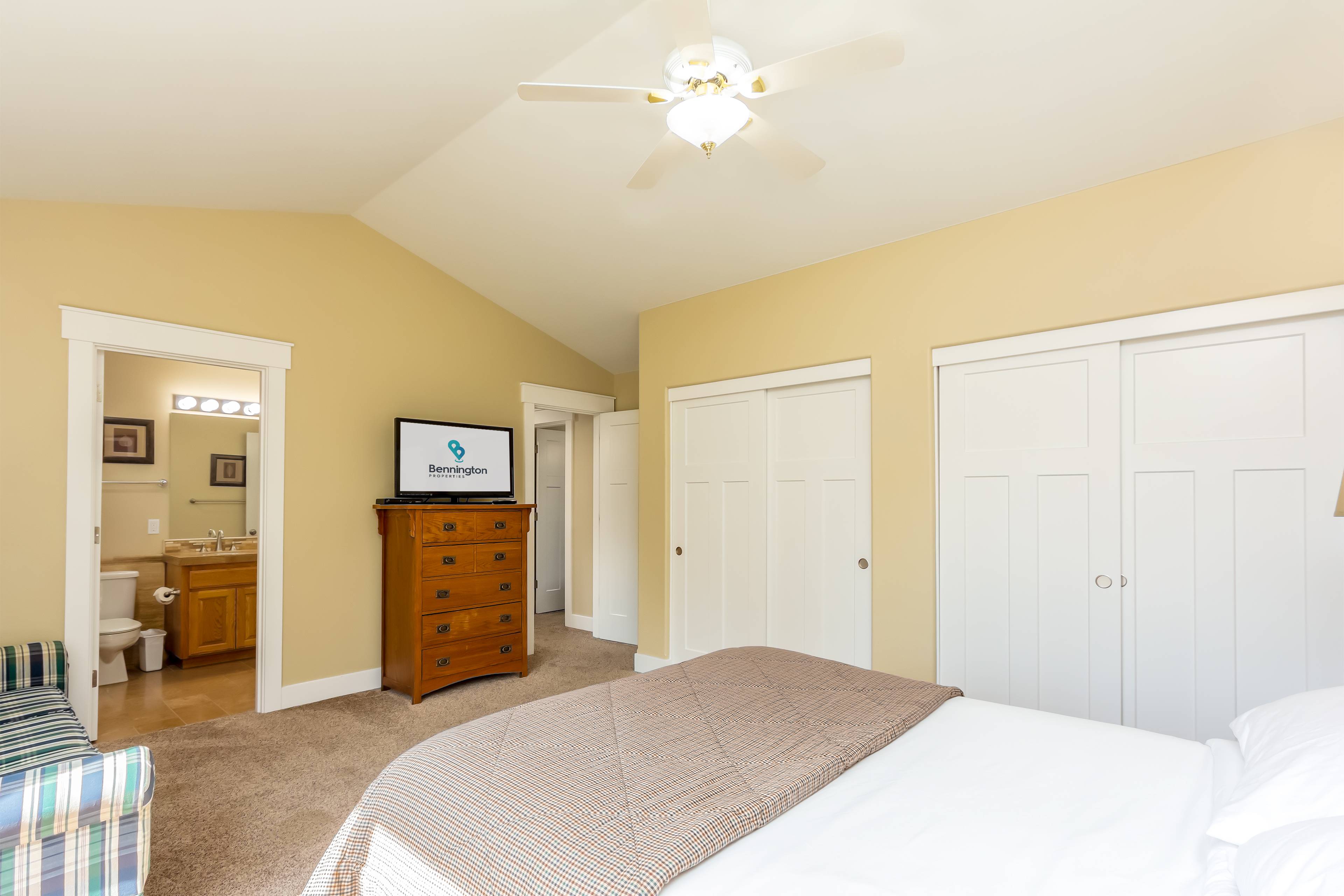 The main level ensuite bedroom has a King bed and attached private bath with large walk-in shower and access to the back deck and private hot tub.