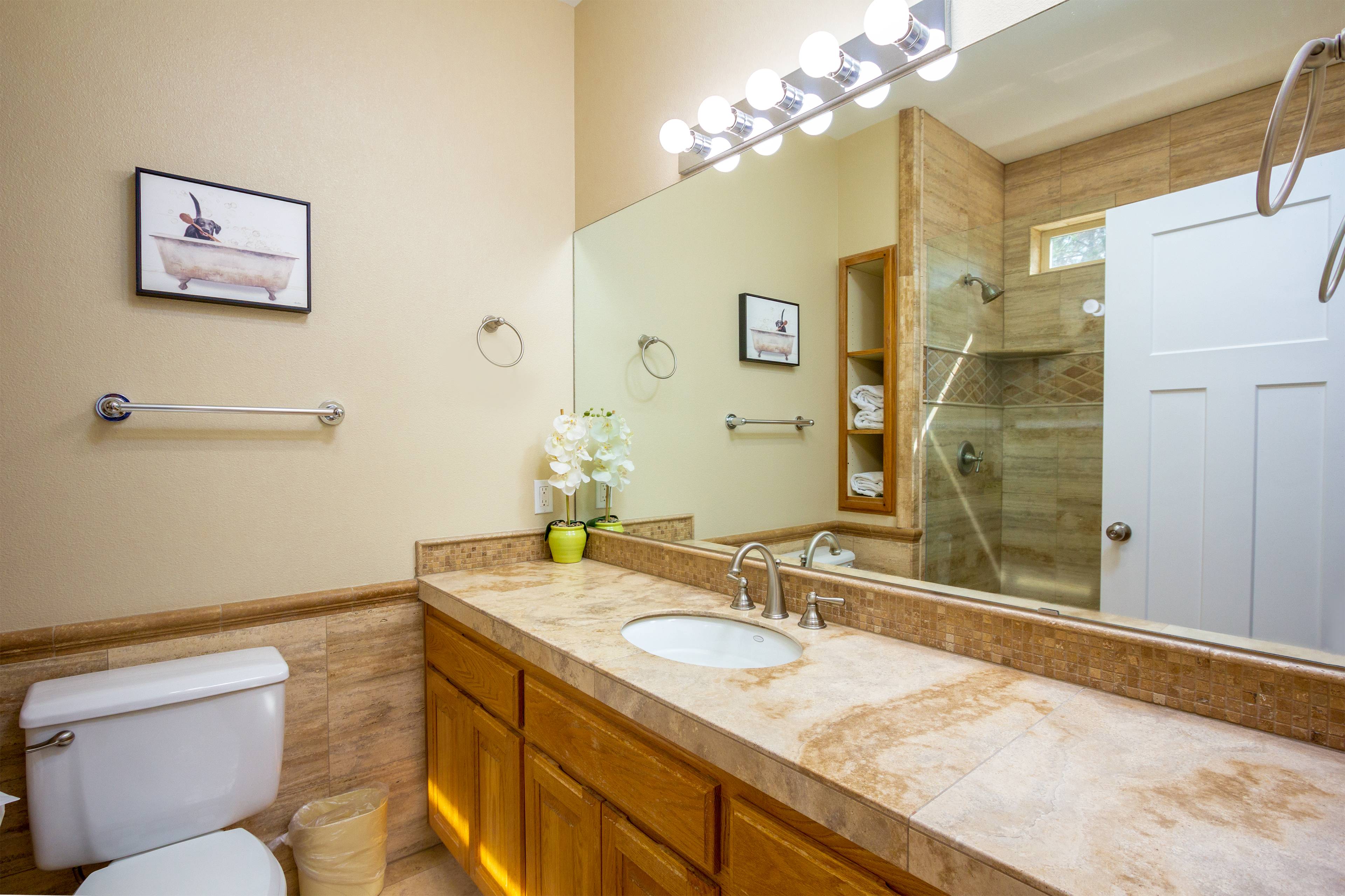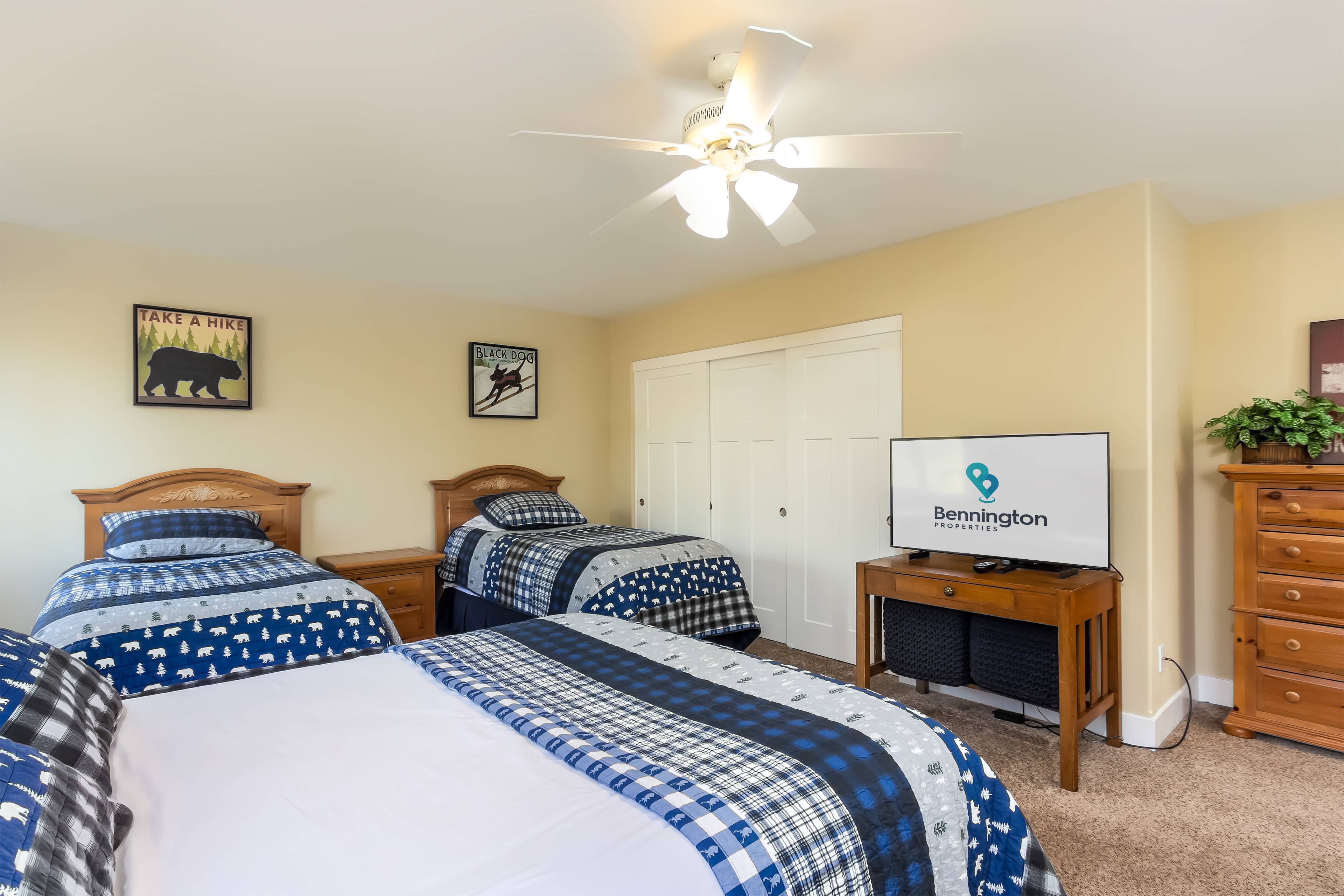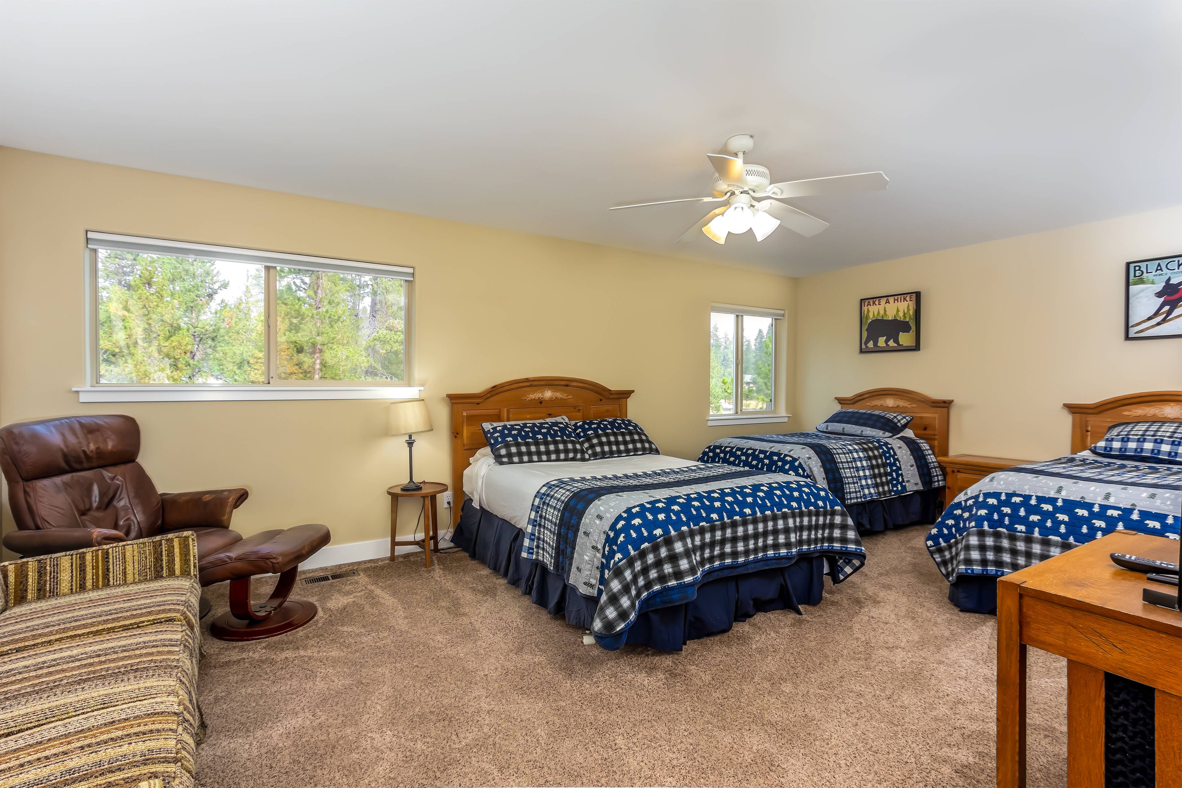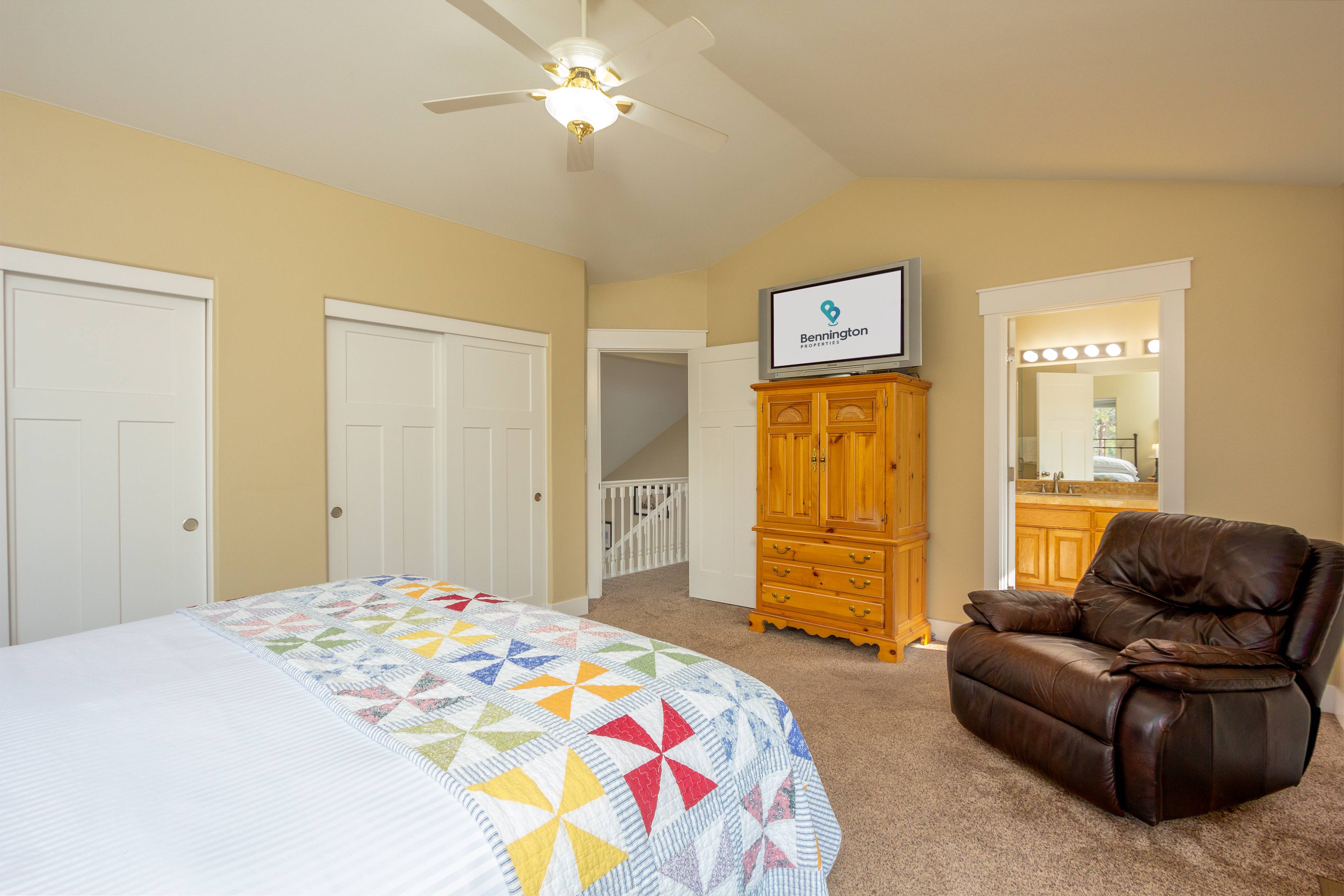 Upstairs you will find a second ensuite bedroom featuring a king bed, TV, and private bath with a walk-in shower. Bedroom three has two twin beds, a queen bed, sofa, and TV. Bedroom four has a queen bed and tv. The upstairs guest bath has dual sinks, and a shower/tub combo.
