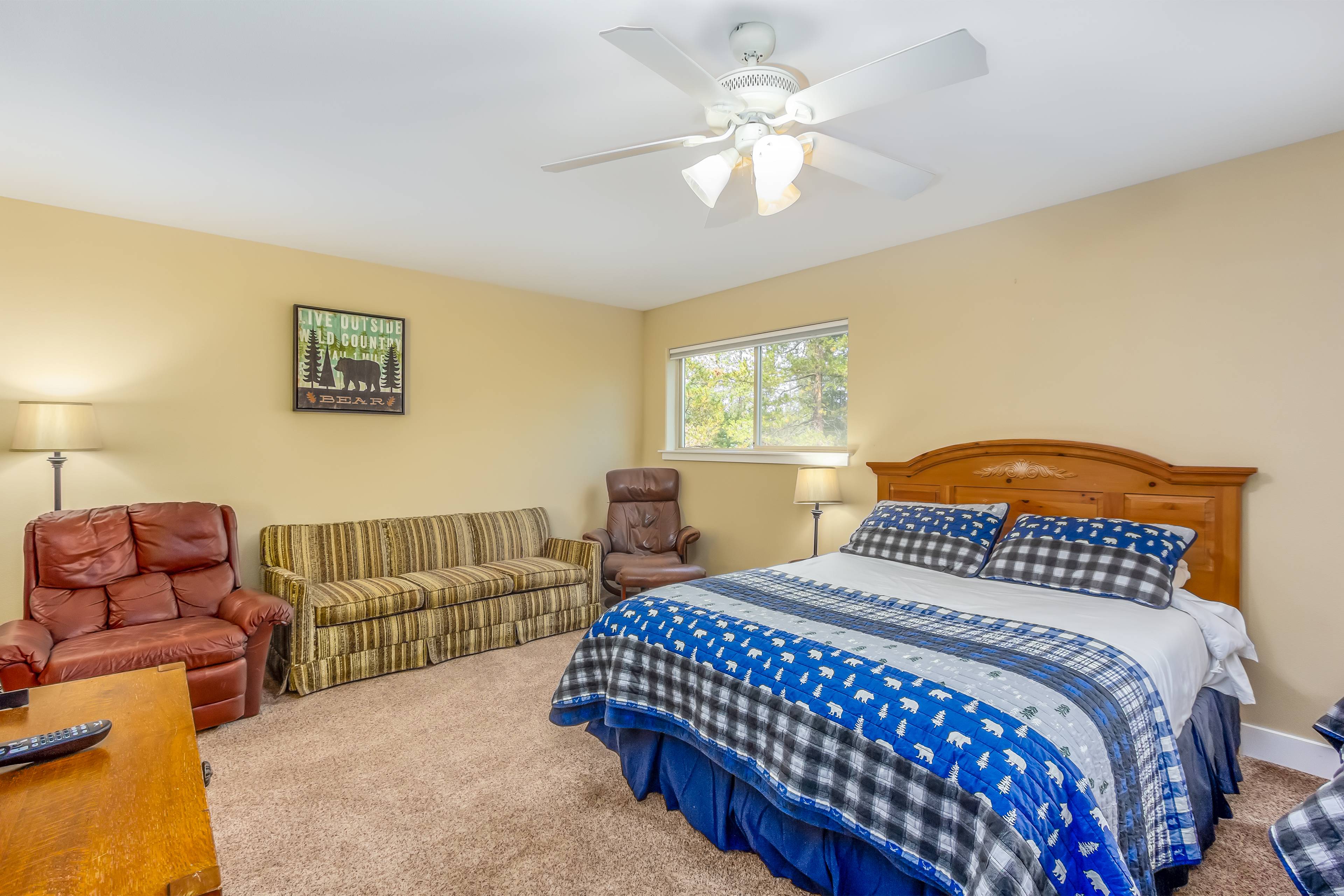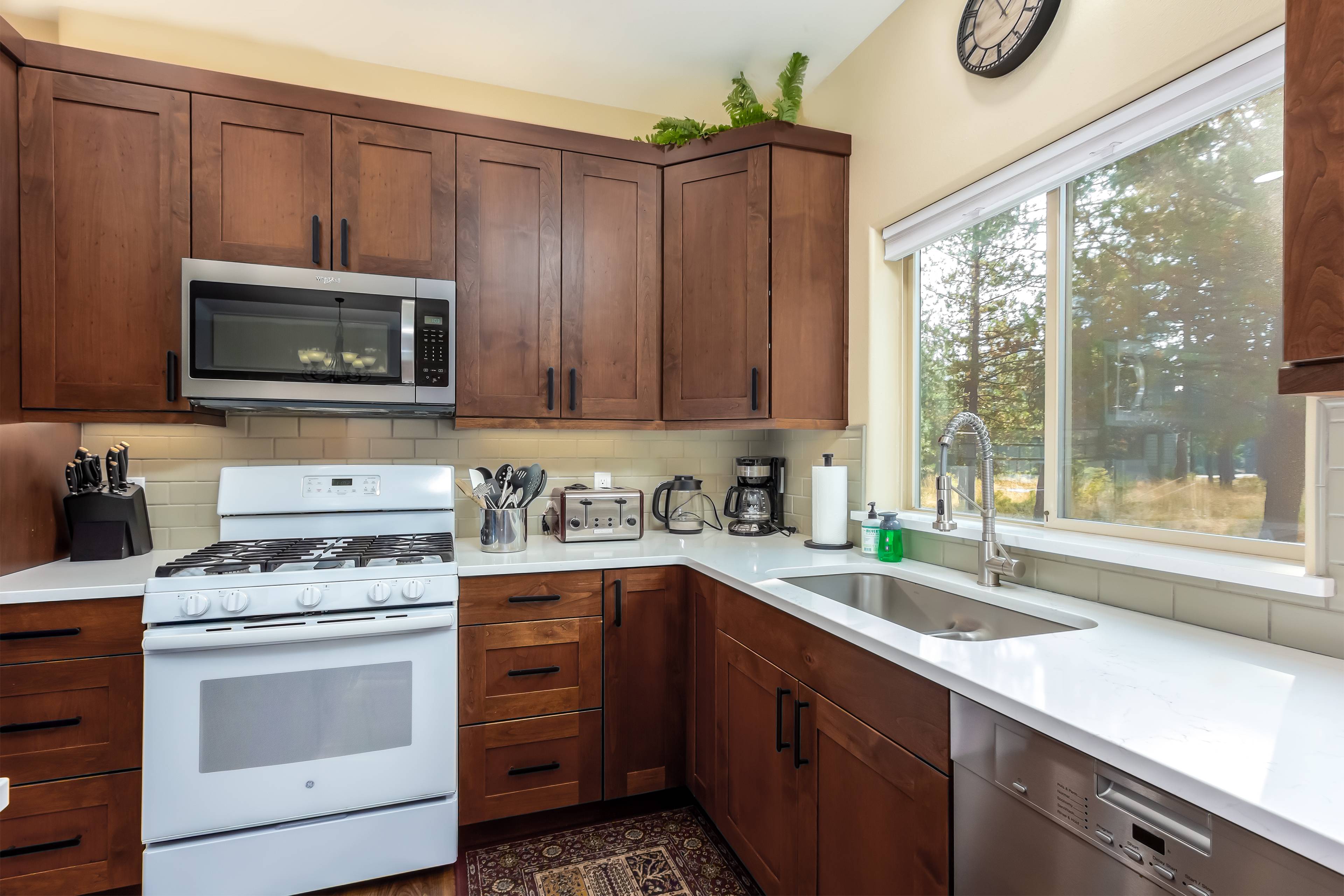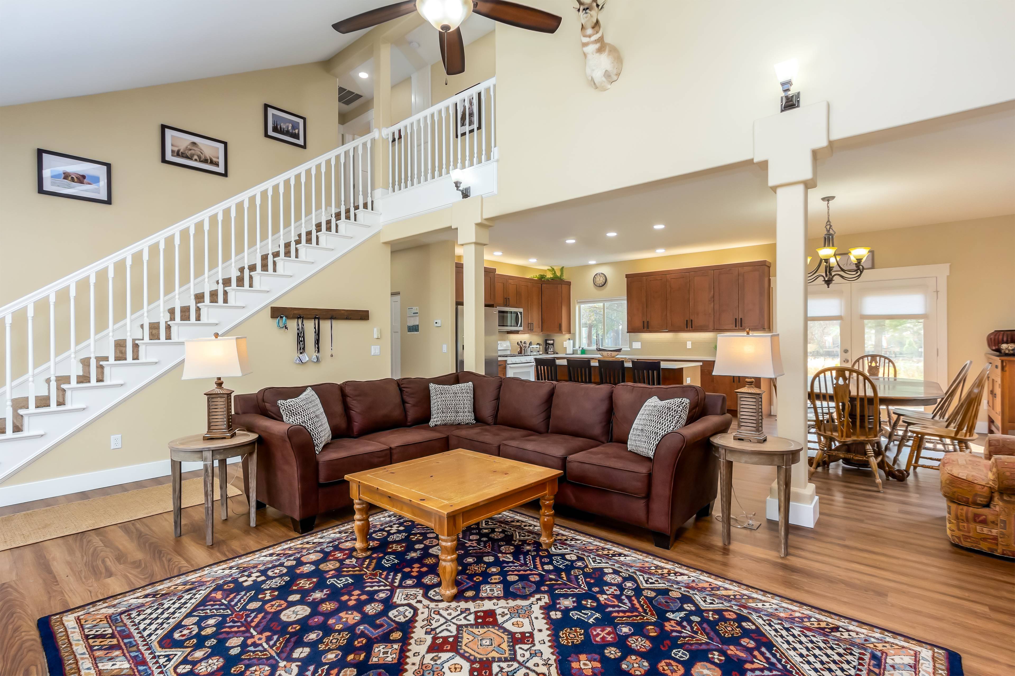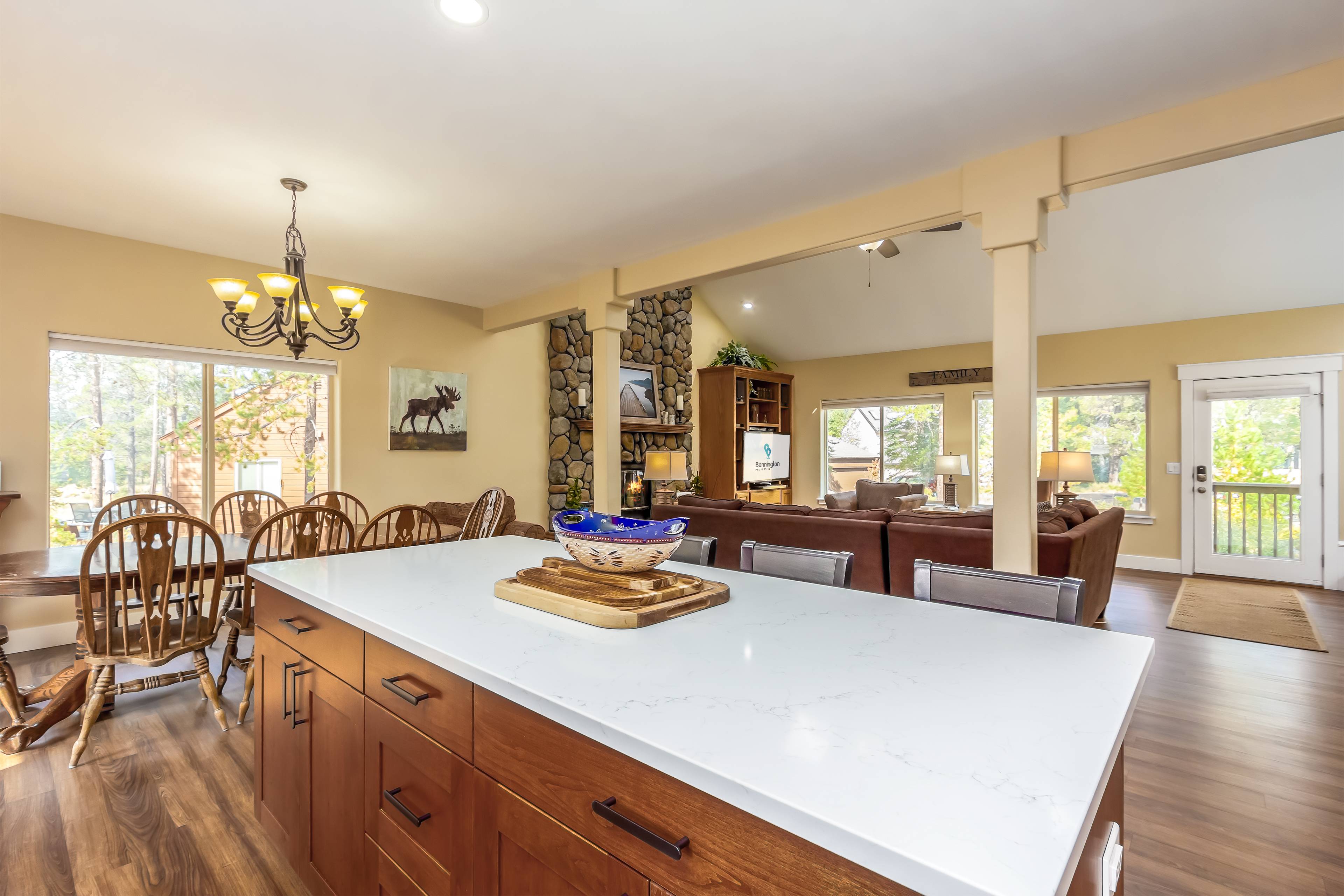 This spacious 4-bedroom home features an open layout main level with plush carpeting, abundant seating, and floor to ceiling stone fireplace. The living room opens to a large dining area with seating for 8. The updated kitchen features hardwood floors, an island with seating for 4 more, plus beautifully crafted countertops, perfect for the chef in your group. Modern appliances and all the cooking utensils you will need to whip up a gourmet meal are included.