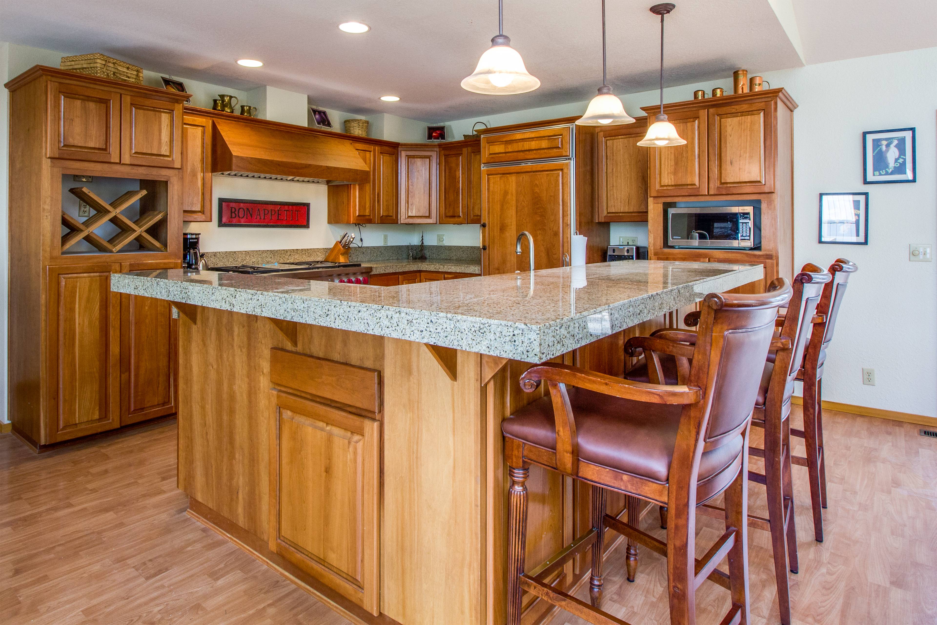 The great room with kitchen, dining and living areas, a spacious primary suite, and two large decks are situated upstairs on the main level. The living room features a floor to ceiling, river rock, gas fireplace, large TV, and leather seating surrounded by panoramic views of the forest. The kitchen will delight the best of chefs - spacious granite tile countertops and island, stainless appliances, and a commercial grade Wolf 6-burner, plus a griddle, gas range will make preparing meals together a breeze. Dine at the island or sit down to enjoy a meal at the custom-built dining table, comfortably seating 10. A gas BBQ and patio seating await you on one of the two upper decks found on either side of the great room, so you can soak up the sun no matter what time of day! The upstairs ensuite is tastefully appointed with a lodgepole King bed. The vaulted ceilings, large windows and attached bathroom with tiled countertops and a tiled, walk-in shower make this a great retreat.
