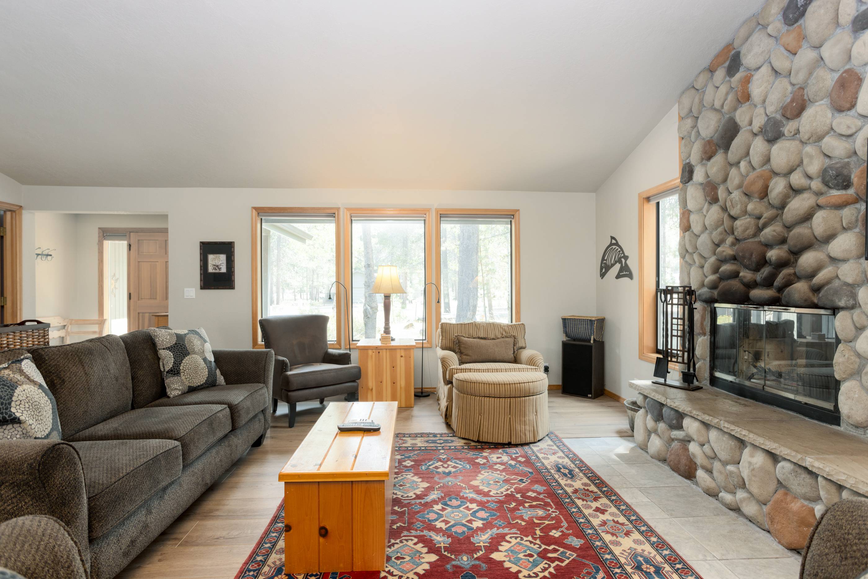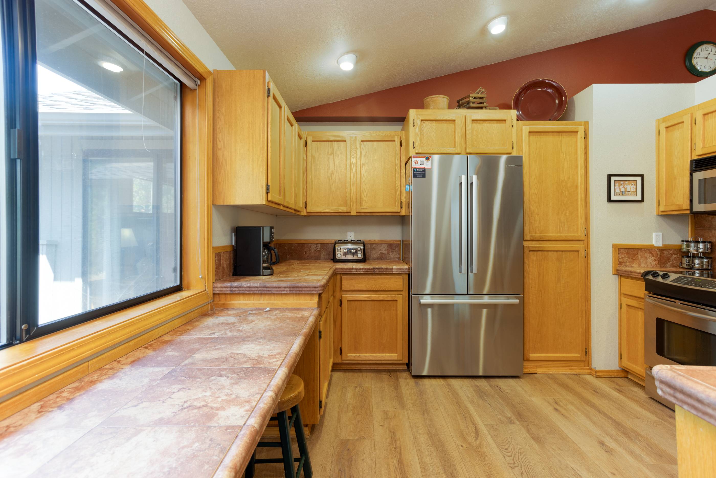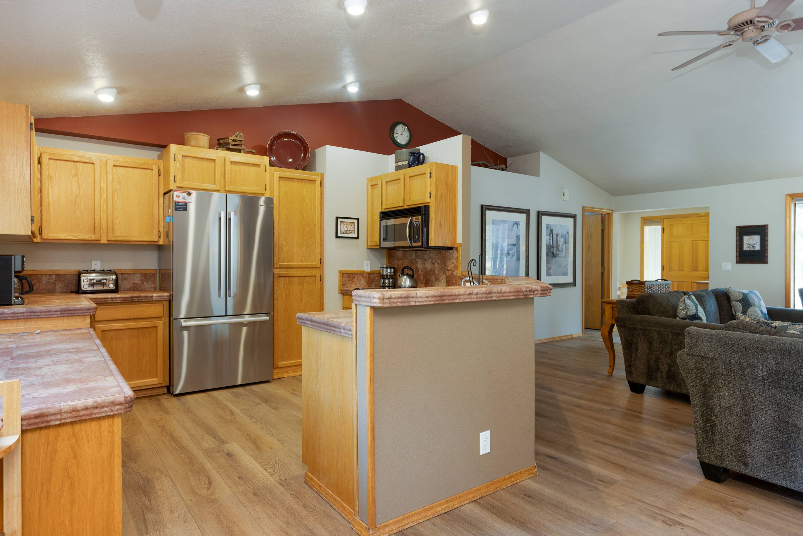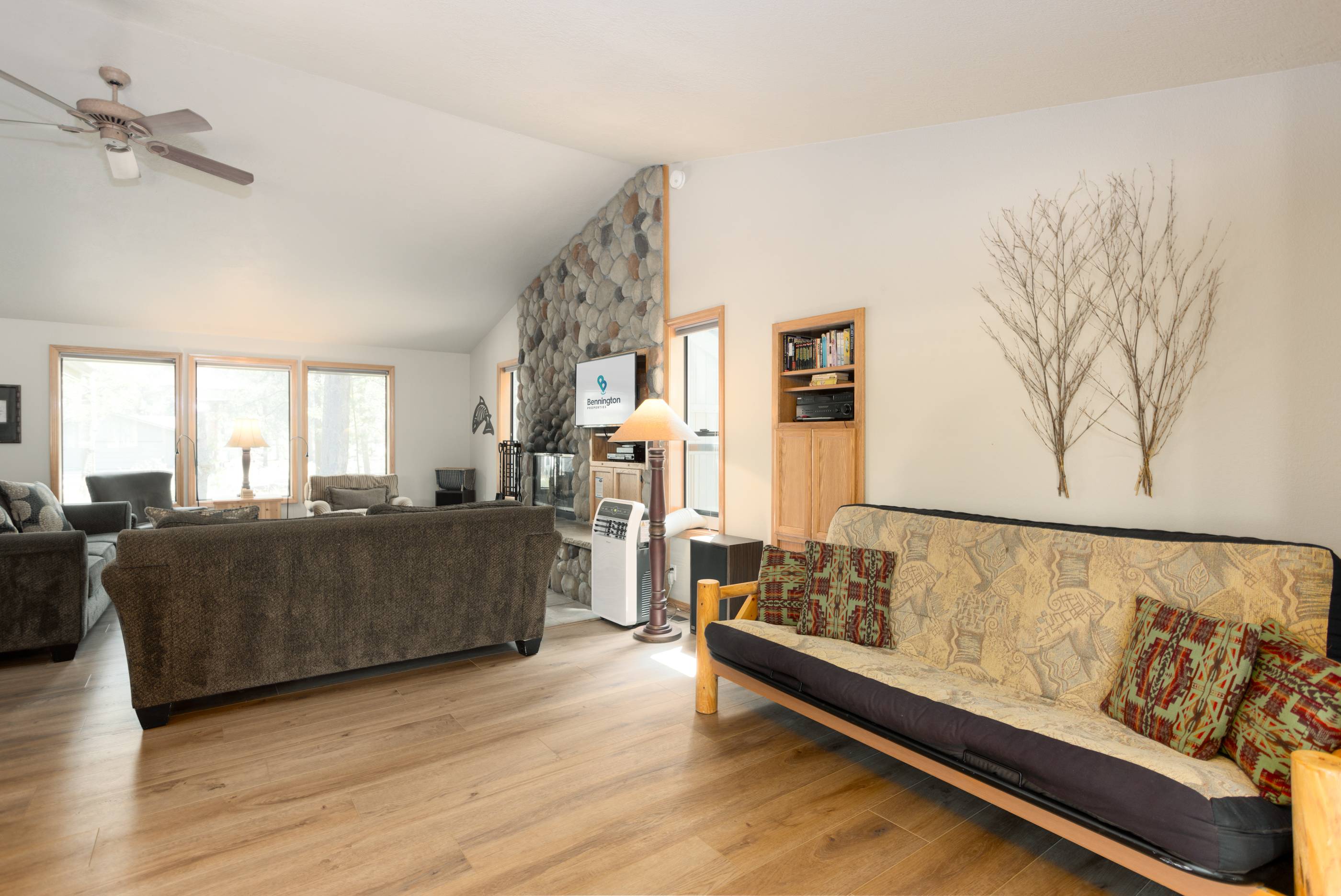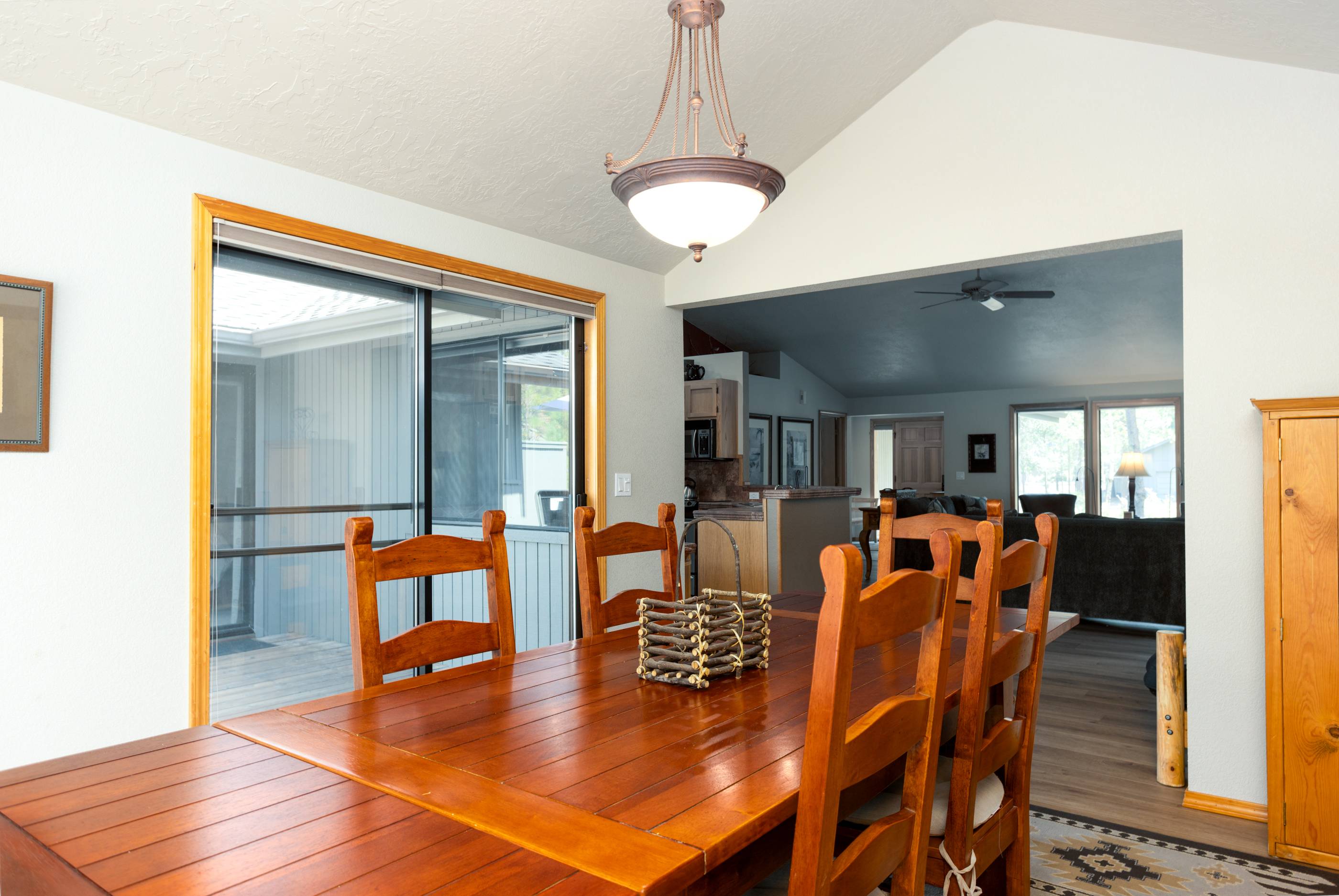 Walking through the front door of 21 East Butte, guests are greeted by a spacious living room complete with lots of windows, cozy sofas and a wood burning fireplace. Vaulted ceilings create an airy sense of space in this room while the open concept floor plan transitions the living room seamlessly into the dining room and kitchen.