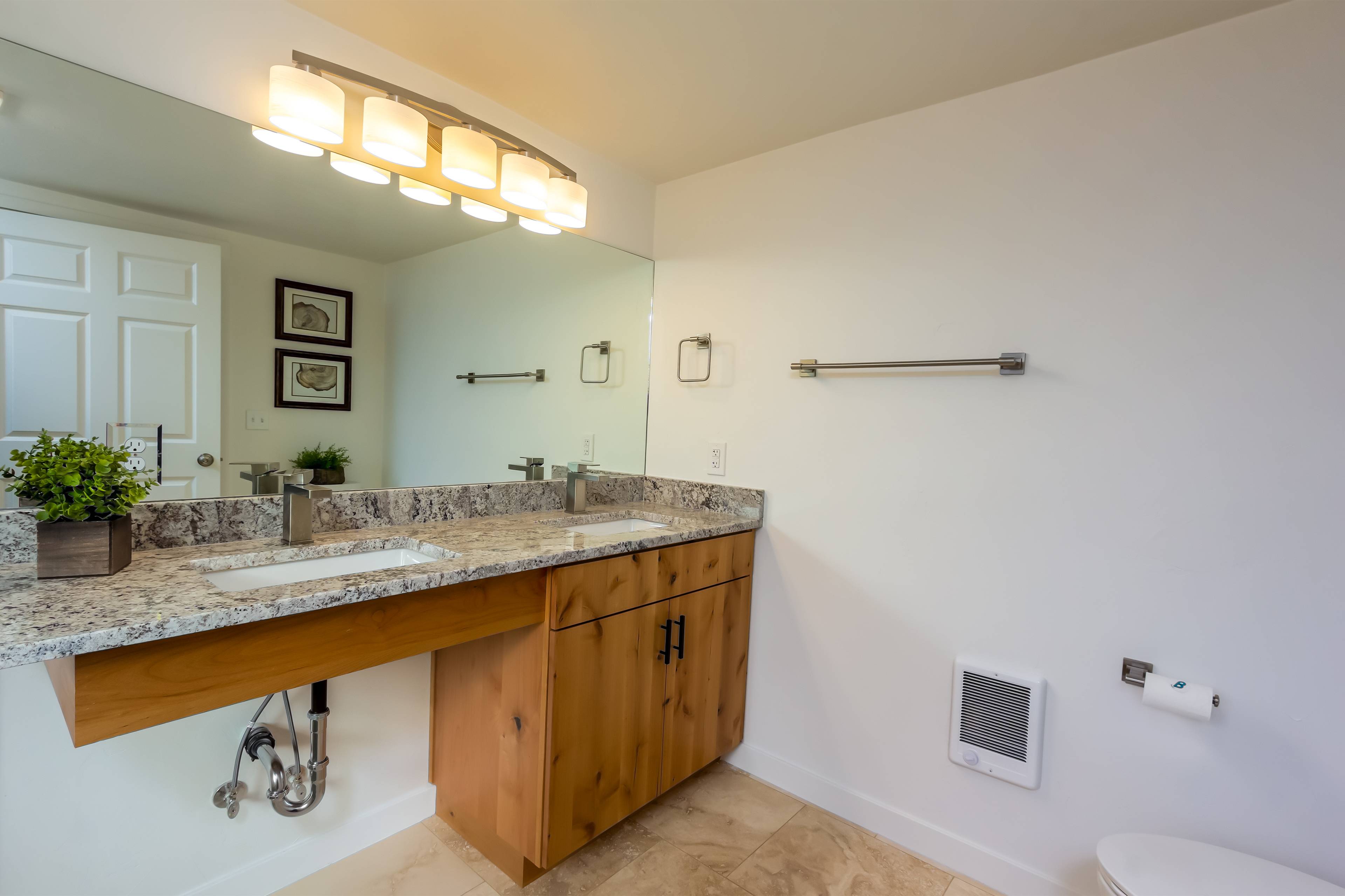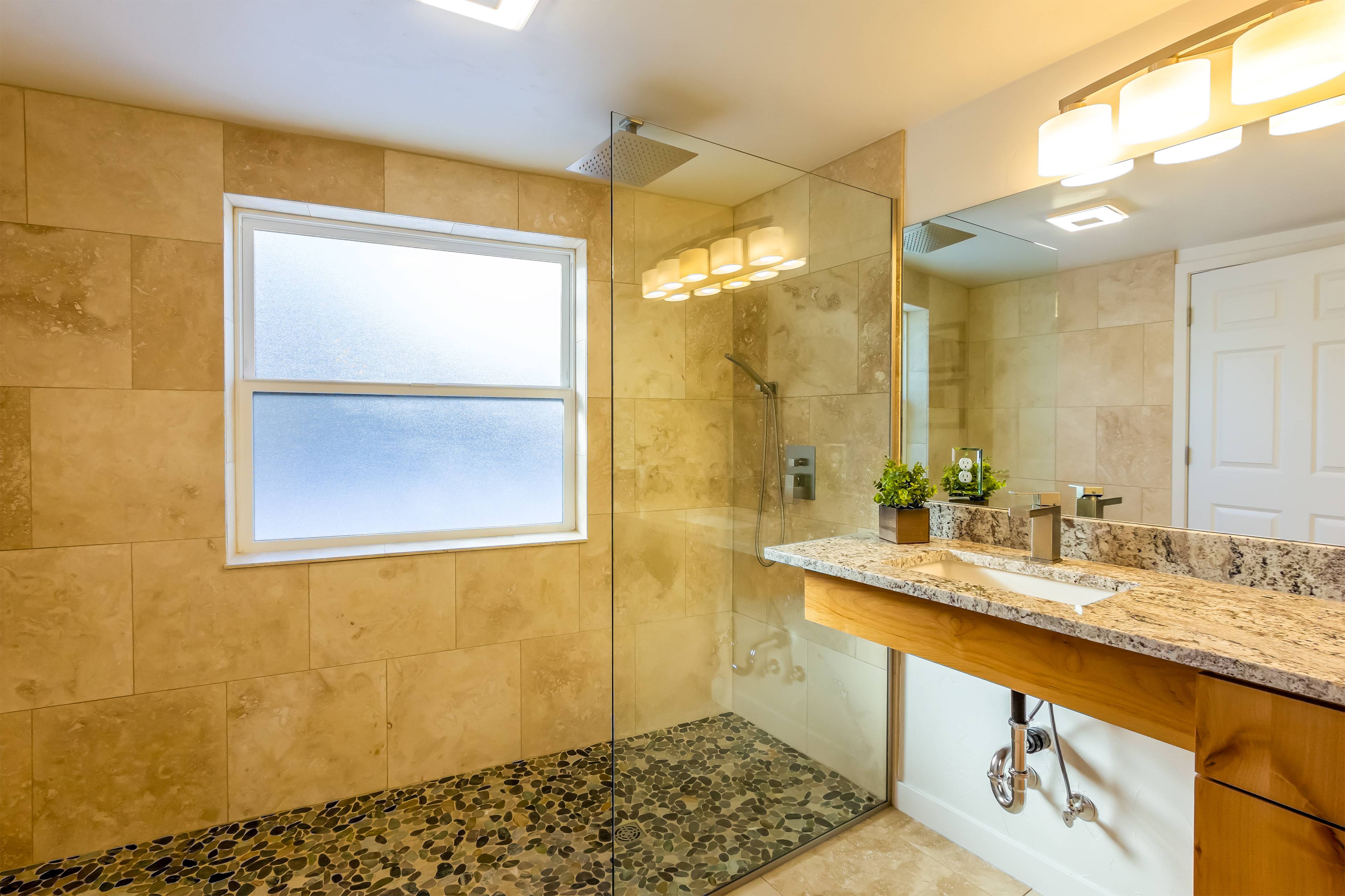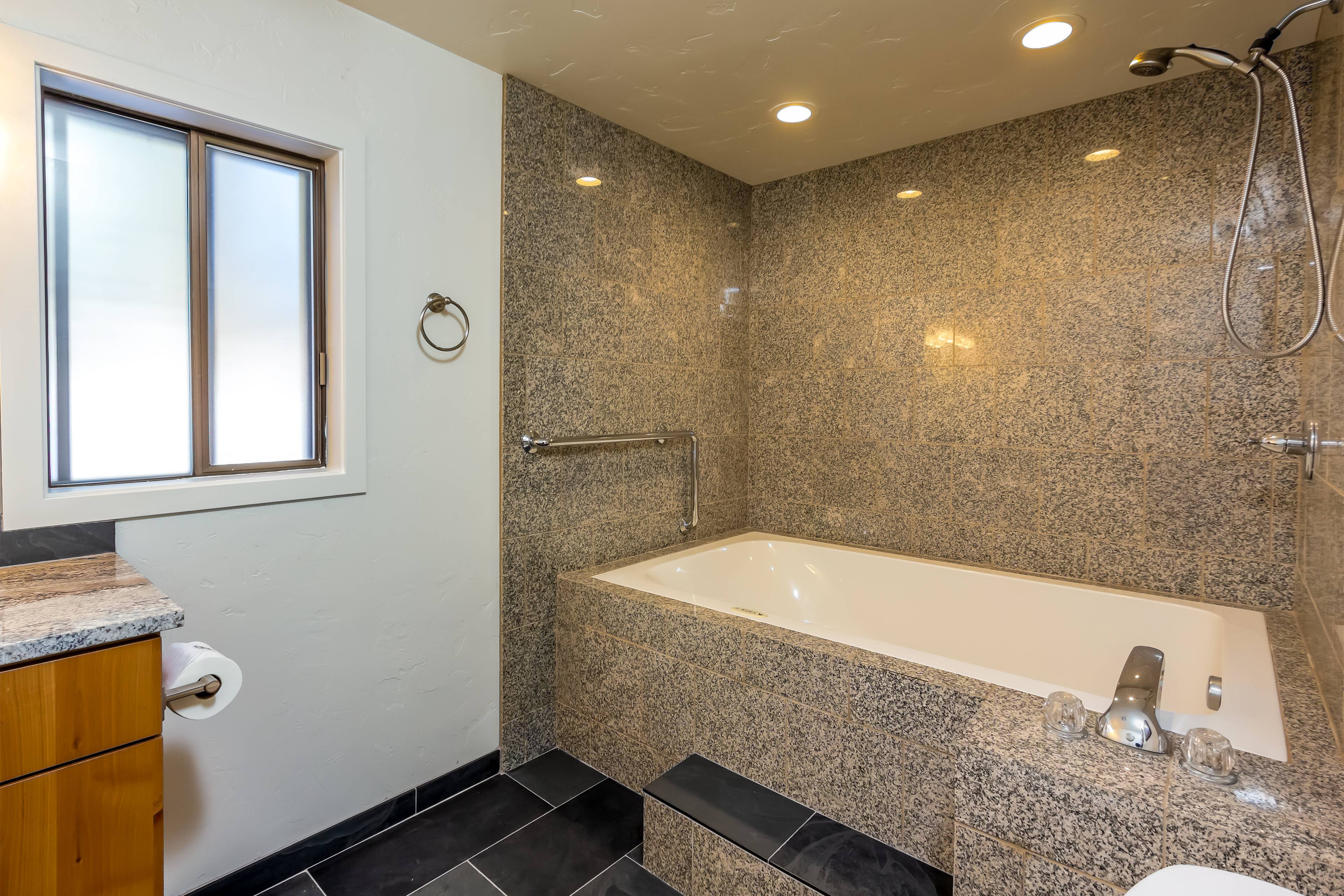 On this main level is the king ensuite bedroom with private bath. featuring enhanced accessibility features including a roll in shower and wheel chair accessible sink. A second king bedroom plus a full bathroom with soaking tub and shower is also available.