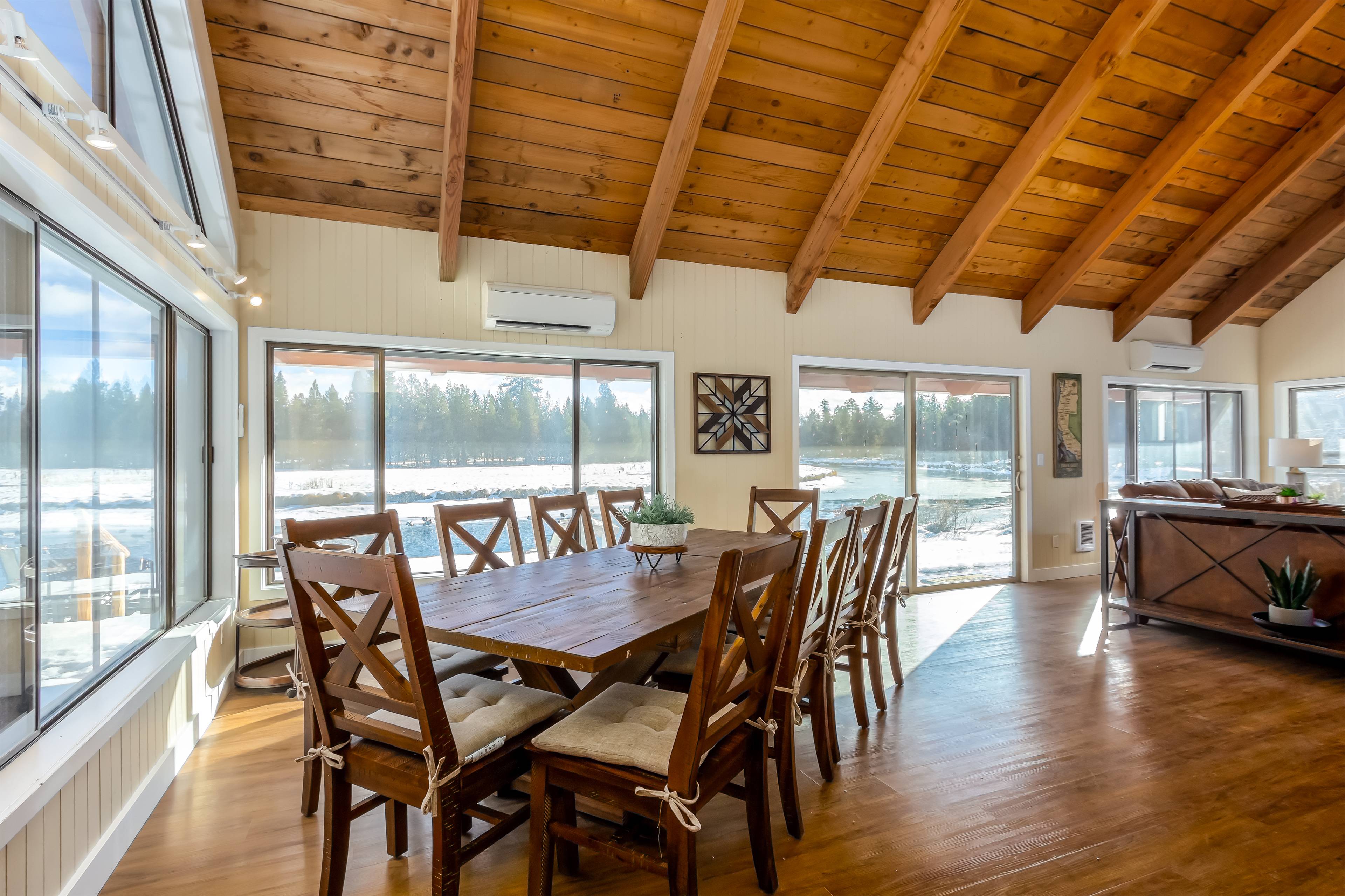Upon entering the home you'll be in a large, open space with the living room attached to the kitchen and dining areas. The living area features comfy furnishings with queen sleeper sofa and a large river rock fireplace, perfect for relaxing after a long day. The adjacent dining room seats 10 and is connected to the gorgeous, well-stocked kitchen with granite countertops and amazing views of the Deschutes.