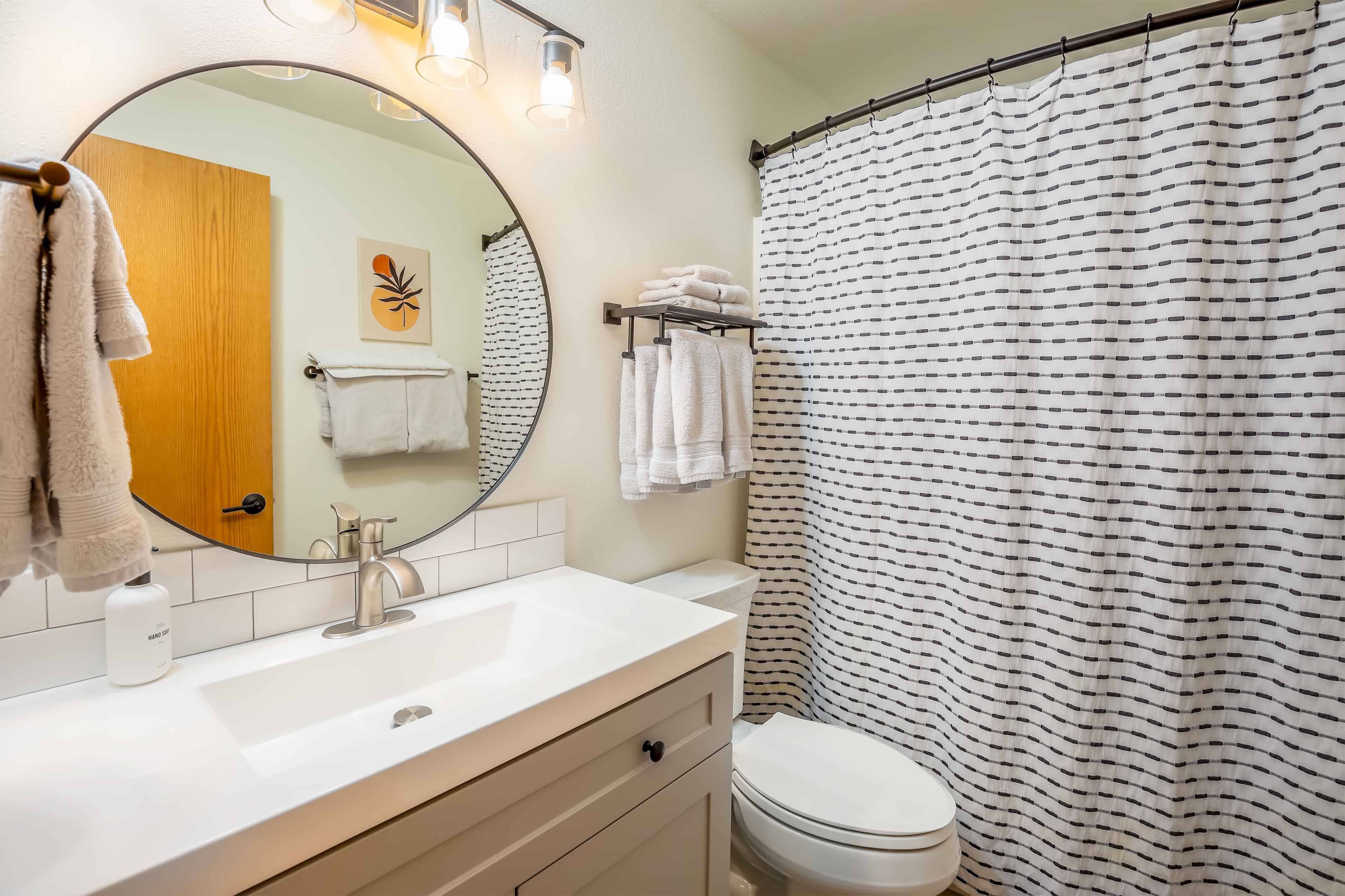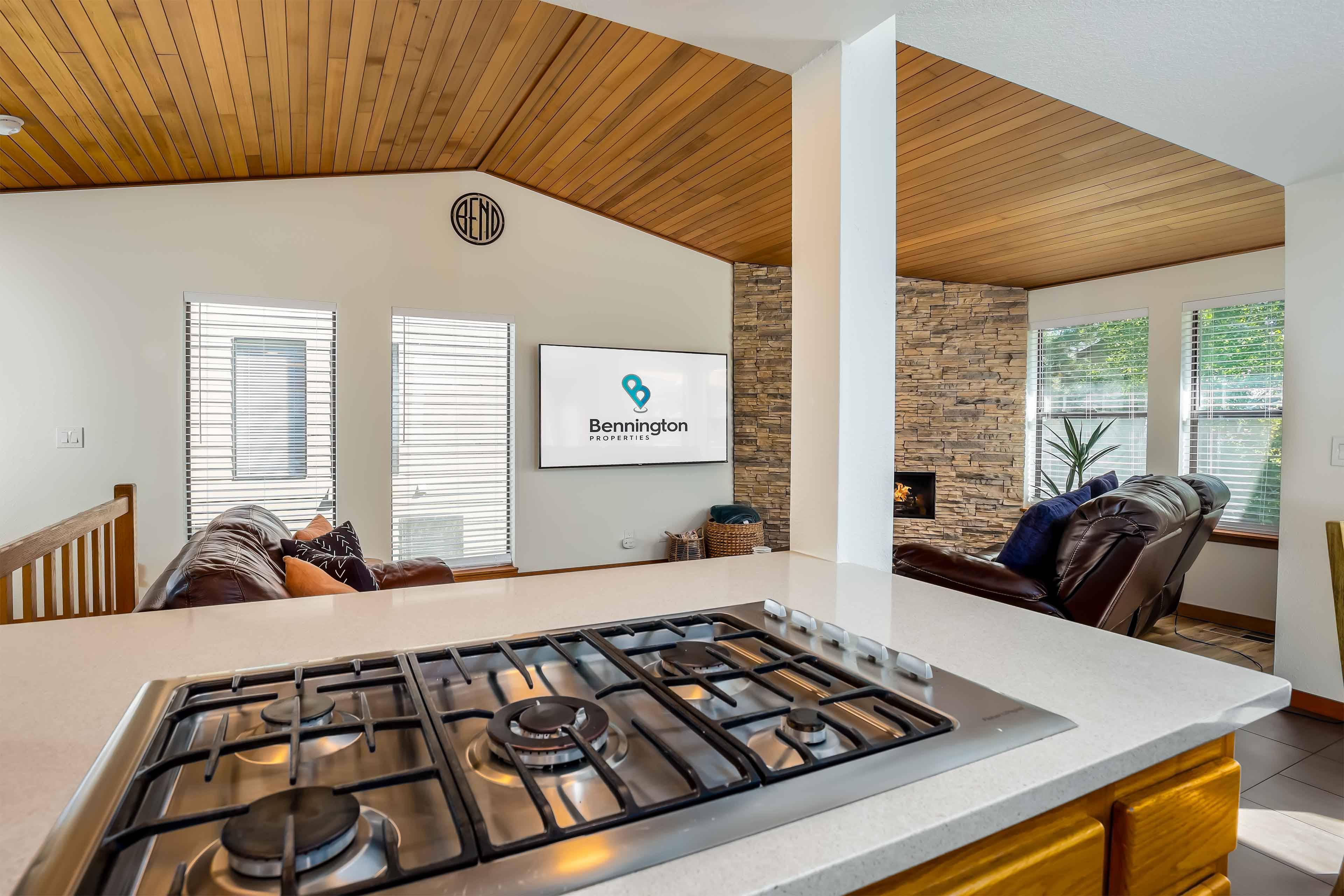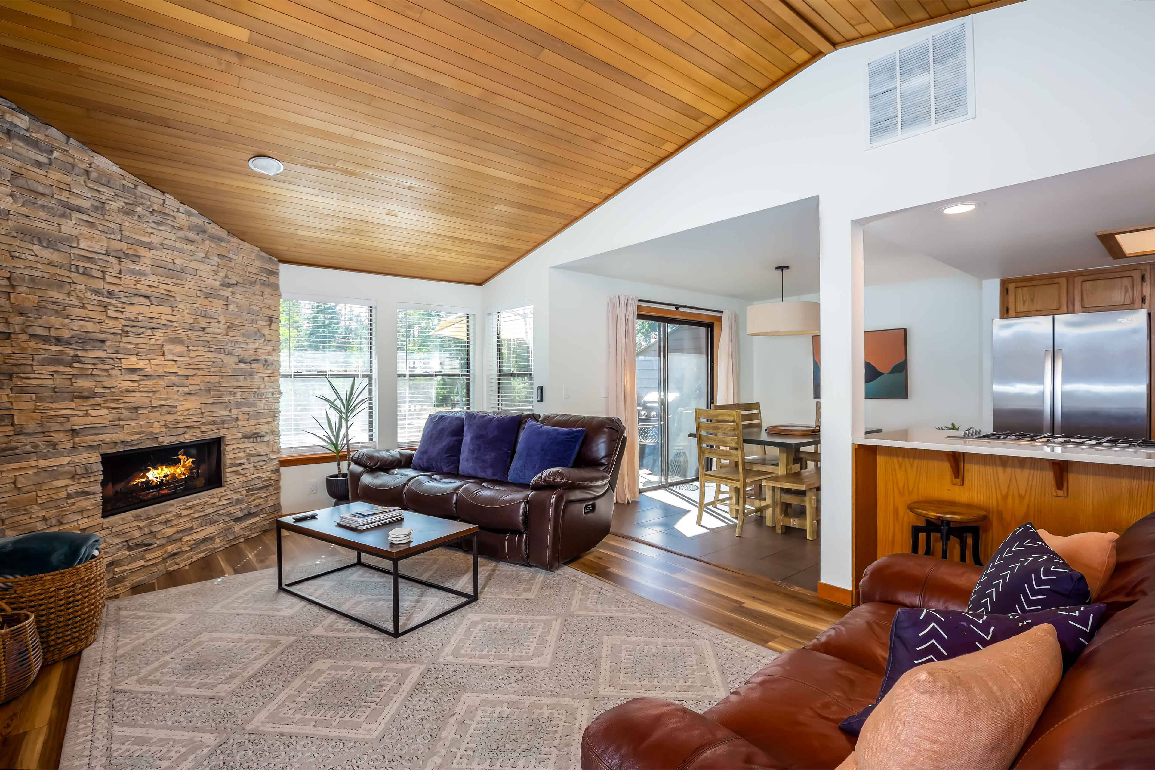 A reverse living layout brings you upstairs for the main level. This space holds cozy couches, new gas fireplace, huge Smart TV (for streaming all of your favorite apps), vaulted ceilings and tons of light. You'll find everything you need in the fully furnished kitchen, making meal prep a breeze. The adjacent dining area means your friends and family aren't too far away. Recent renovations include interior paint, floors, blinds, and bathroom vanities!