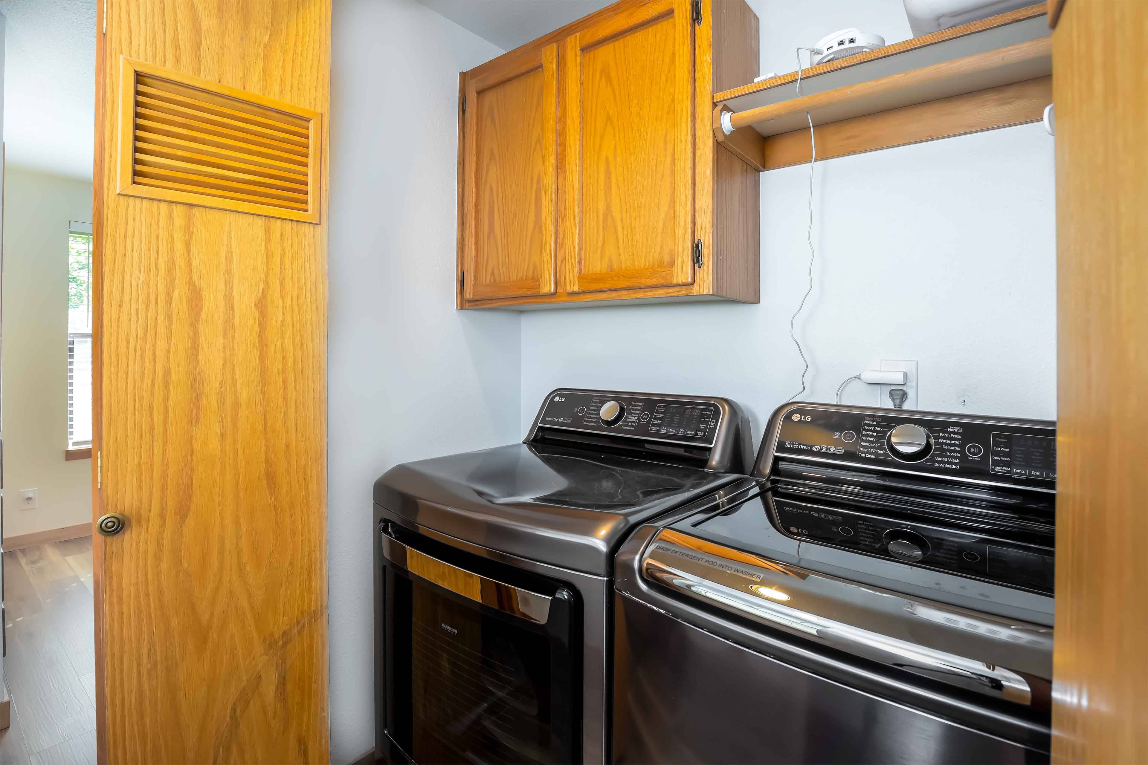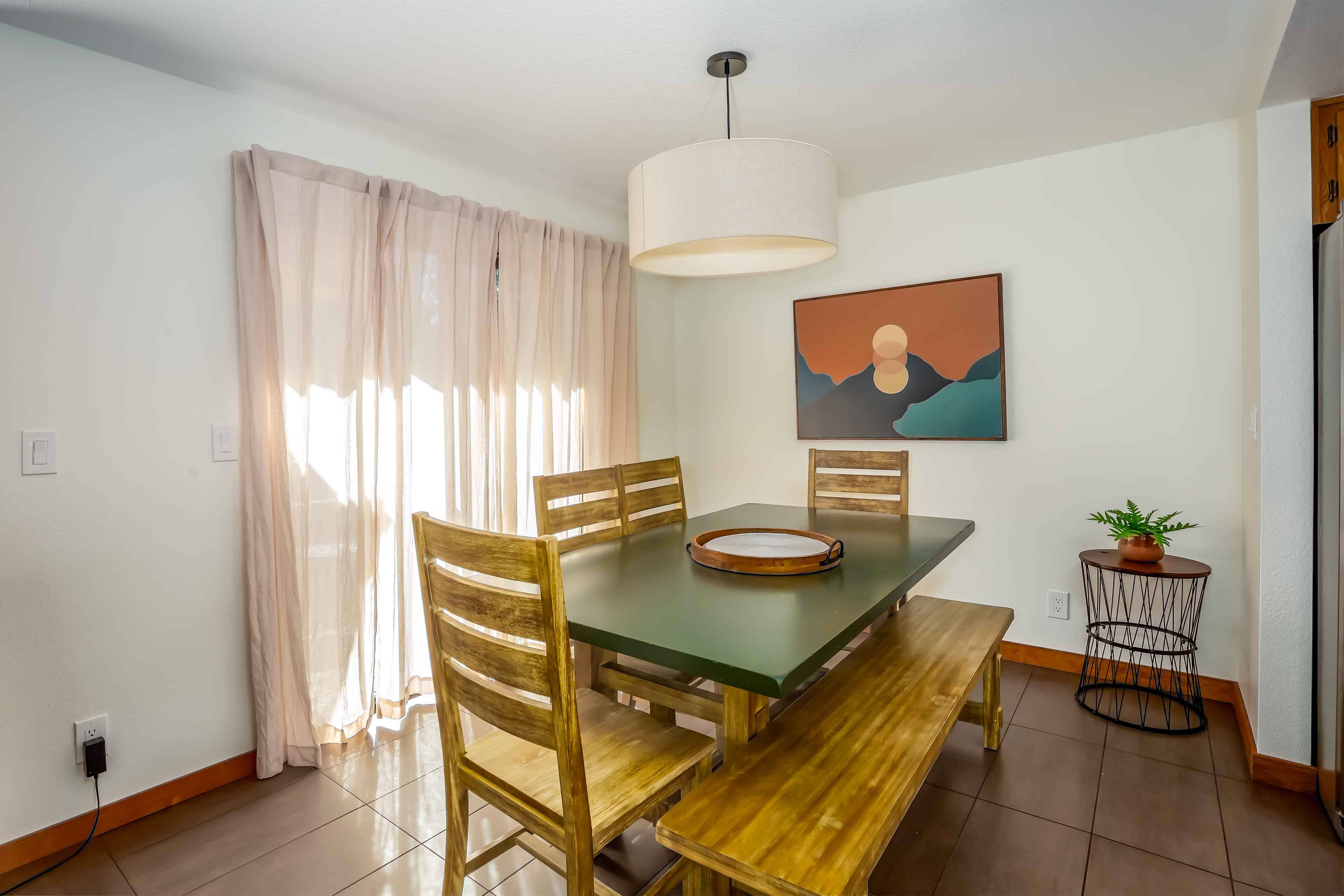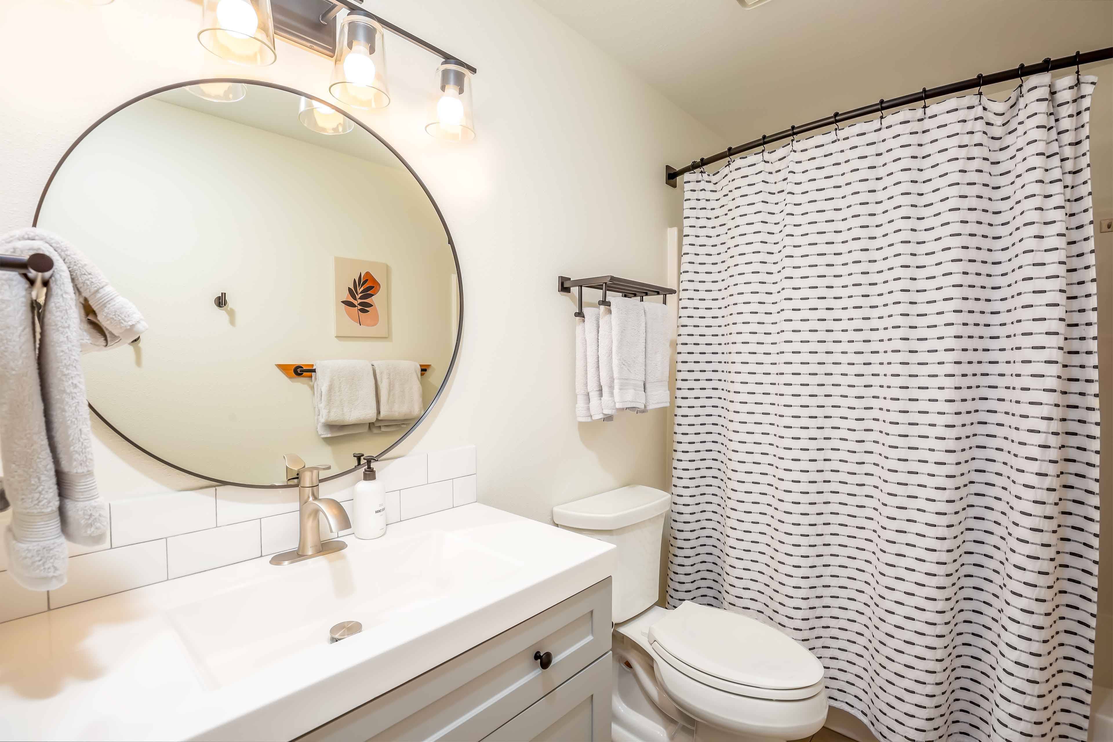 A reverse living layout brings you upstairs for the main level. This space holds cozy couches, new gas fireplace, huge Smart TV (for streaming all of your favorite apps), vaulted ceilings and tons of light. You'll find everything you need in the fully furnished kitchen, making meal prep a breeze. The adjacent dining area means your friends and family aren't too far away. Recent renovations include interior paint, floors, blinds, and bathroom vanities!