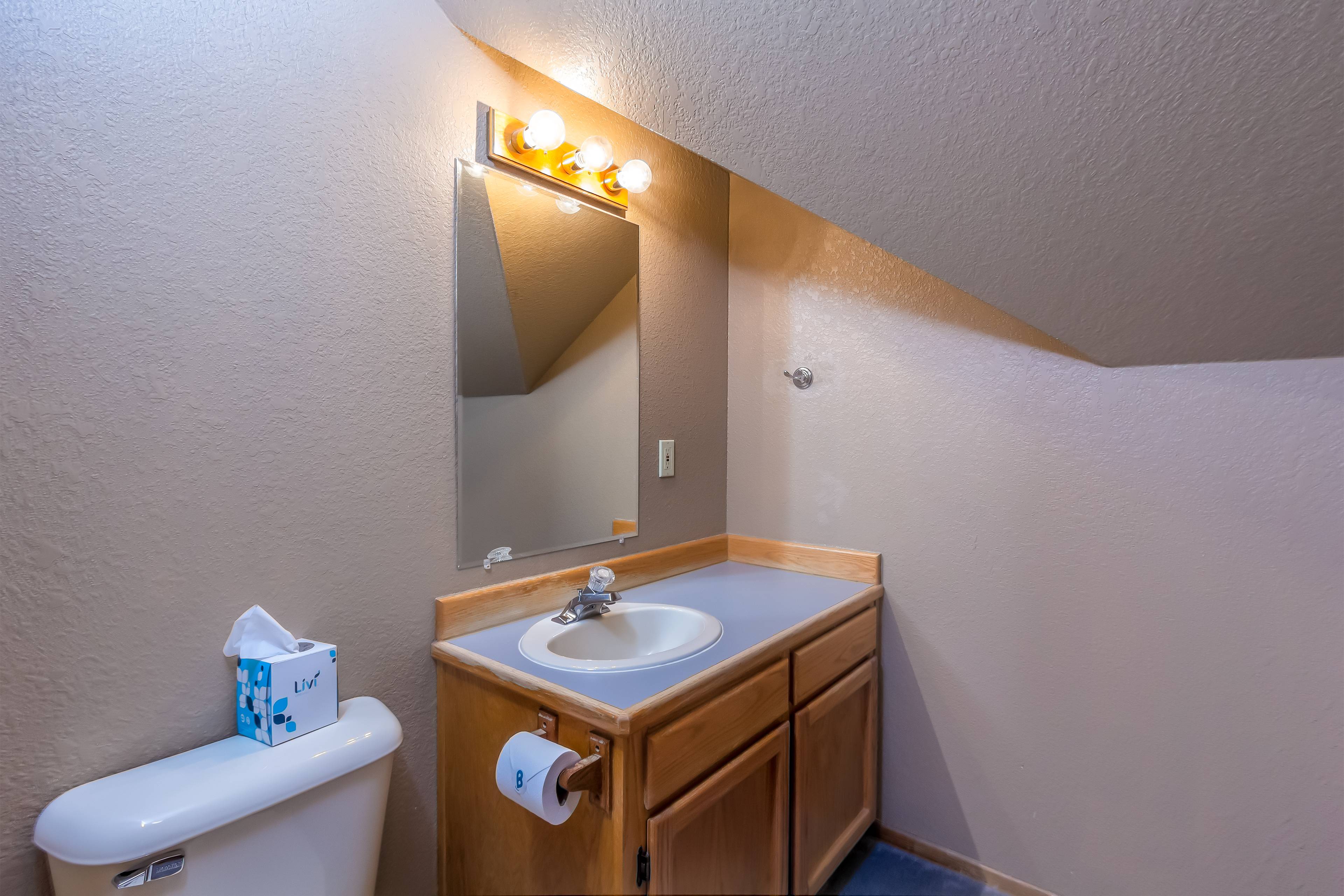 Upstairs you'll find 3 more bedrooms including a second king bedroom with private half bathroom, a queen bedroom, and a bedroom with a pyramid bunk plus a twin bed. A full bathroom with shower and tub is shared for these guests.