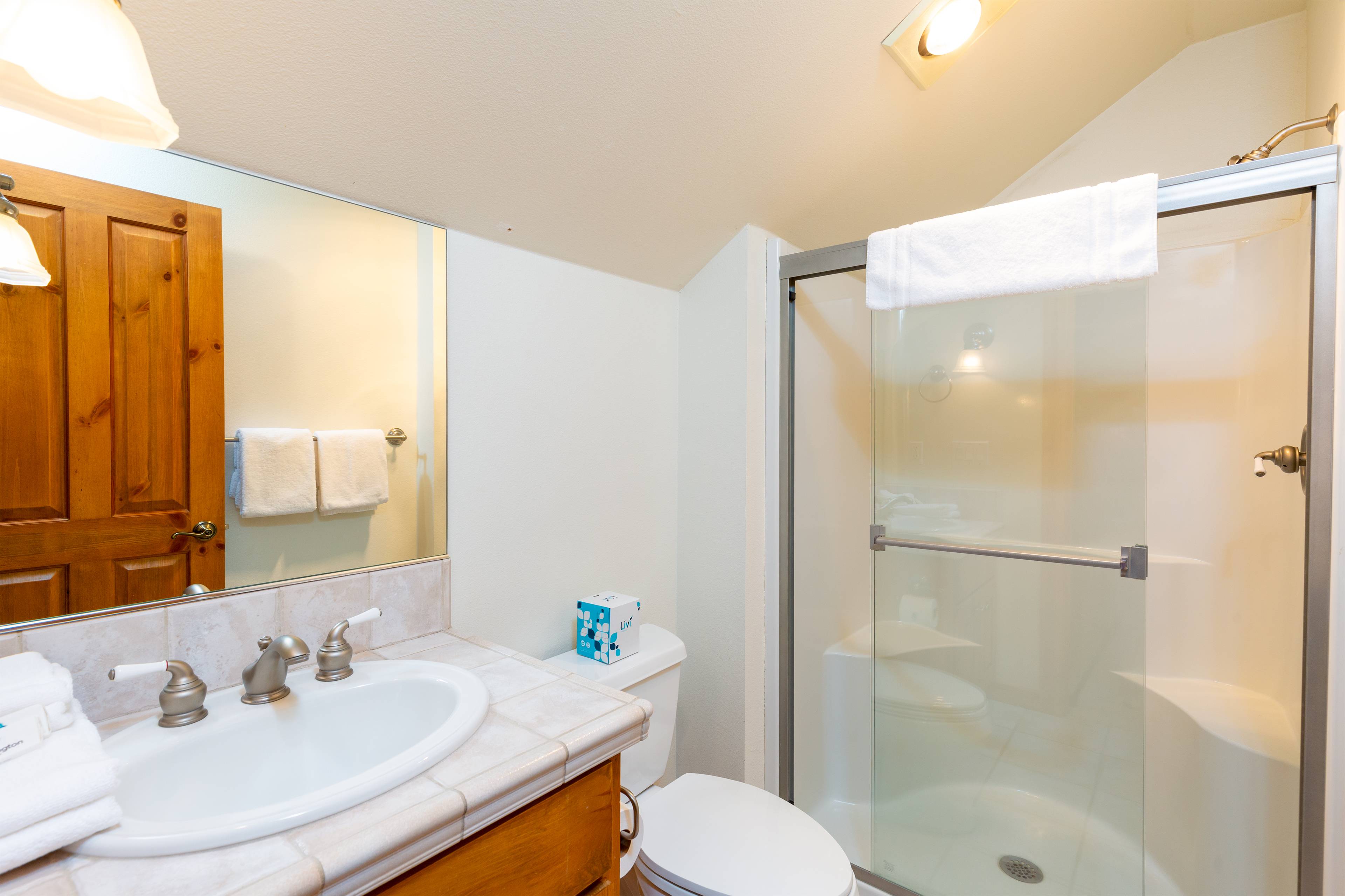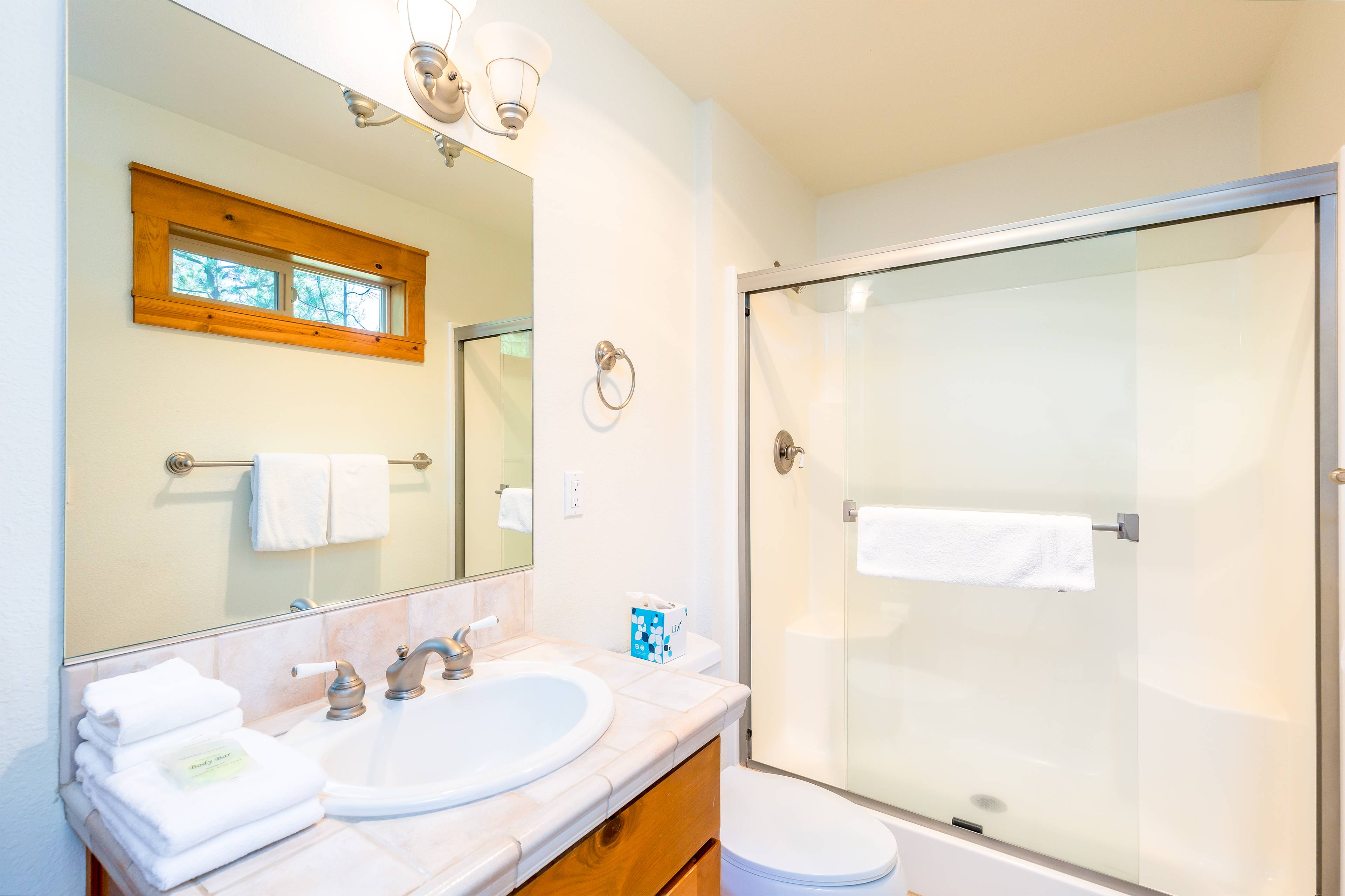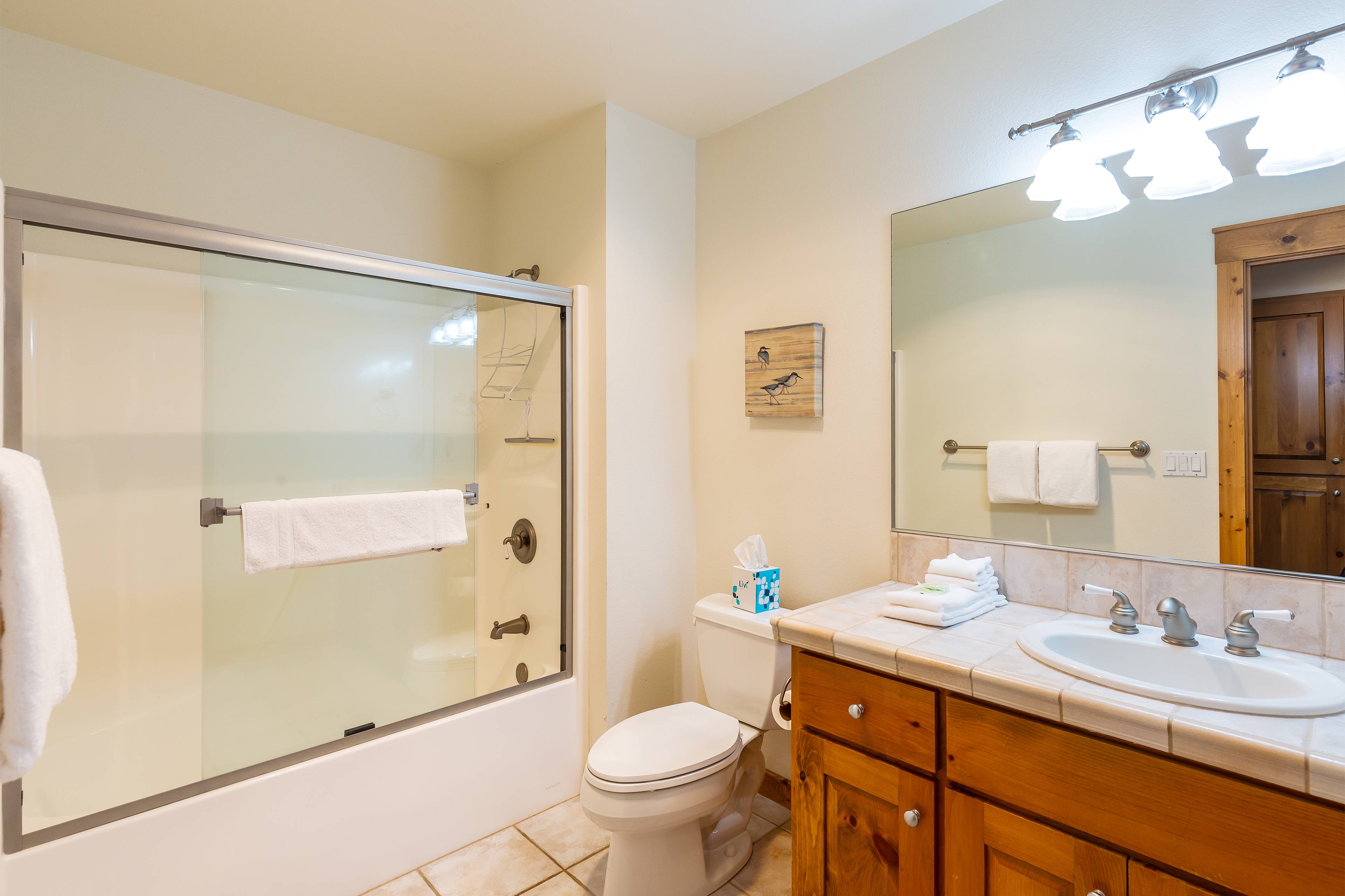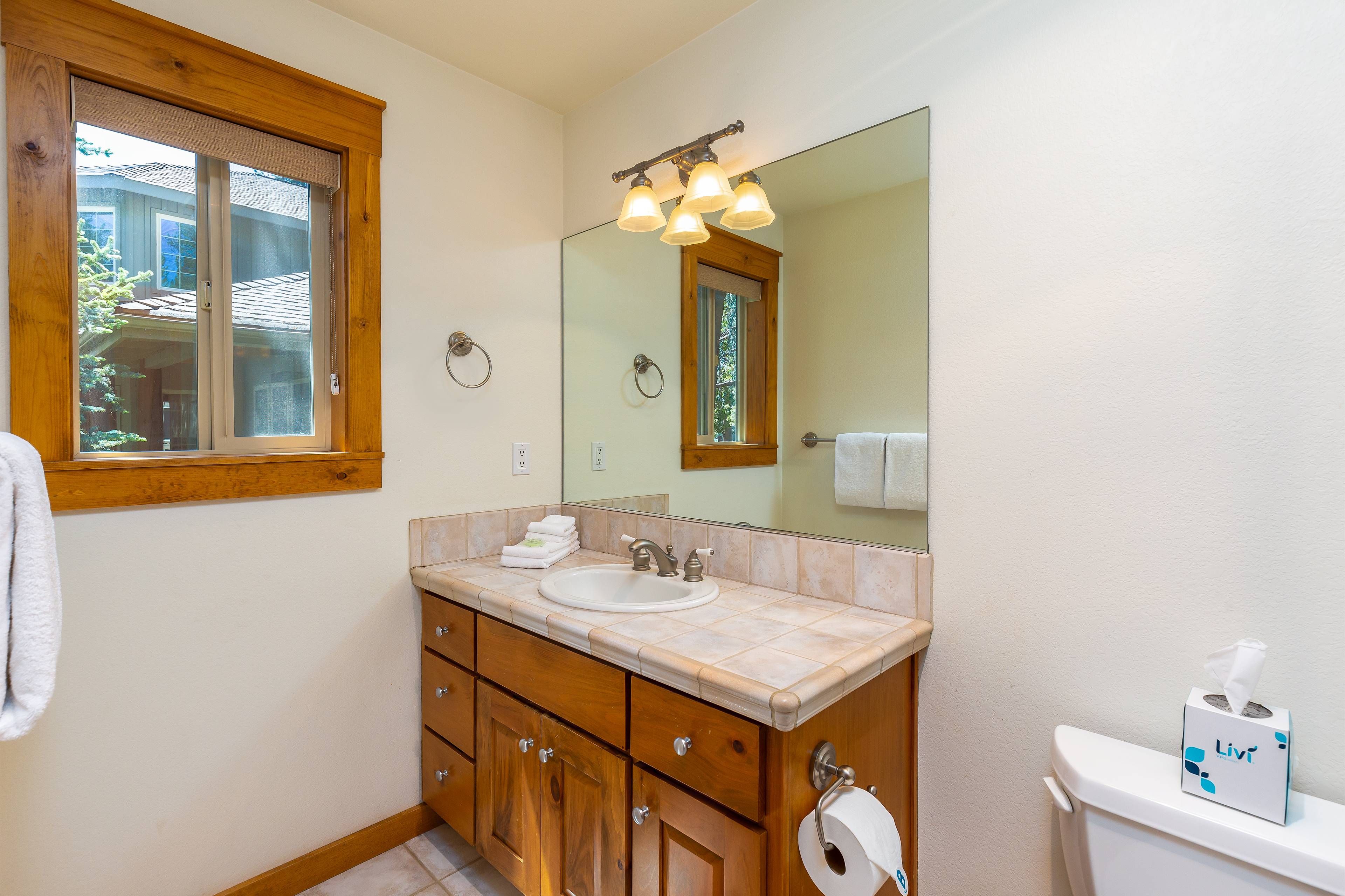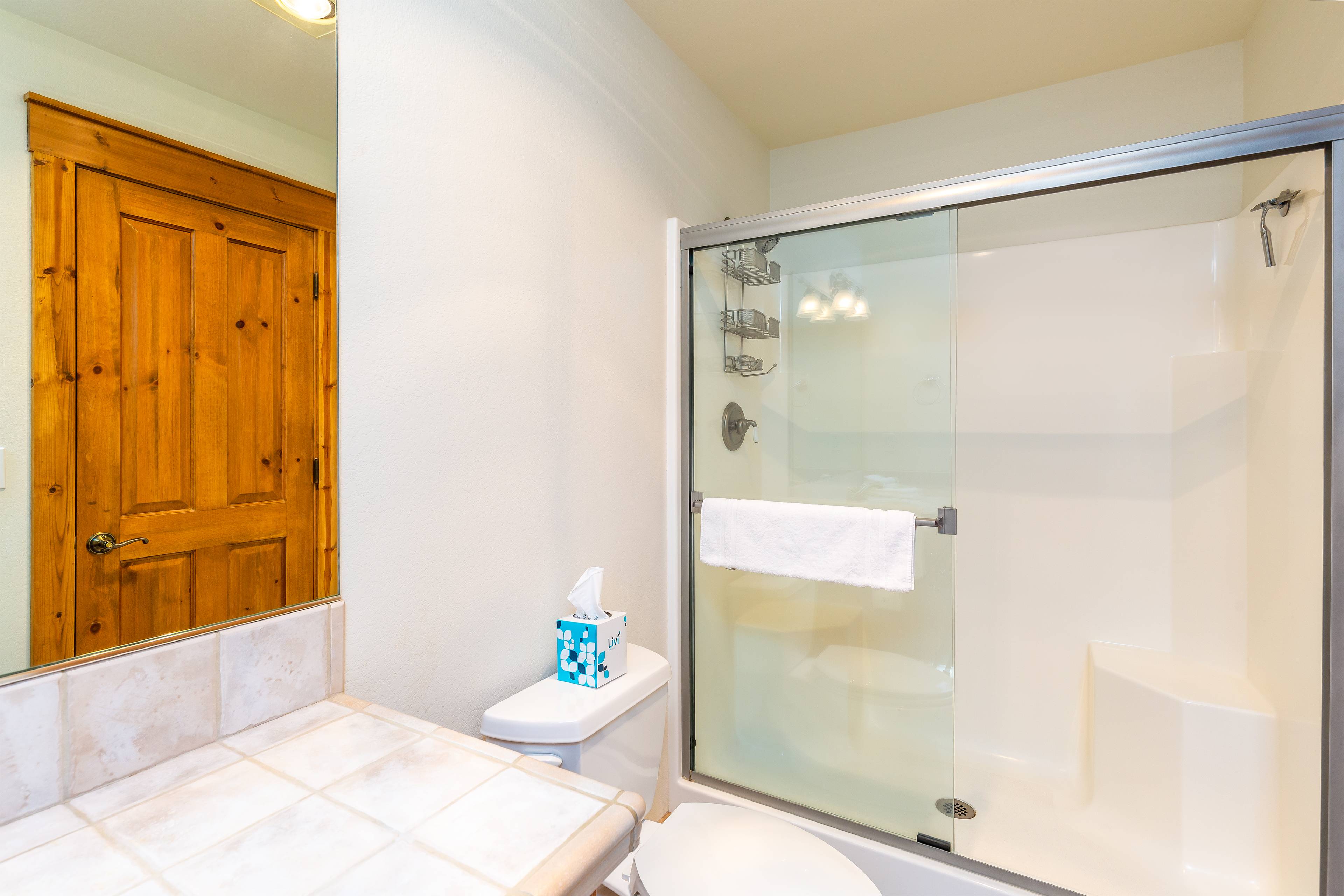 On the main level you'll find four bedrooms. The primary bedroom features a king bed, private bathroom, cable TV and a DVD player. Bedroom two and three also have king beds and private bathrooms. The fourth bedroom has a queen bed. There is a full guest bathroom on this level.