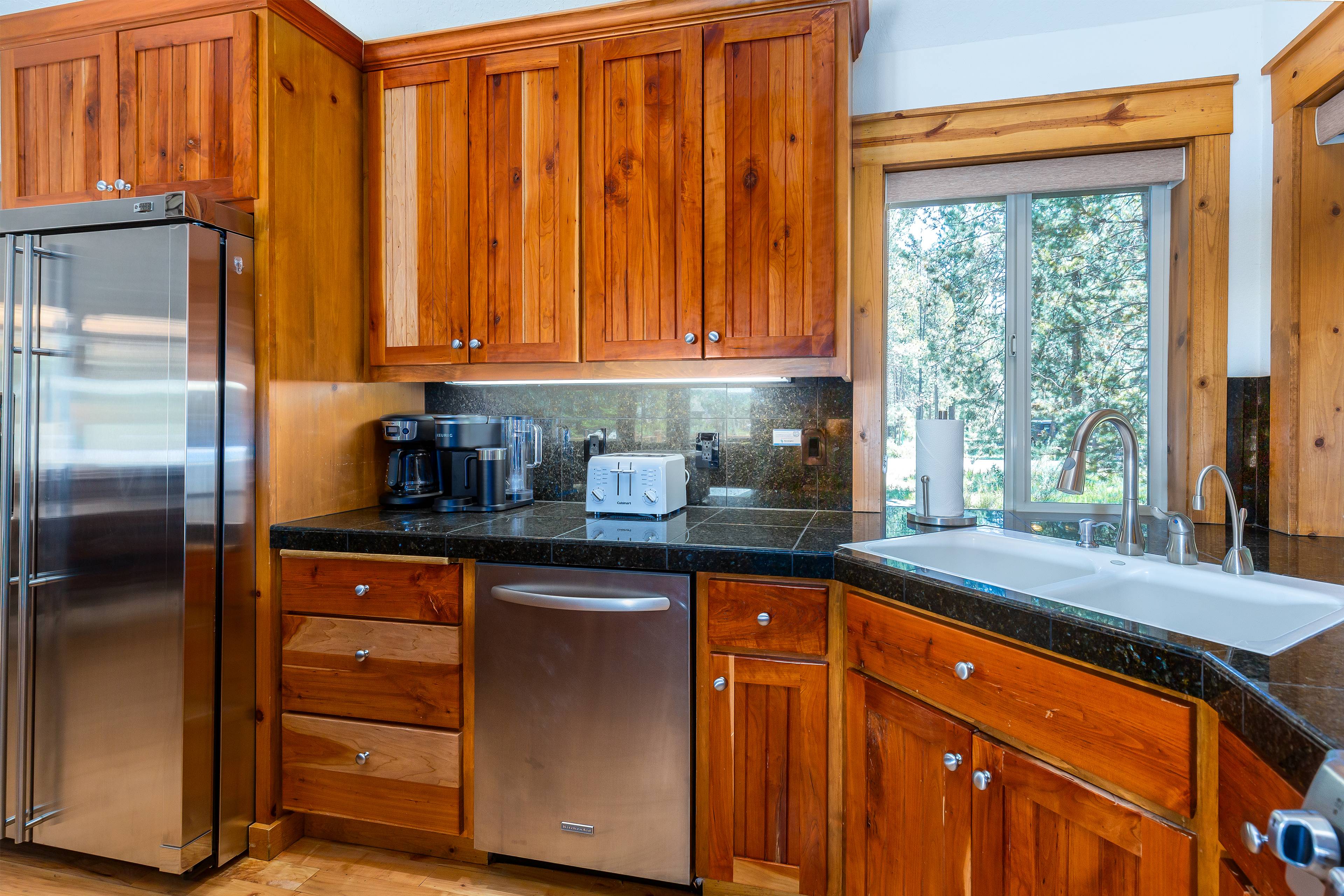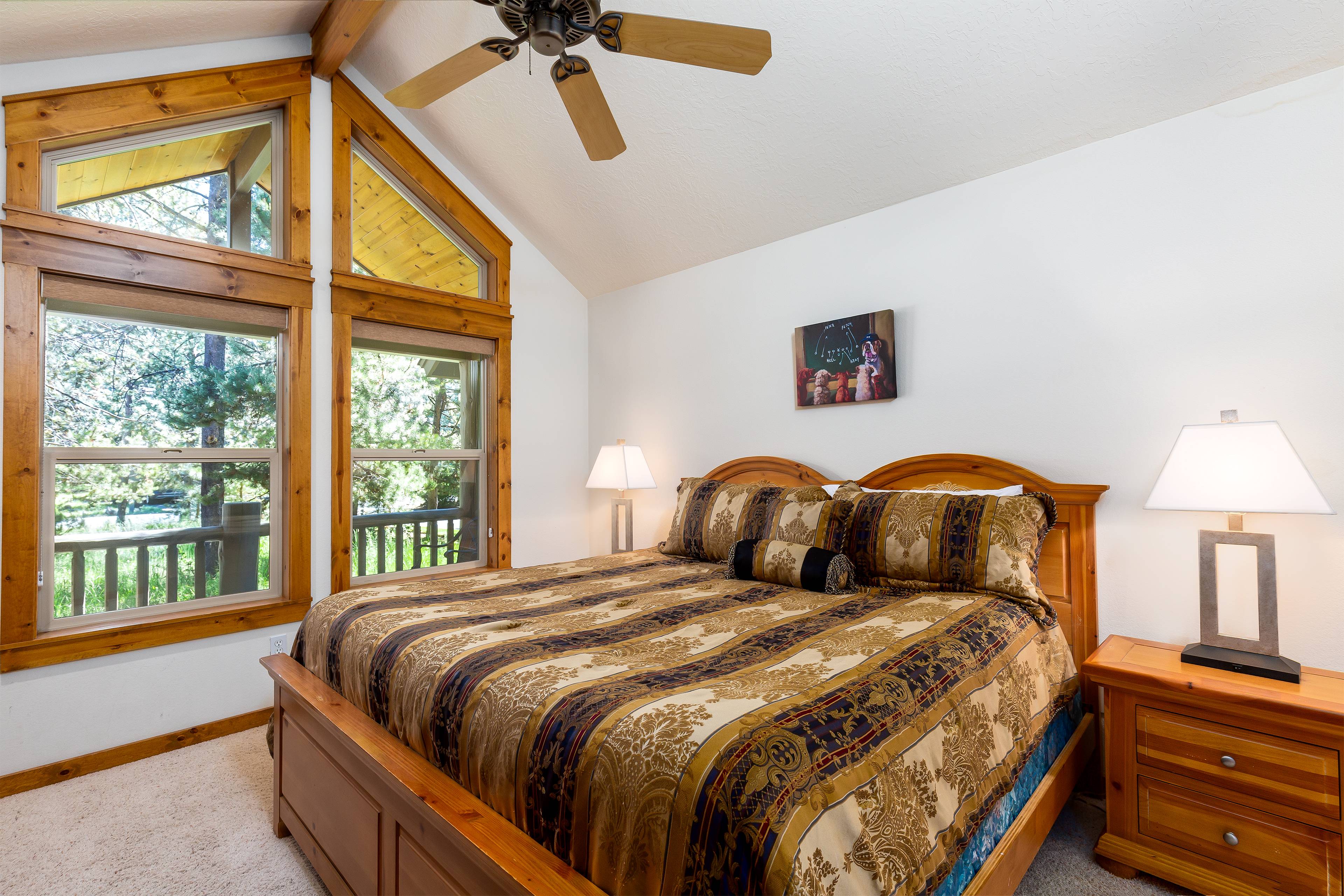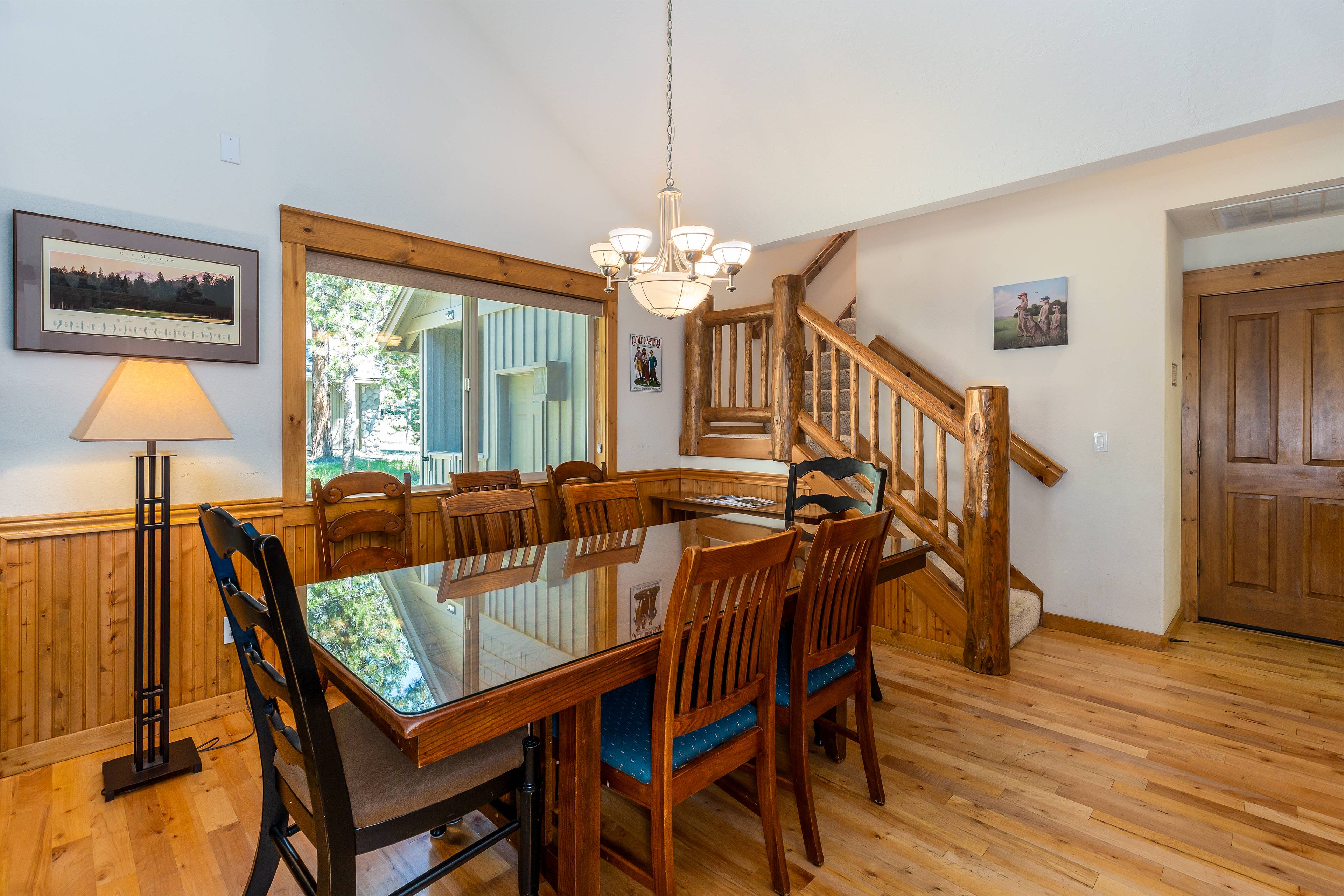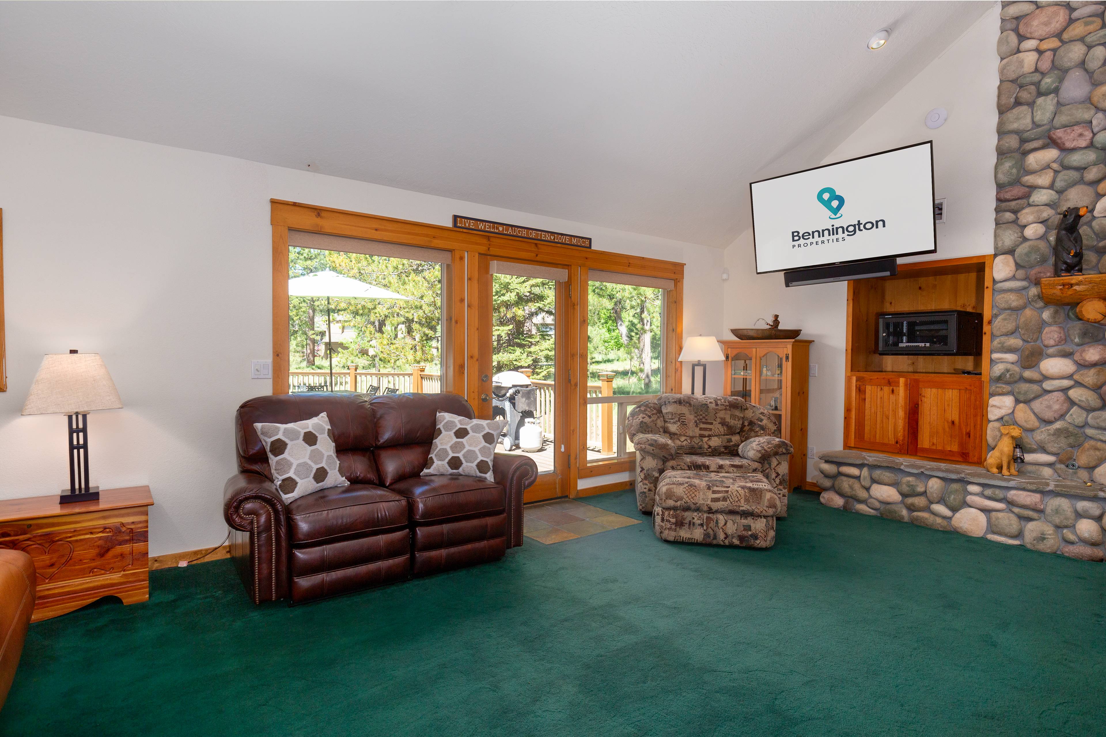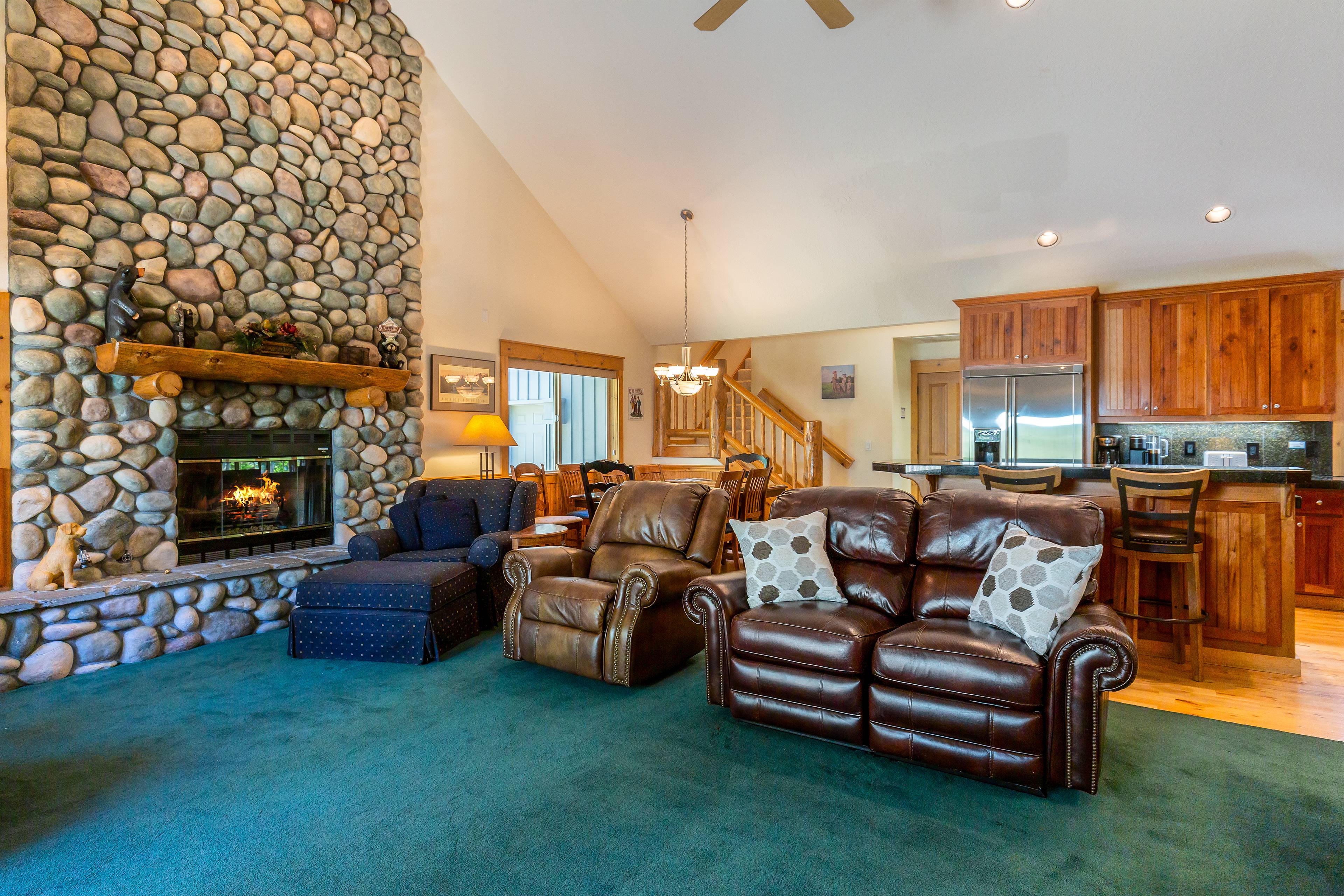 Open and welcoming is what you'll notice as you enter 9 Gosling Lane. The great room features a vaulted ceiling, floor to ceiling river rock gas fireplace and ample cozy seating. Enjoy the big game or your favorite movie on the Smart TV, DVD player and cable service.