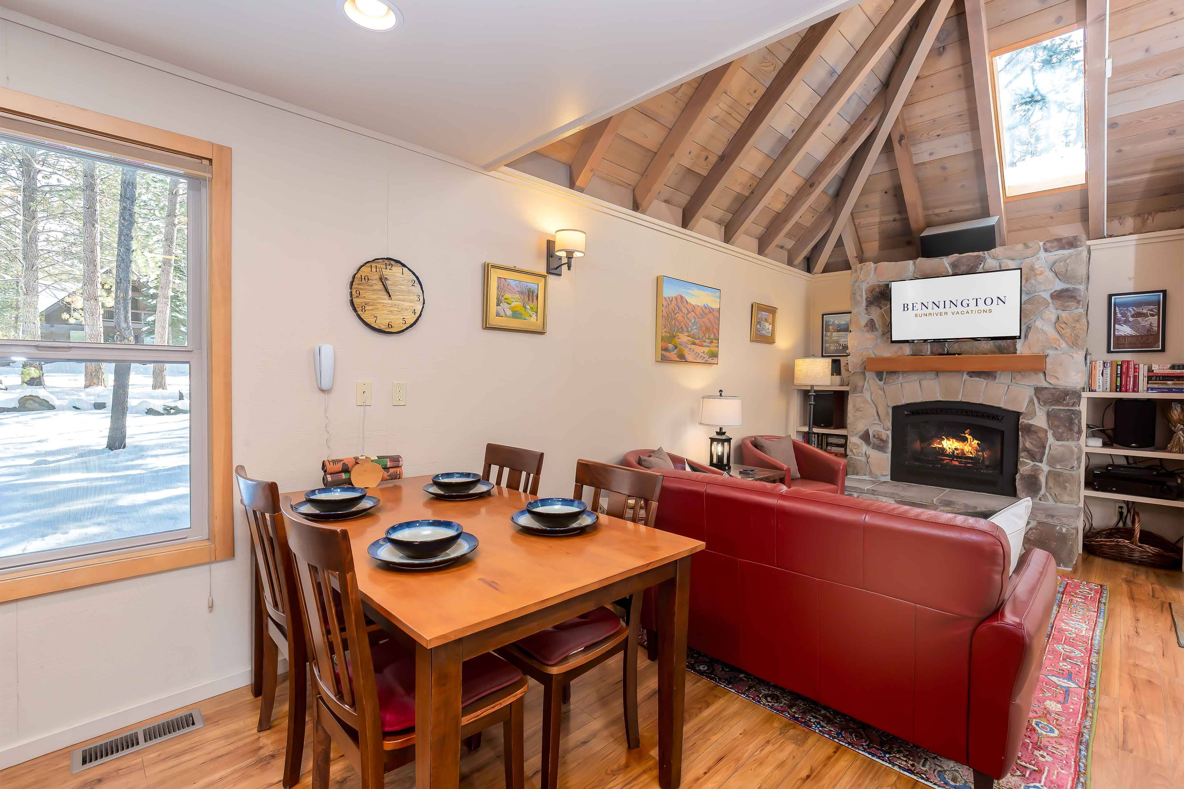 A true Sunriver cabin with updates including A/C, an enclosed and private deck, new carpet, bedding, and lighting. Right across from the Village at Sunriver and all shops, restaurants and grocery store, yet very private. Whether planning a romantic getaway or a family retreat, this house is an ideal size to keep things cozy. Up to 5 guests sleep comfortably in this 1 bedroom with loft, 1.5 bath home.