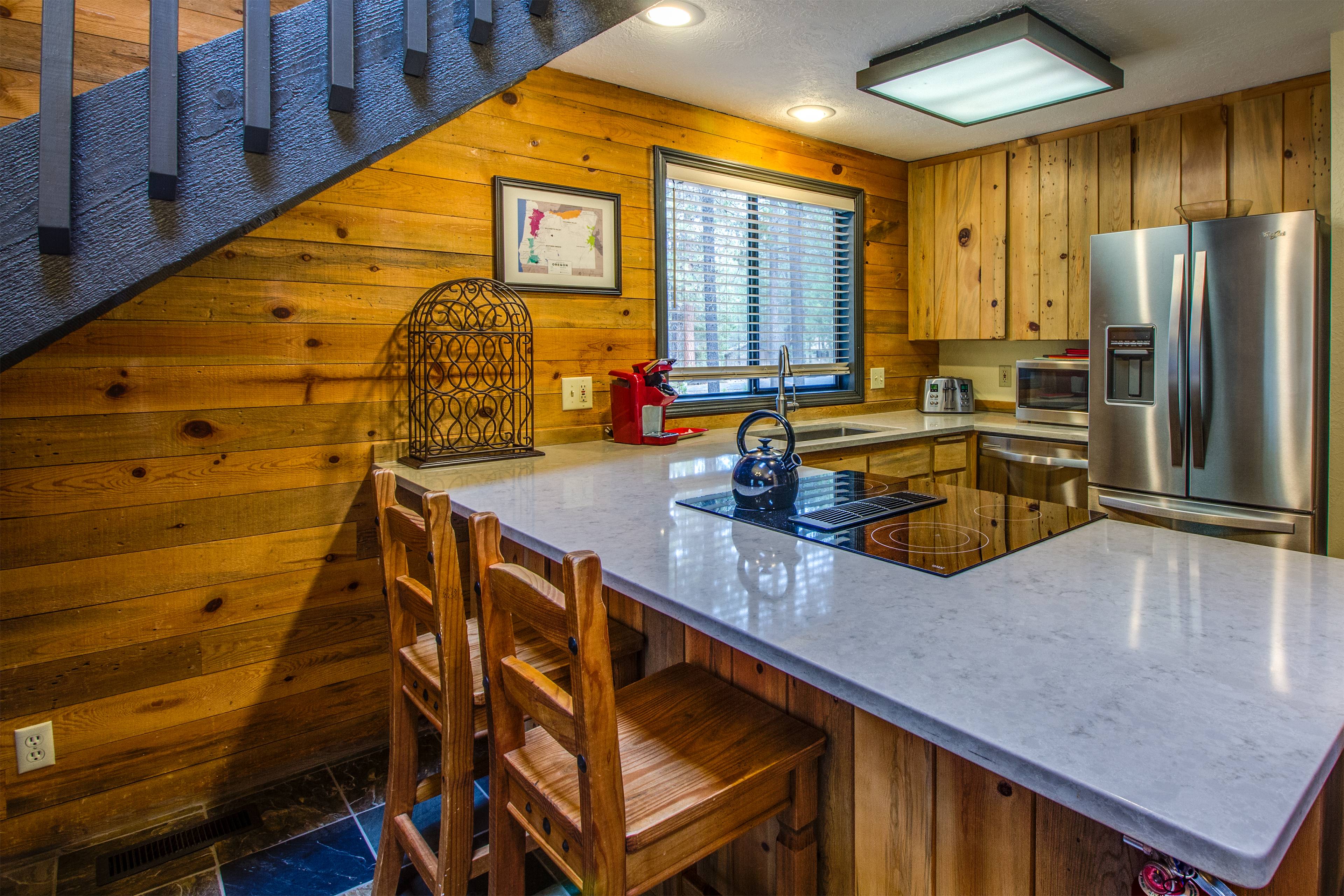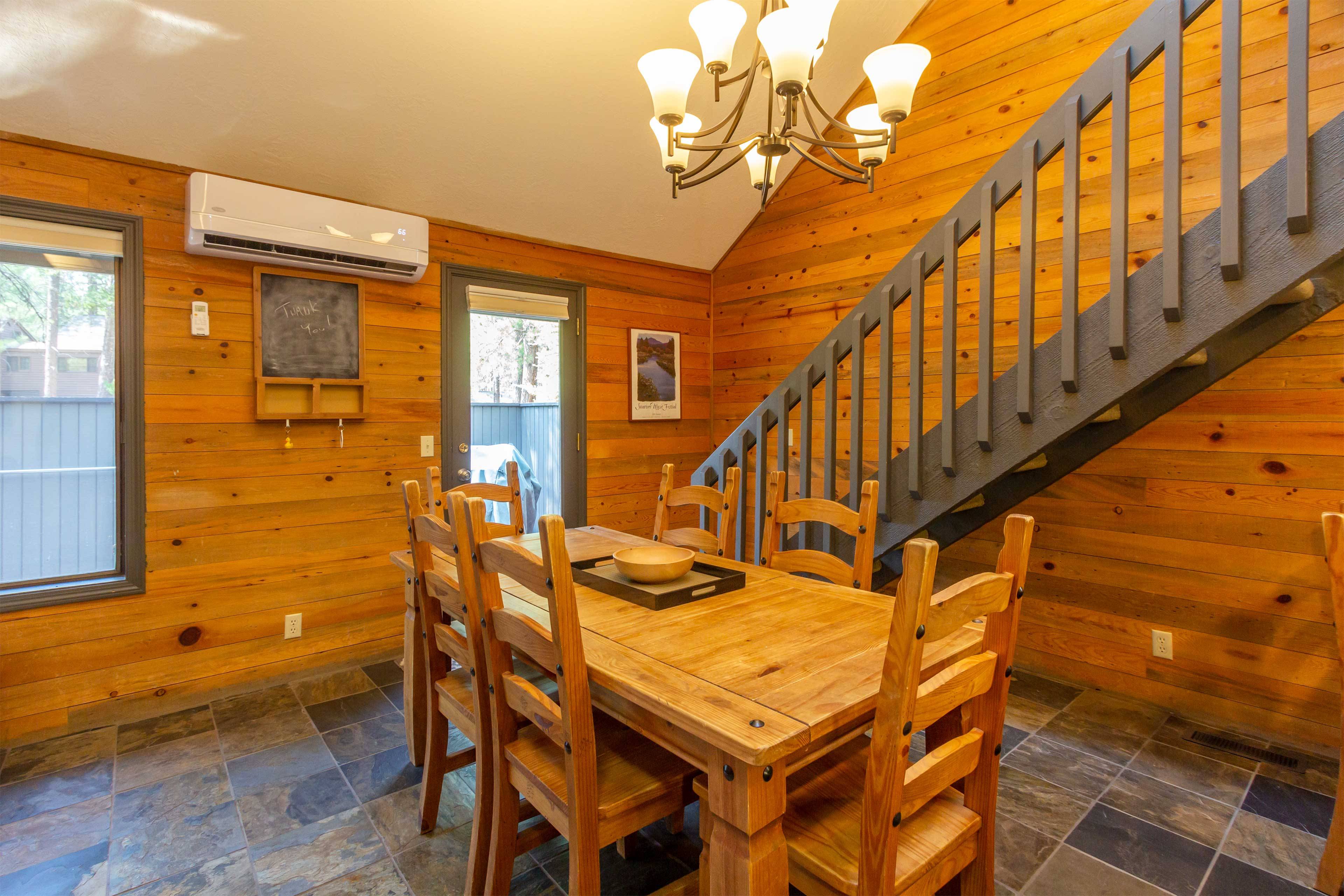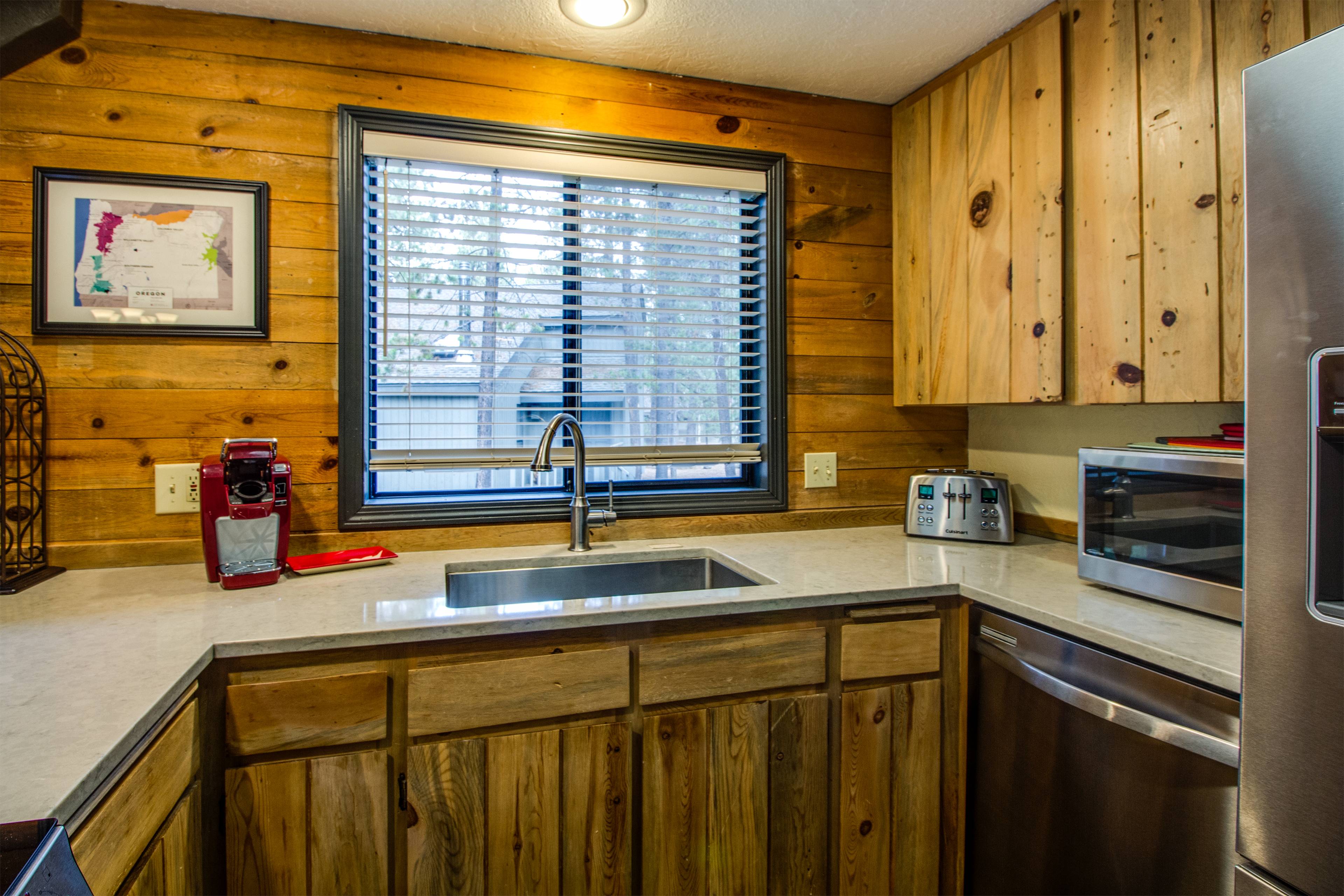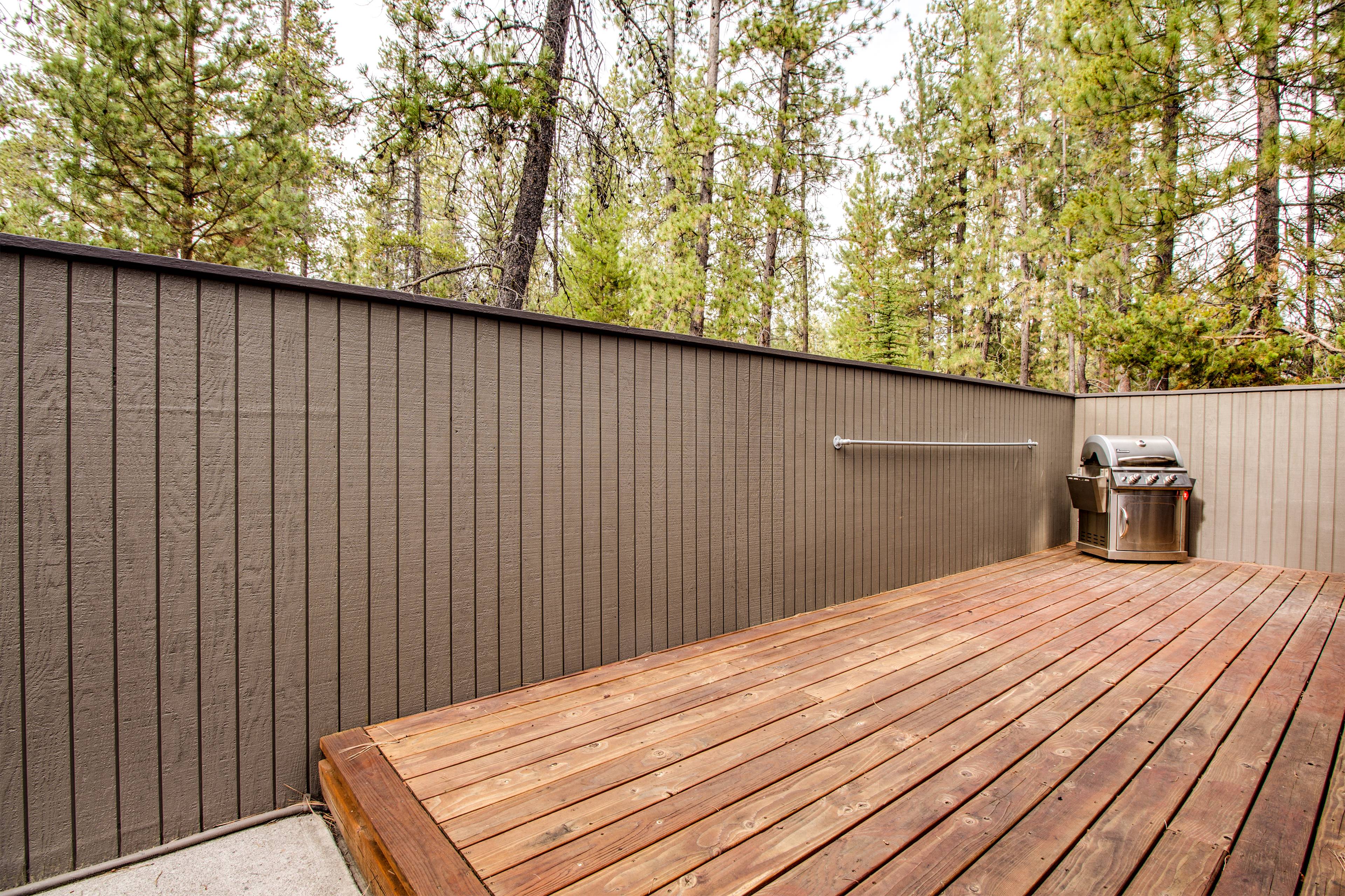 This conveniently located home is a great getaway in the forest. Downstairs you will find a queen bedroom with beautiful wood frame bed, large closet, and flat screen TV. Across the hall is the downstairs full bathroom with tub. The kitchen has all the necessities, including a Keurig coffee maker [bring your own pods] and bar seating. Adjacent is the dining room with seating for 6. In the living room you will find a large sectional, flat screen TV, and gas fireplace to keep you warm on those chilly Sunriver nights, and central A/C to keep you cool during the warm summer days. The back door leads out to the fully enclosed patio with BBQ and hot tub, a perfect private spot for stargazing.