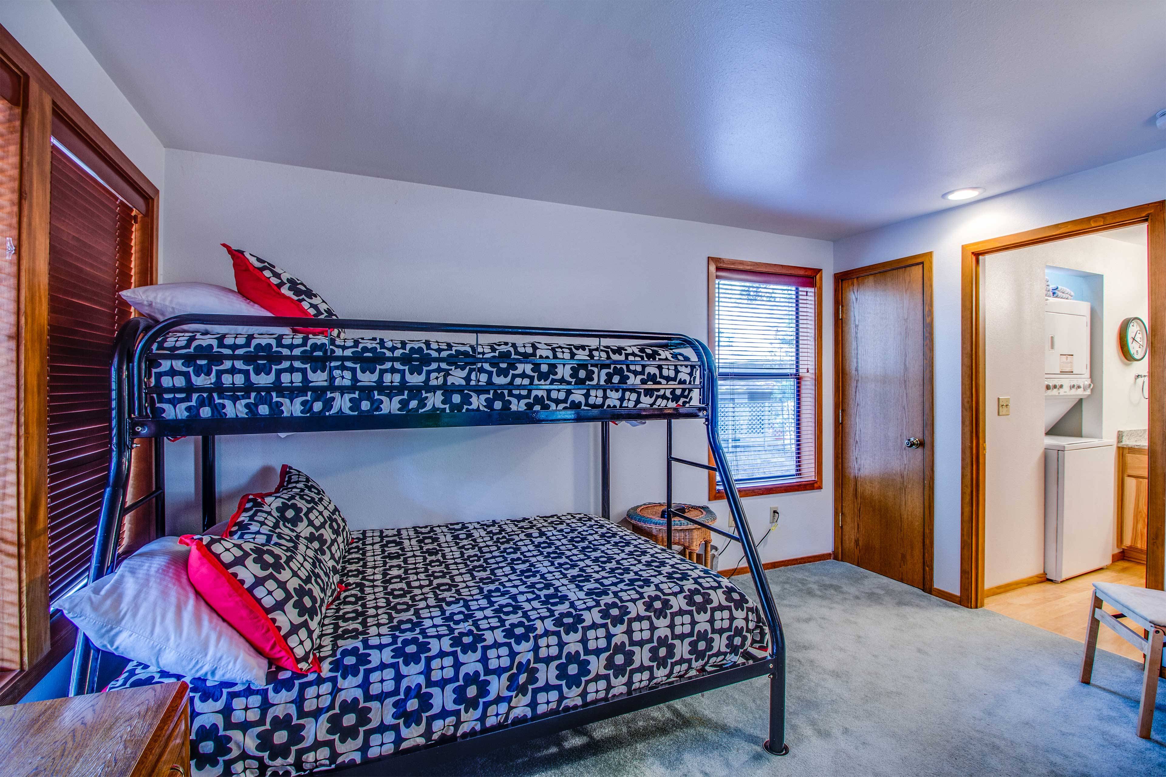 On the main level, you'll find an ensuite queen bedroom with a plush queen bed, ideal for a restful night's sleep. Downstairs, you'll discover three additional bedrooms: a bedroom with a cozy full bed, a twin bunk bed room for the kids, and a unique pyramid bunk bed room that sleeps three.