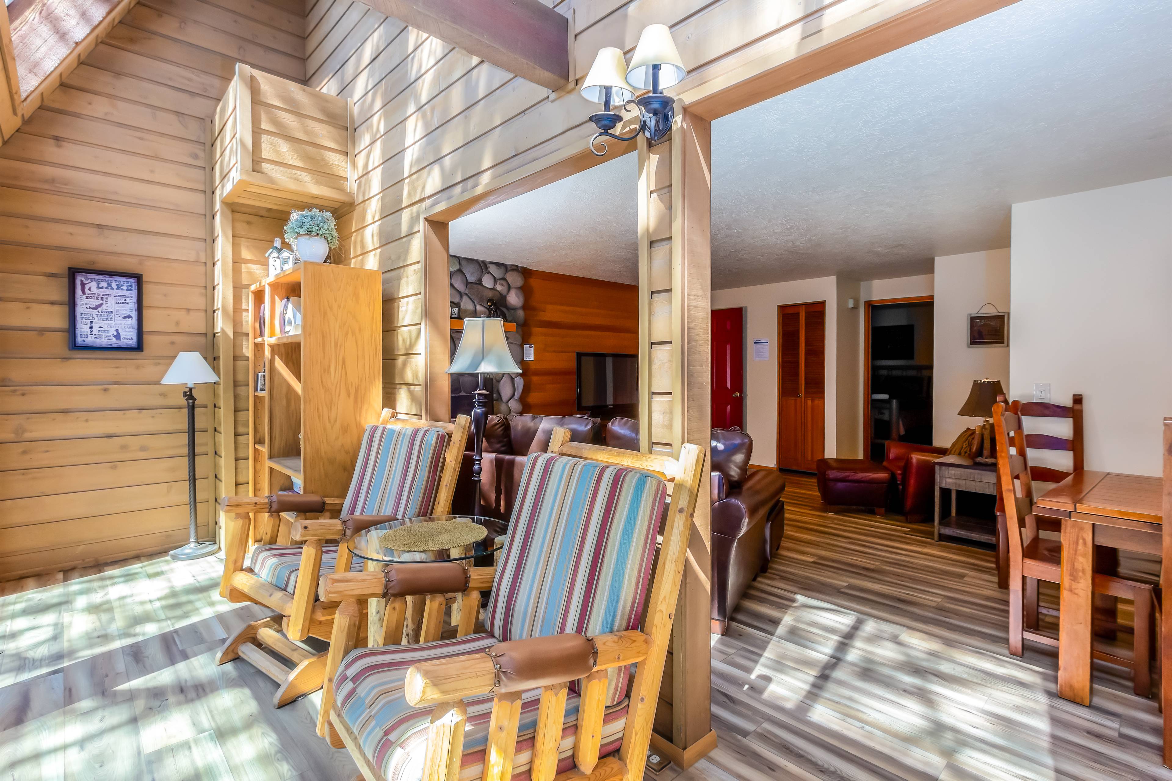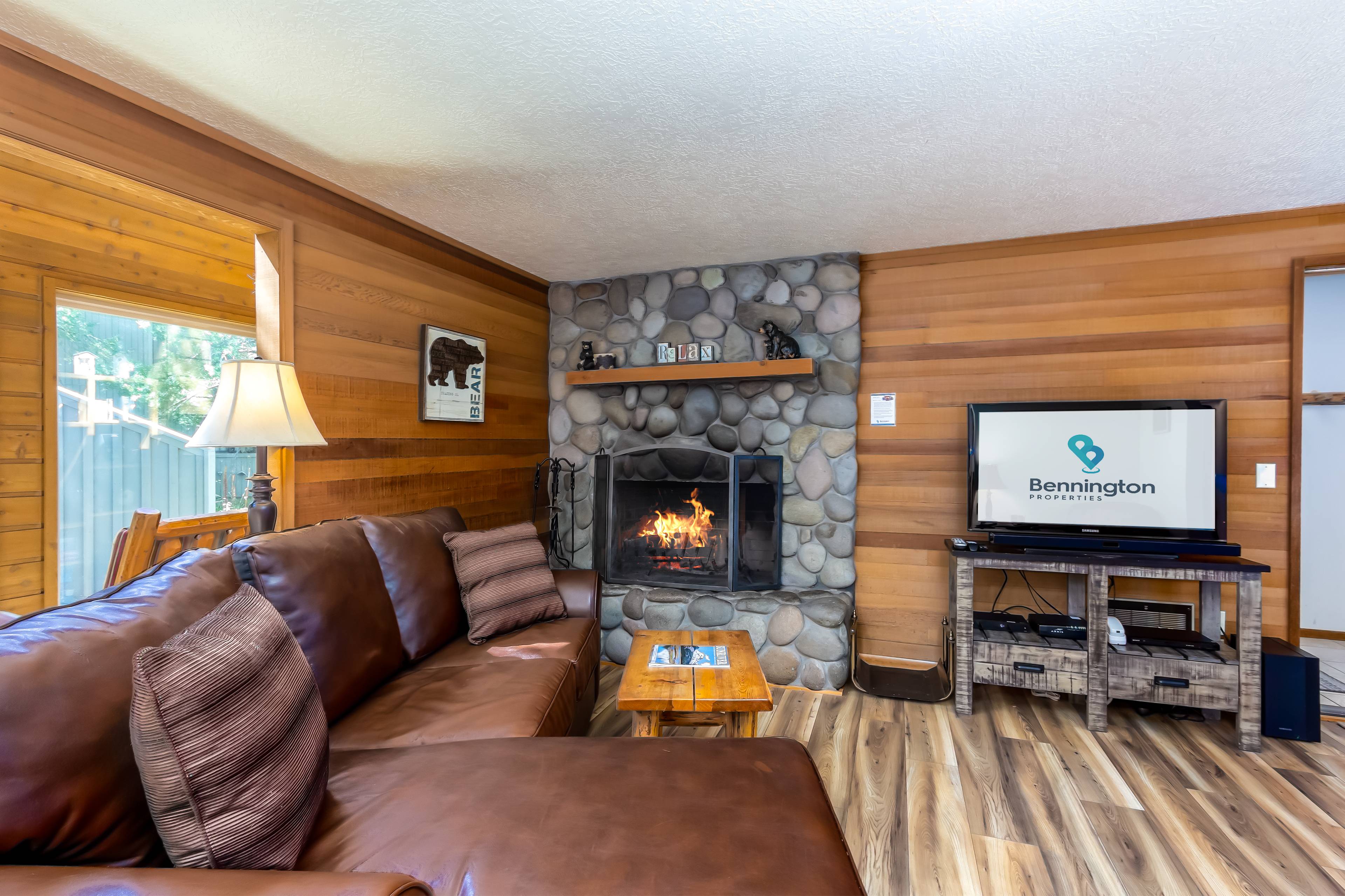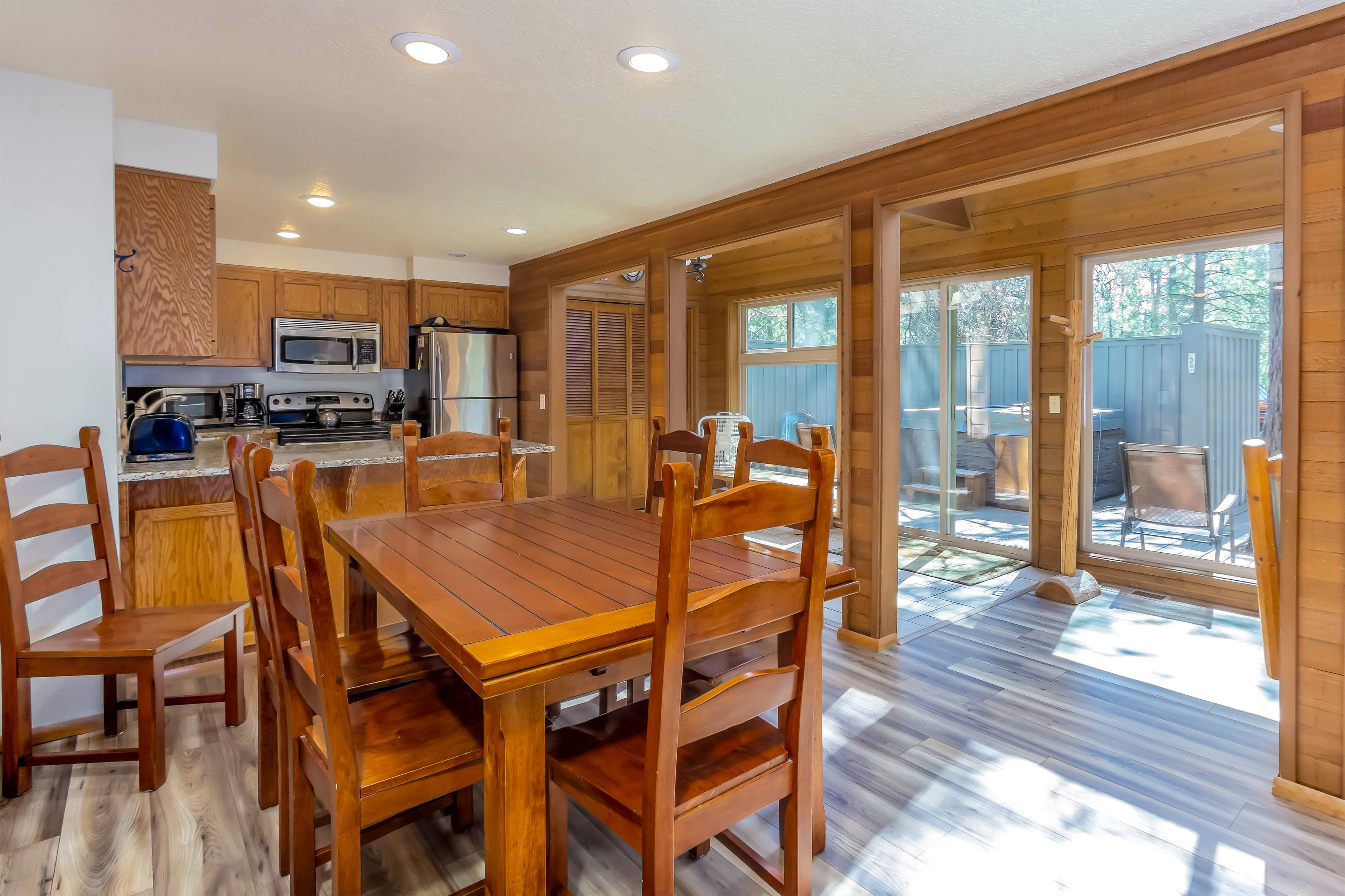 Relax in the living room, where a cozy wood fireplace adds warmth and charm. The home also features a hot tub, perfect for unwinding after a day of outdoor activities, a ping pong table and a pool table, plus bikes to adventure out on the miles of bike paths winding through Sunriver. High-speed Wi-Fi ensures you stay connected throughout your stay.