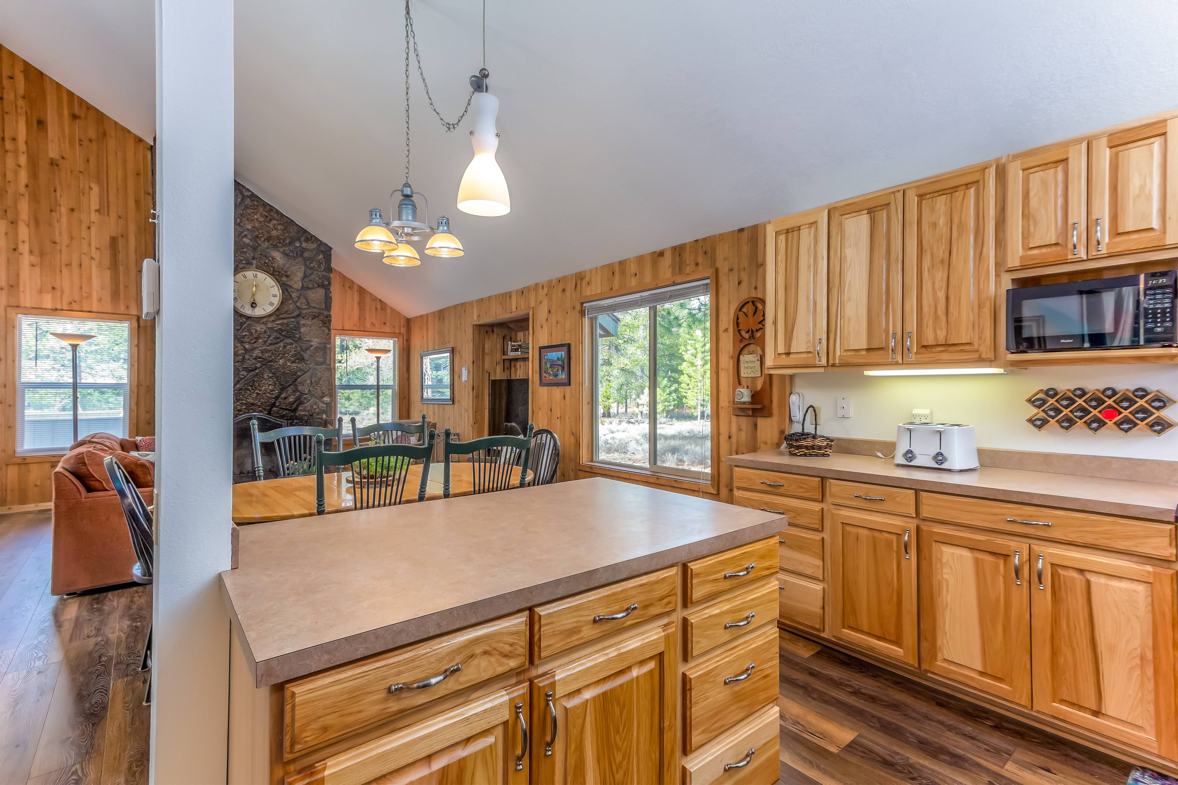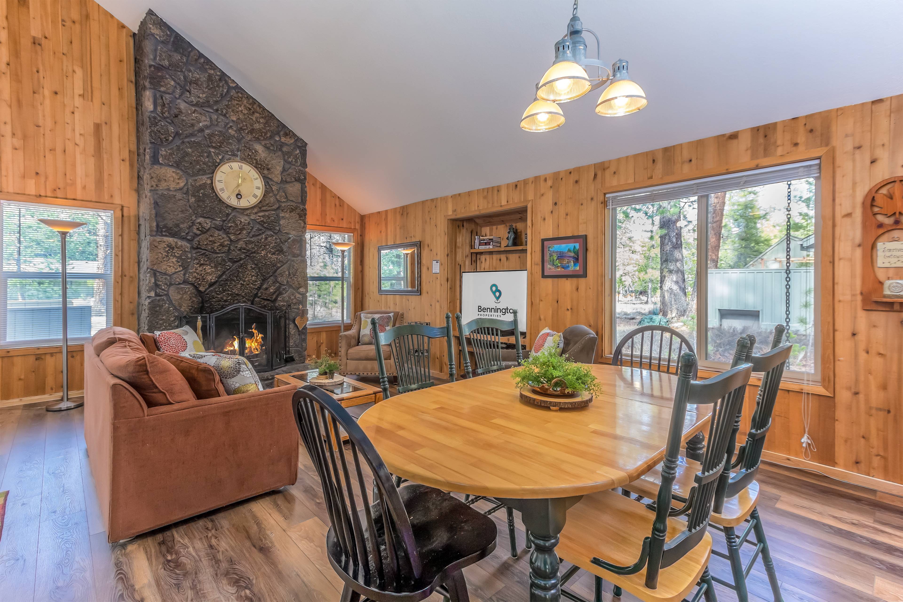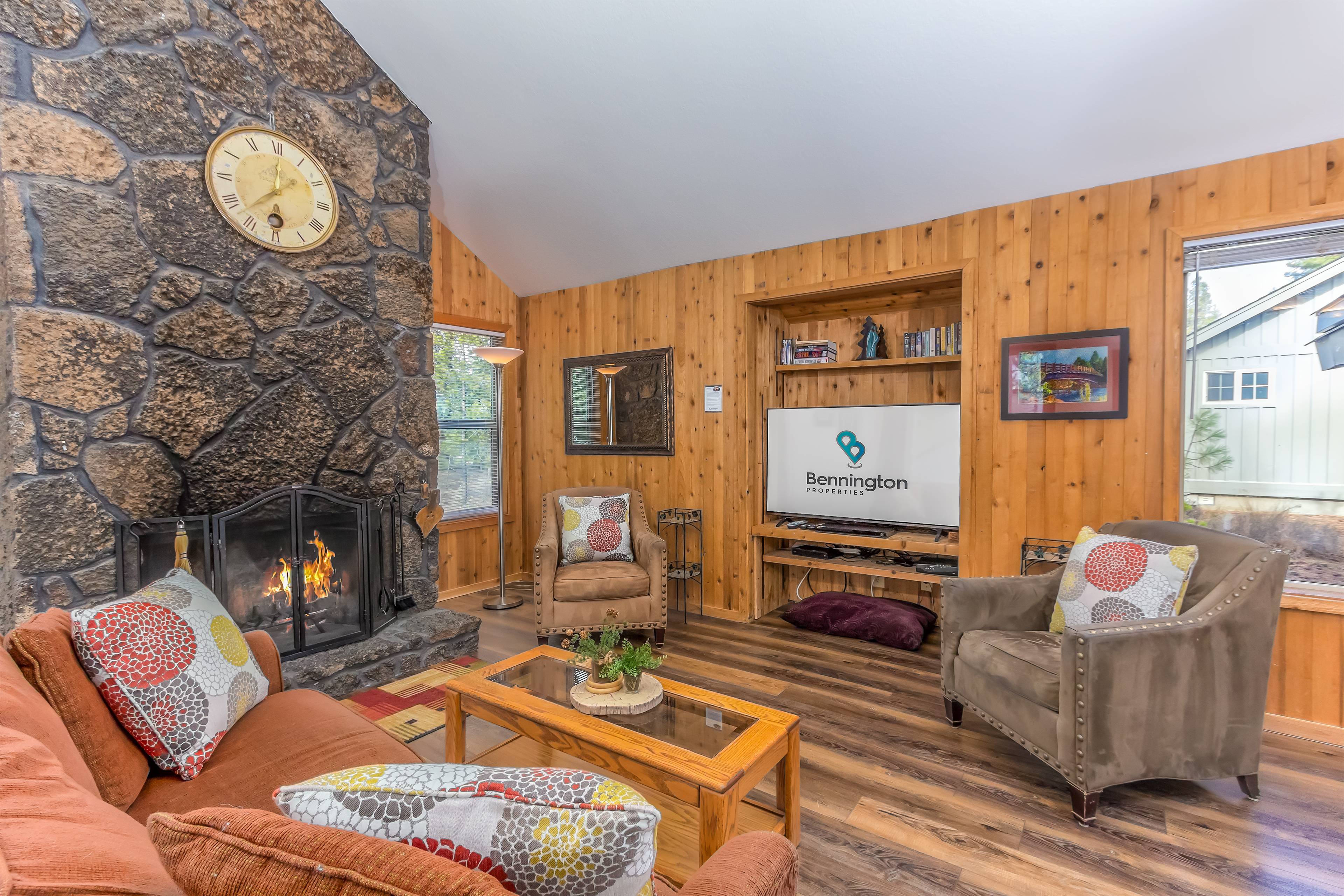 From the moment you step inside, you’ll feel that timeless cabin charm that makes Sunriver so special. The fully stocked kitchen opens to the dining area and a warm living room anchored by a large stone wood-burning fireplace—perfect for gathering after a day of adventure.