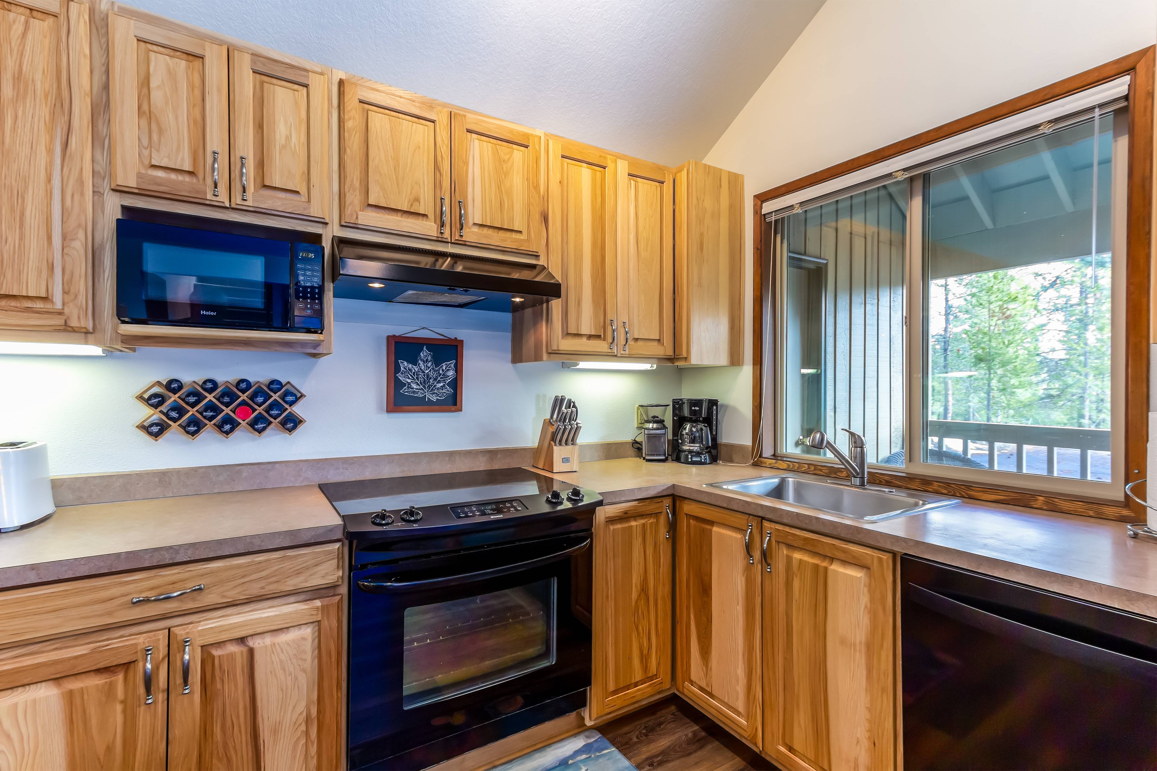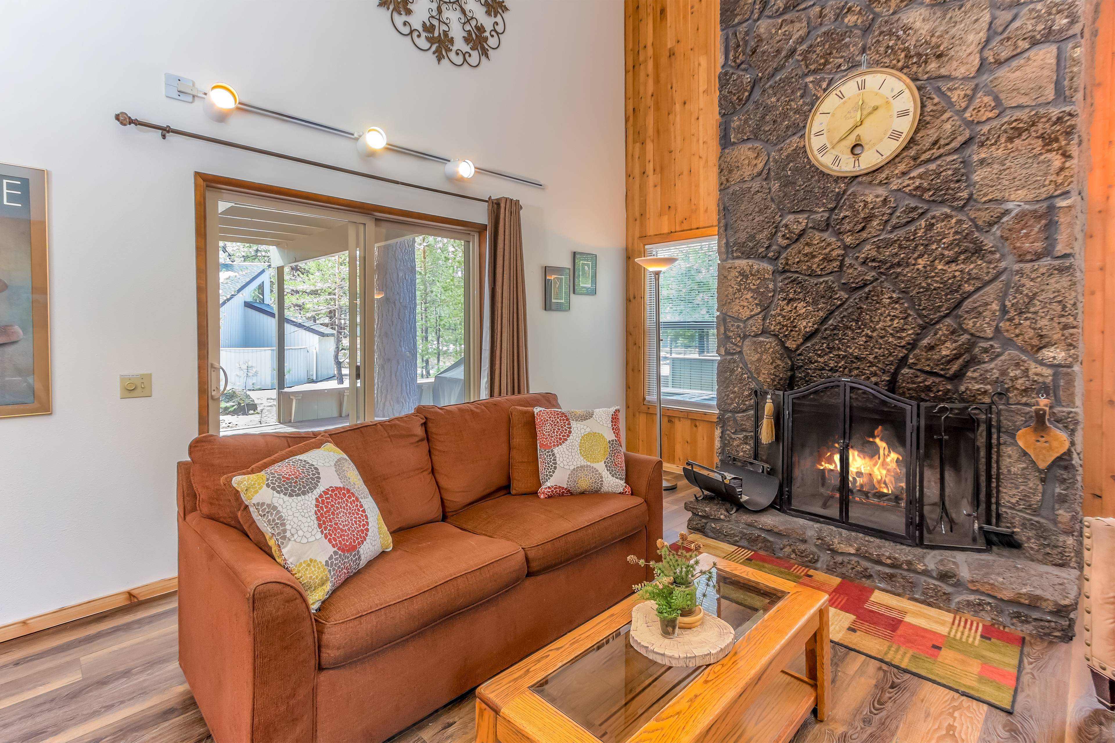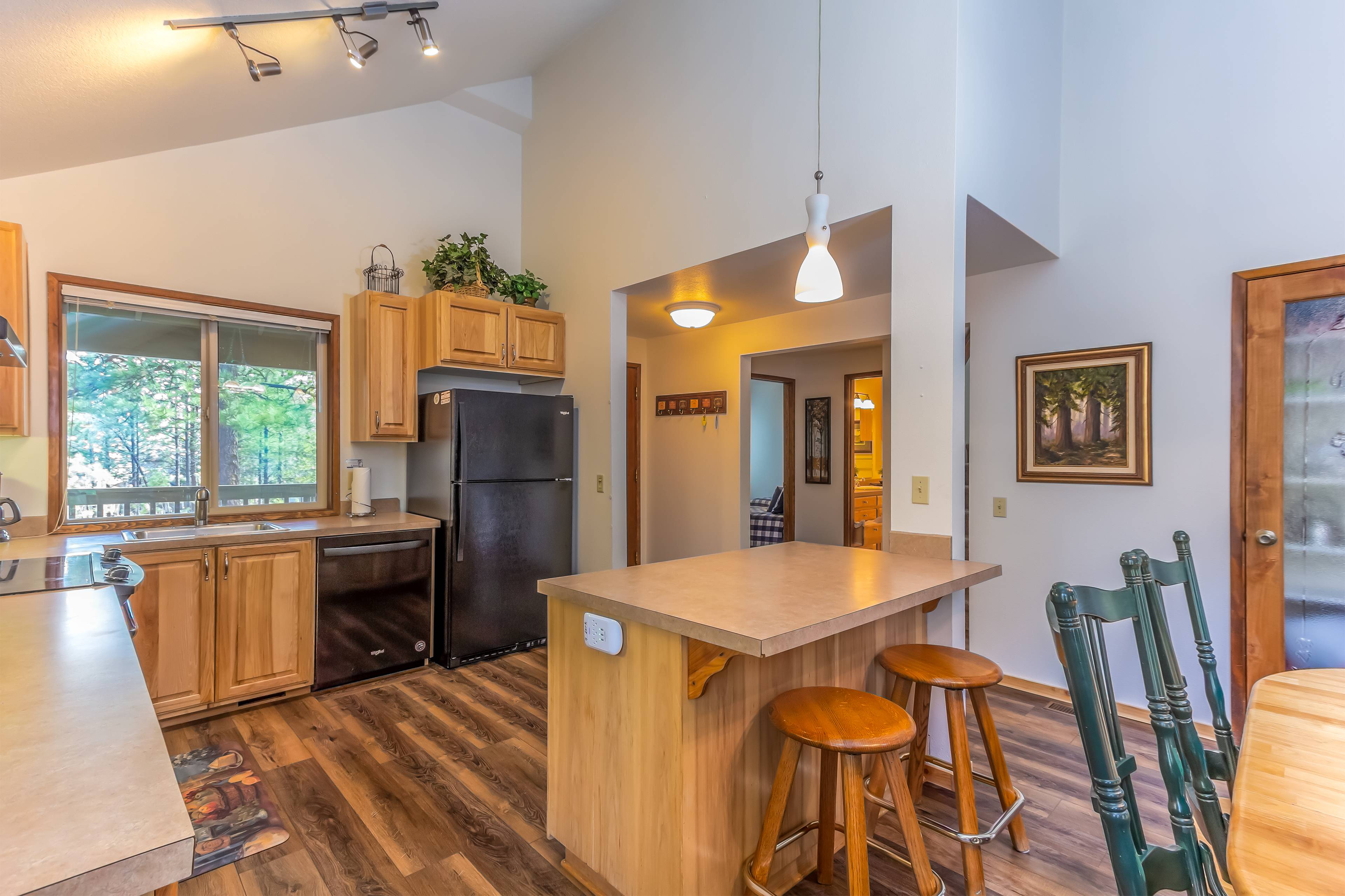 From the moment you step inside, you’ll feel that timeless cabin charm that makes Sunriver so special. The fully stocked kitchen opens to the dining area and a warm living room anchored by a large stone wood-burning fireplace—perfect for gathering after a day of adventure.