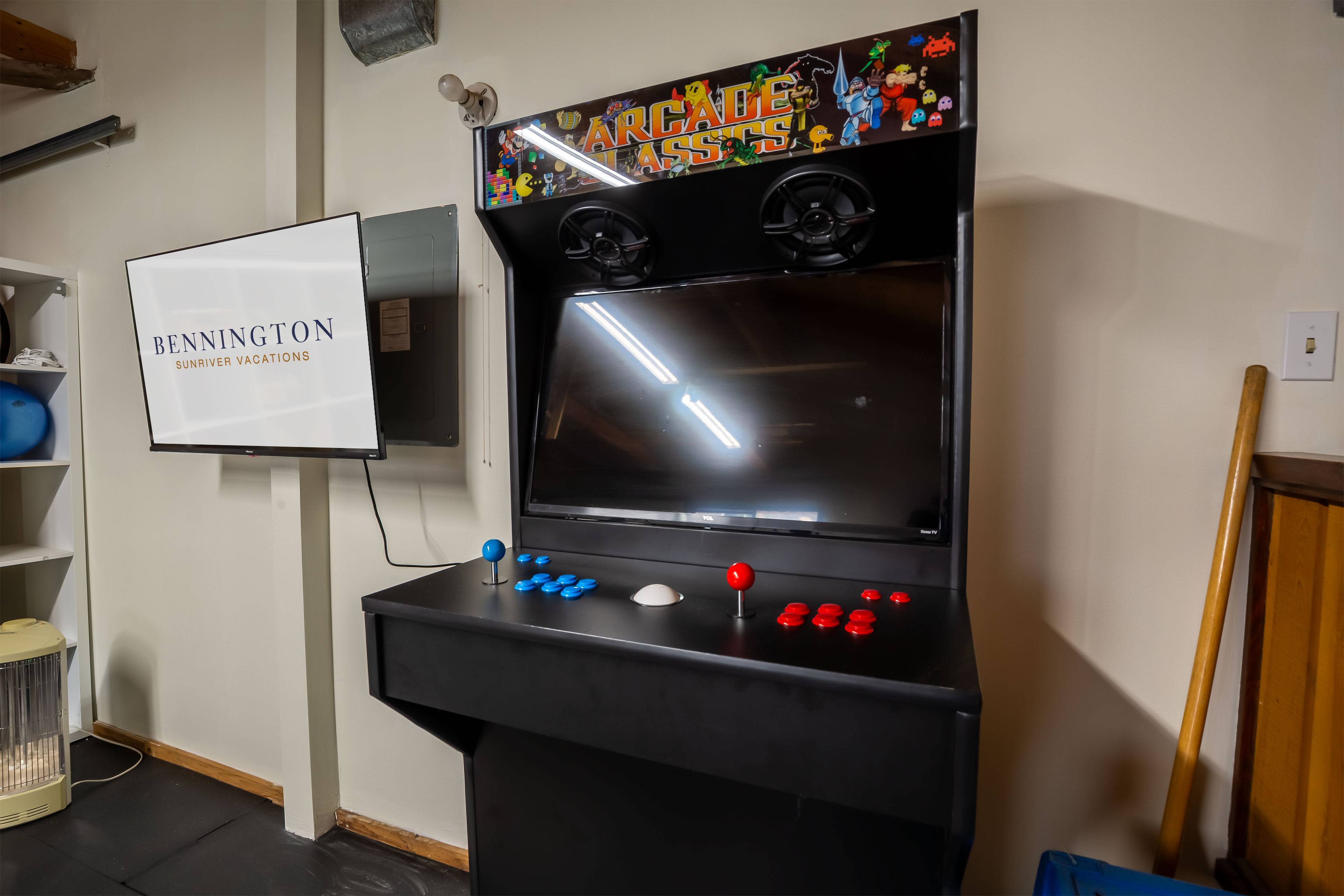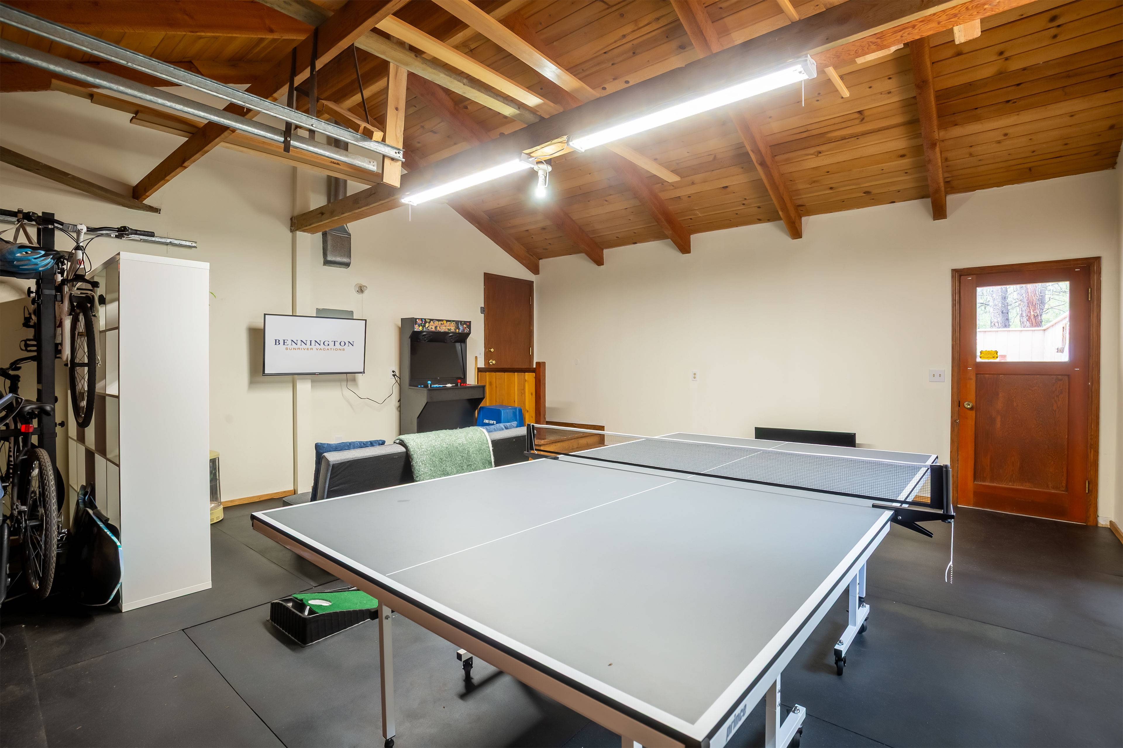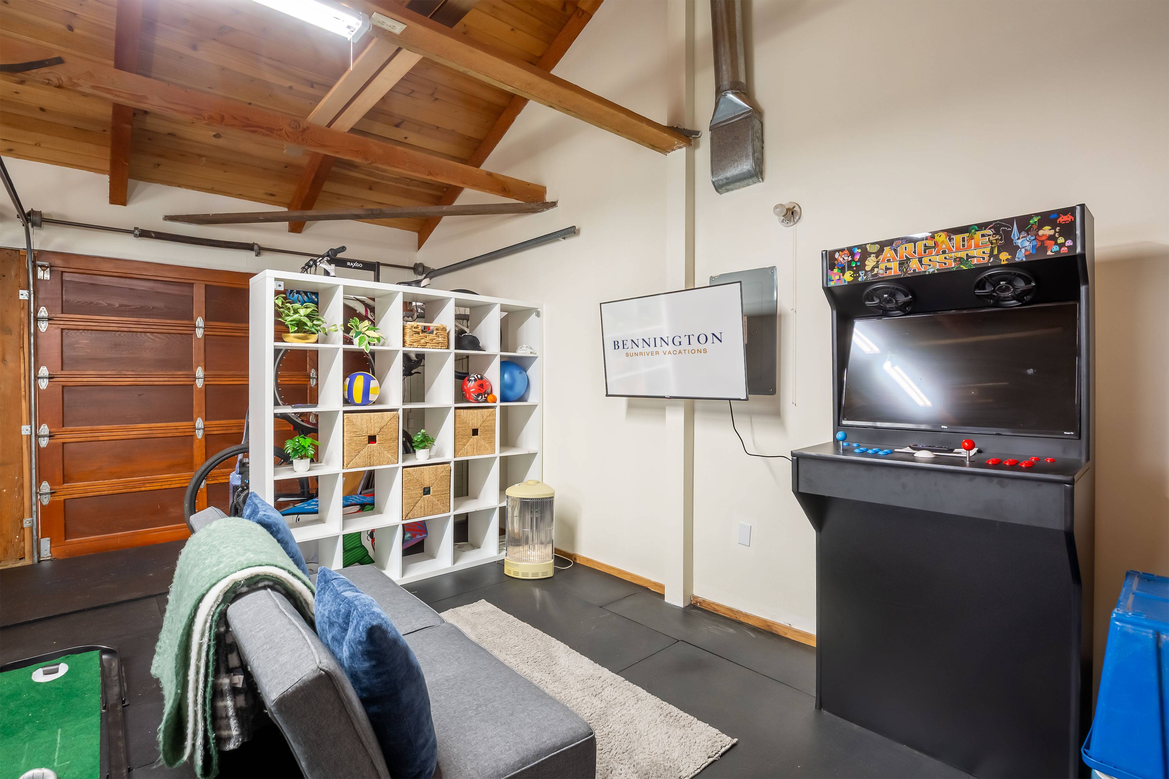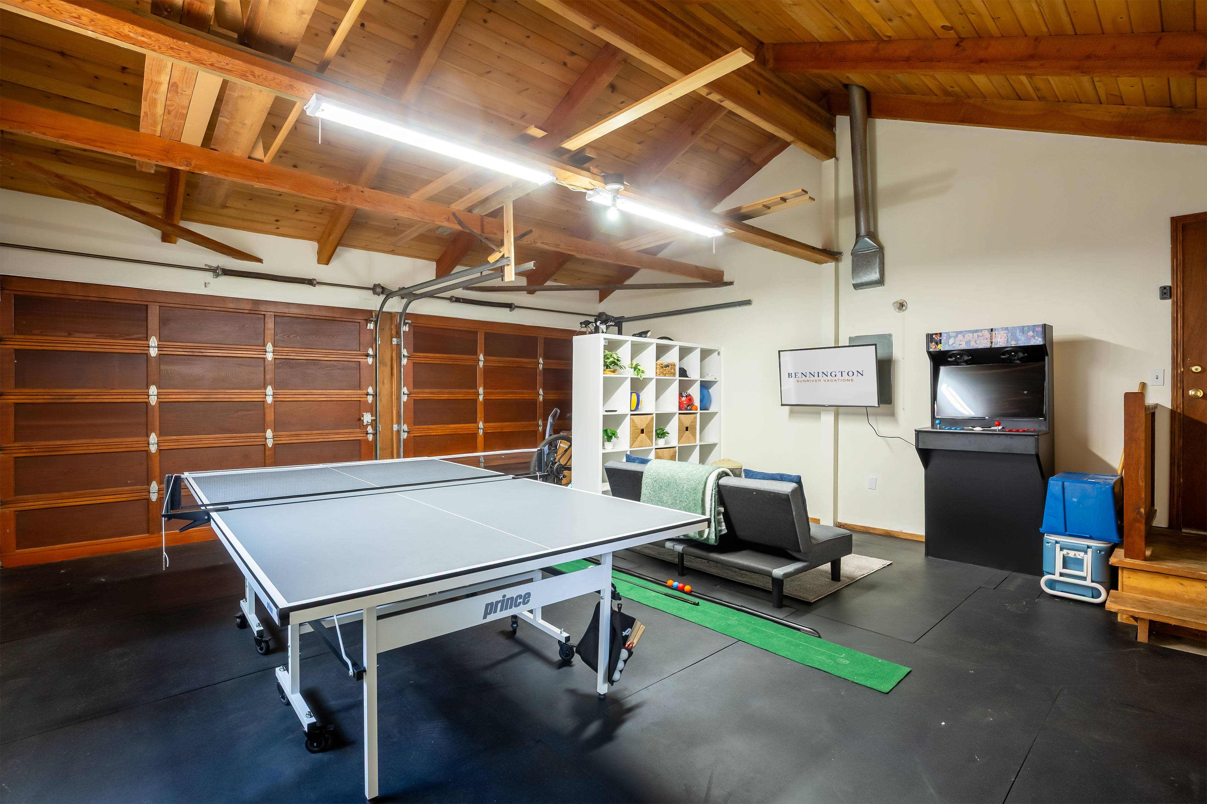 The living room is perfect for unwinding after a day of exploring, with a wood fireplace to keep you cozy. For entertainment, the newly renovated garage has been transformed into a fun-filled game room, featuring an arcade game, a ping pong table, a smart TV, and an entertainment area. Whether you’re looking to compete in games or just relax, this space has you covered.