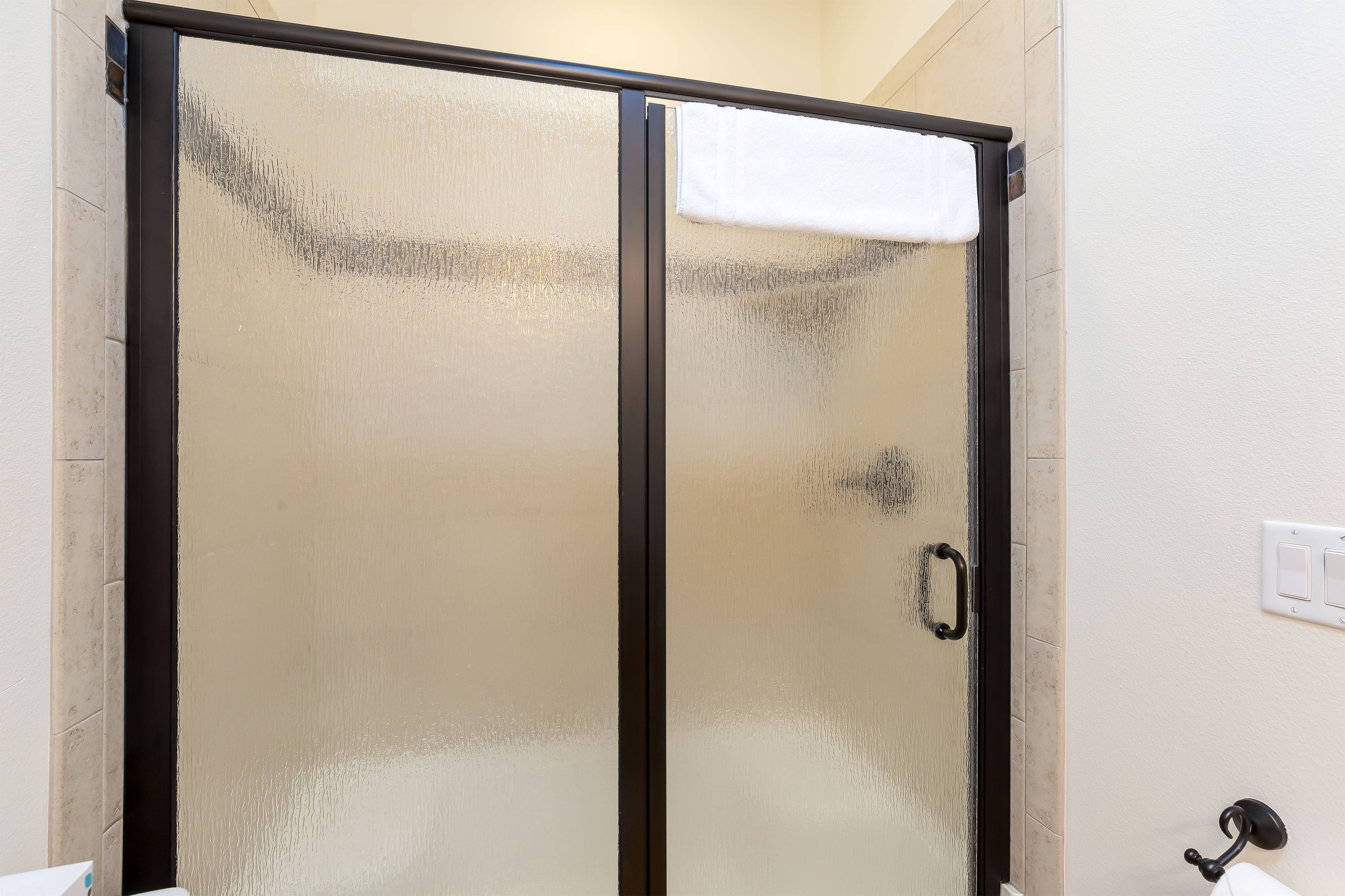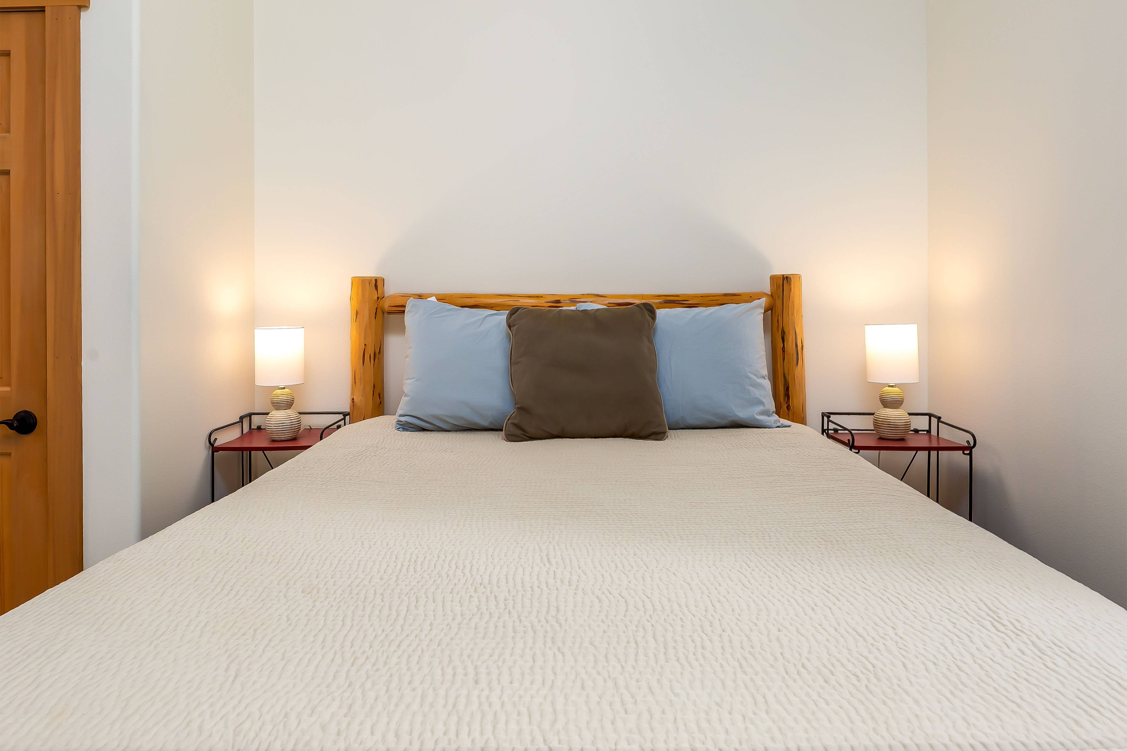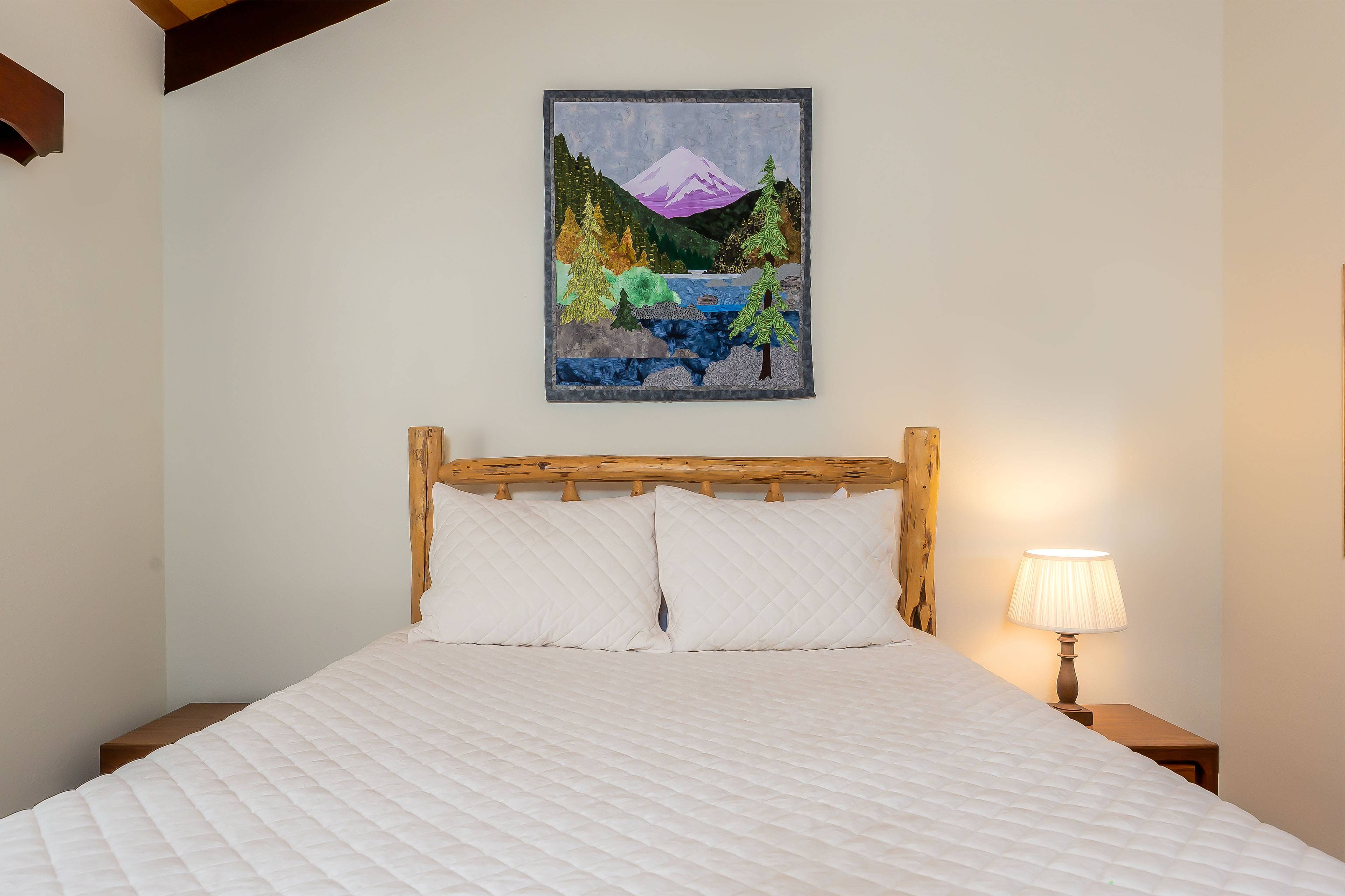 Inside, you'll find three thoughtfully designed bedrooms. The queen ensuite bedroom offers a private bathroom with a step-in shower. There's also a bunk room ideal for kids, with two sets of twin bunk beds. The second queen bedroom offers a serene space for a peaceful night’s sleep. Upstairs, the loft provides extra sleeping space with a queen bed and bunk beds, and a convenient bathroom with a walk-in shower.