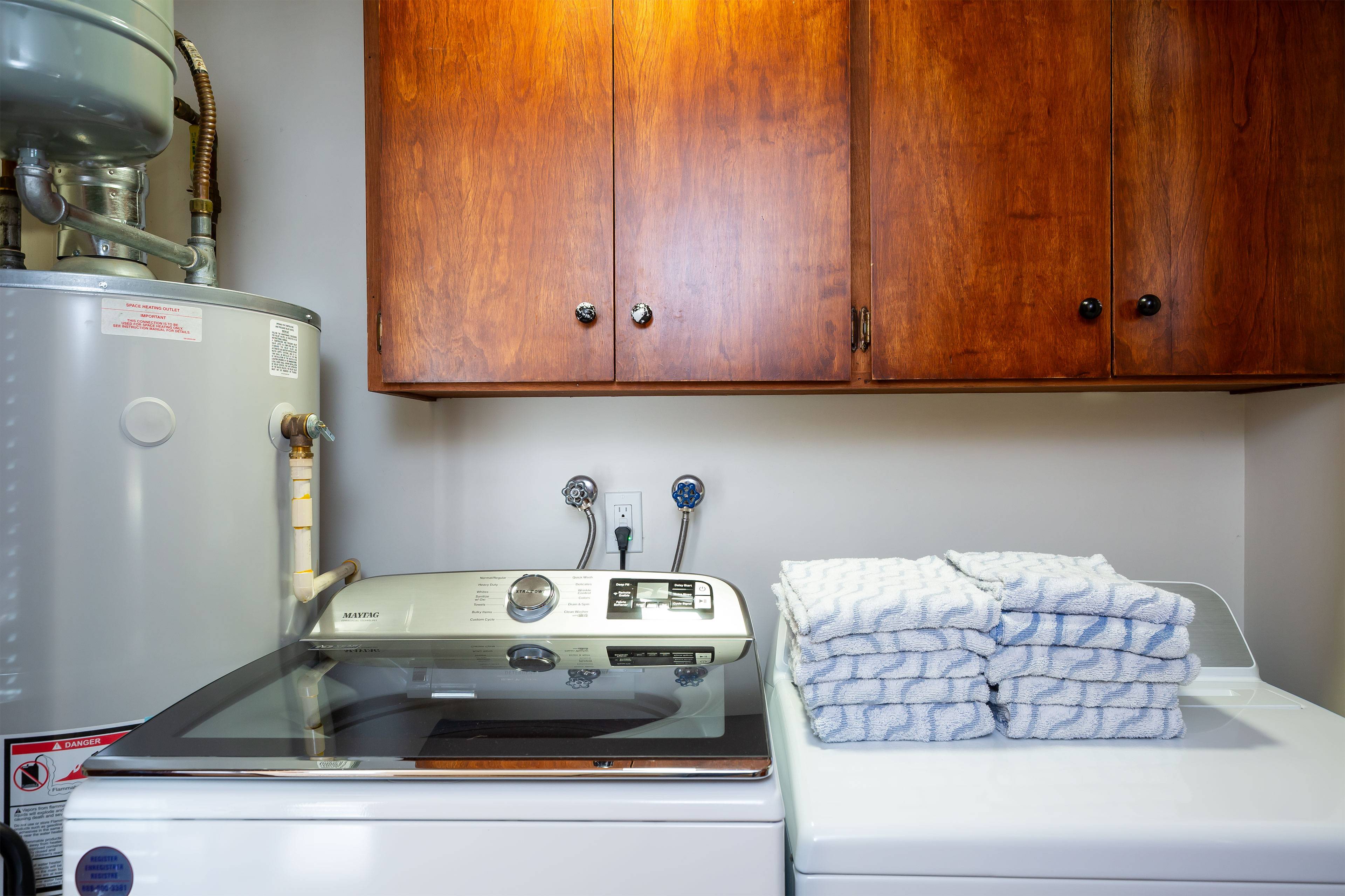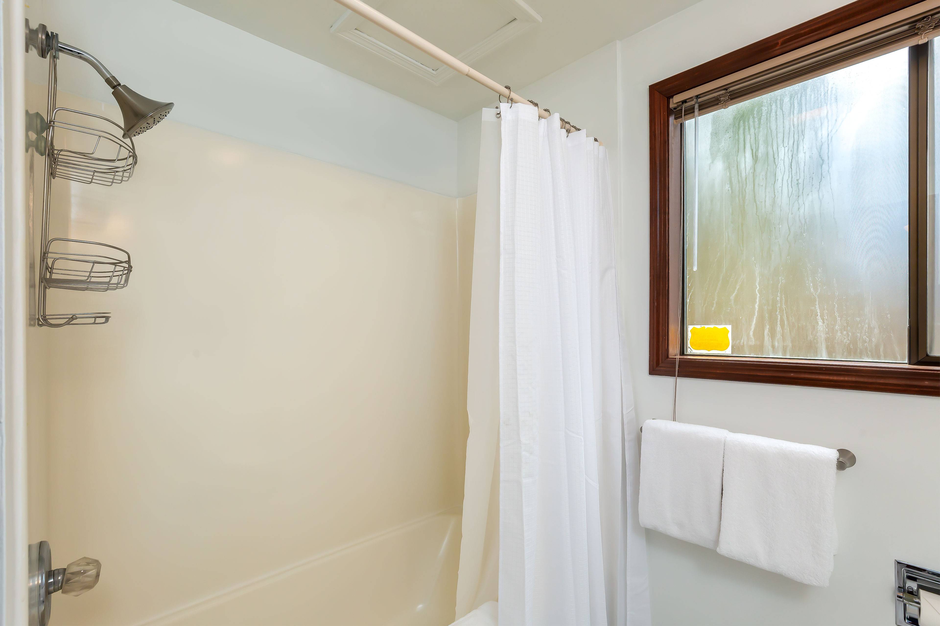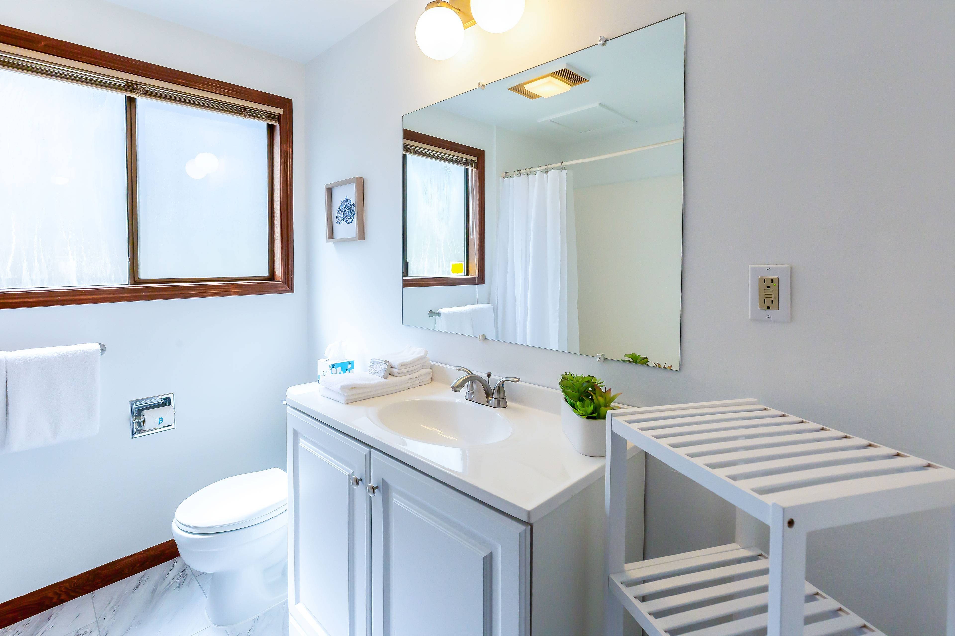 The fully stocked kitchen is equipped with everything you need to prepare meals during your stay, including modern appliances and all the essentials. There’s also a renovated downstairs bathroom with a tub/shower combo for added comfort.