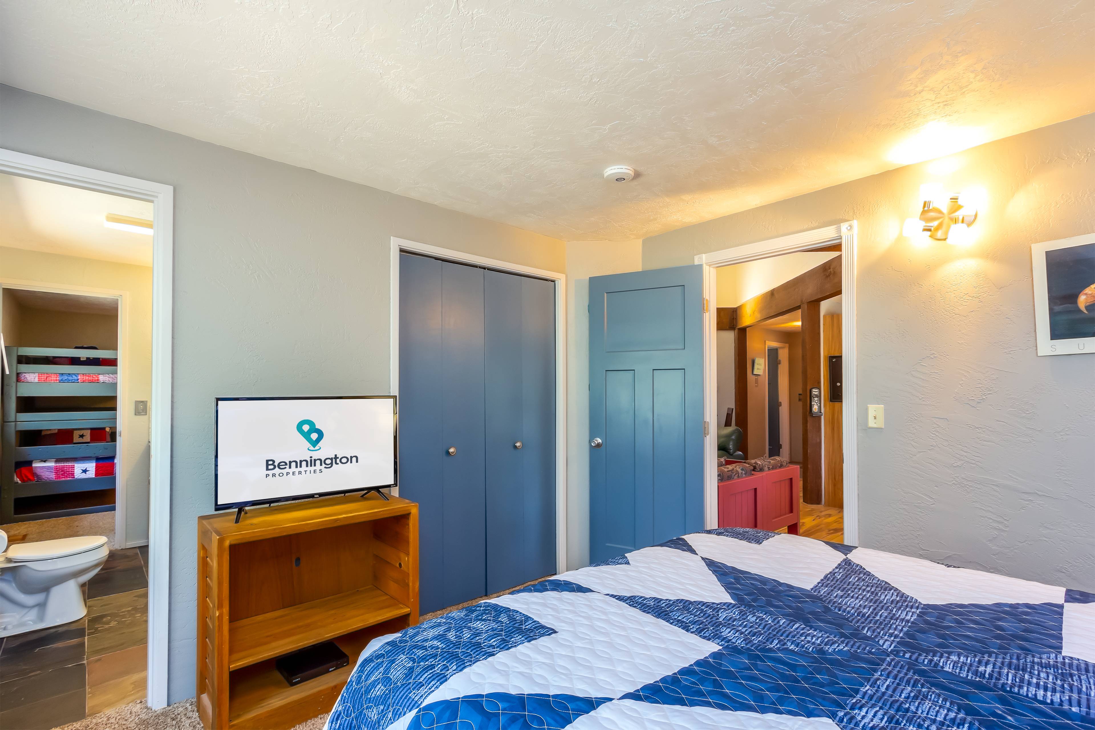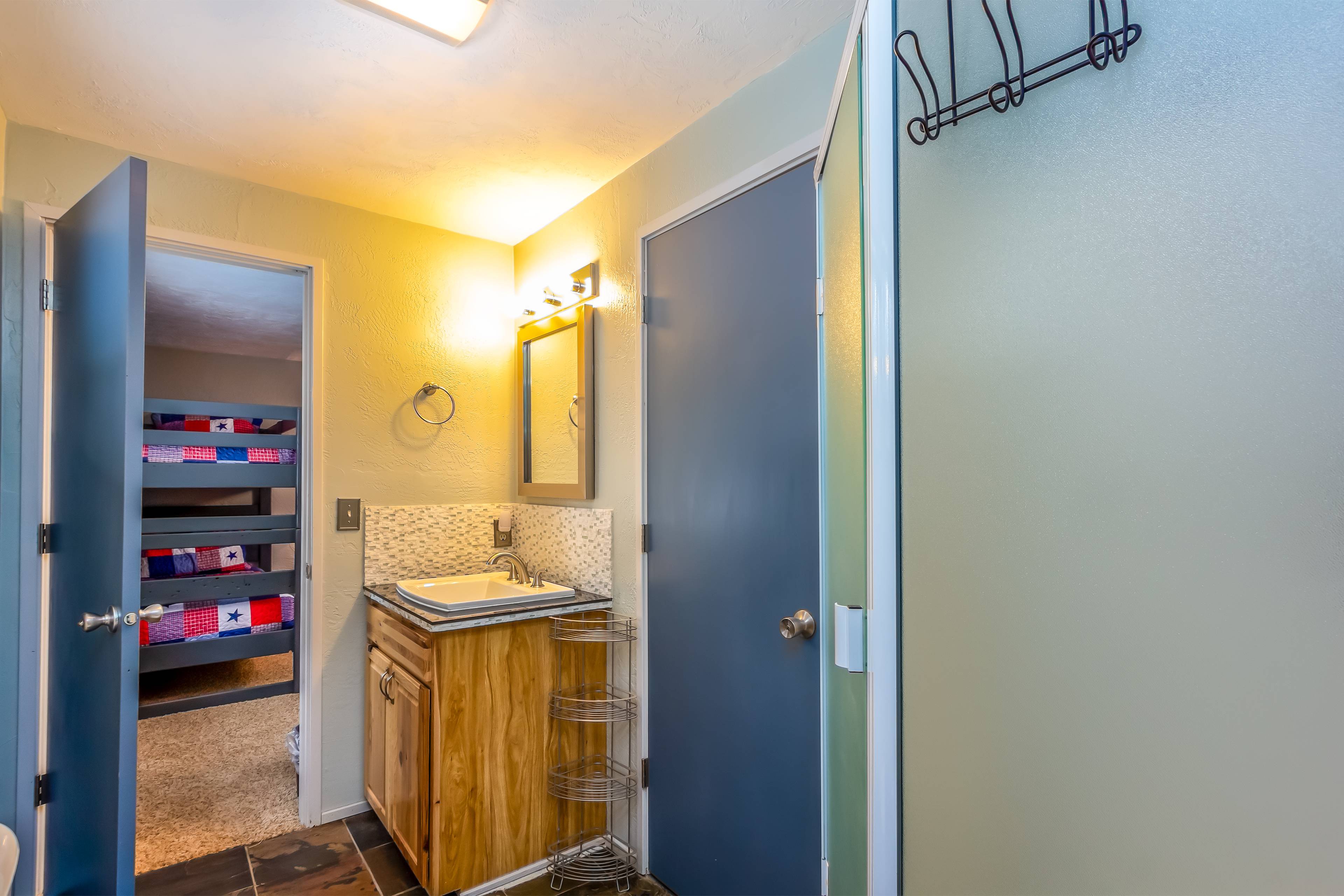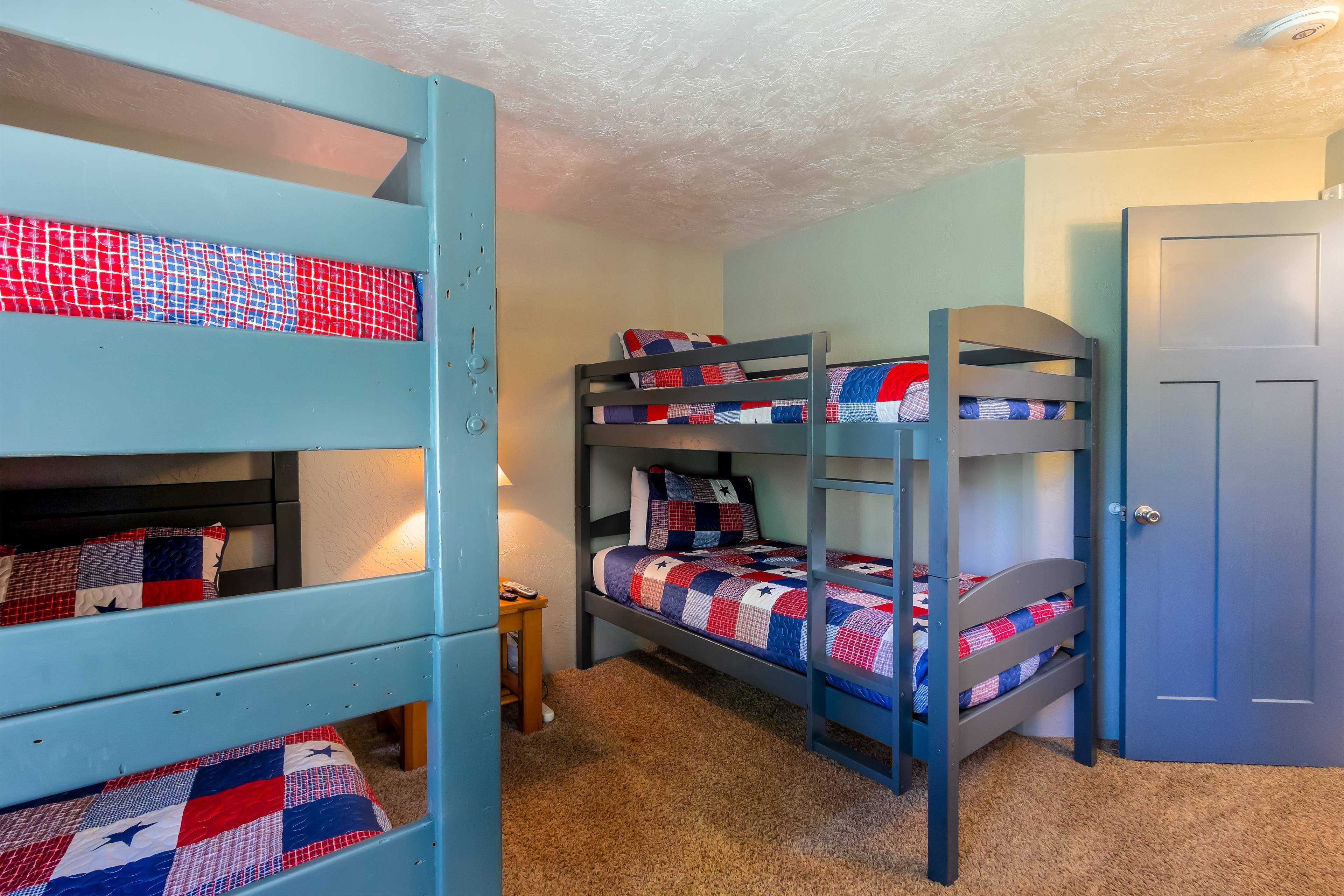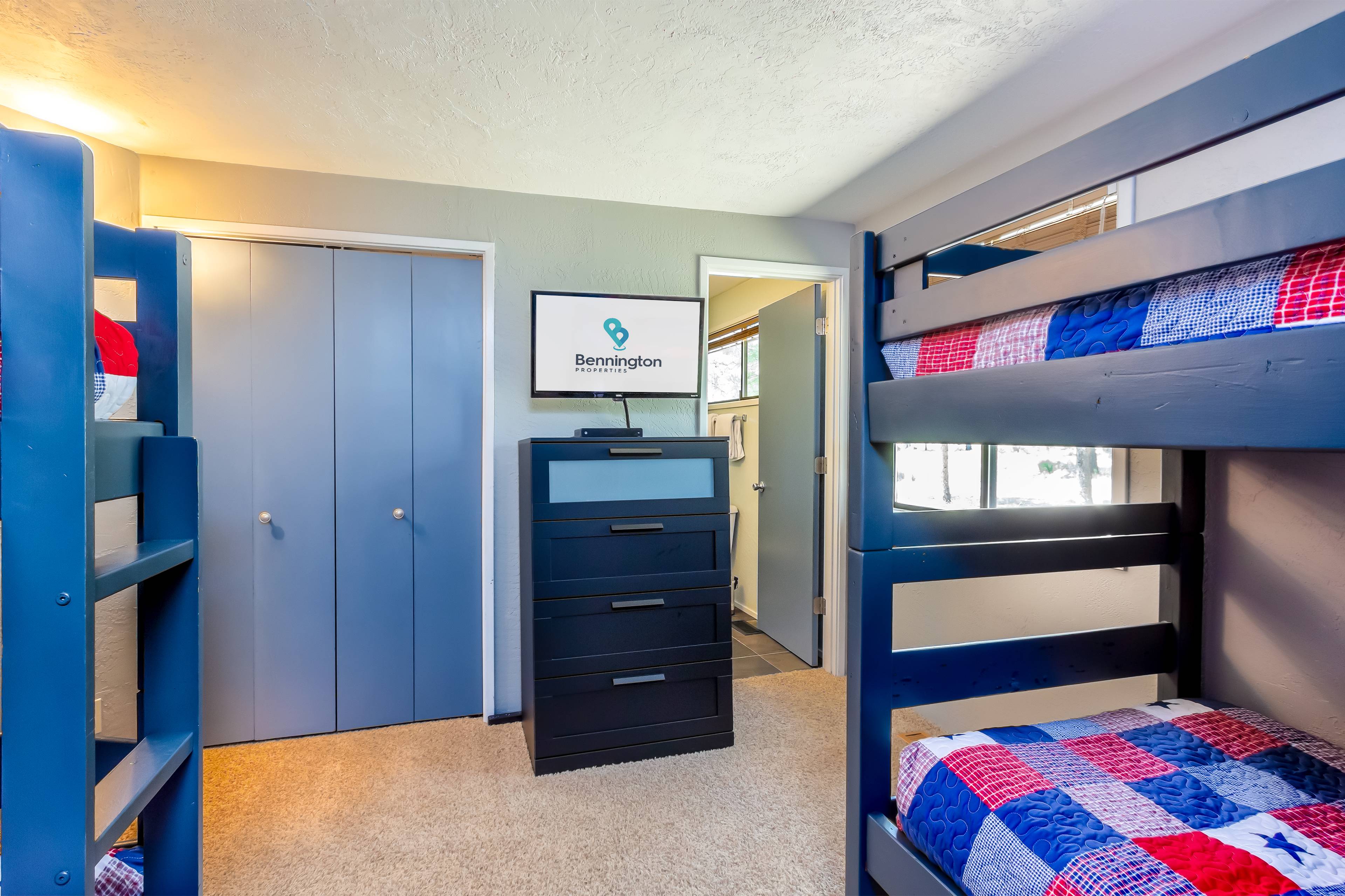 When you are ready to retire for the evening, there are three bedrooms to choose from. Bedroom one is the primary ensuite with a king bed, tv, DVD player and private bathroom. Bedrooms two and three share a jack-n-jill bathroom with walk-in shower. Bedroom two has a queen bed and TV, bedroom three has two sets of twin over twin bunk beds.