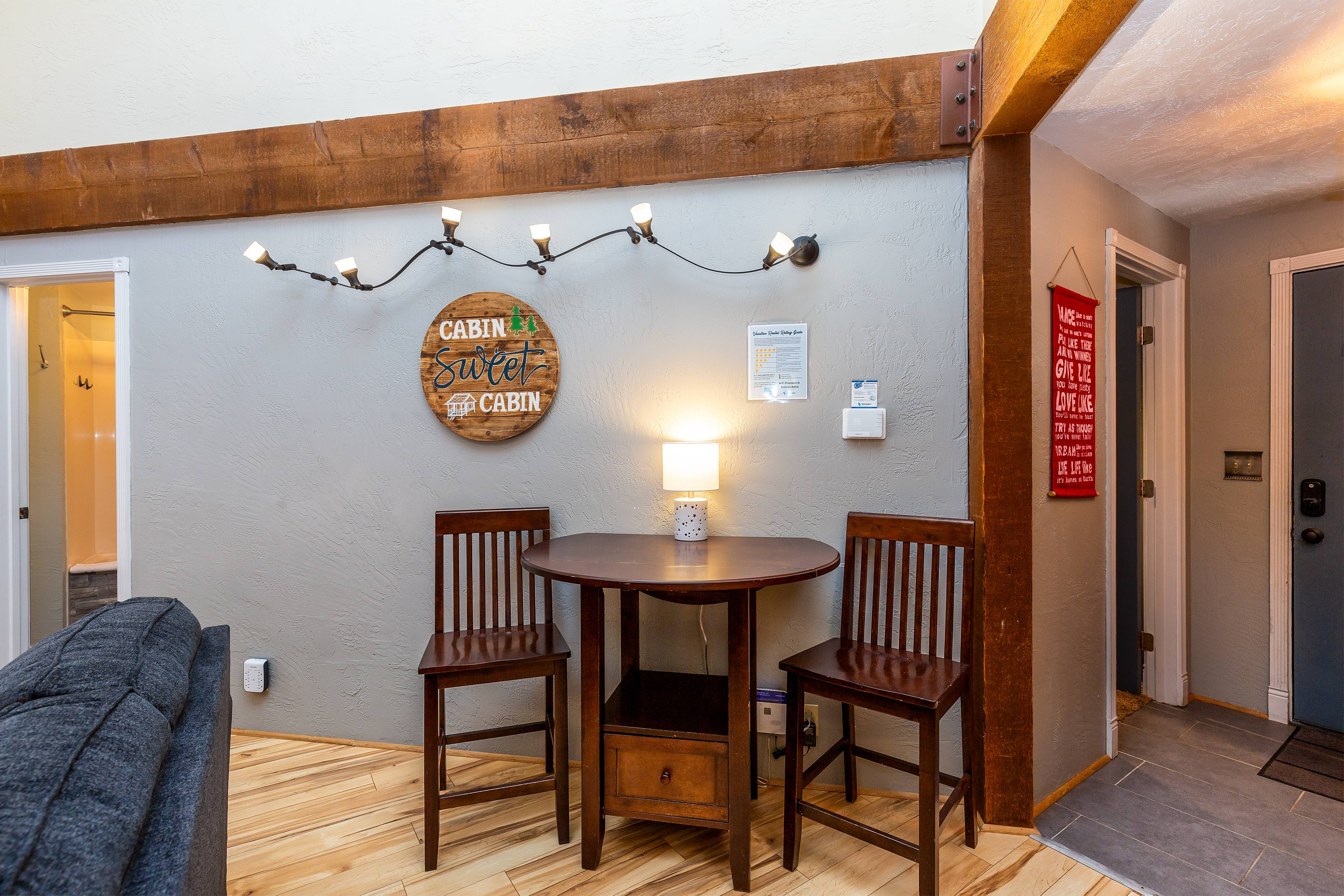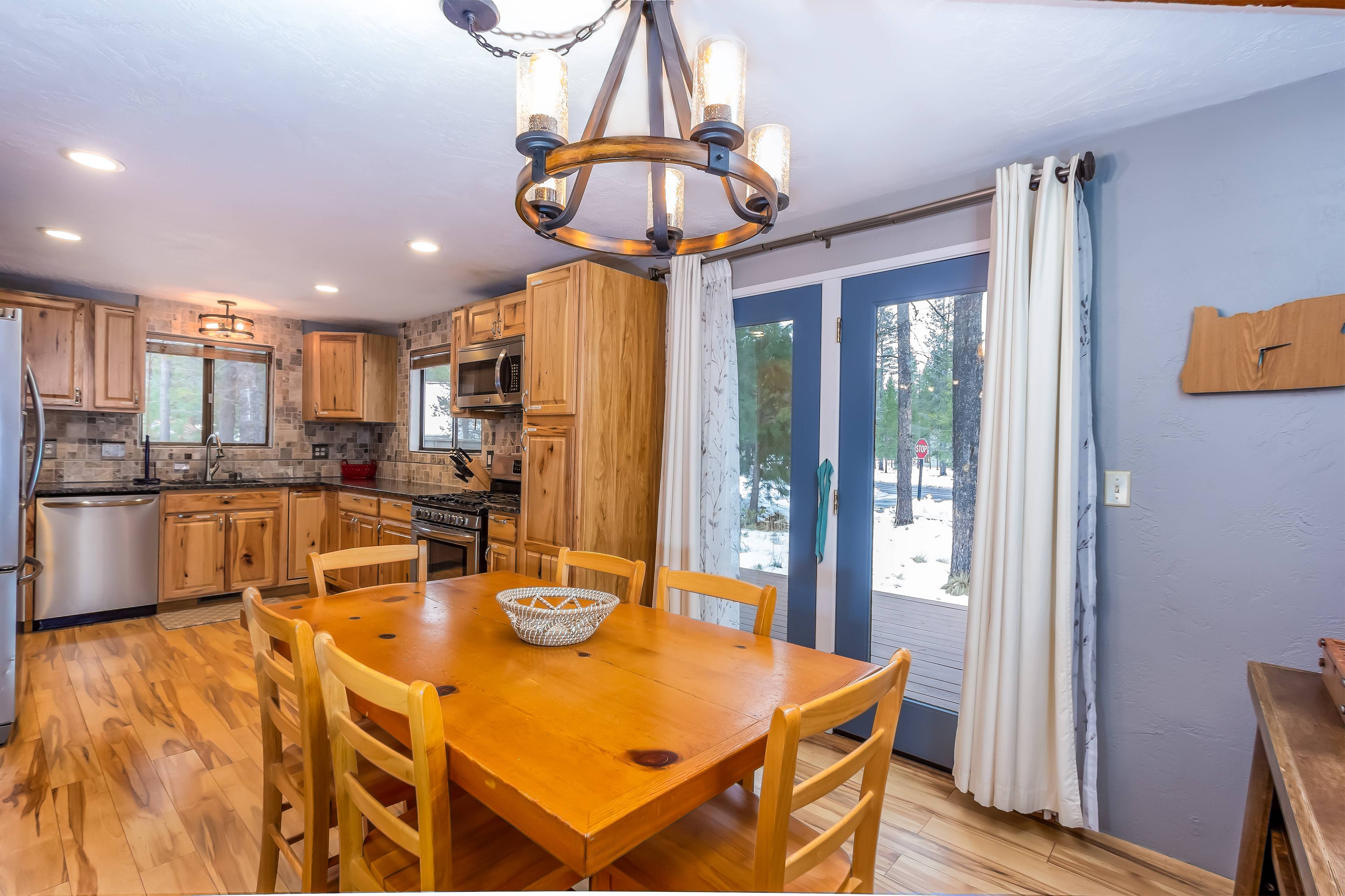 This home features an open living area with high ceilings, a sleek electric fireplace, and windows that let in plenty of natural sunlight. The fully stocked kitchen will please the chef in your family with a gas range, lovely wood cabinetry, plenty of countertop space and all the pots, pans and utensils to prepare your family's favorite meals. The dining rooms sits adjacent to the kitchen to with seating for 6, additional seating is available at the nearby bistro table.