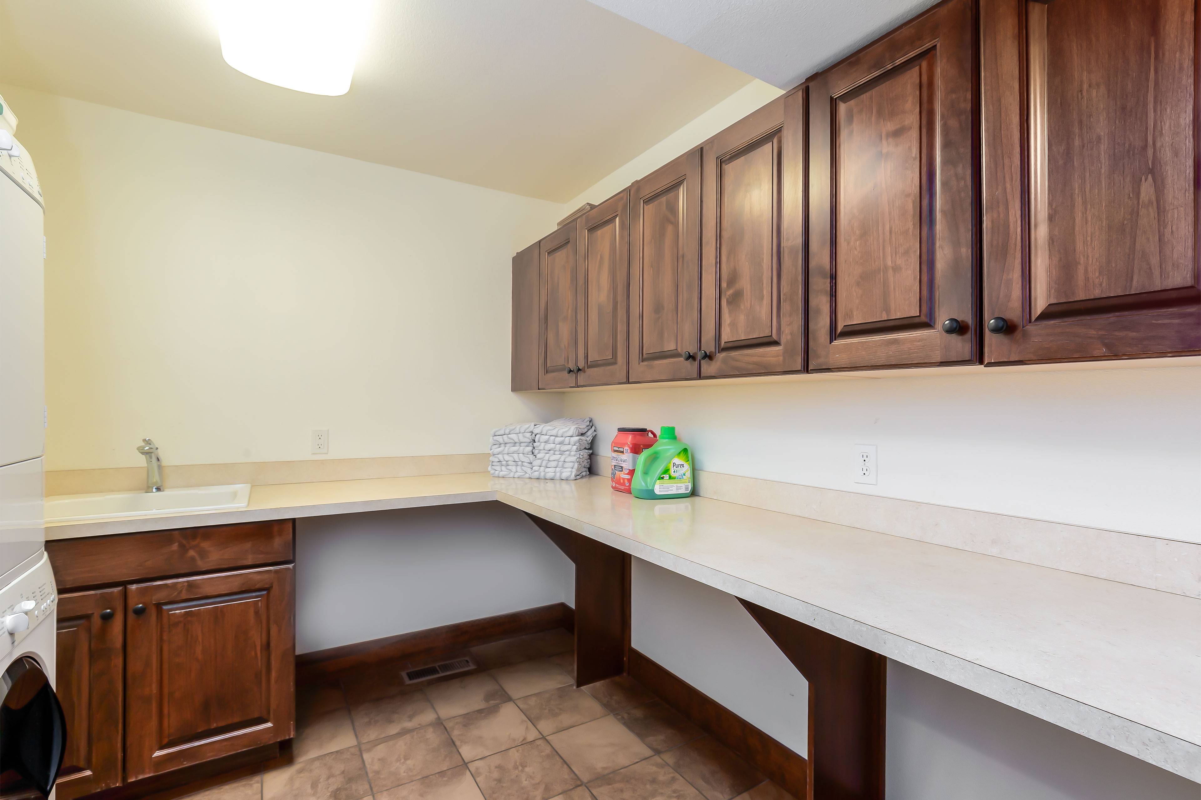 The house and location-great! The bedrooms and bath: clean, strategically located and of adequate size; kitchen, well stocked with cooking utensils, basic cooking supplies and lots of appliances including specialty items such as crock pots & espresso machine. Dual dishwashers made it easy to get the dishes ready for the next group feeding of the gang. Downstairs living area was served by its own (smaller) well appointed kitchen. Laundry area provided room for working in to sort laundry and storing items for later use.